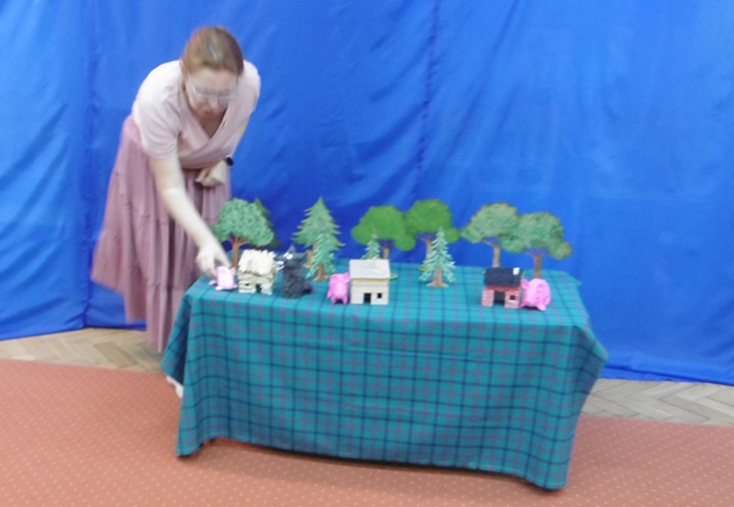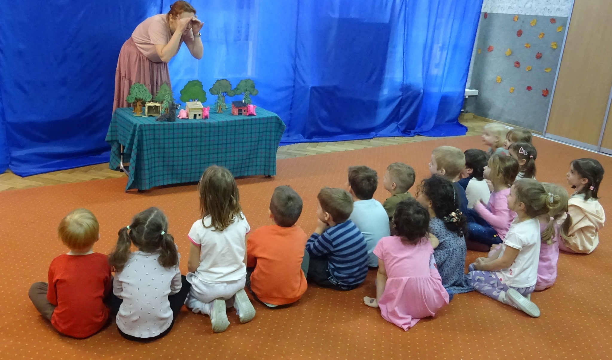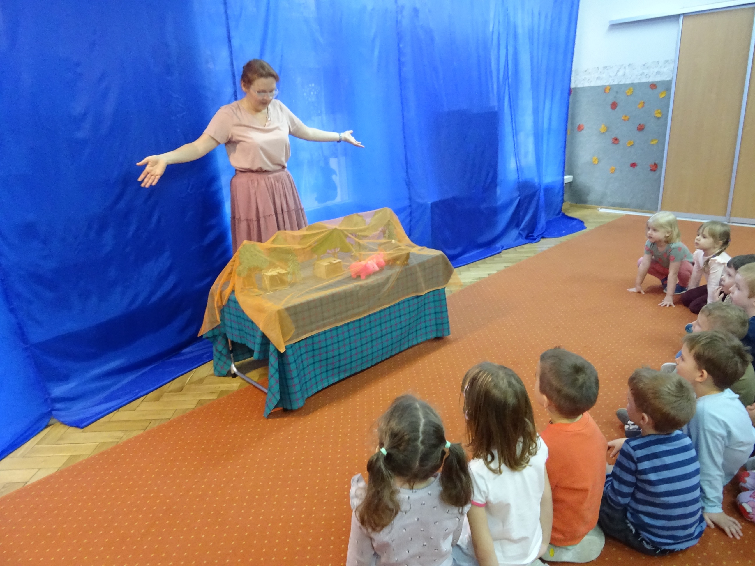 Na początku dzieci miały okazję obejrzeć stolikową bajkę sensoryczną pt. ,,Trzy świnki’’, która niezwykle podobała się dzieciom. Z wielkim zaangażowaniem śledziły losy trzech świnek, na które próbował zapolować wilk. Dzieci obserwowały losy bohaterów bajki – trzy niezwykle sympatyczne świnki, które budowały swoje domki z różnych materiałów. Następnie dzieci sprawdzały wytrzymałość wybudowanych domków dmuchając na nie z całych sił.