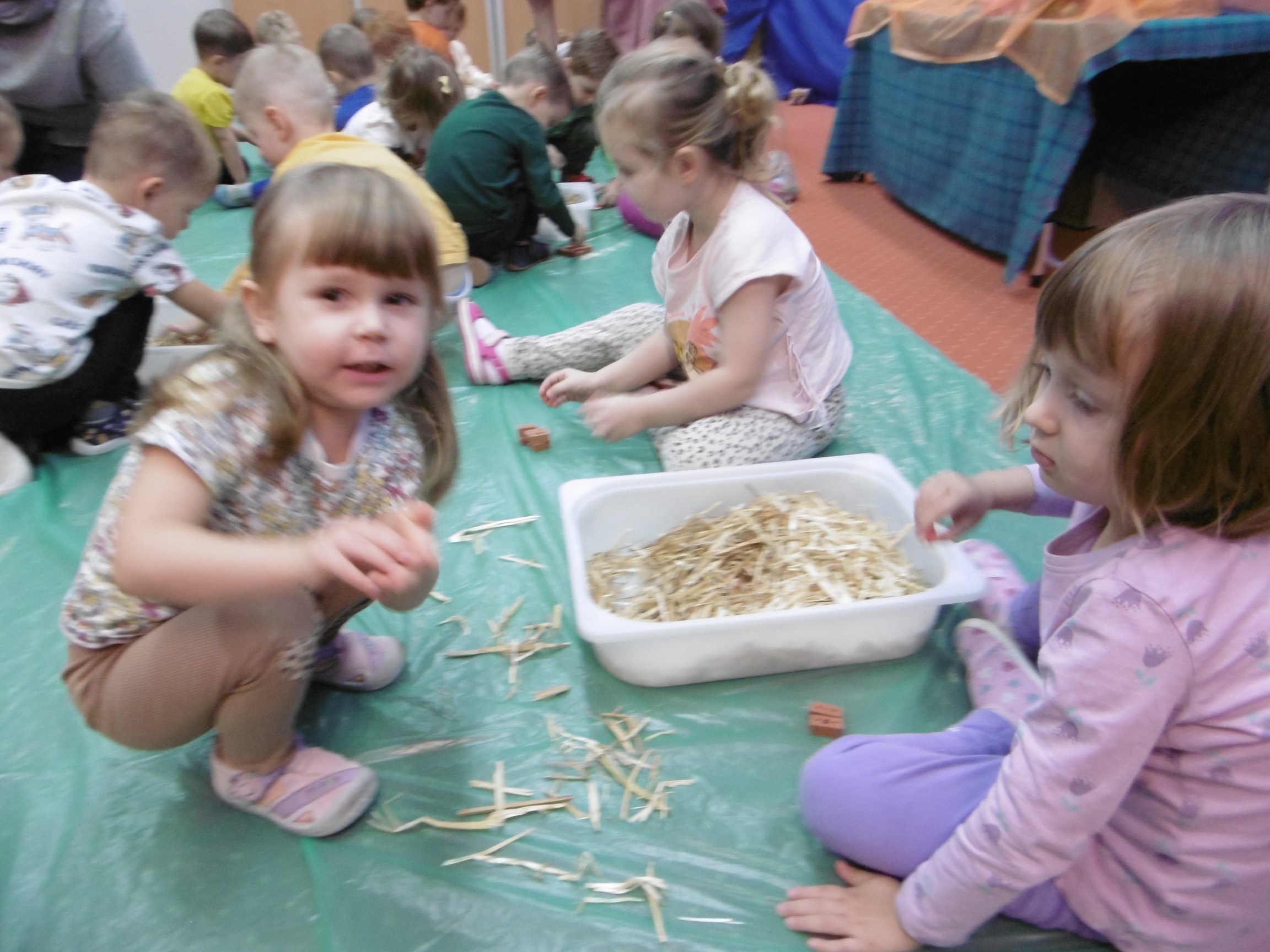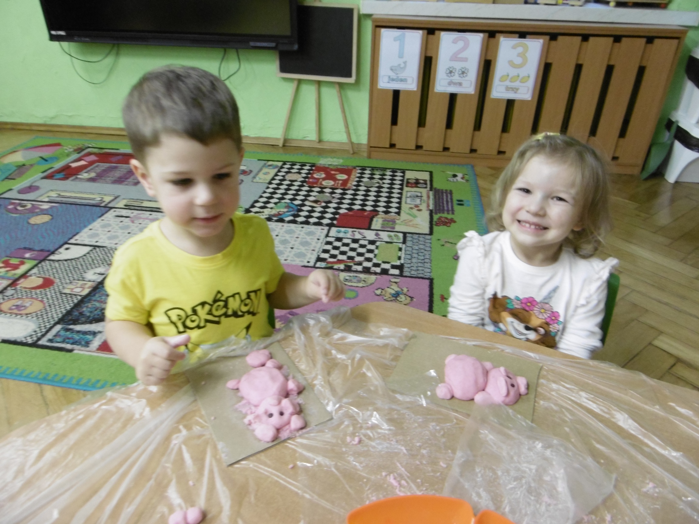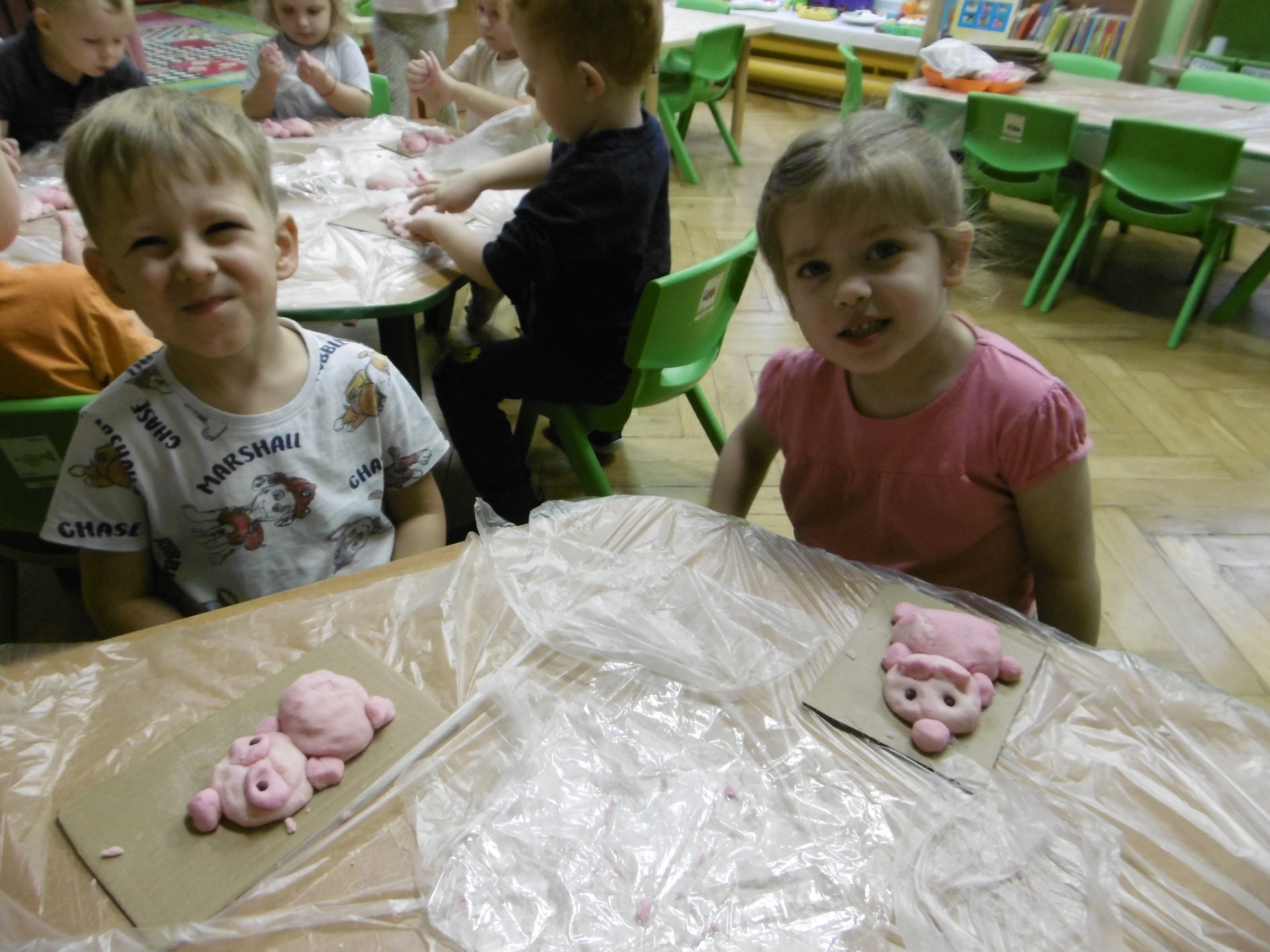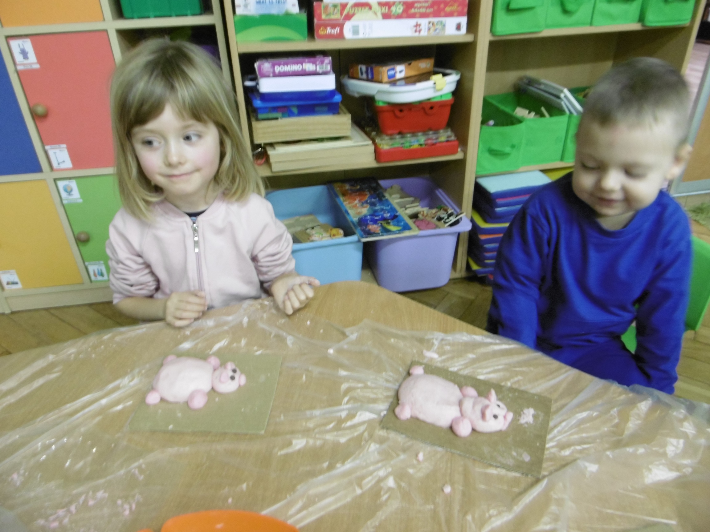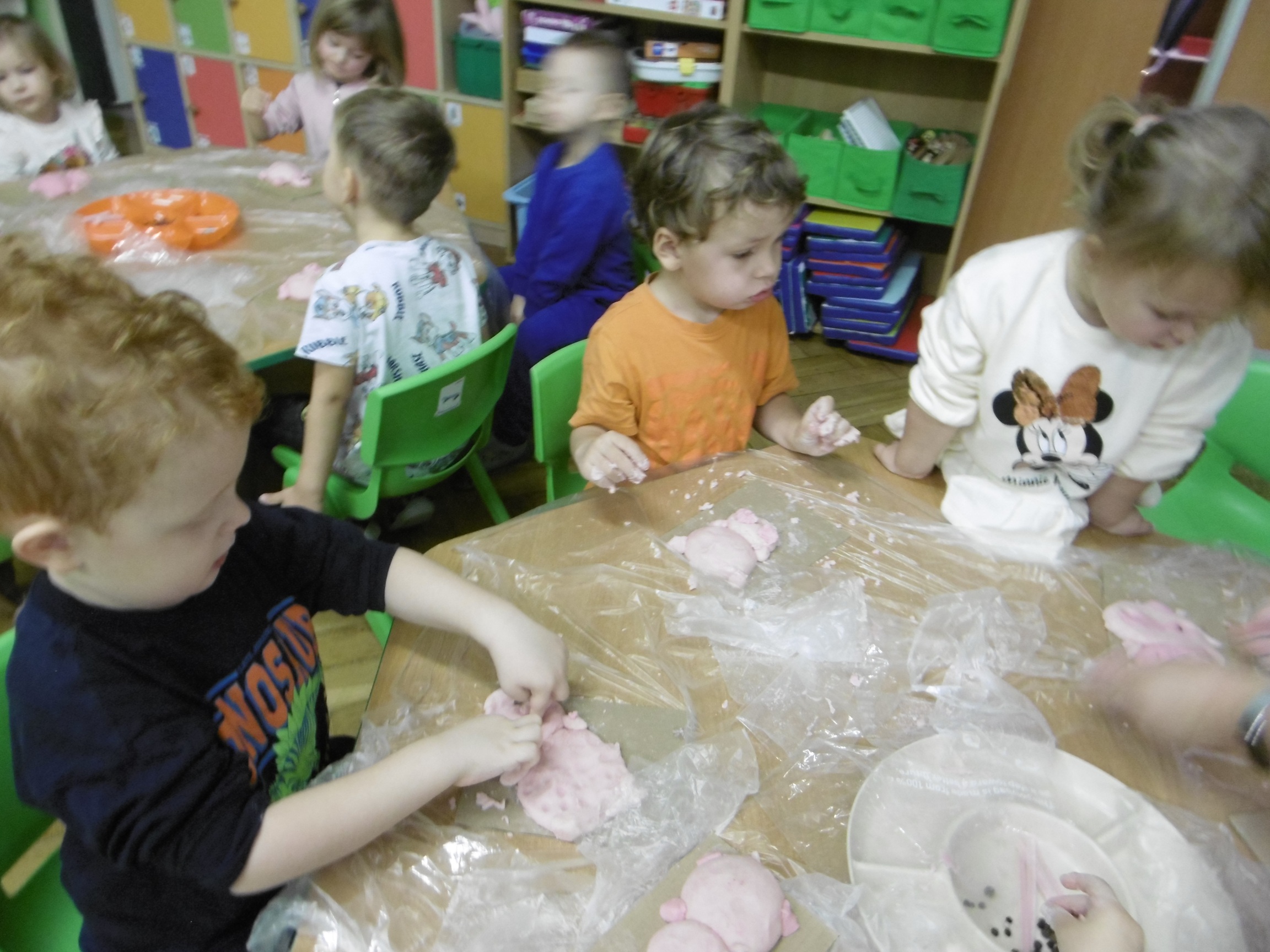 Po obejrzeniu bajki, dzieci wzięły udział w zabawach sensorycznych, podczas których samodzielnie budowały domki dla świnek ze słomy, drewna i cegieł. Nie zabrakło również zabaw ruchowych, kiedy to przedszkolaki pomagały świnkom dostać się do domku oraz tropiły ślady wilka w lesie, a na zakończenie dzieci udały się do swoich sal, gdzie z pomocą prowadzącej warsztaty i swoich cioć lepiły świnki z masy solnej.