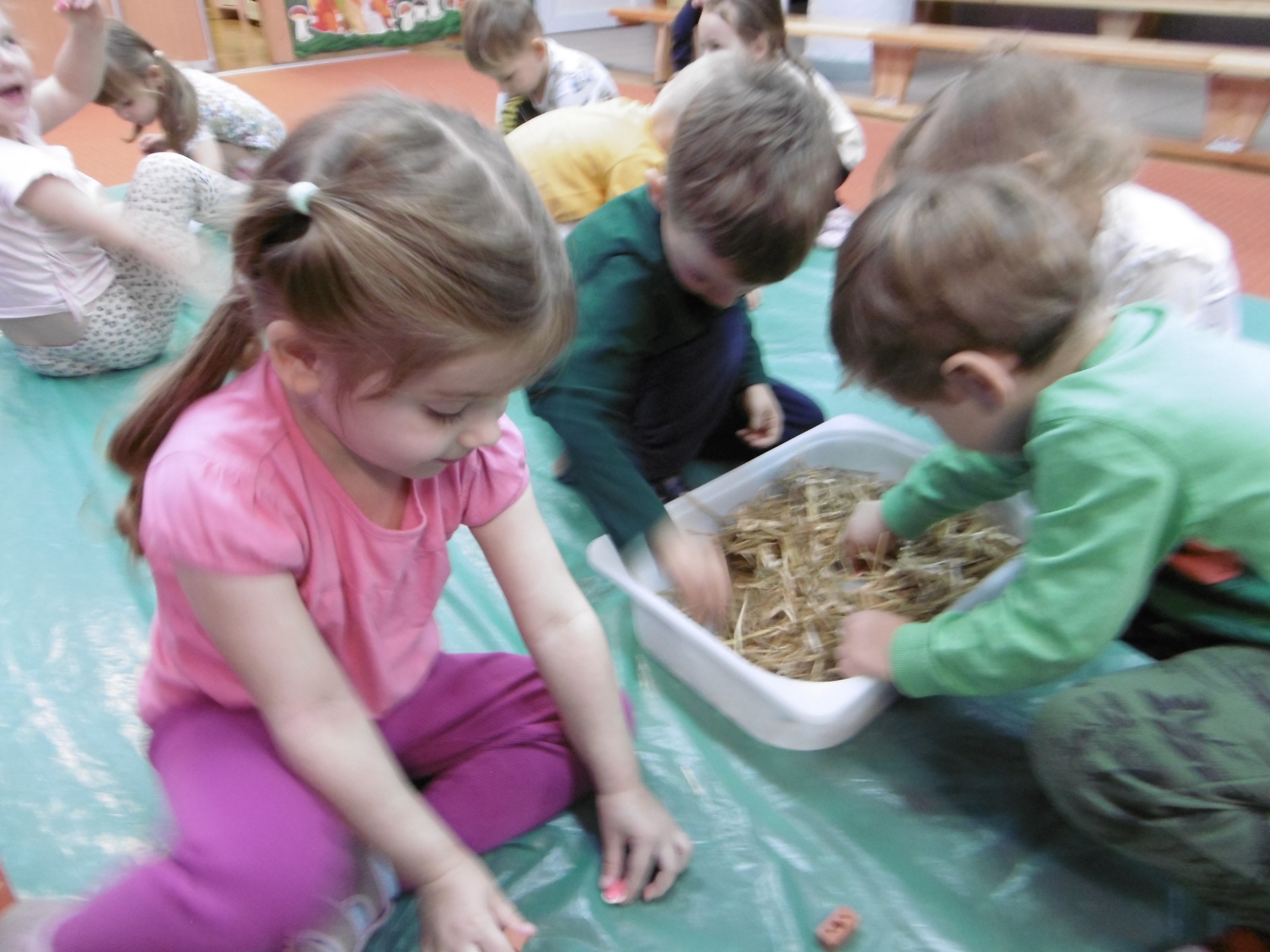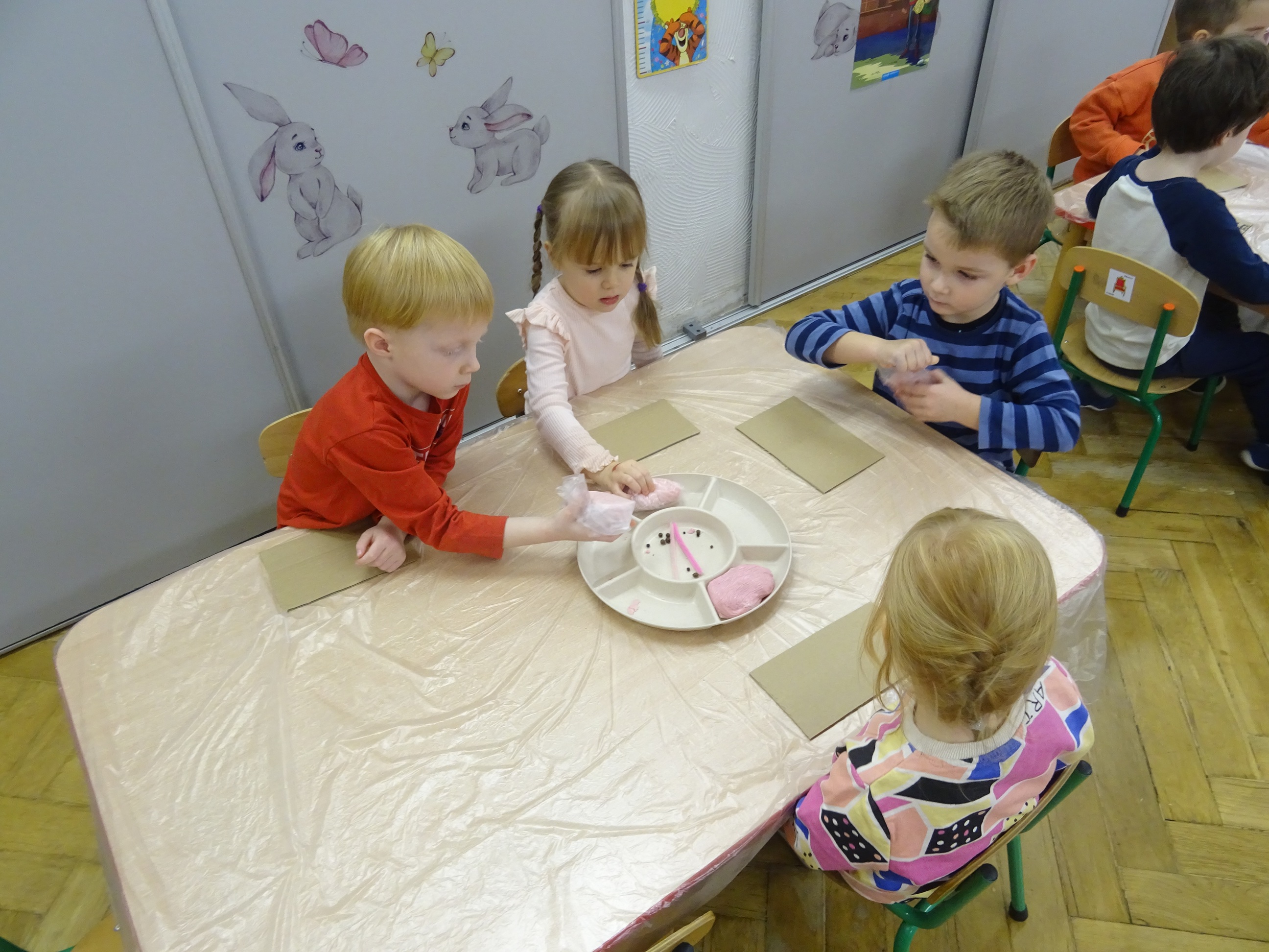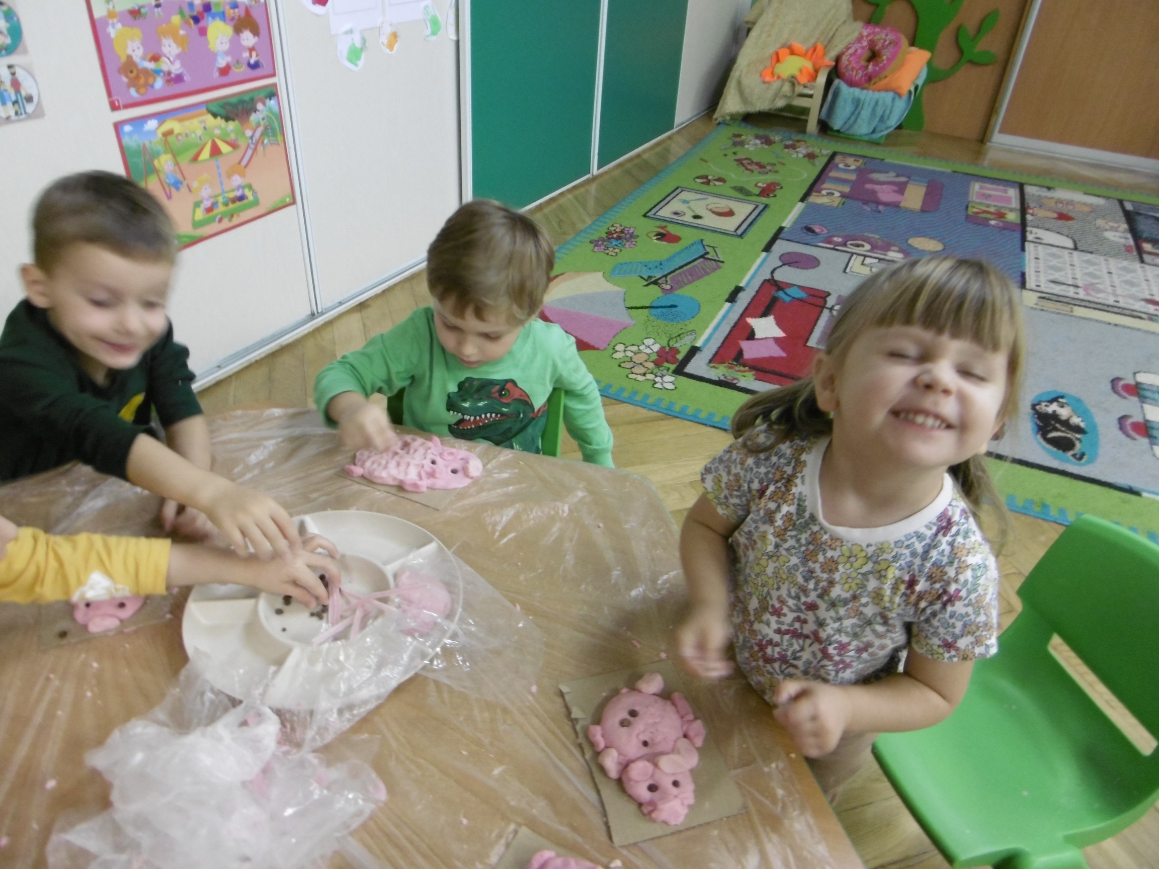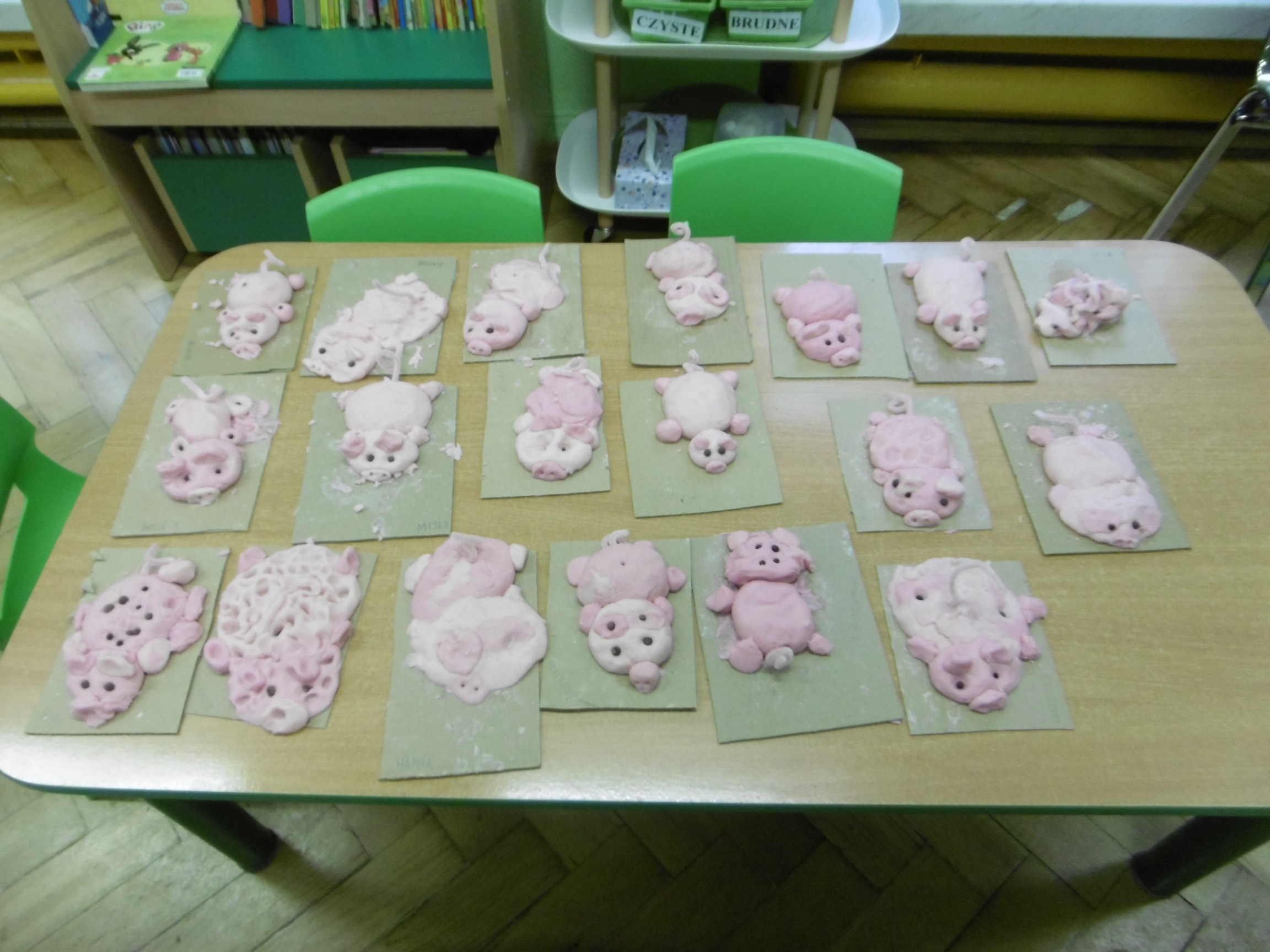 Po obejrzeniu bajki, dzieci wzięły udział w zabawach sensorycznych, podczas których samodzielnie budowały domki dla świnek ze słomy, drewna i cegieł. Nie zabrakło również zabaw ruchowych, kiedy to przedszkolaki pomagały świnkom dostać się do domku oraz tropiły ślady wilka w lesie, a na zakończenie dzieci udały się do swoich sal, gdzie z pomocą prowadzącej warsztaty i swoich cioć lepiły świnki z masy solnej.