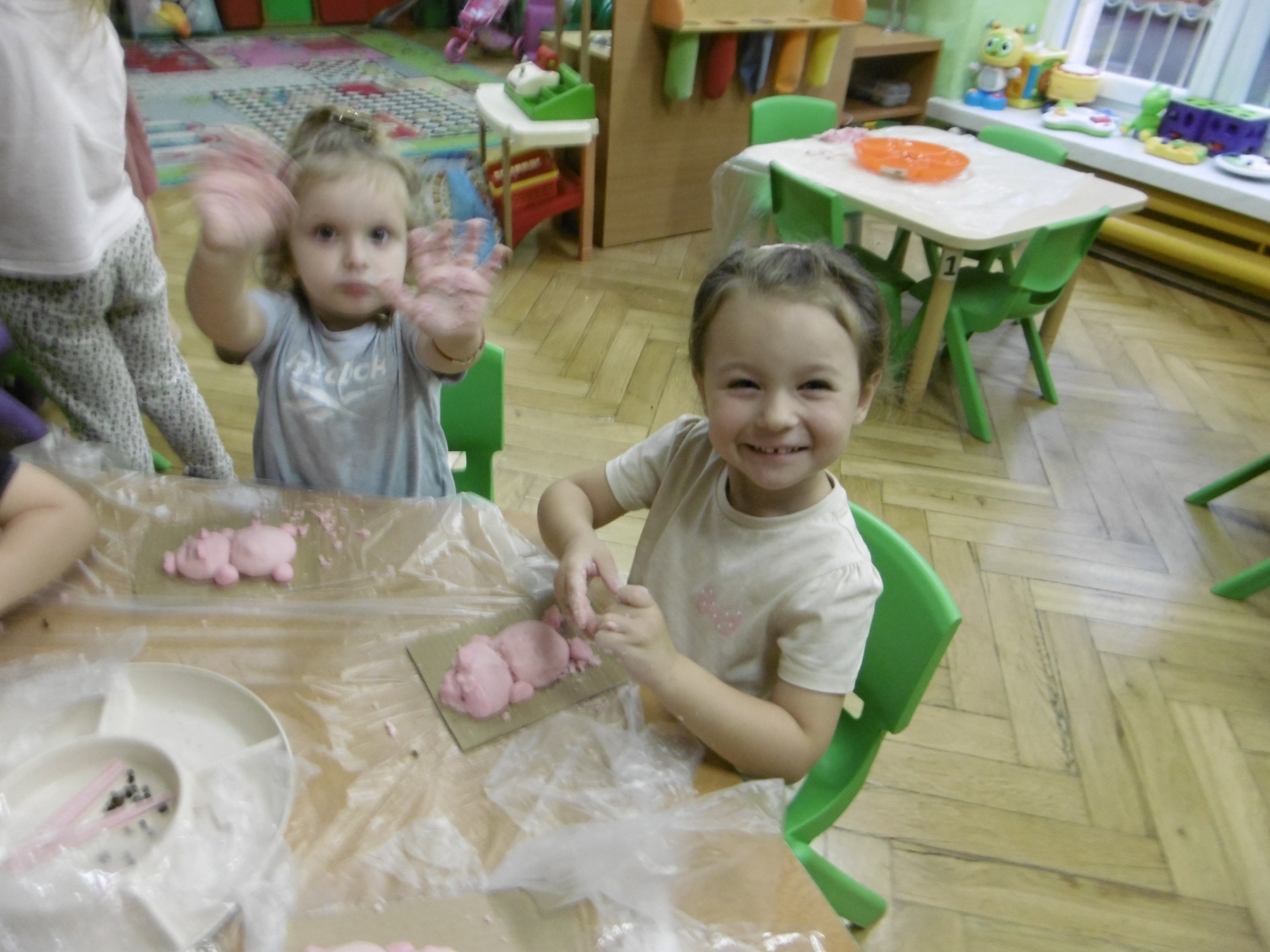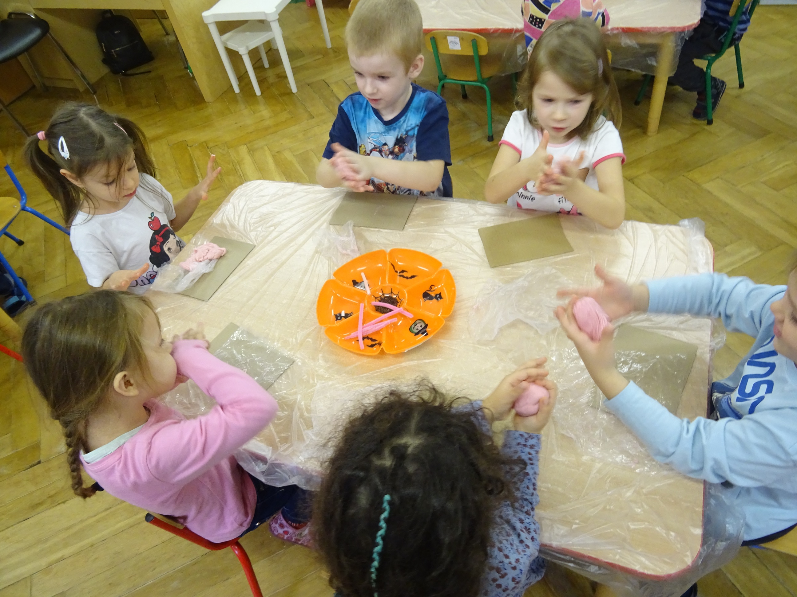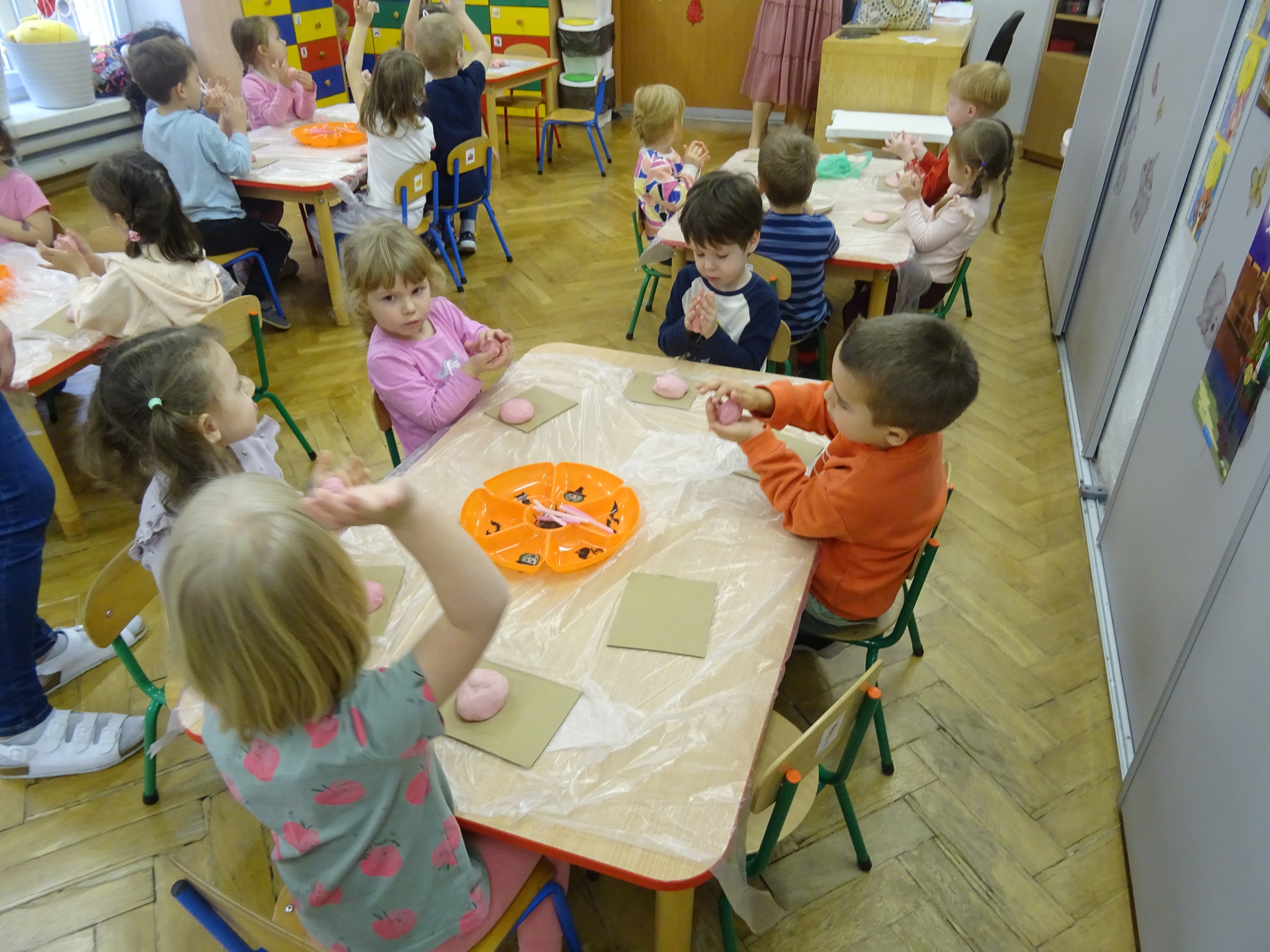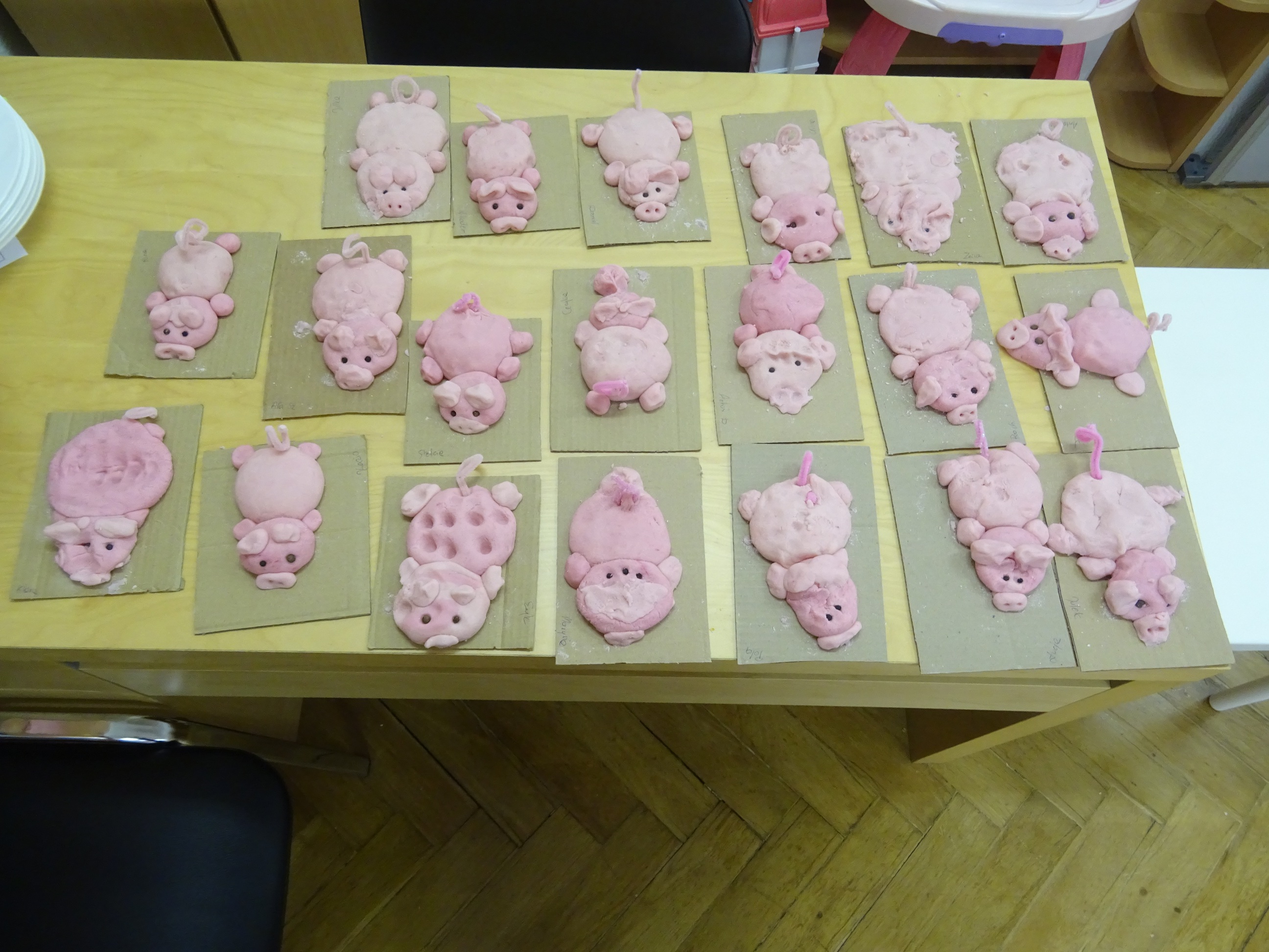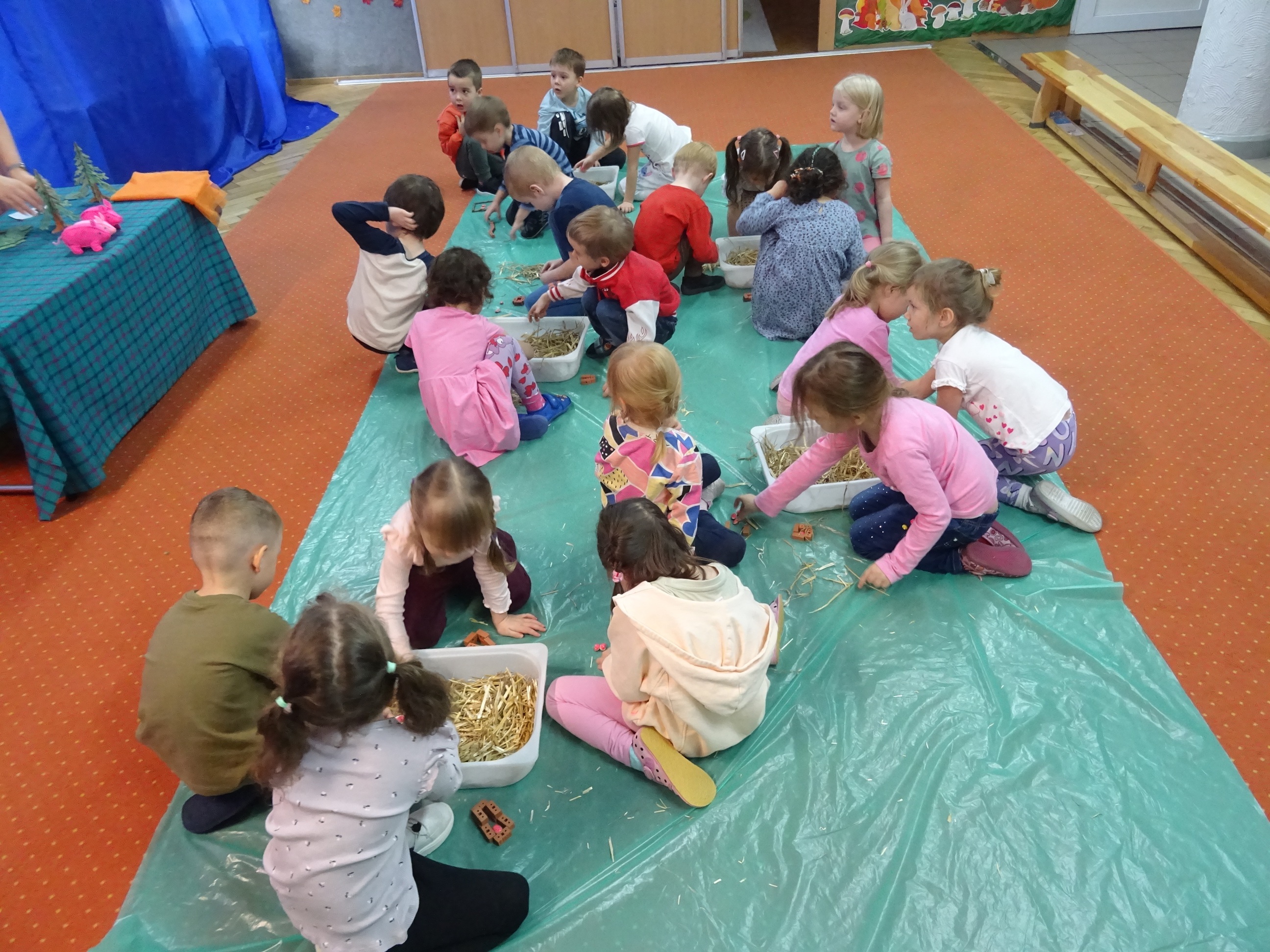 Po obejrzeniu bajki, dzieci wzięły udział w zabawach sensorycznych, podczas których samodzielnie budowały domki dla świnek ze słomy, drewna i cegieł. Nie zabrakło również zabaw ruchowych, kiedy to przedszkolaki pomagały świnkom dostać się do domku oraz tropiły ślady wilka w lesie, a na zakończenie dzieci udały się do swoich sal, gdzie z pomocą prowadzącej warsztaty i swoich cioć lepiły świnki z masy solnej.