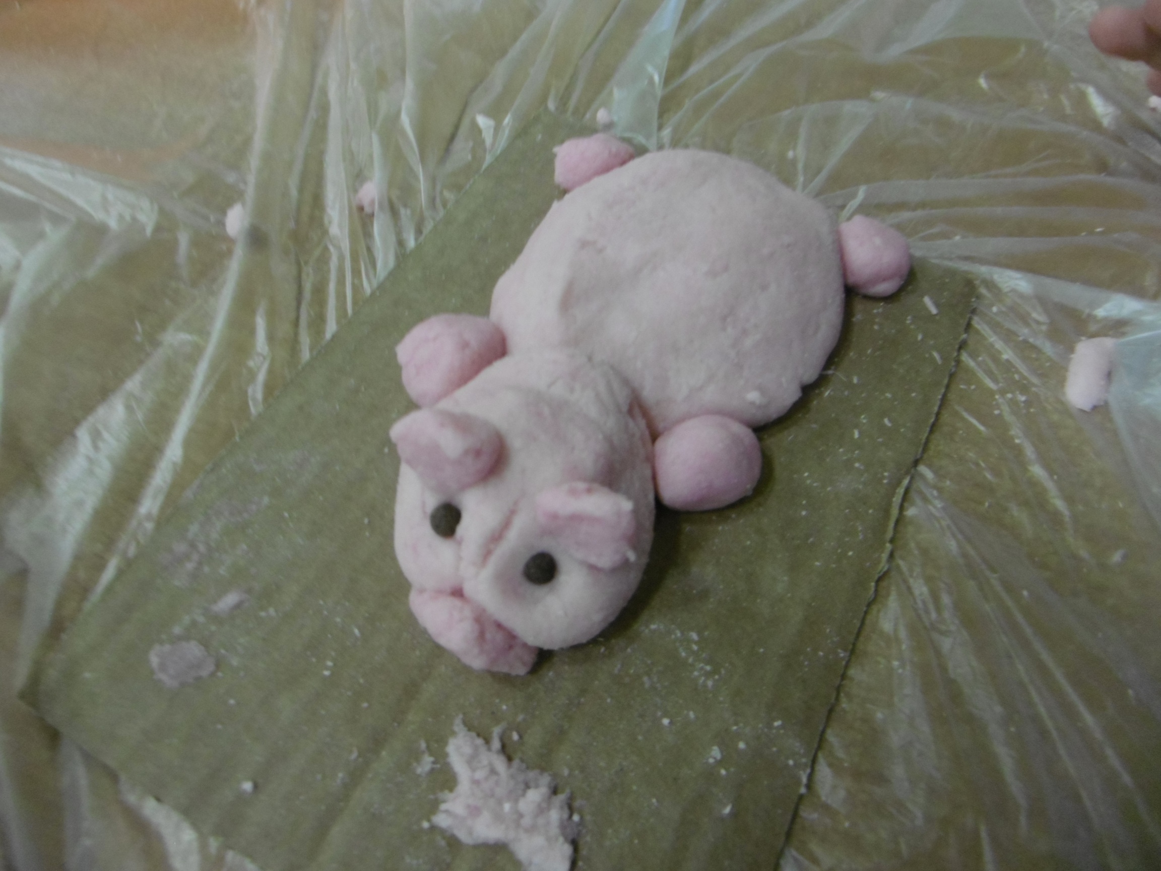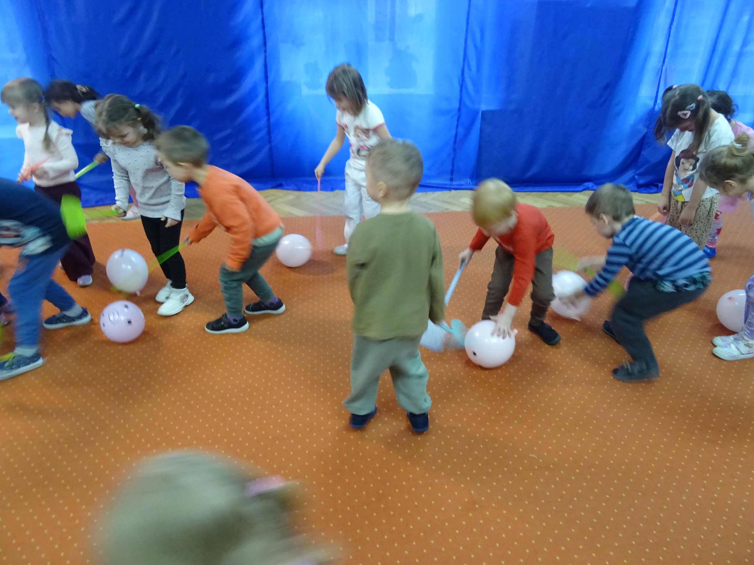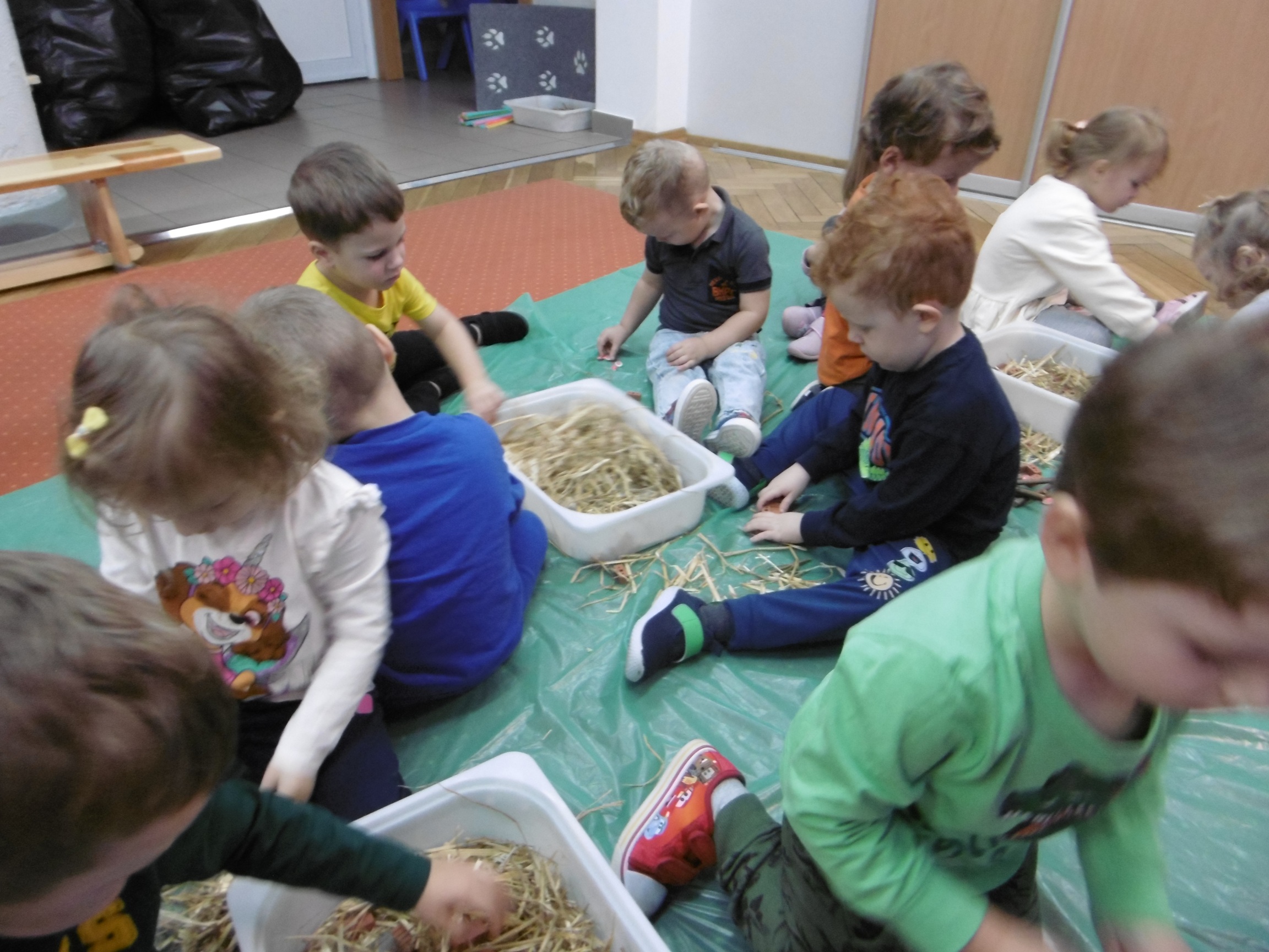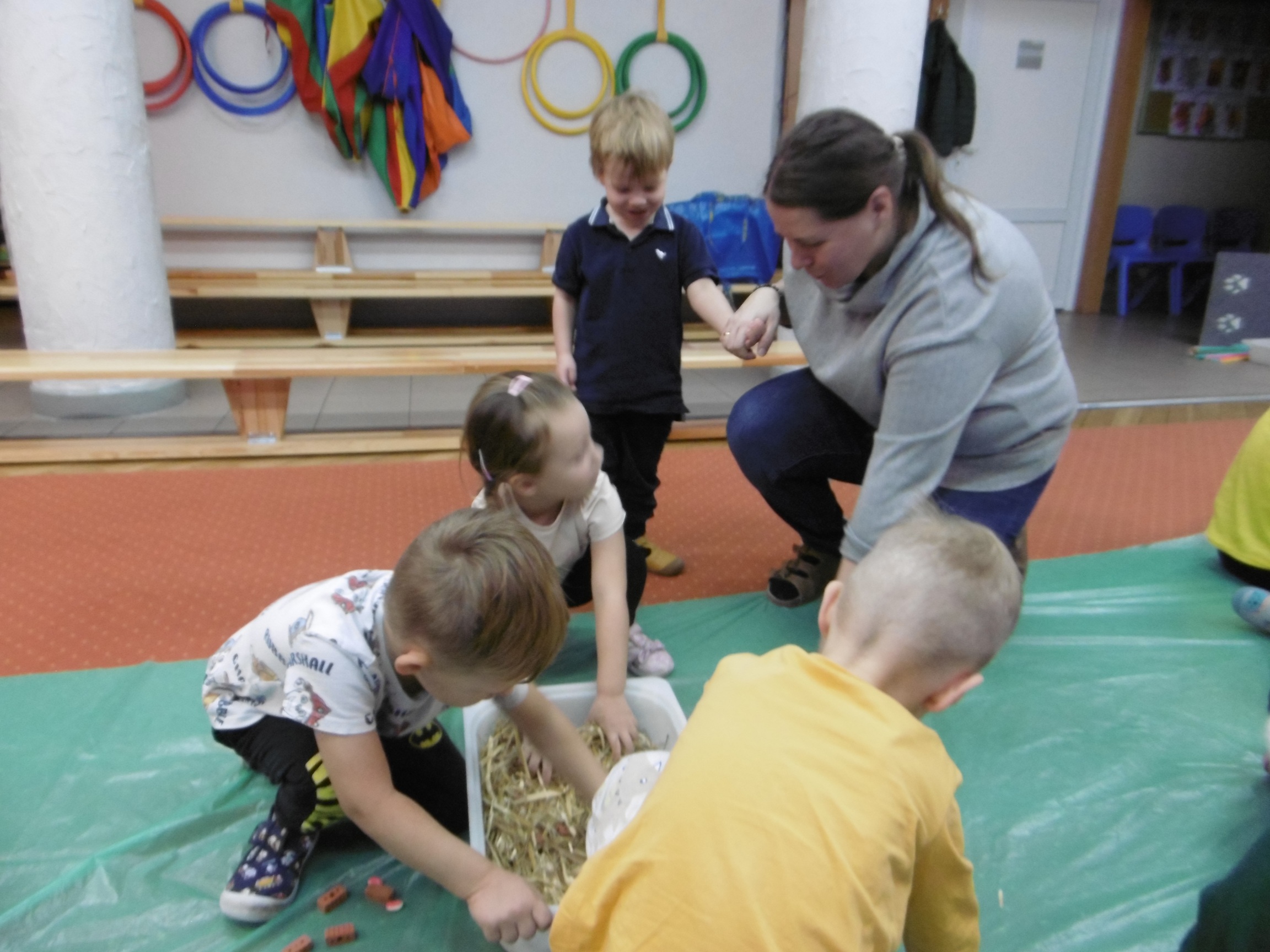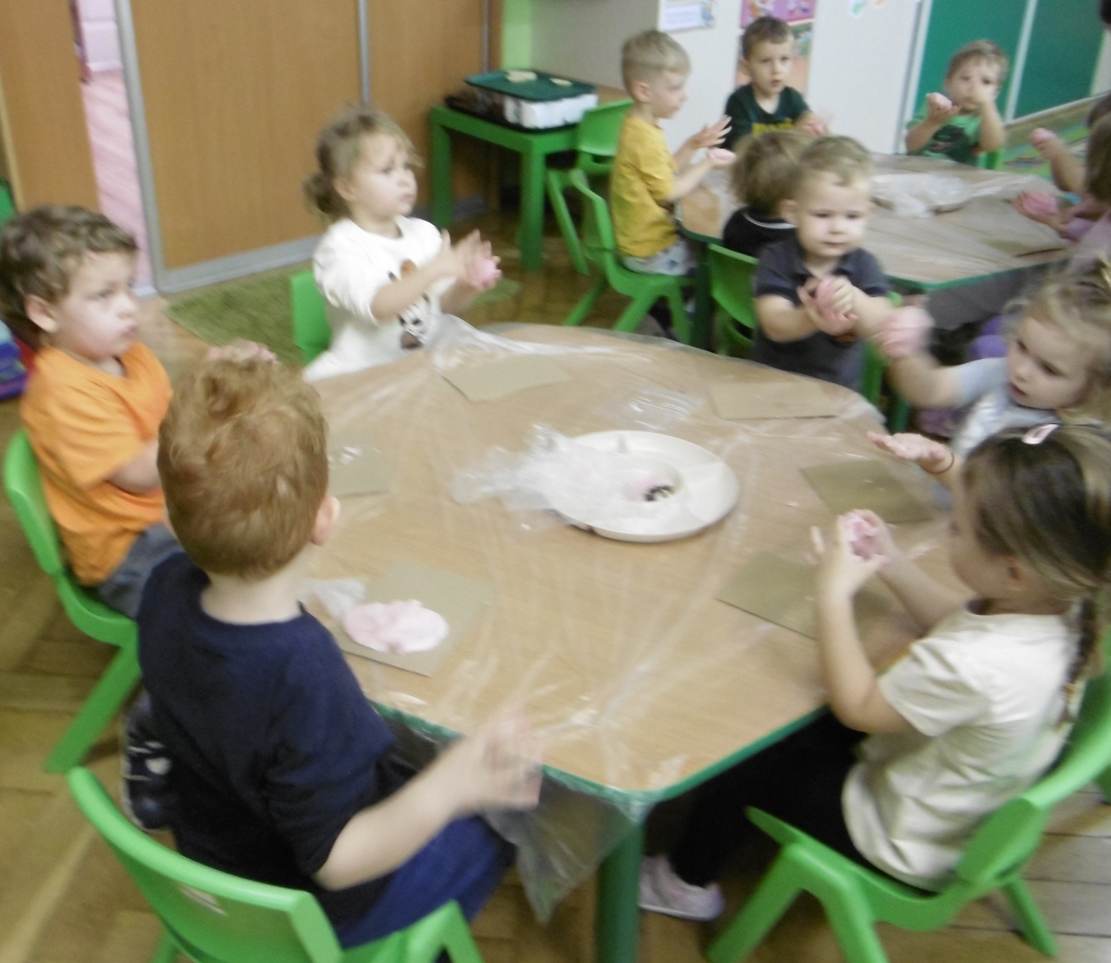 Po obejrzeniu bajki, dzieci wzięły udział w zabawach sensorycznych, podczas których samodzielnie budowały domki dla świnek ze słomy, drewna i cegieł. Nie zabrakło również zabaw ruchowych, kiedy to przedszkolaki pomagały świnkom dostać się do domku oraz tropiły ślady wilka w lesie, a na zakończenie dzieci udały się do swoich sal, gdzie z pomocą prowadzącej warsztaty i swoich cioć lepiły świnki z masy solnej.