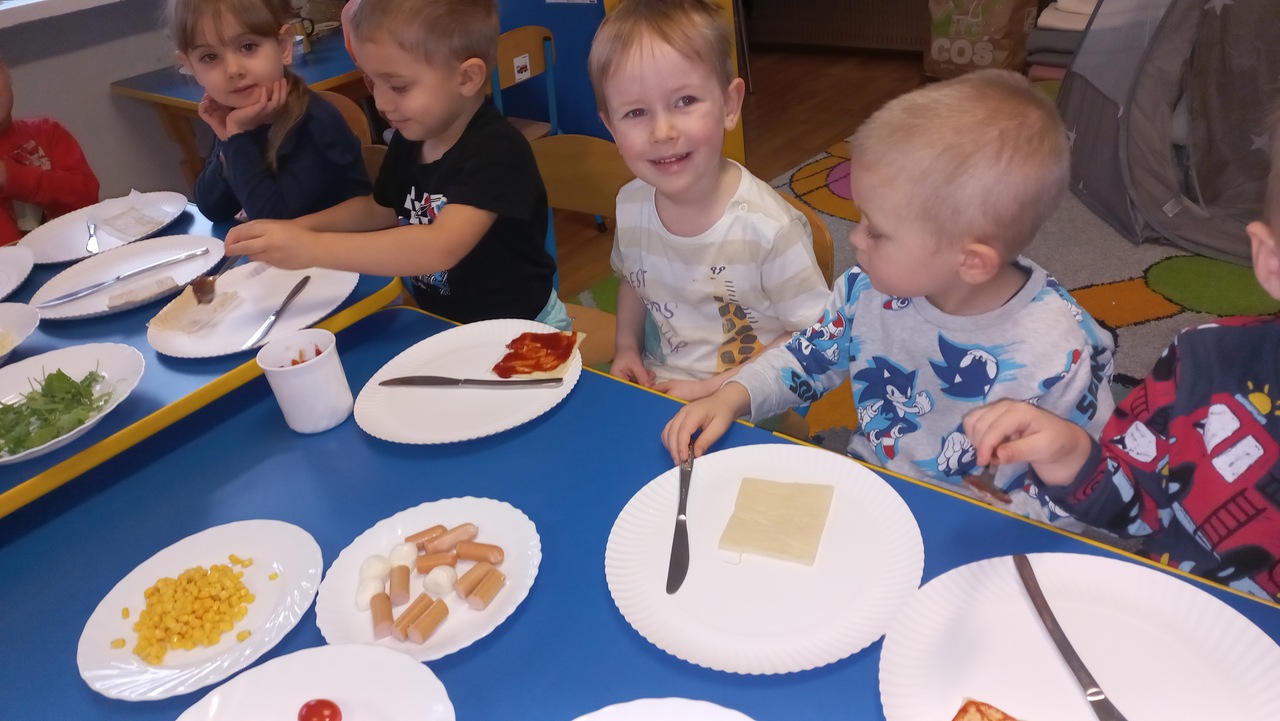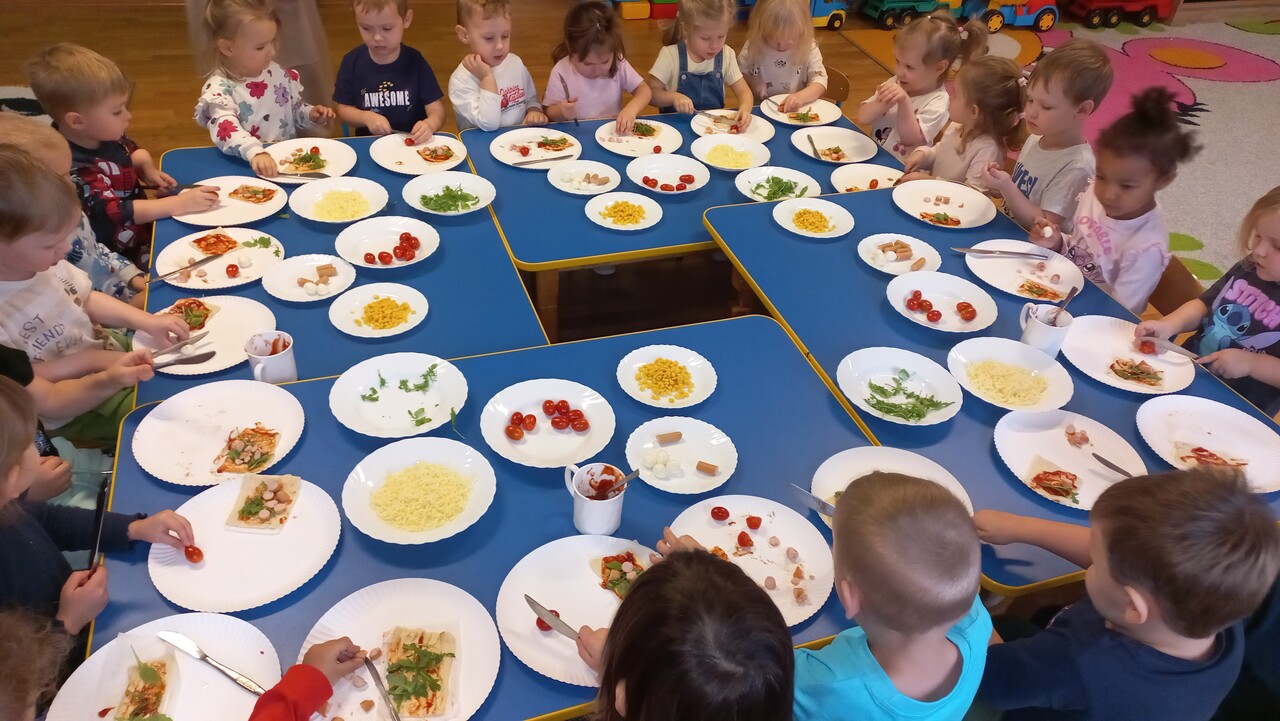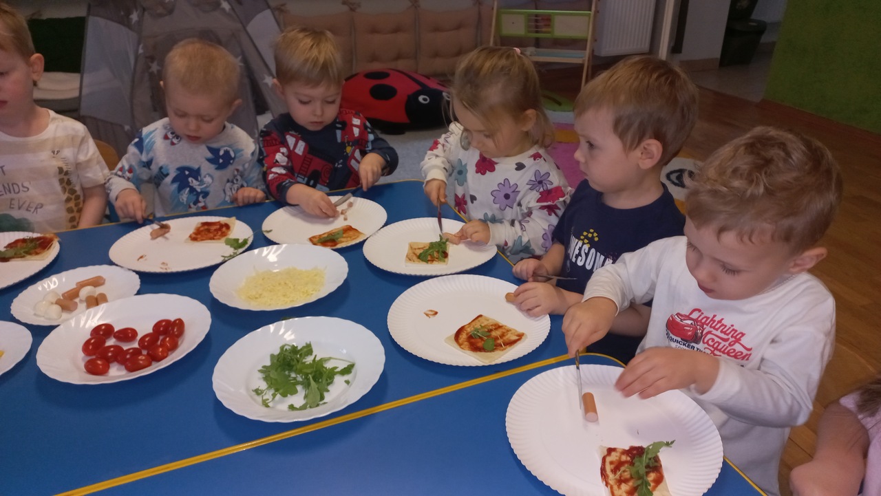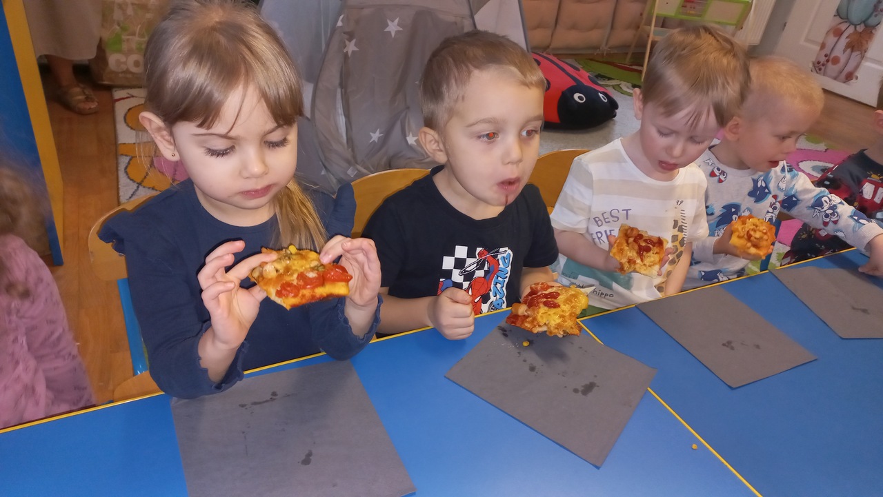 Maluszki od samego rana opowiadały o swoich ulubionych dodatkach do drożdżowego placka, wymieniały ulubione rodzaje pizzy. Dzieci dowiedziały się o kilku ciekawostkach, jak np. o rekordowo dużym placku pizzy upieczonym w 1990 roku w RPA, mającym 37,4m średnicy oraz o pizzy wysyłanej w kosmos! Wzięły udział w licznych zabawach i ćwiczeniach, chętnie pokazały śmieszne minki. Tuptusie wykonały prace plastyczne- ozdobiły placki pizzy ulubionymi składnikami. Na koniec zajęć maluszki samodzielnie wykonały pizze, które zjadły na II śniadanie- rwały, kroiły, układały wybrane dodatki. W całej sali rozniósł się pyszny zapach świeżo pieczonej pizzy i ciągnącego się sera, kiedy cieplutkie pizze zostały podane do stołu!