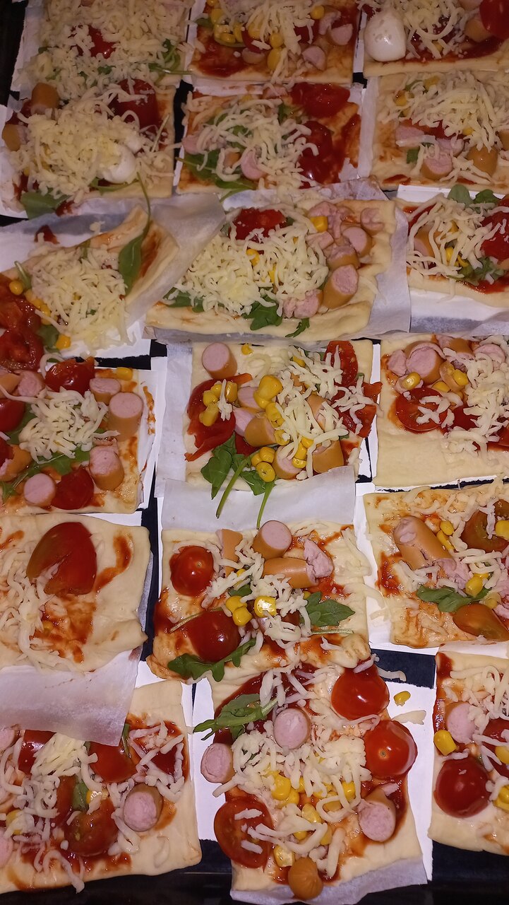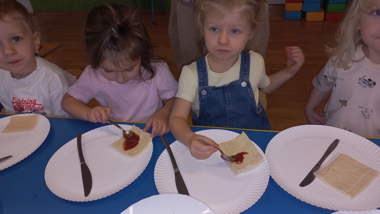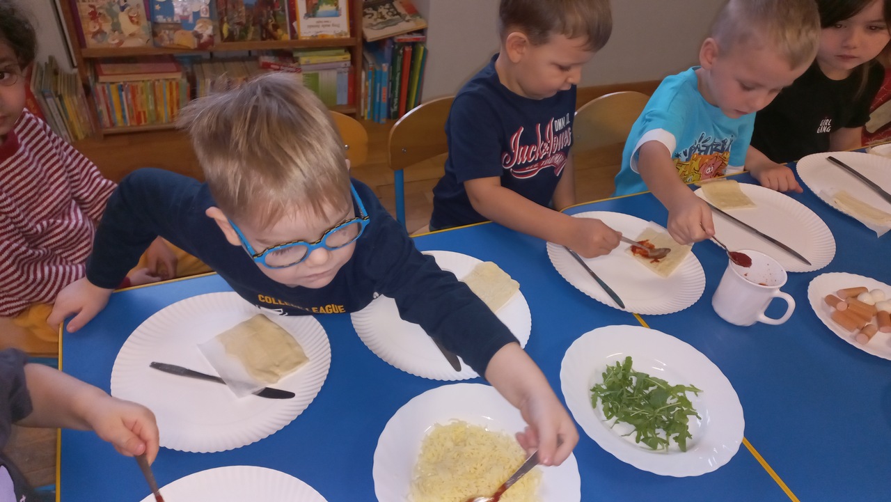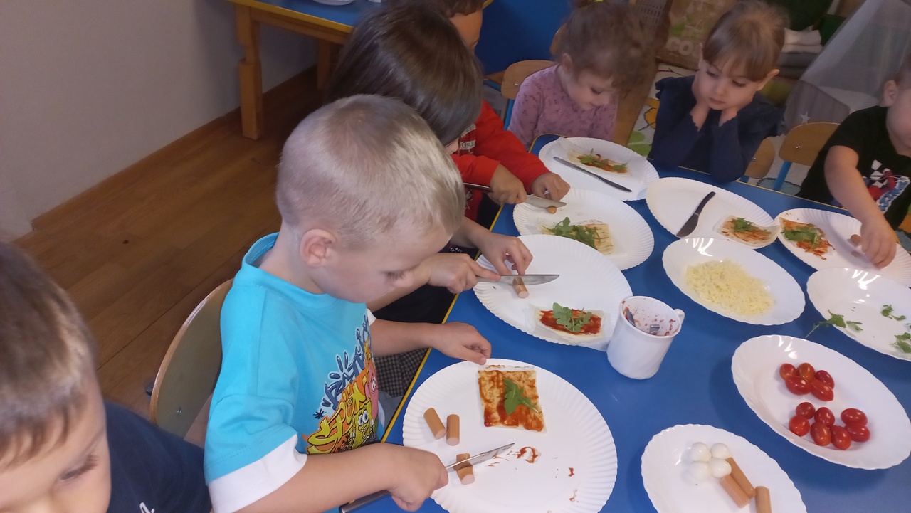 Maluszki od samego rana opowiadały o swoich ulubionych dodatkach do drożdżowego placka, wymieniały ulubione rodzaje pizzy. Dzieci dowiedziały się o kilku ciekawostkach, jak np. o rekordowo dużym placku pizzy upieczonym w 1990 roku w RPA, mającym 37,4m średnicy oraz o pizzy wysyłanej w kosmos! Wzięły udział w licznych zabawach i ćwiczeniach, chętnie pokazały śmieszne minki. Tuptusie wykonały prace plastyczne- ozdobiły placki pizzy ulubionymi składnikami. Na koniec zajęć maluszki samodzielnie wykonały pizze, które zjadły na II śniadanie- rwały, kroiły, układały wybrane dodatki. W całej sali rozniósł się pyszny zapach świeżo pieczonej pizzy i ciągnącego się sera, kiedy cieplutkie pizze zostały podane do stołu!