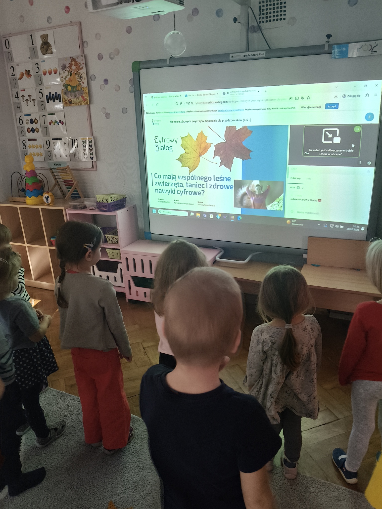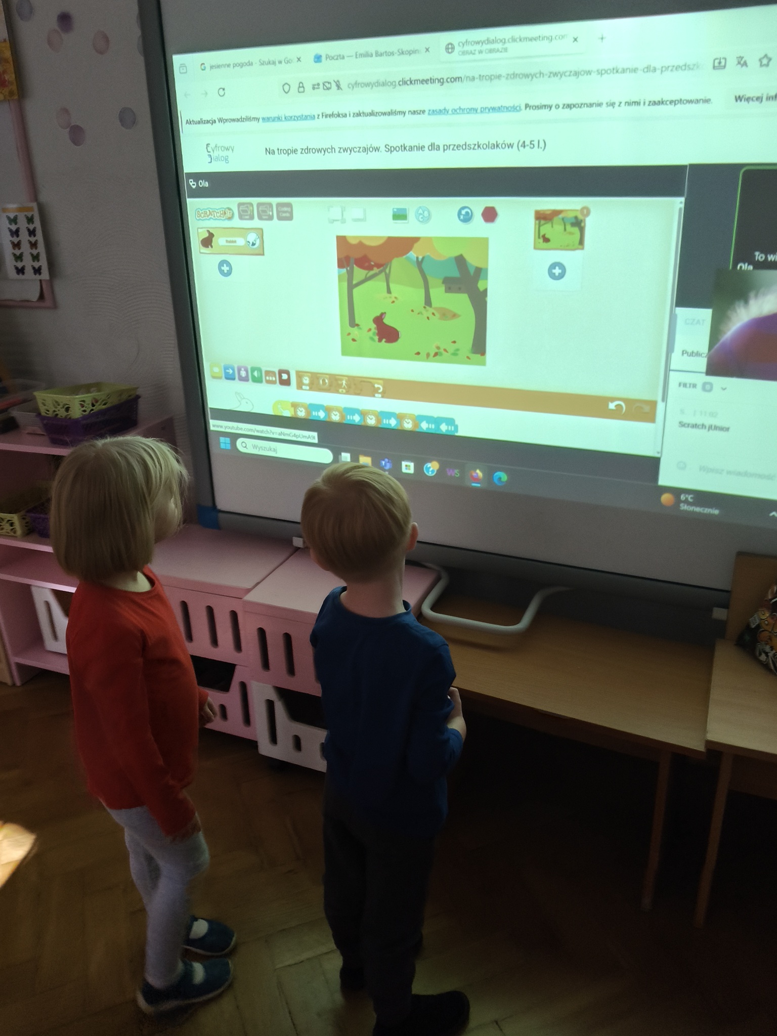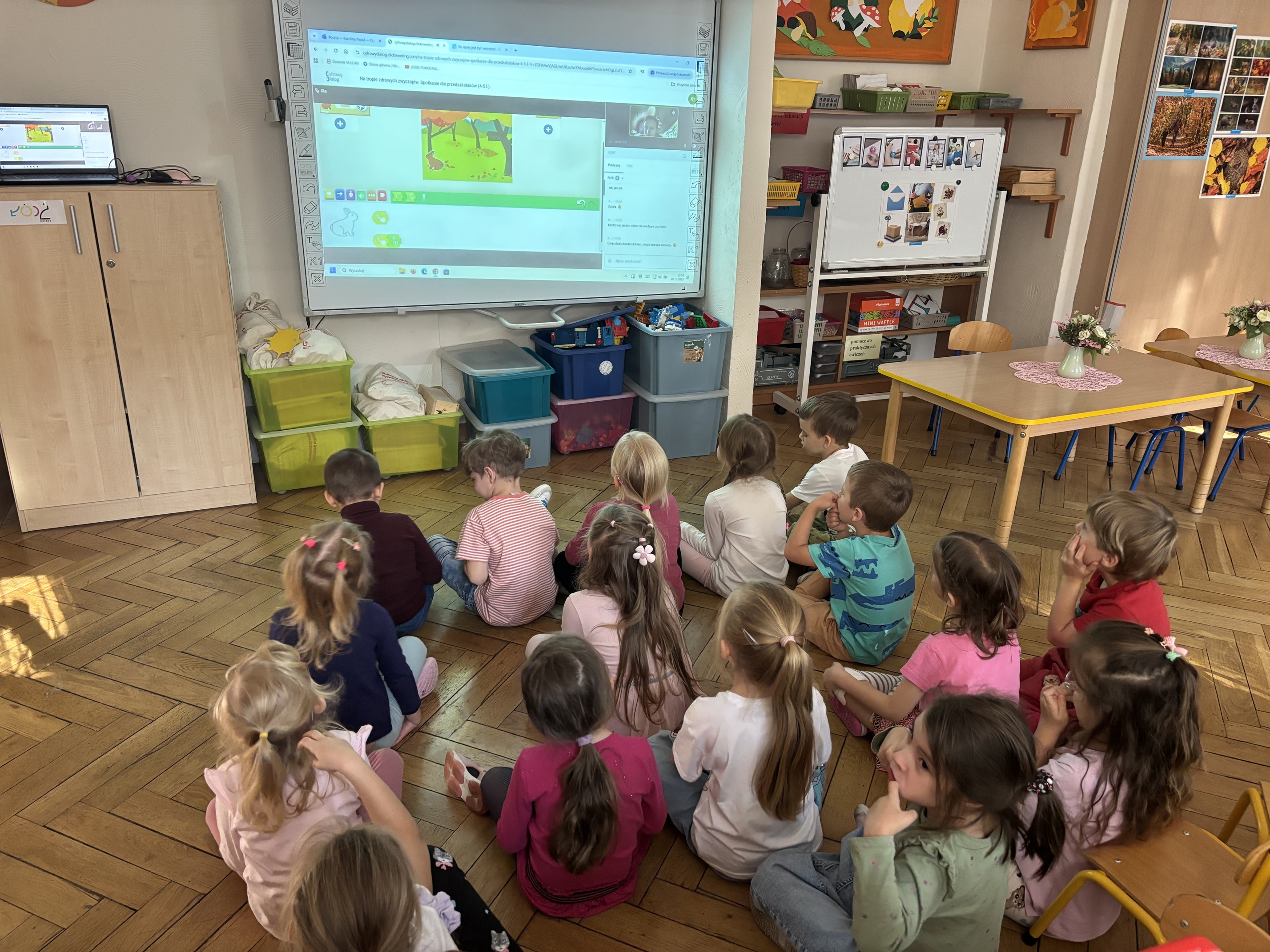 W ramach Europejskiego Tygodnia Kodowania – Code Week dzieci z grup: Smyki i Żaki odkrywały, czym jest kodowanie. Przedszkolaki uczestniczyły w zajęciach online „Na tropie zdrowych zwyczajów” przygotowanych przez Stowarzyszenie Cyfrowy Dialog. Podczas interaktywnych warsztatów dzieci przekonały się, co wspólnego mają leśne zwierzęta, taniec i zdrowe nawyki cyfrowe. Zamieniły się w małych detektywów-koderów i odkrywały tropy leśnych zwierząt, które pomogły odszyfrować kod do zdrowych nawyków cyfrowych. Kodowały ruchem i rozwiązywały jesienne zagadki z pomocą ScratchJr.