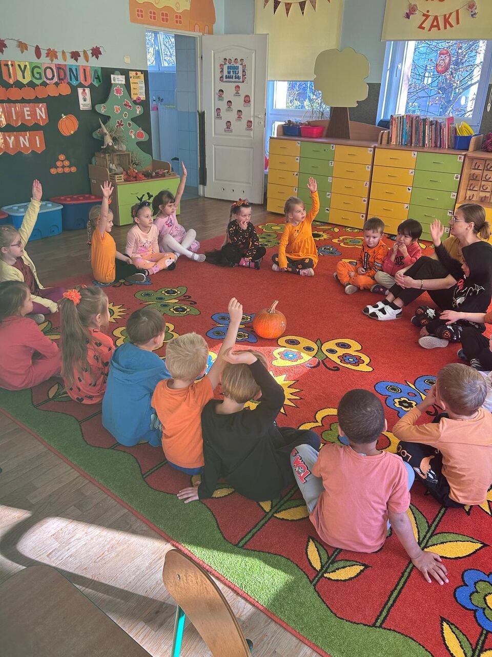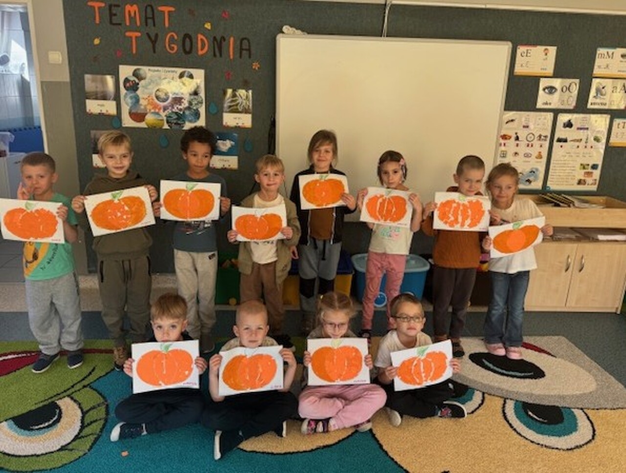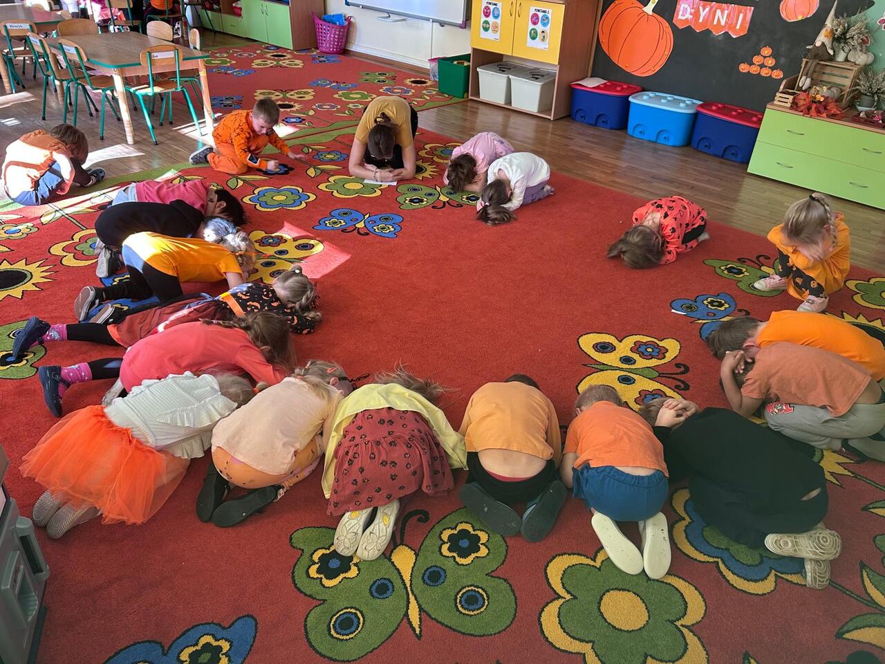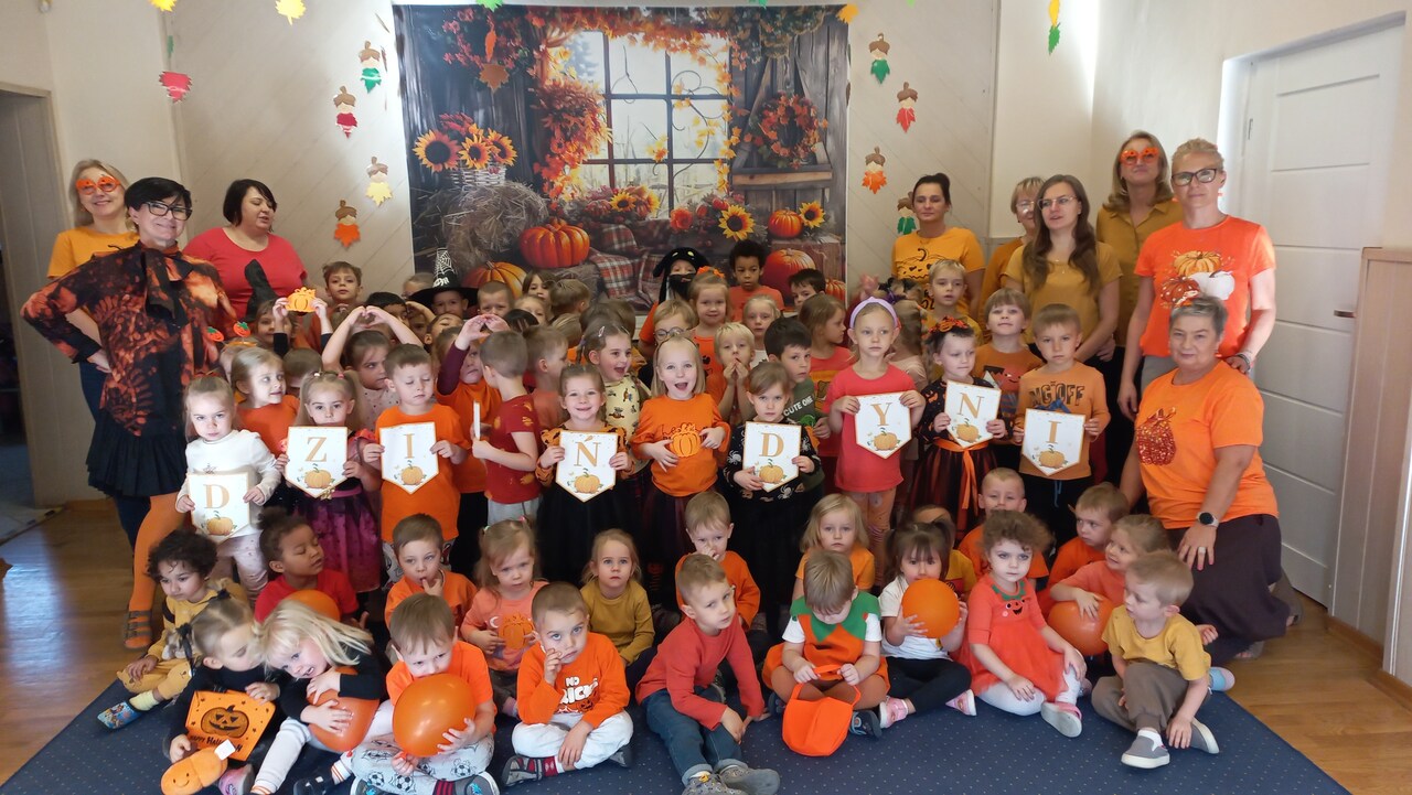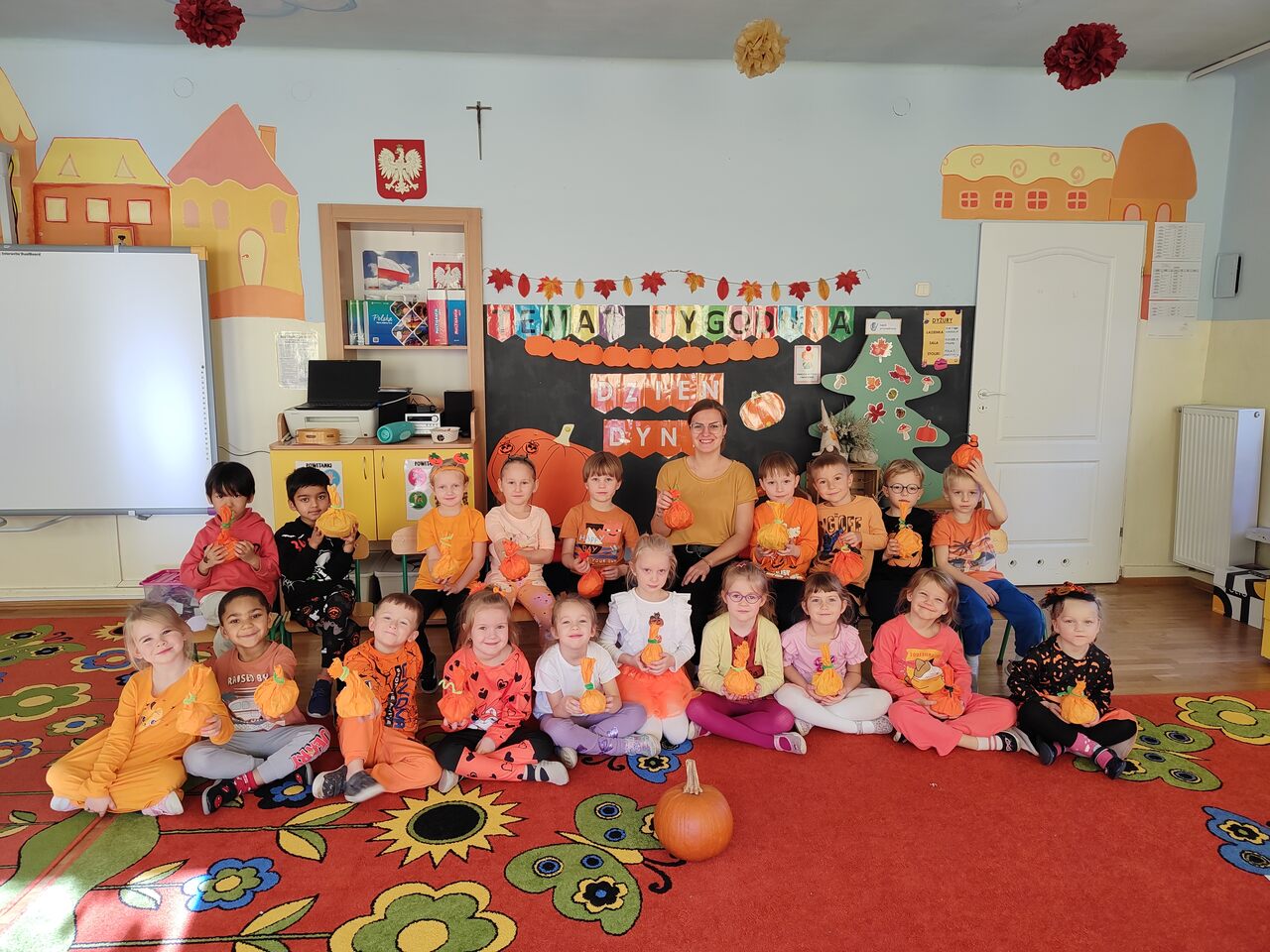 31.10.2025r. świętowaliśmy Dzień Dyni. Niemal wszystkie dzieci przyszły tego dnia ubrane na pomarańczowo, dzięki czemu nasze przedszkole zamieniło się w dyniowe pole!!! Każda grupa wiekowa zorganizowała zajęcia tematycznie związane z dyniami i kolorem pomarańczowym. Maluszki wyszły do pobliskiej Biblioteki Miejskiej „Dygresja”, aby uczestniczyć w dyniowych warsztatach- wysłuchały opowiadania, wykonały pracę plastyczną, wzięły udział w sesji zdjęciowej, a nawet poczęstowały się super kwaśnym cukierkiem! Żaczki w trakcie zajęć poznały różne rodzaje dyń oraz ich przeznaczenie, a przede wszystkim wykonały wspaniałe prace plastyczne- dynie z bibuły. Natomiast Juniorzy skupili się tego dnia na zabawach i konkursach ruchowych, podczas których nieodzownym elementem była dynia. Skorzystaliśmy z okazji i na koniec dnia wykonaliśmy wspólne, dyniowo- pomarańczowe, zdjęcie!!!