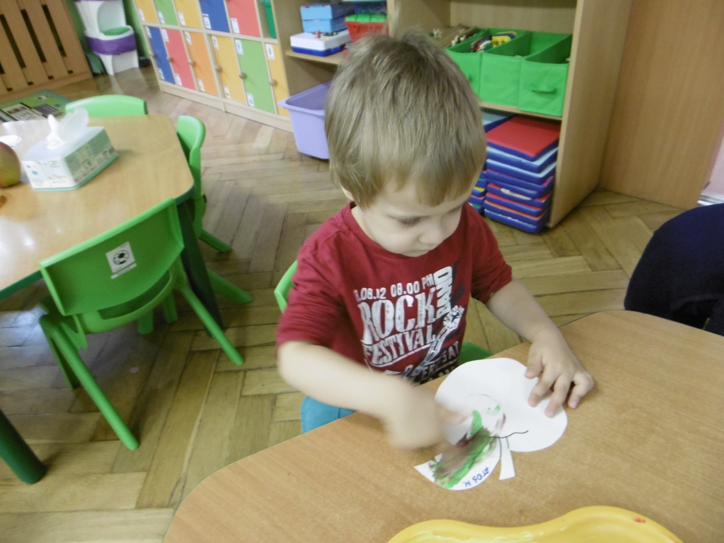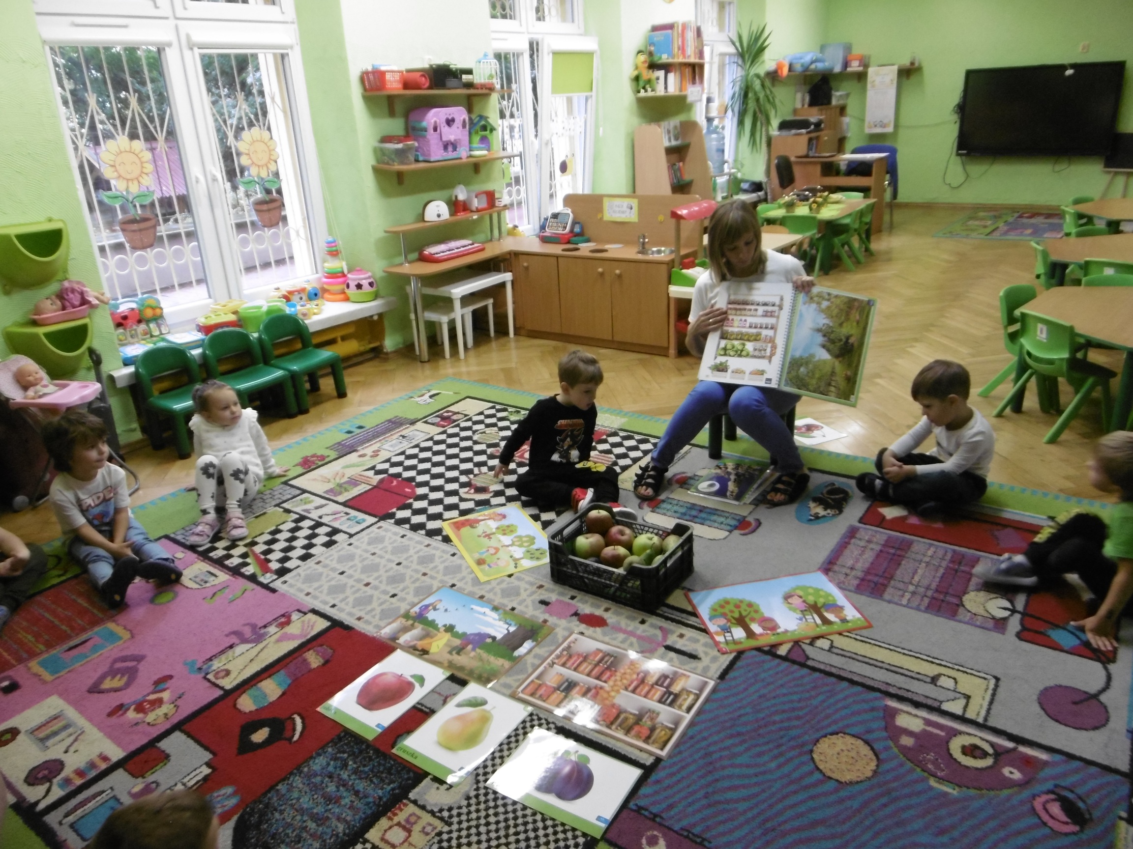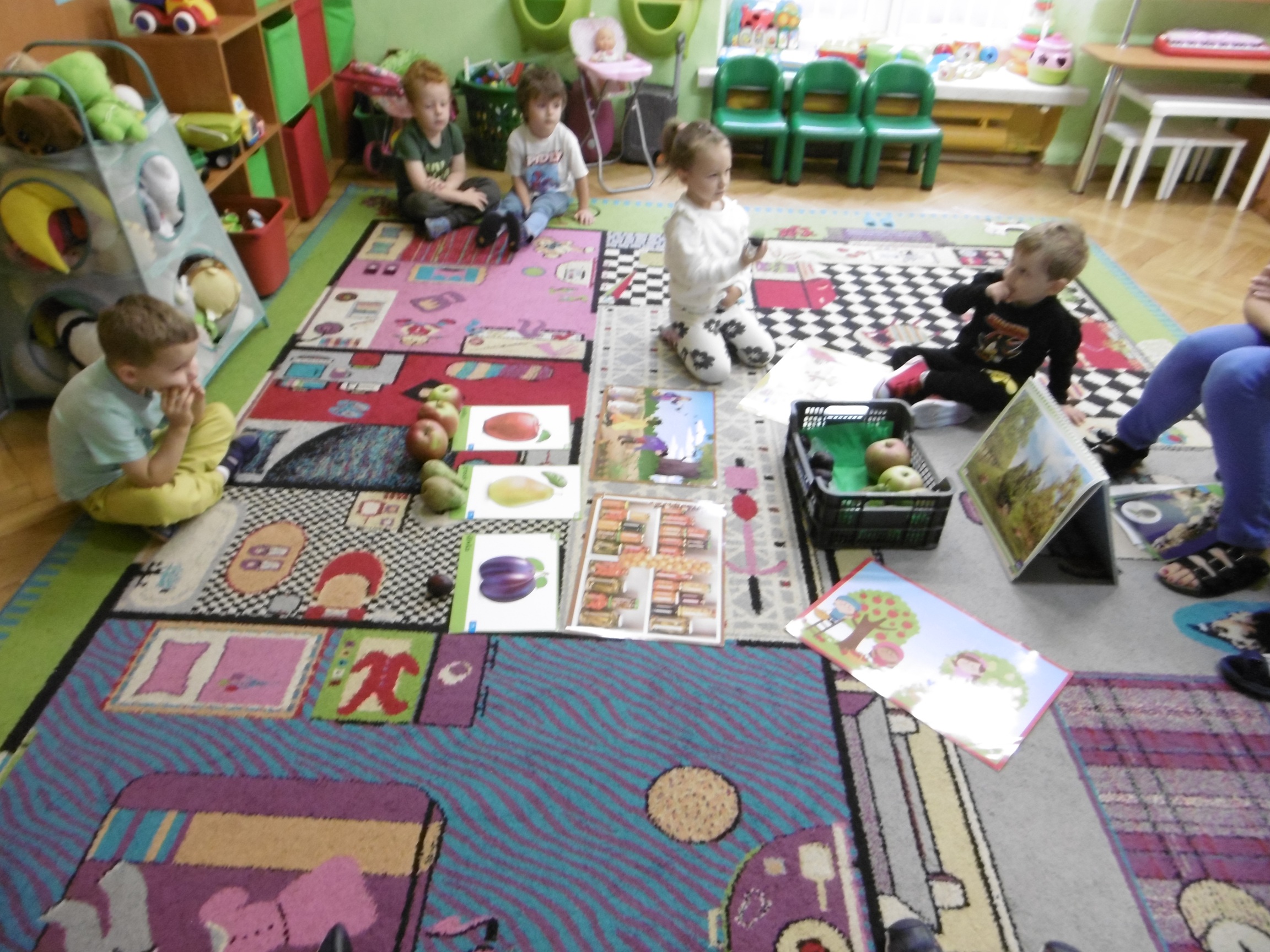 Dzieci słuchały wierszy o sadzie i poznały owoce, które są w nim najczęściej uprawiane. Miały także okazję ich dotknąć, powąchać, policzyć oraz pomalować farbami owoce z Sadu Pani Jesieni. Tuptusie dowiedziały się również na czym polega praca ogrodnika-sadownika oraz podczas opowieści ruchowych same miały okazję zbierać kolorowe owoce.