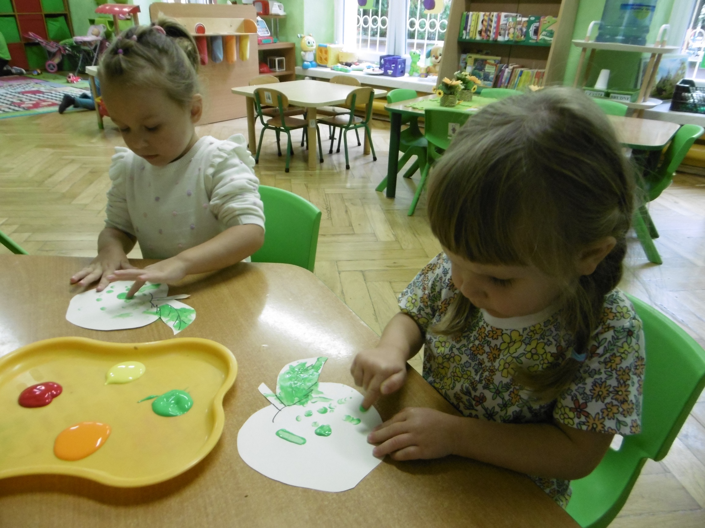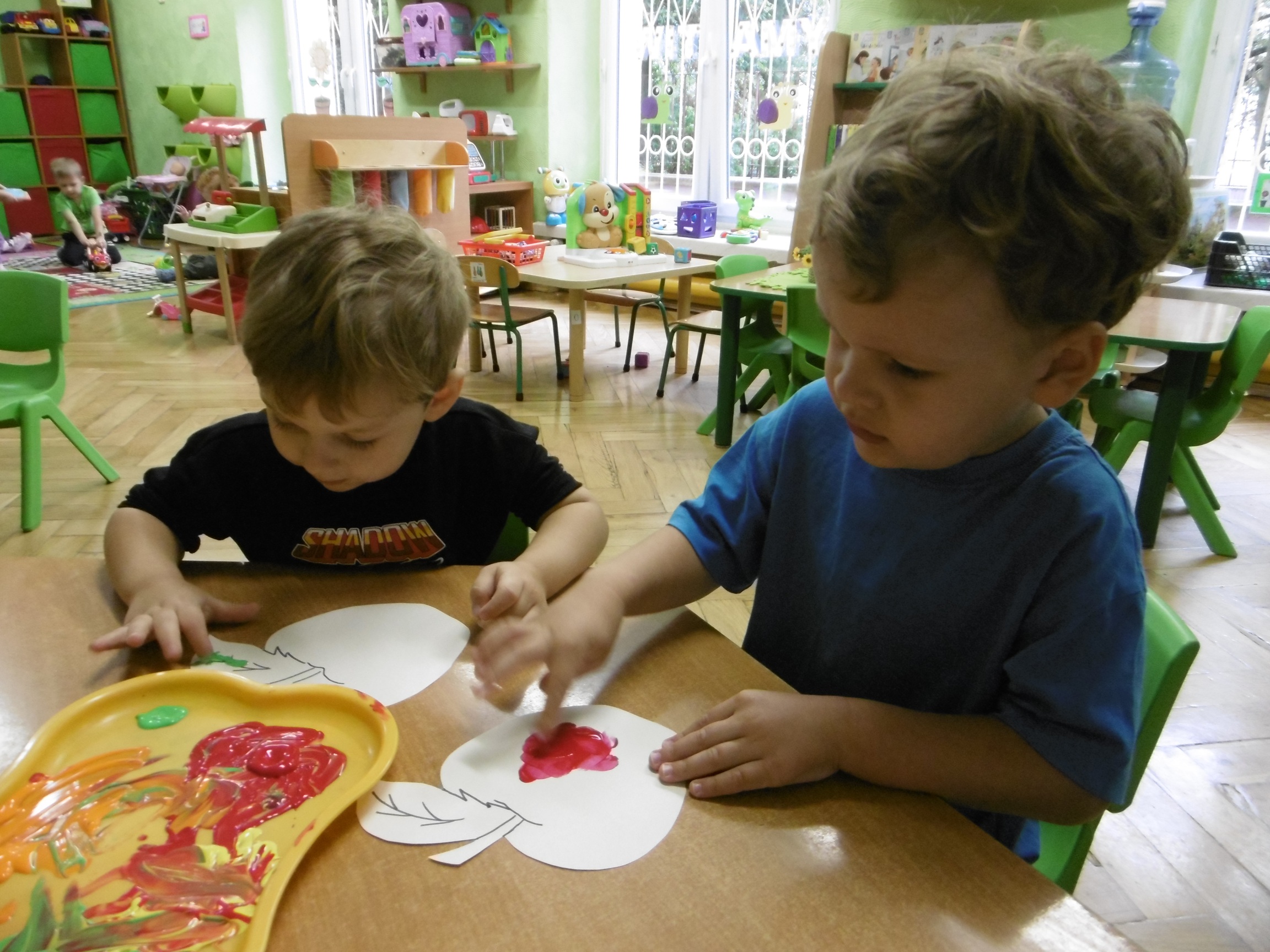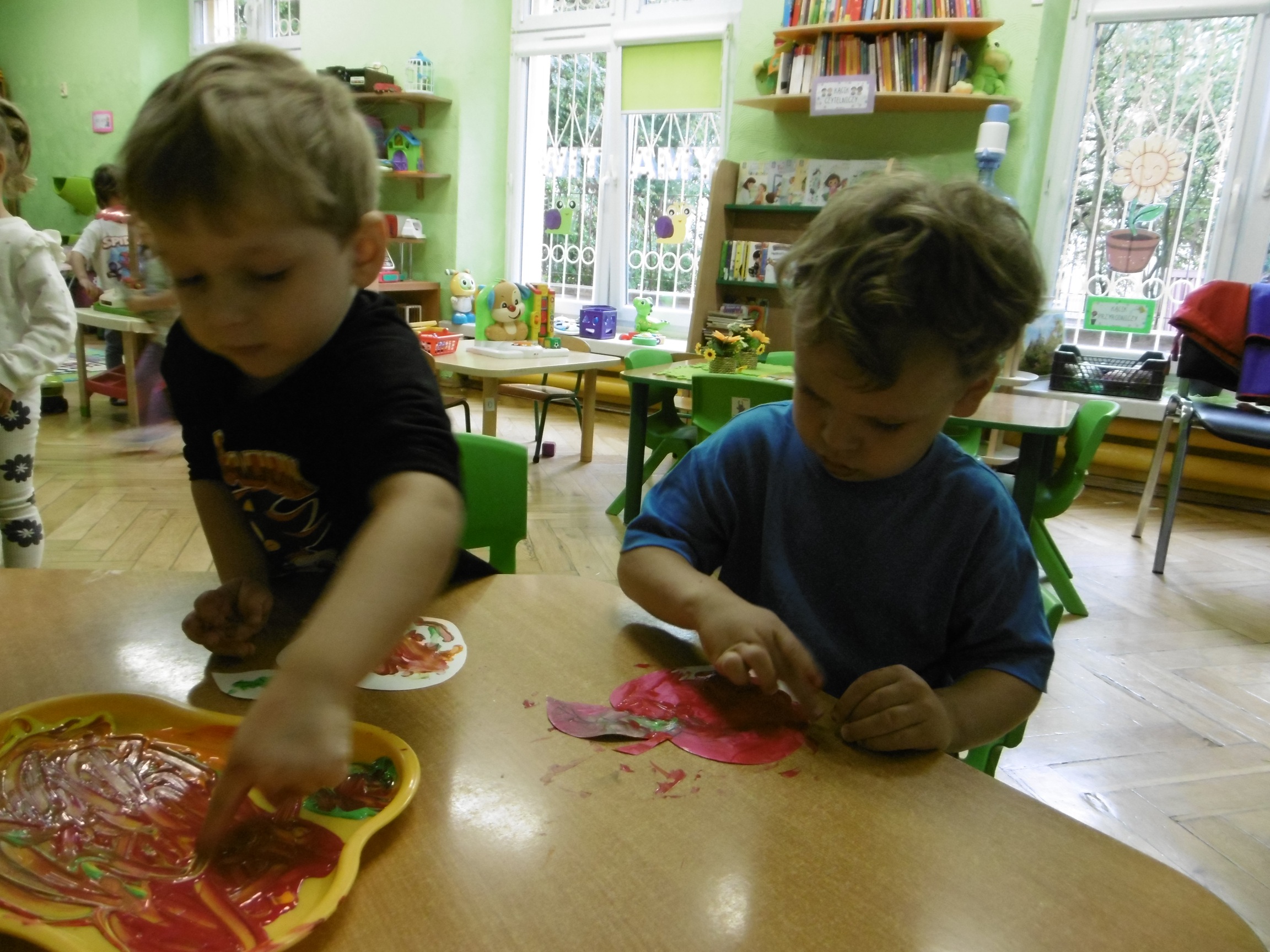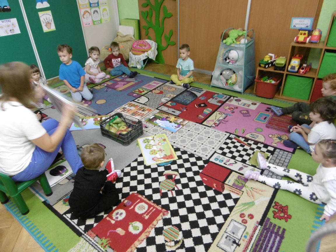 Dzieci słuchały wierszy o sadzie i poznały owoce, które są w nim najczęściej uprawiane. Miały także okazję ich dotknąć, powąchać, policzyć oraz pomalować farbami owoce z Sadu Pani Jesieni. Tuptusie dowiedziały się również na czym polega praca ogrodnika-sadownika oraz podczas opowieści ruchowych same miały okazję zbierać kolorowe owoce.