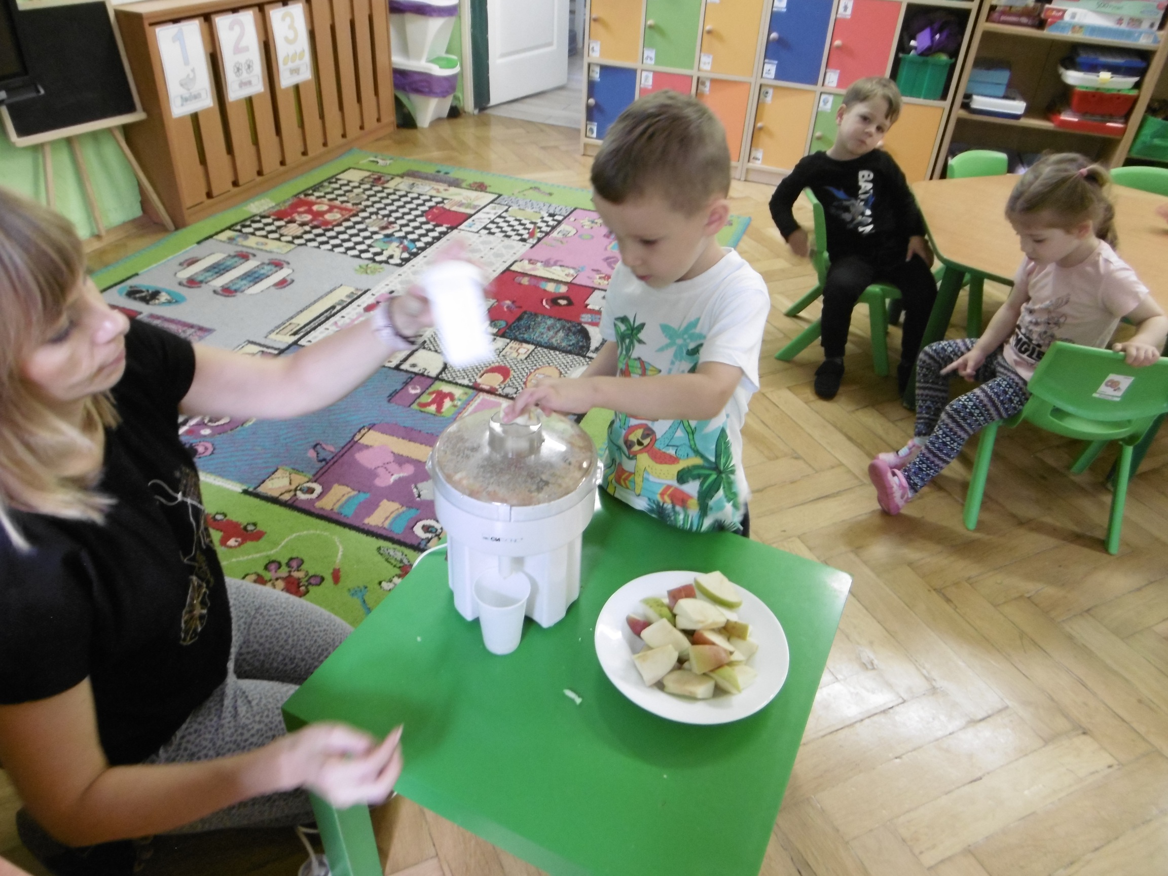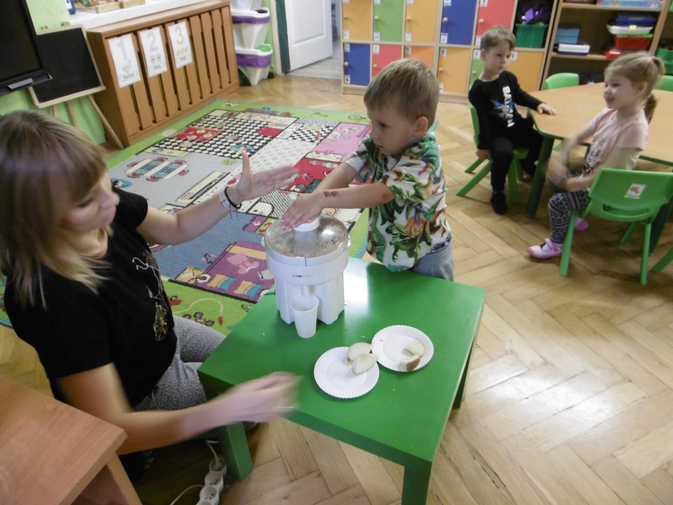 Na podsumowanie zajęć Tuptusie przygotowały ze swoimi ciociami przepyszny soczek ze świeżo wyciskanych jabłuszek, który z ogromną chęcią wypiły. Poczęstowały taką bombą witaminową także wszystkie ciocie i wujków w przedszkolu.