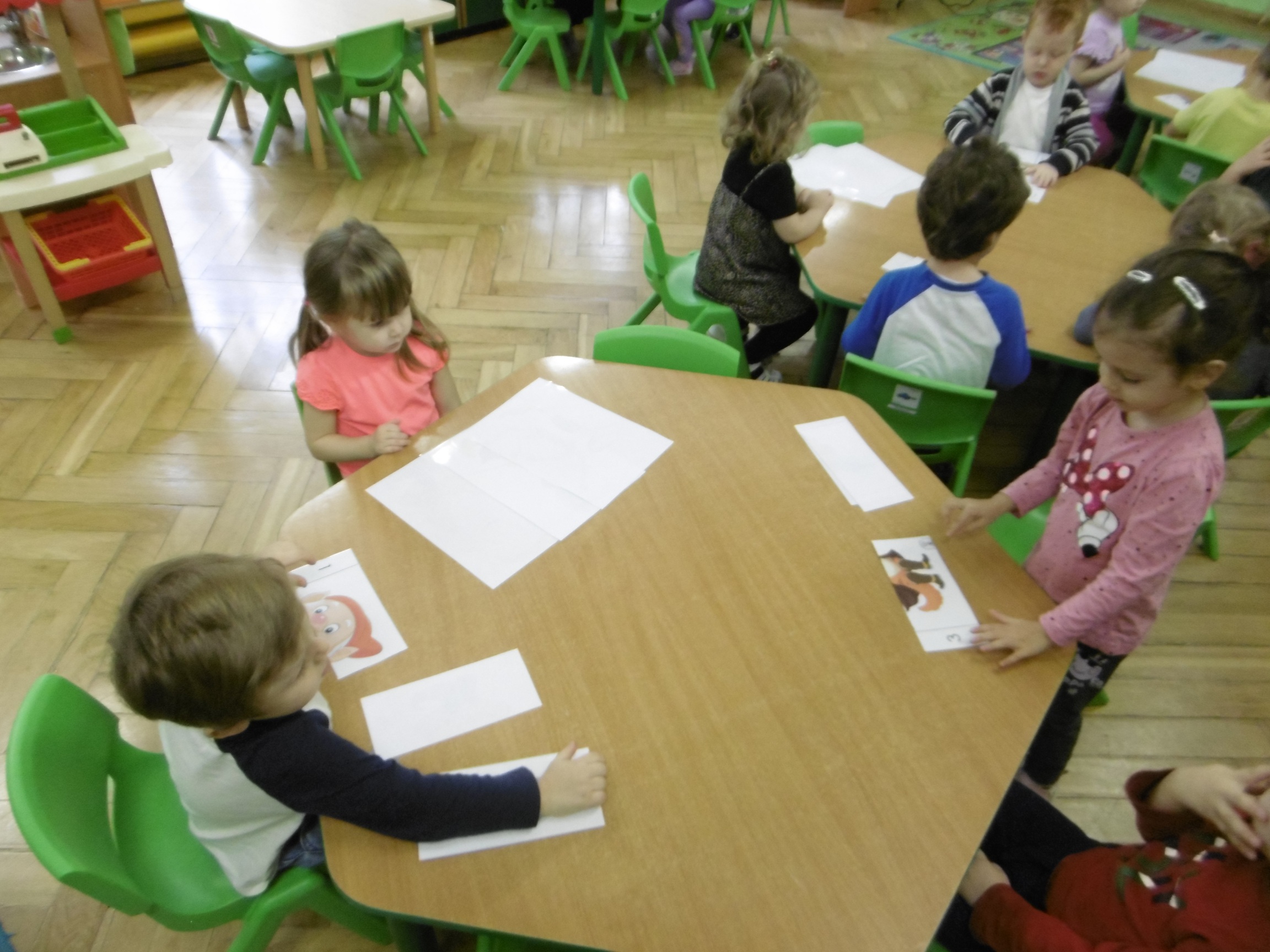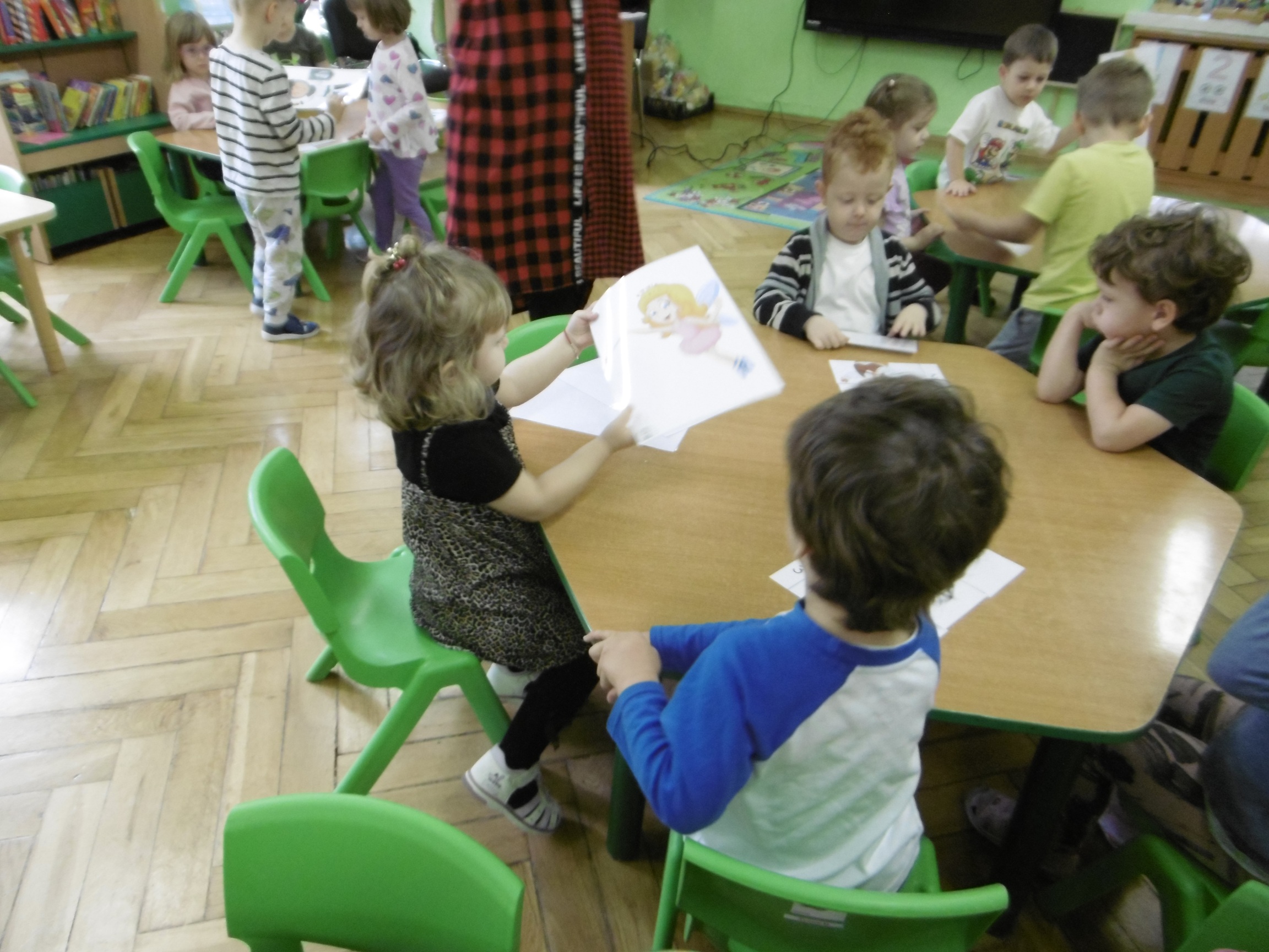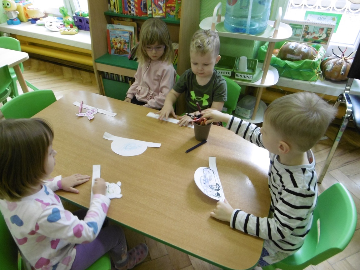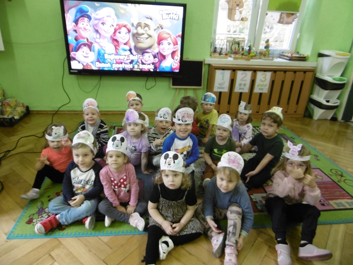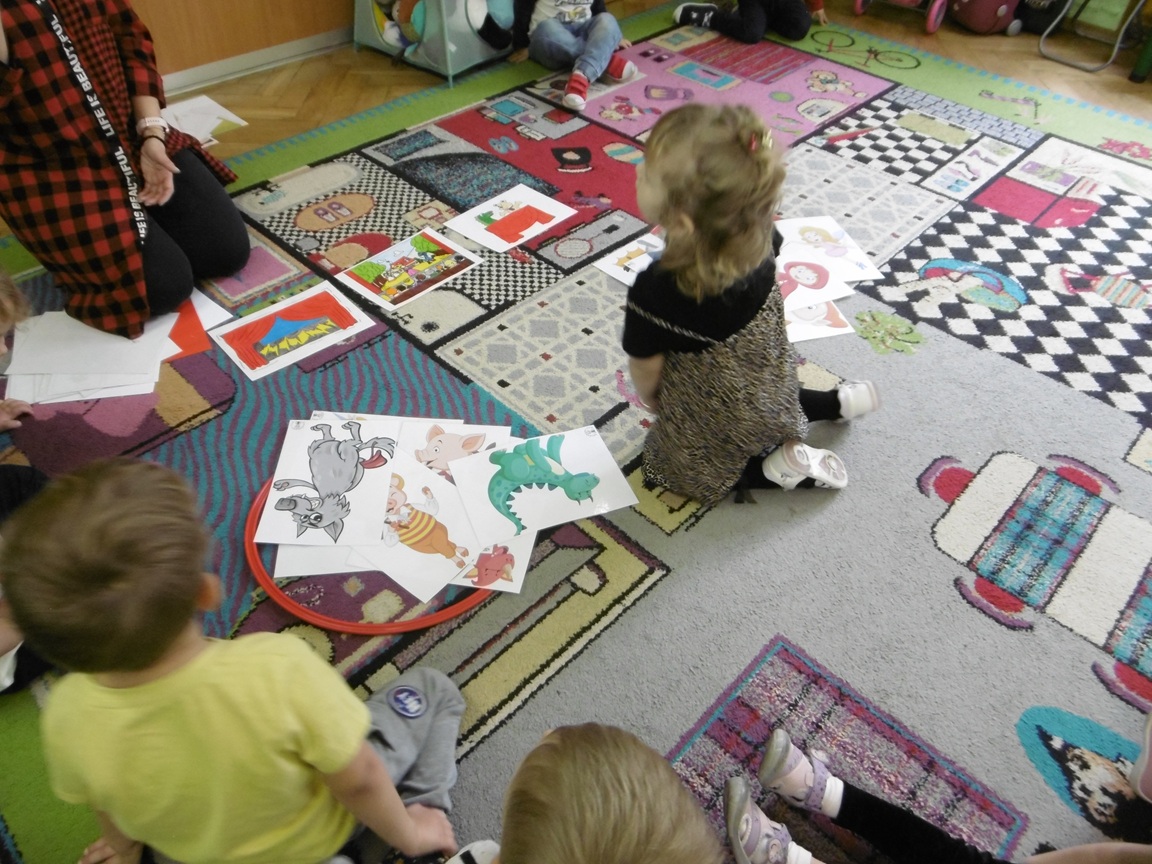 W trakcie obchodów Dnia Postaci z bajek, dzieci z grupy Tuptusie rozmawiały o tym, gdzie można się spotkać z bajkami dla dzieci (w książkach, w telewizji, w teatrze, czy w kinie). Przedszkolaki wymieniały także bohaterów ulubionych bajek dla dzieci i ich segregowały. Następnie składały z części obrazki przedstawiające bajkowych bohaterów oraz wyszukiwały ,,taką samą’’ postać przedstawioną na dużym obrazku. Tuptusie wykonały także opaski na głowę przedstawiające swoje ulubione postaci z bajek dla dzieci. Uczestniczyły też w zabawie przy niezwykle tanecznej muzyce. Przedszkolaki wysłuchały także bajki o ,,Czerwonym Kapturku’’, a następnie wykonały pracę, podczas której dopasowywały brakujące elementy do dużego obrazka.