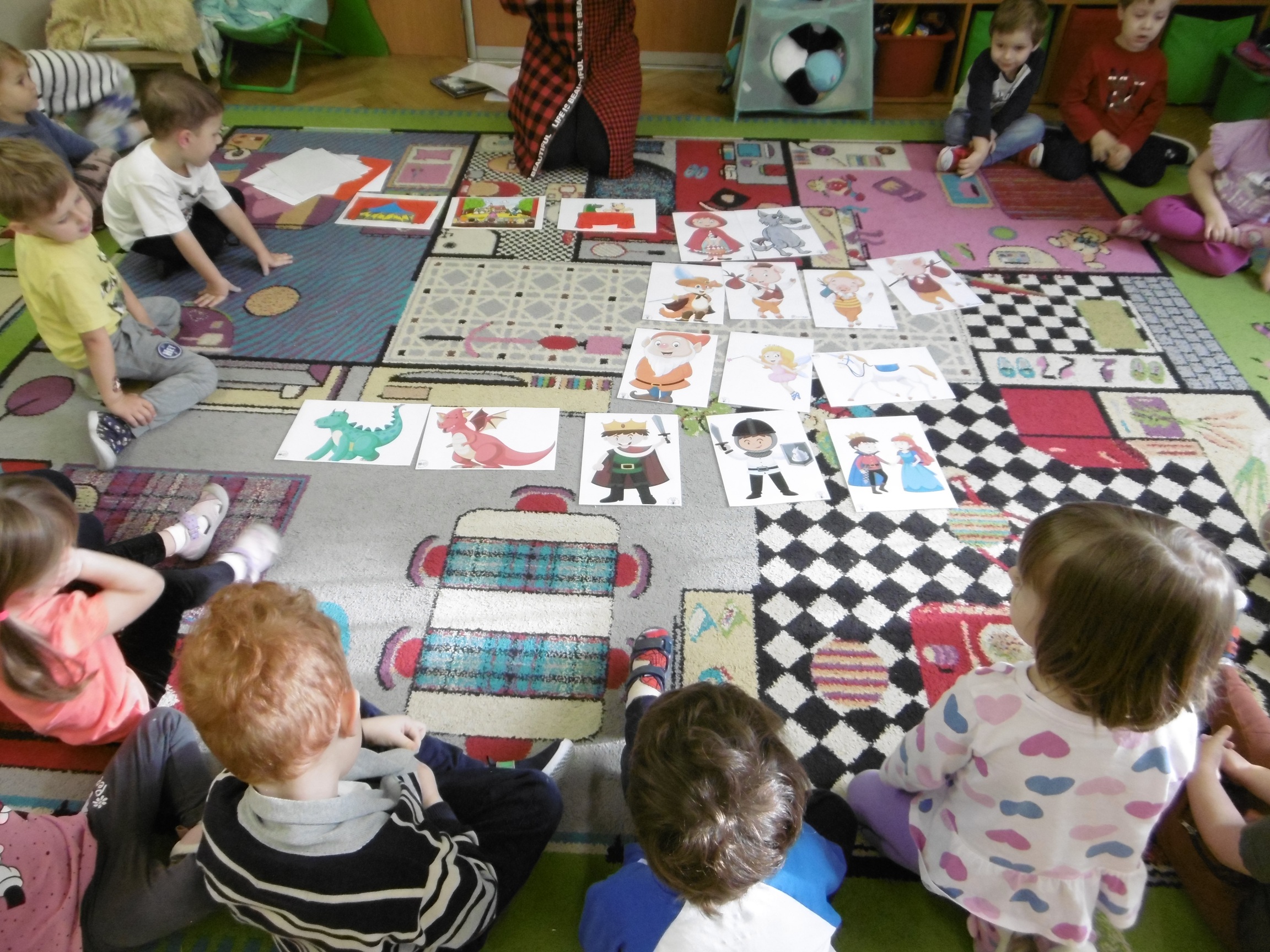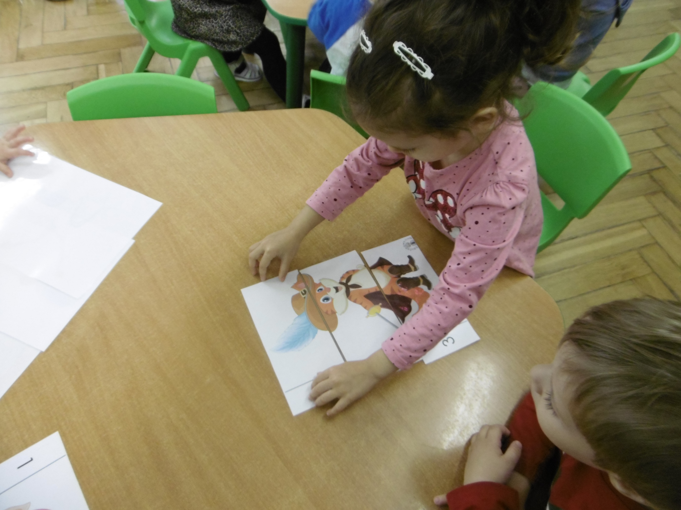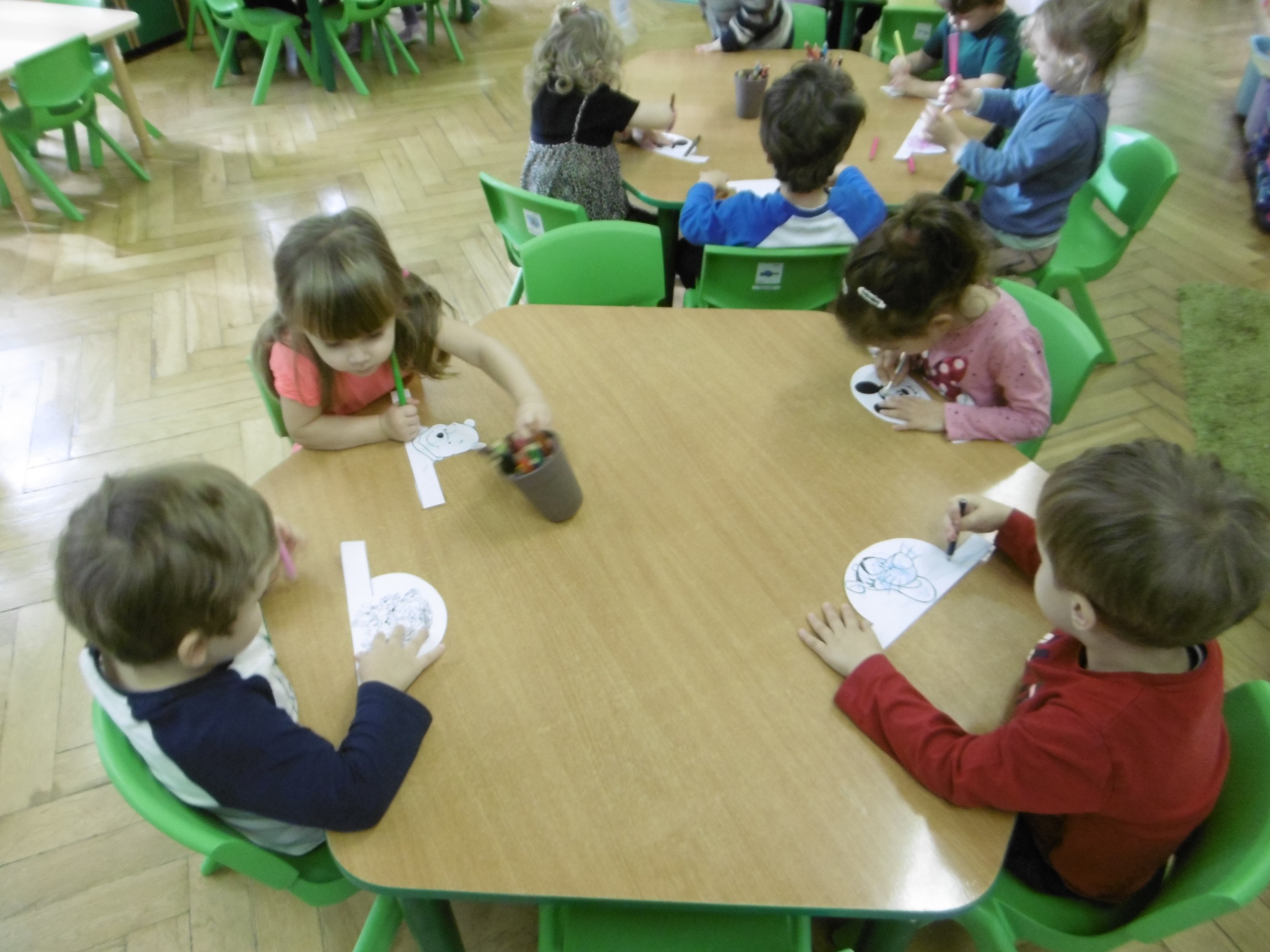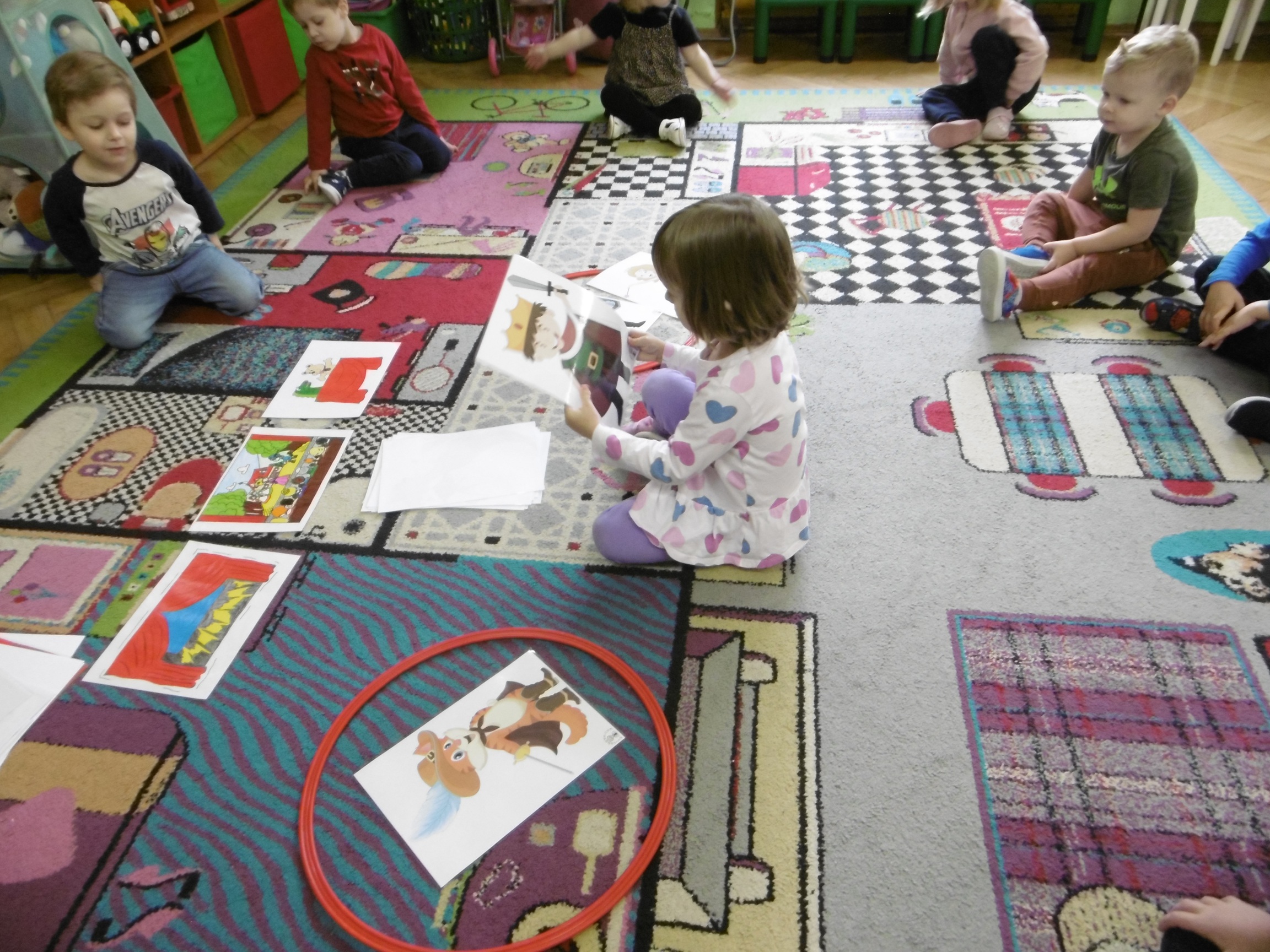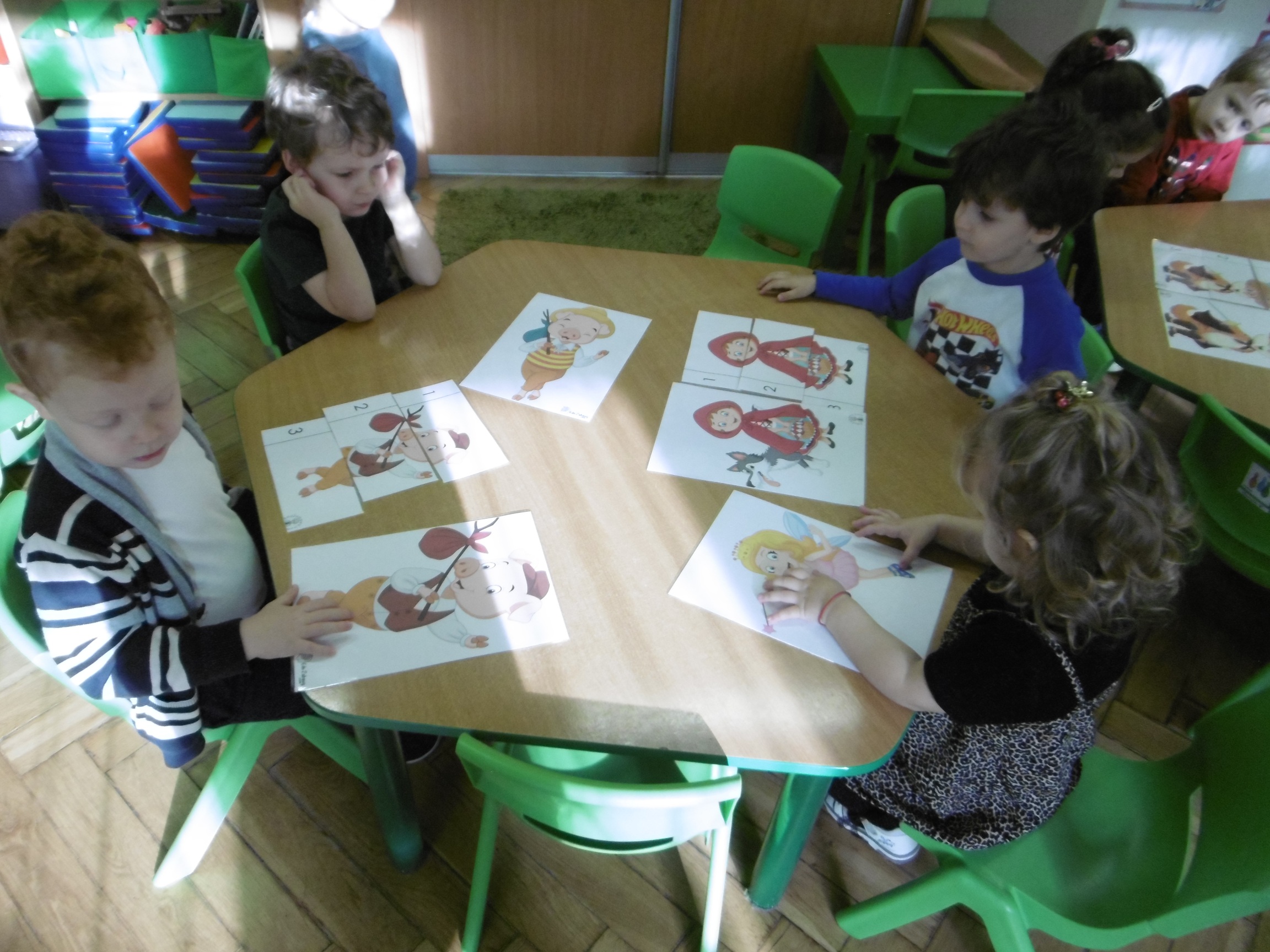 W trakcie obchodów Dnia Postaci z bajek, dzieci z grupy Tuptusie rozmawiały o tym, gdzie można się spotkać z bajkami dla dzieci (w książkach, w telewizji, w teatrze, czy w kinie). Przedszkolaki wymieniały także bohaterów ulubionych bajek dla dzieci i ich segregowały. Następnie składały z części obrazki przedstawiające bajkowych bohaterów oraz wyszukiwały ,,taką samą’’ postać przedstawioną na dużym obrazku. Tuptusie wykonały także opaski na głowę przedstawiające swoje ulubione postaci z bajek dla dzieci. Uczestniczyły też w zabawie przy niezwykle tanecznej muzyce. Przedszkolaki wysłuchały także bajki o ,,Czerwonym Kapturku’’, a następnie wykonały pracę, podczas której dopasowywały brakujące elementy do dużego obrazka.