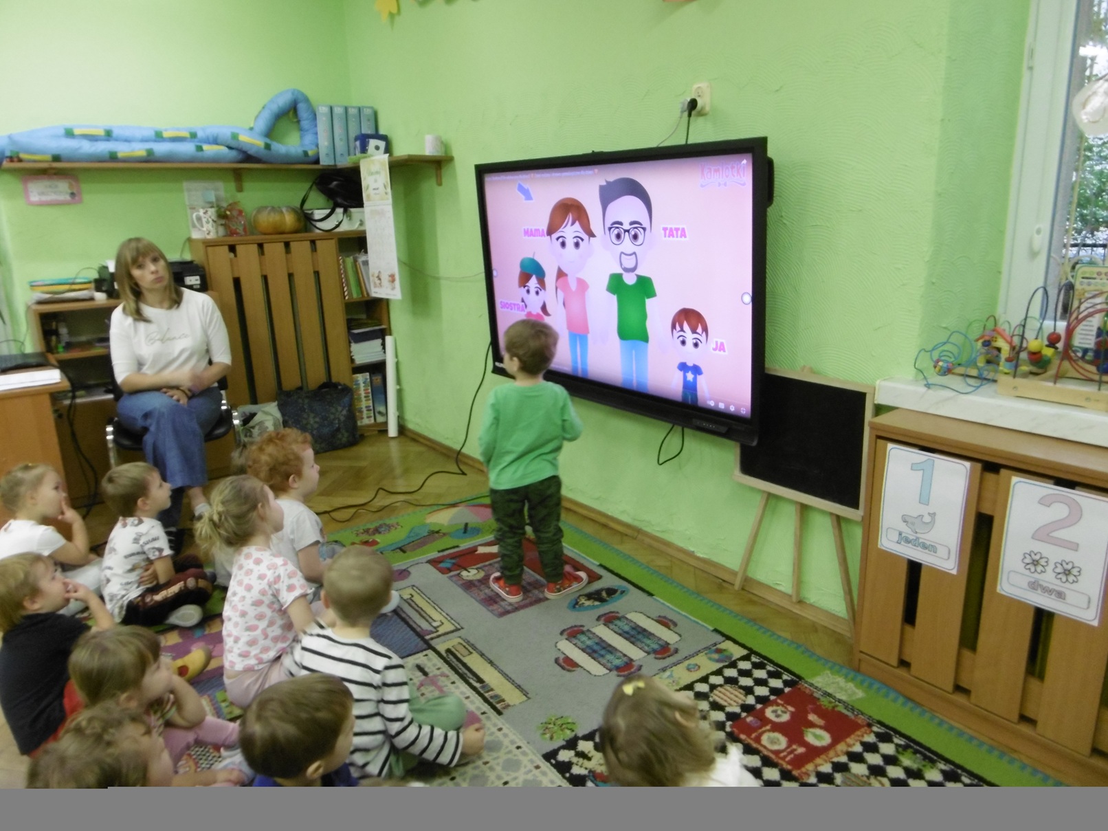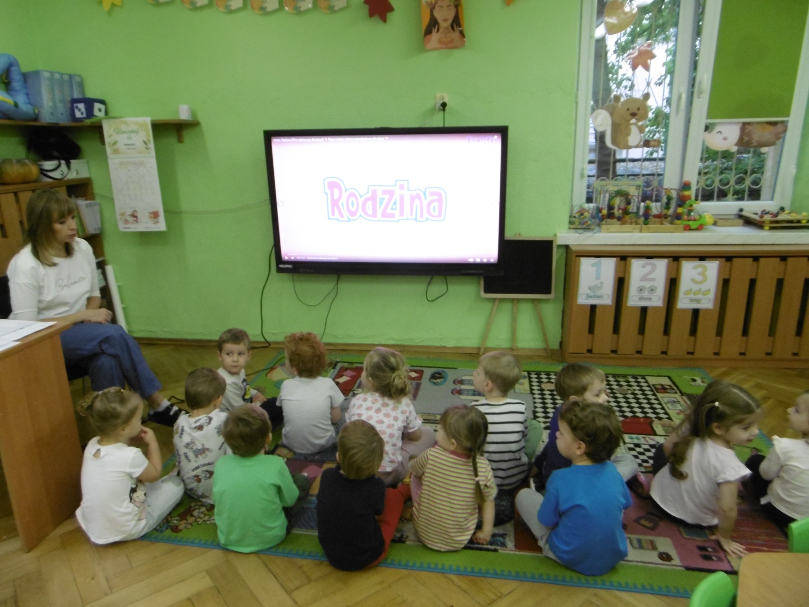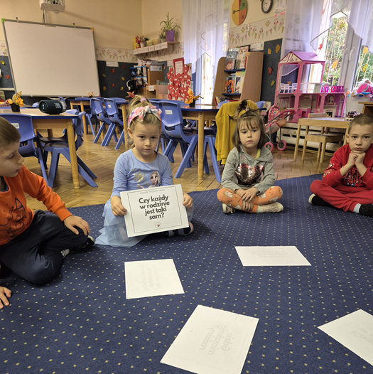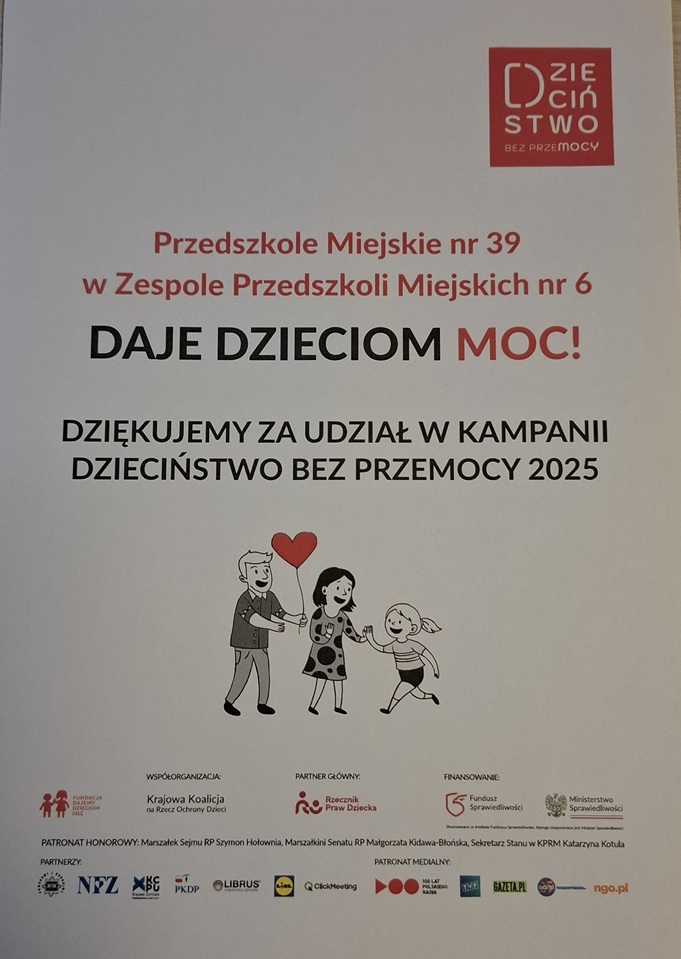W październiku i listopadzie realizowaliśmy tematykę związaną z kampanią Dzieciństwo Bez Przemocy. Tuptusie rozmawiały nt. rodziny: jak wygląda, kto ją tworzy? Oglądały film edukacyjny o drzewie genealogicznym, nazywały członków rodziny, tworzyły obraz rodziny z figur geometrycznych. Kończyły zdania: „Lubię, gdy mama/tata mówi do mnie…”, „Lubię z mamą/tatą…..(co robić?)”. Układały z małych serduszek wielkie serce. Smyki w przeciągu dwóch miesięcy rozmawiali o emocjach i rodzinie, a w dzień finału kampanii wykonały piękny plakat z serduszek i logo kampanii. Juniorzy losowali kartki z pytaniami o rodzinę, na które wspólnie starali się znaleźć odpowiedzi. Wywiązała się dyskusja, w której każdy starszak chciał zabrać głos na temat swojej rodziny. Dzieci wysłuchały również słuchowiska pt. „Jeż” Katarzyny Kotowskiej, rozmawialiśmy o emocjach towarzyszących jego bohaterom. Wspólnie zastanawialiśmy się, co pomogło chłopcu zrzucić kolce. Padały następujące odpowiedzi: głaskanie, słowa skierowane do synka „bardzo Cię kocham”, przytulanie, rozmowy, opieka rodziców, wspólne zabawy z rodzicami. Pomysły i wypowiedzi starszaków zostały spisane na szablonie jeża.