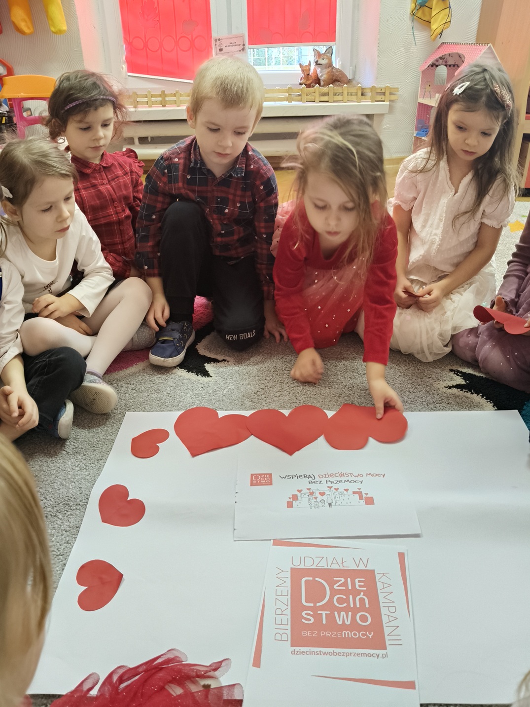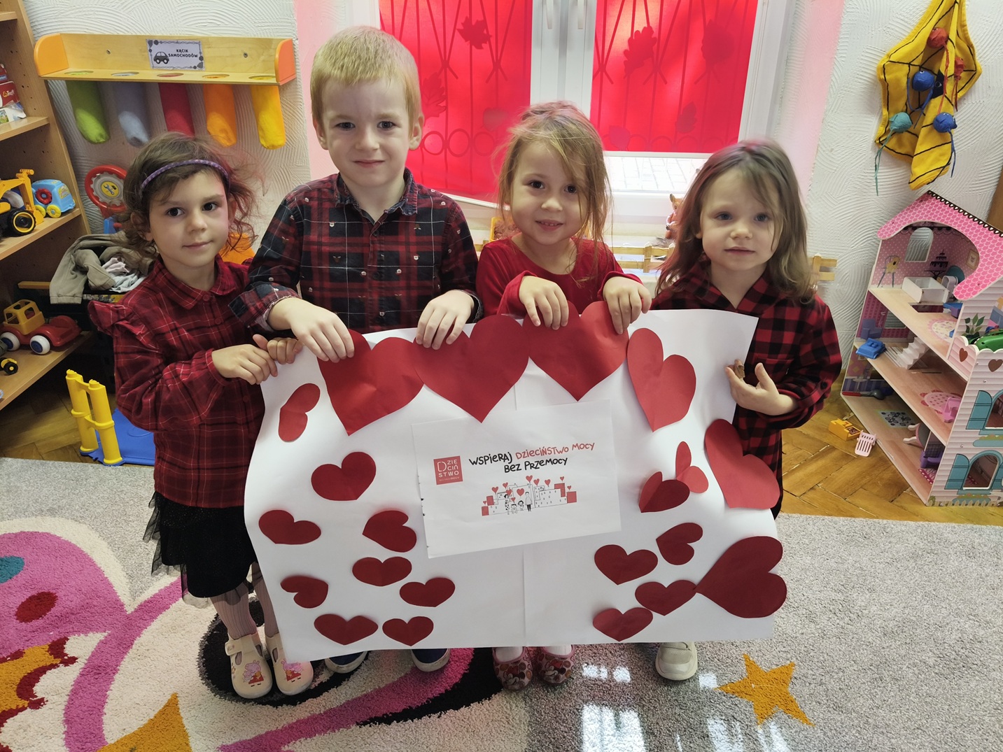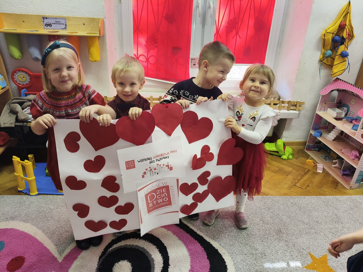 Na ten szczególny dzień udekorowaliśmy wejście do przedszkola czerwonymi girlandami, serduszkami i logo kampanii. O godz. 17.00 podświetliliśmy na czerwono drzwi wejściowe do przedszkola włączając się do udziału w finale kampanii. Był to wyjątkowy moment jedności, w którym wspólnie stanęliśmy po stronie najmłodszych.