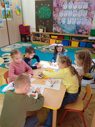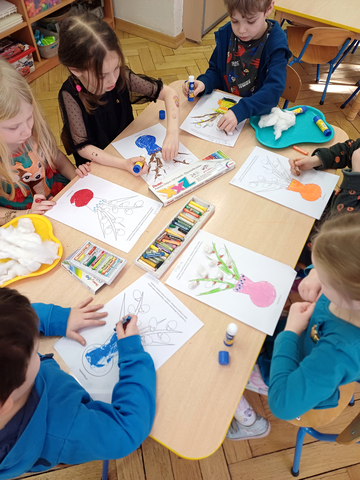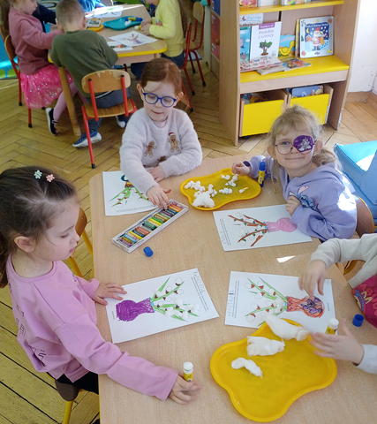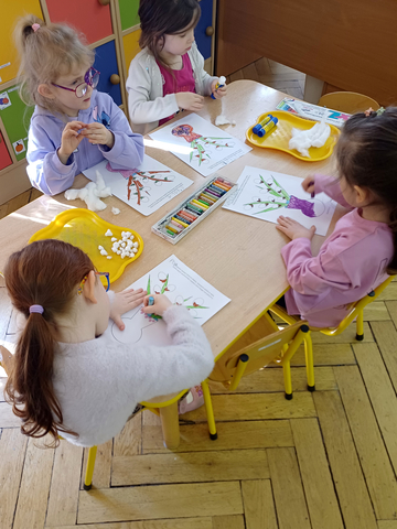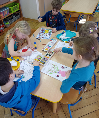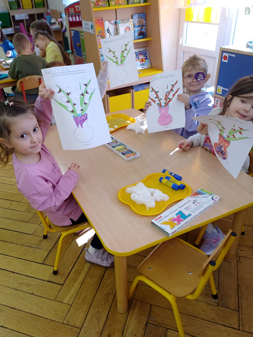 Dzieci z grupy Żaczki wzięły udział w zajęciach plastyczno-muzycznych inspirowanych nadchodzącą wiosną. Podczas spotkania przedszkolaki kolorowały pastelami obrazki przedstawiające wiosenne bazie. W trakcie pracy towarzyszyła im muzyka klasyczna – utwór „Wiosna” z cyklu Cztery pory roku autorstwa Antonio Vivaldi.