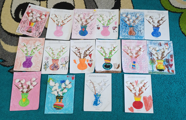 Delikatne dźwięki muzyki pomogły dzieciom poczuć wiosenny nastrój i pobudziły ich wyobraźnię. Powstały piękne, kolorowe prace przedstawiające bazie – jeden z pierwszych znaków nadchodzącej wiosny. Zajęcia były doskonałą okazją do połączenia sztuki plastycznej z muzyką oraz rozwijania wrażliwości artystycznej naszych przedszkolaków.
