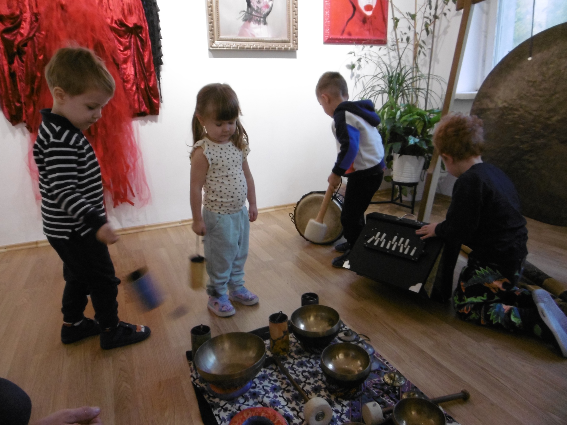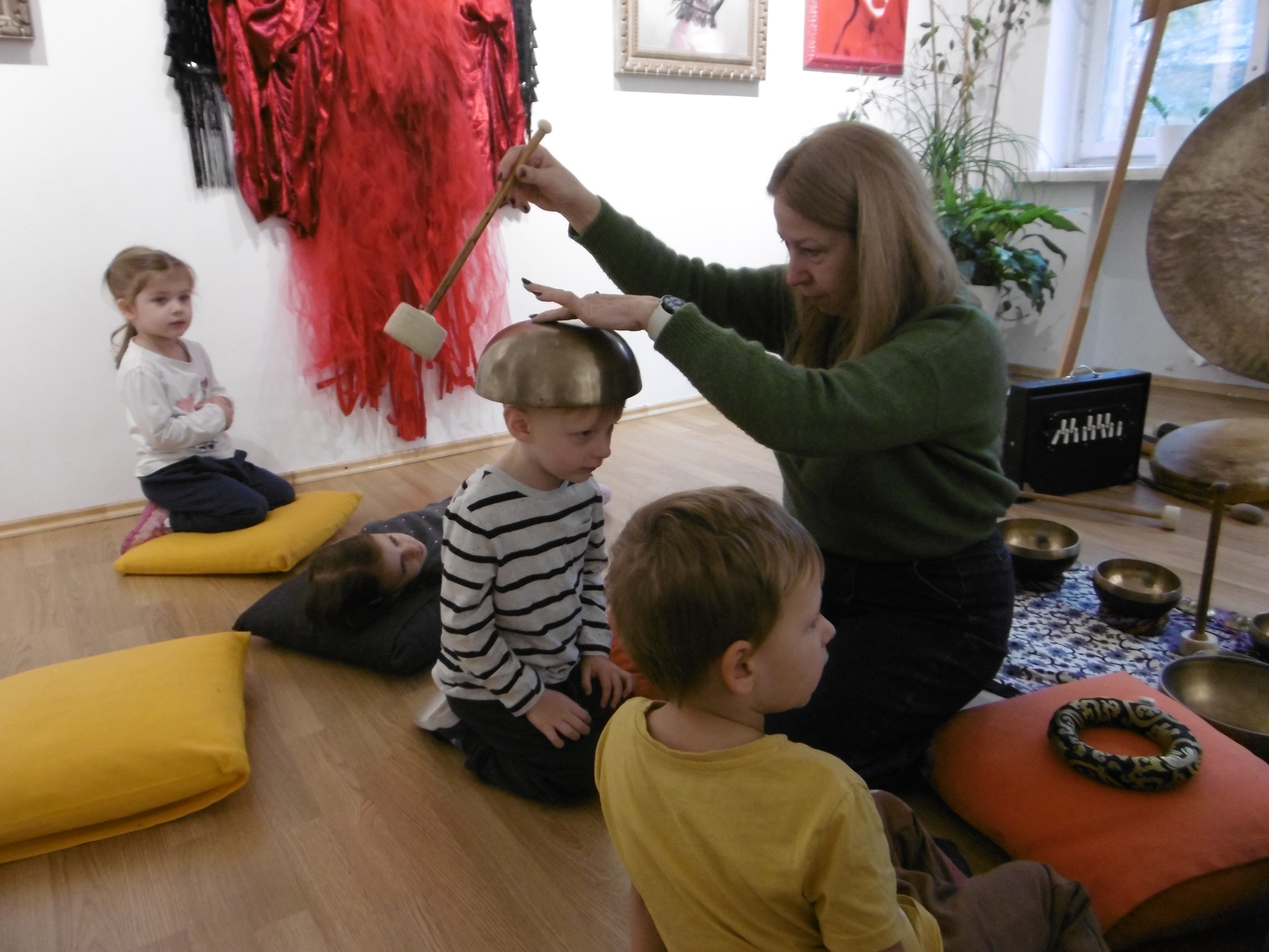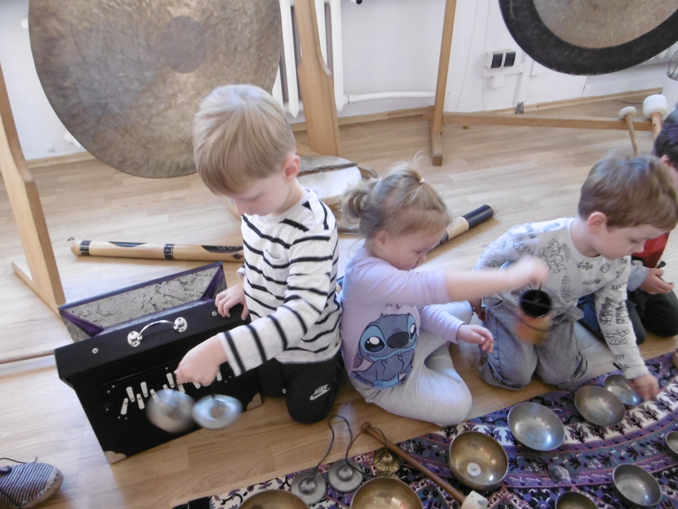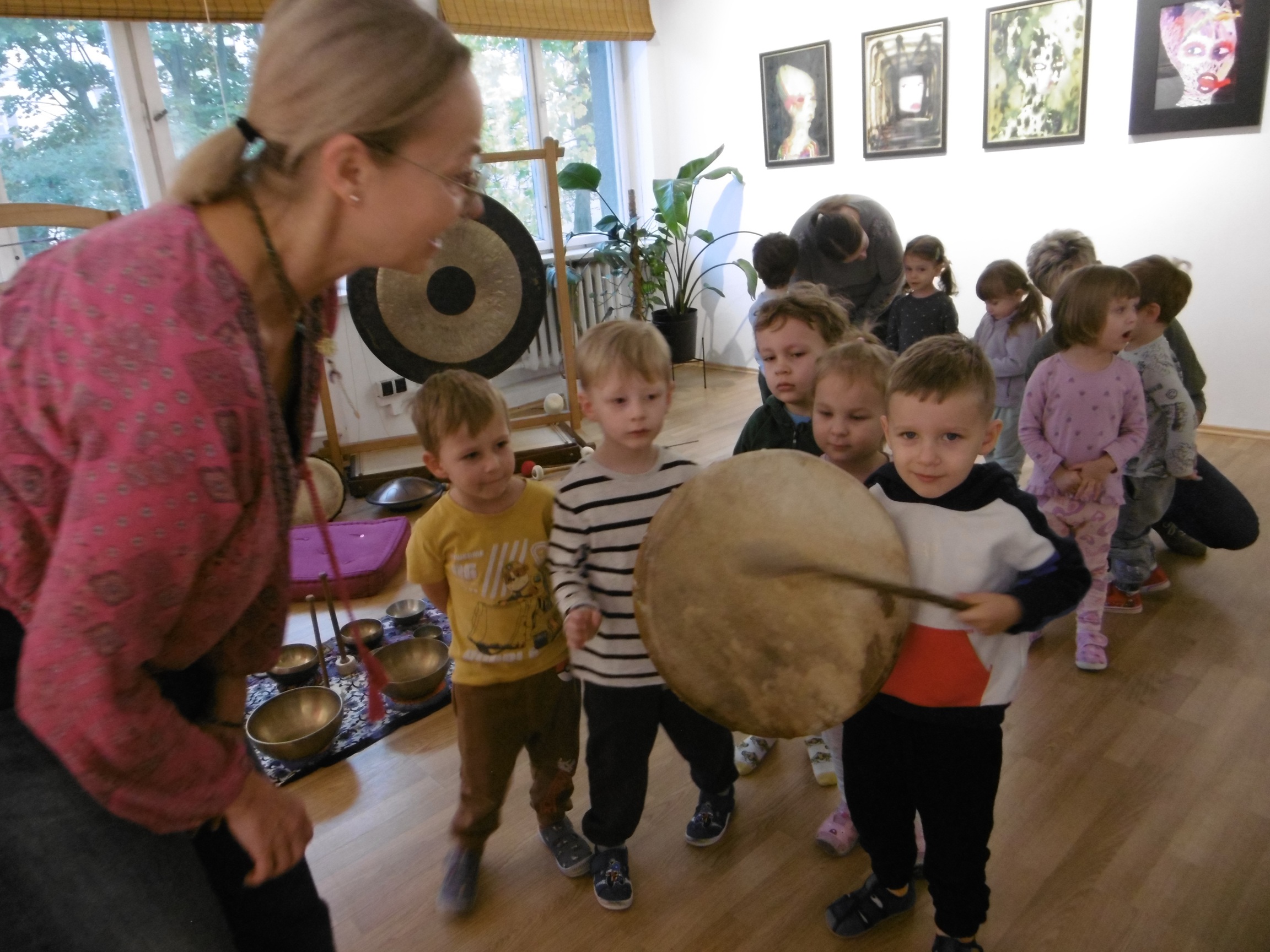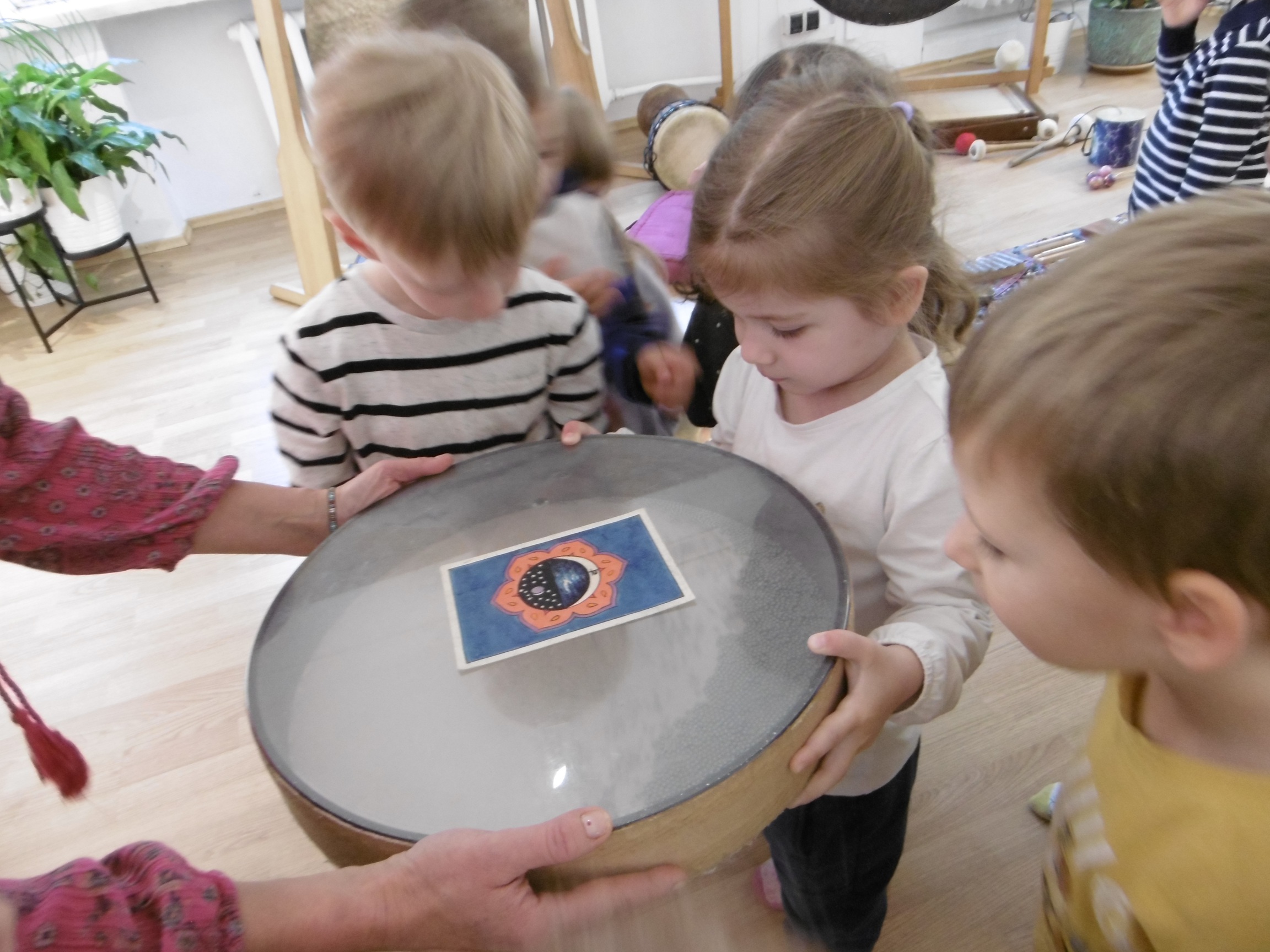W ostatnich dniach grupa Tuptusiów wybrała się do pobliskiego Stowarzyszenia Kamienica 56. W tym ciekawym miejscu zostało dla naszych przedszkolaków zorganizowane nietypowe spotkanie muzyczne, podczas którego wykorzystano misy dźwiękowe, gongi i dzwonki.