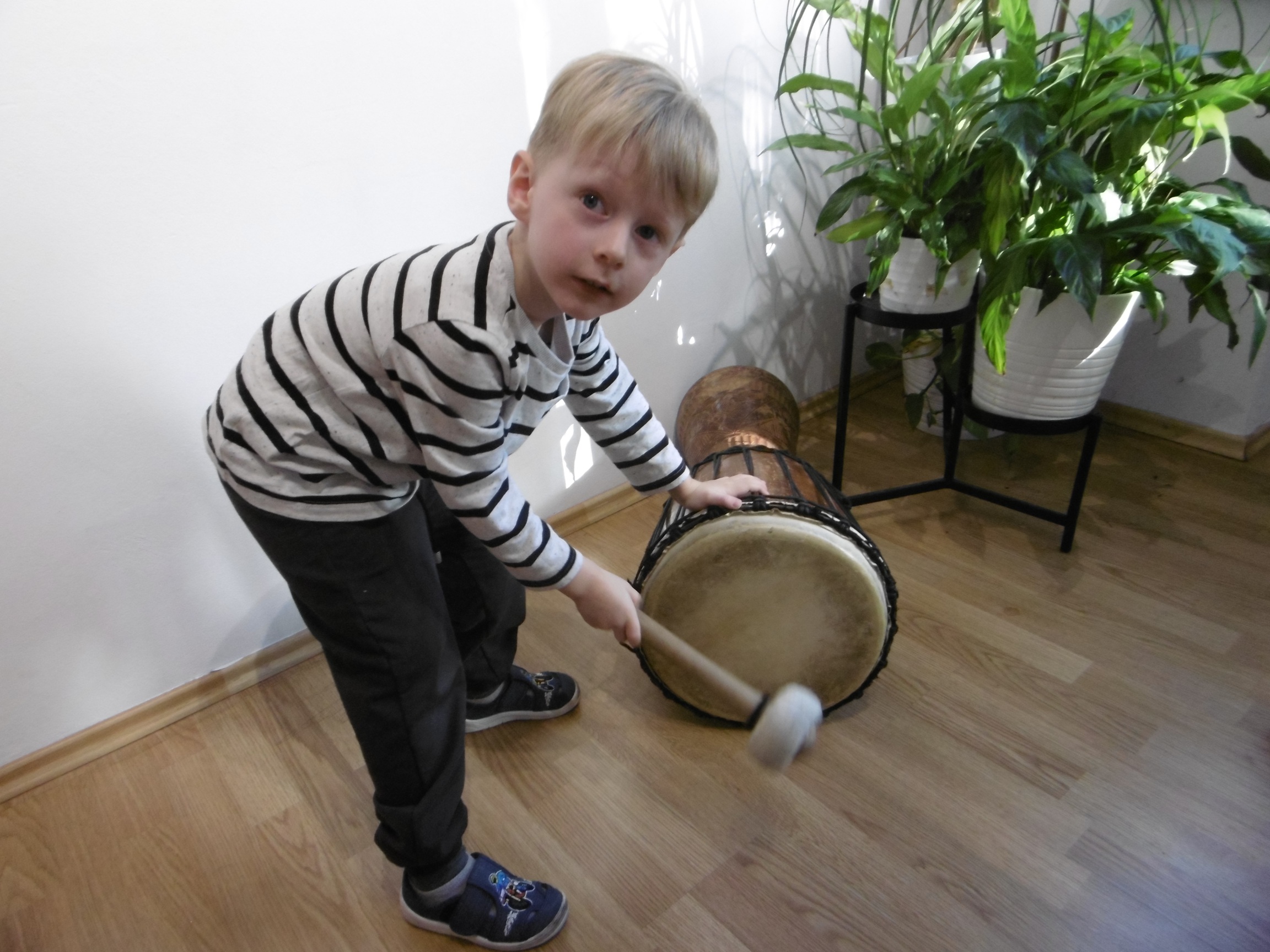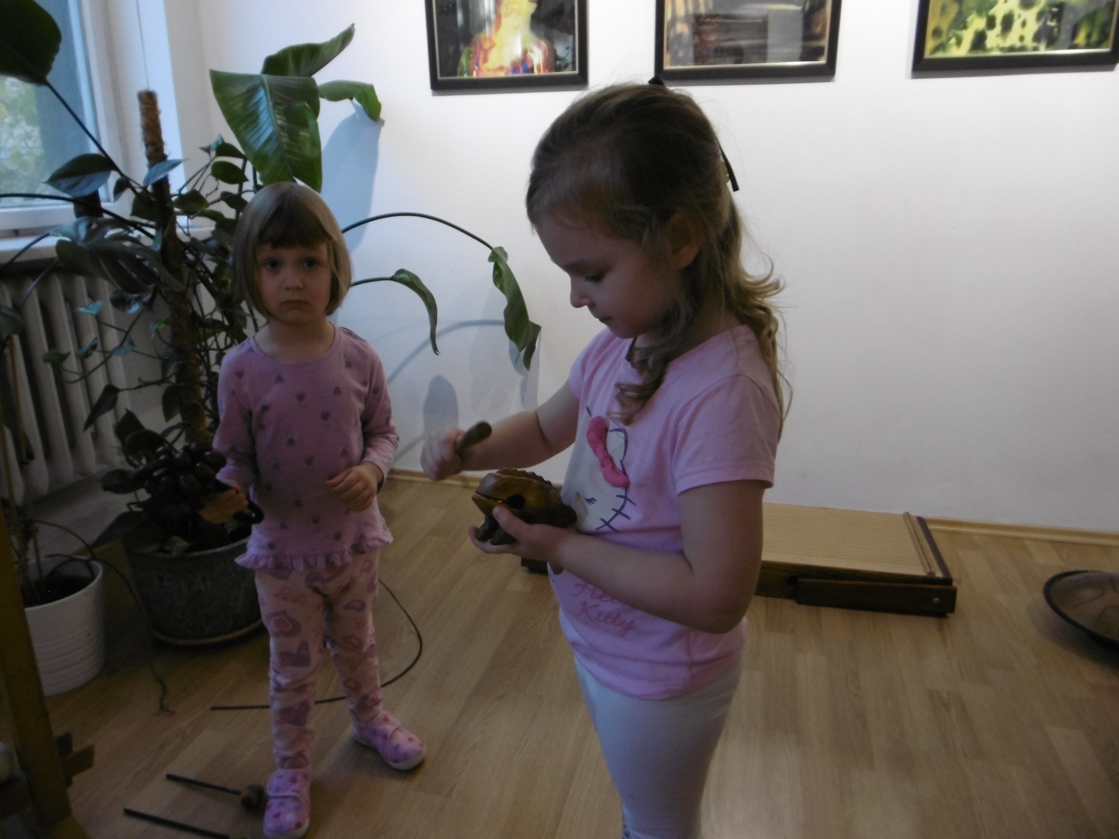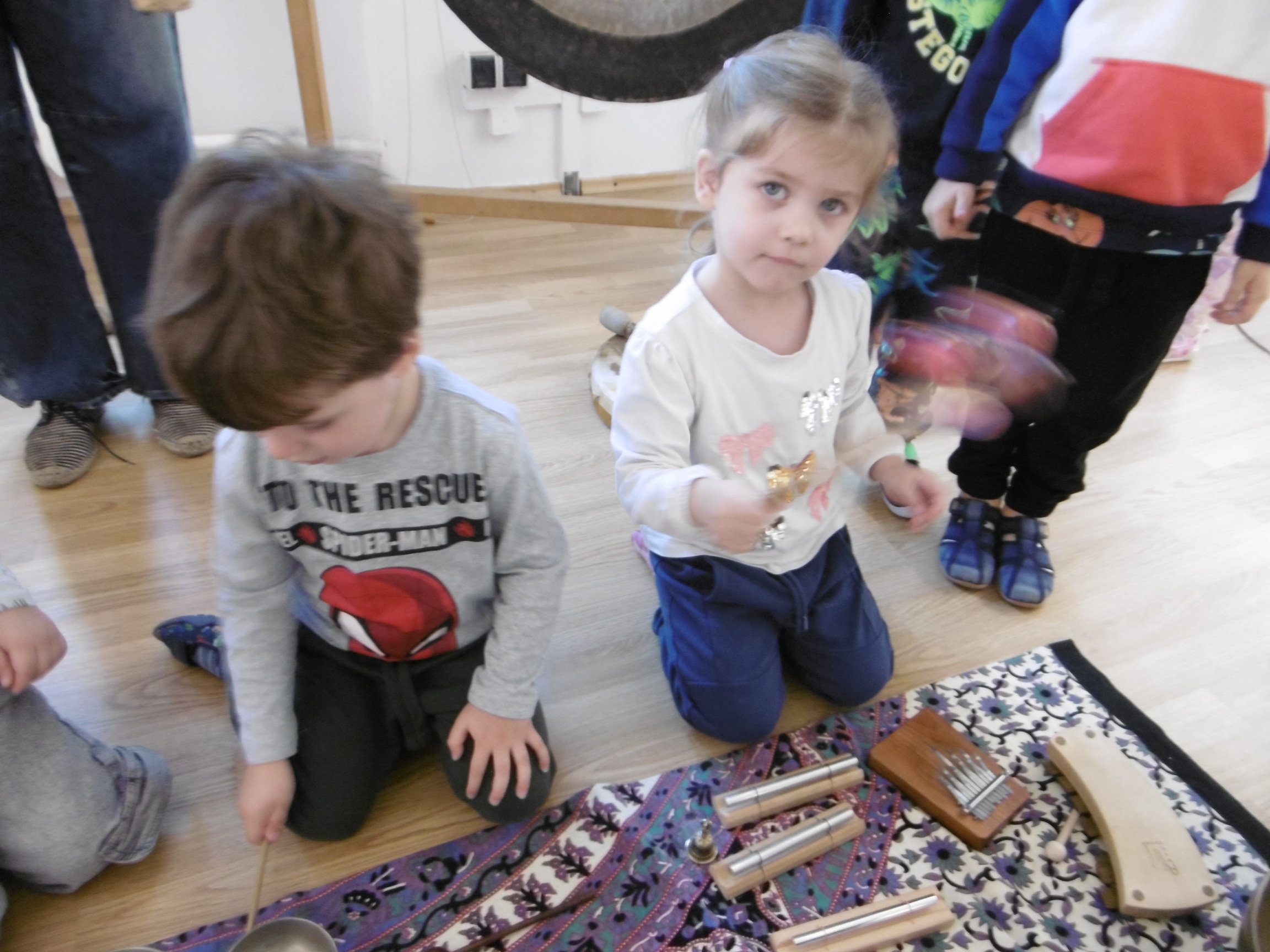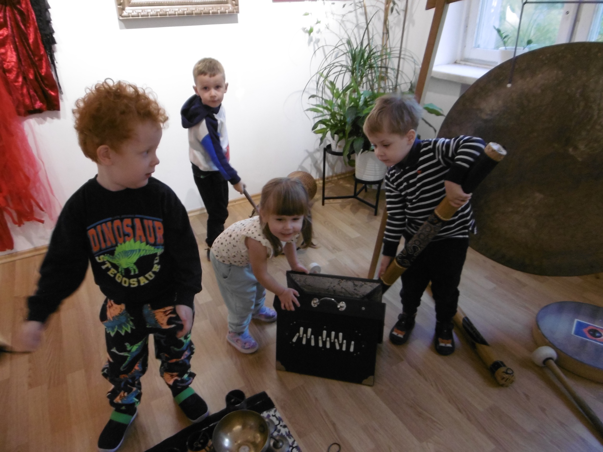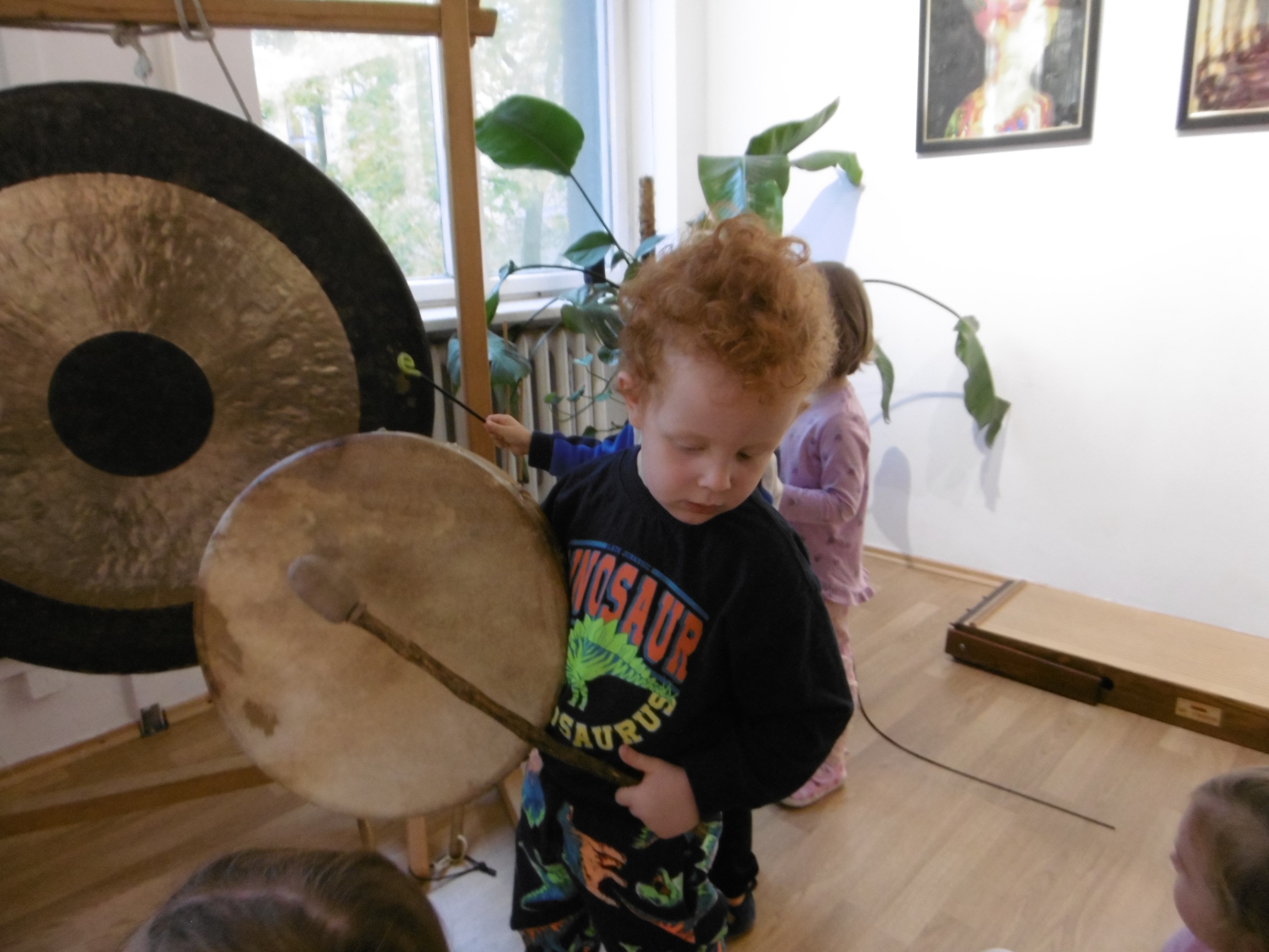 Na początku dzieci zostały zapoznane z różnymi instrumentami pochodzącymi z odległych krajów. Ogromne wrażenie zrobiły na dzieciach gongi, z których jeden ważył aż 60 kg oraz kij deszczowy, czy bęben burzowy, jak również cała gama różnego rozmiaru mis. Efekt dźwiękowy zaprezentowany przez te instrumenty wprawił wielu z nas w zachwyt i pozwolił przenieść się w wyobraźni na próbę muzyczną do teatru.