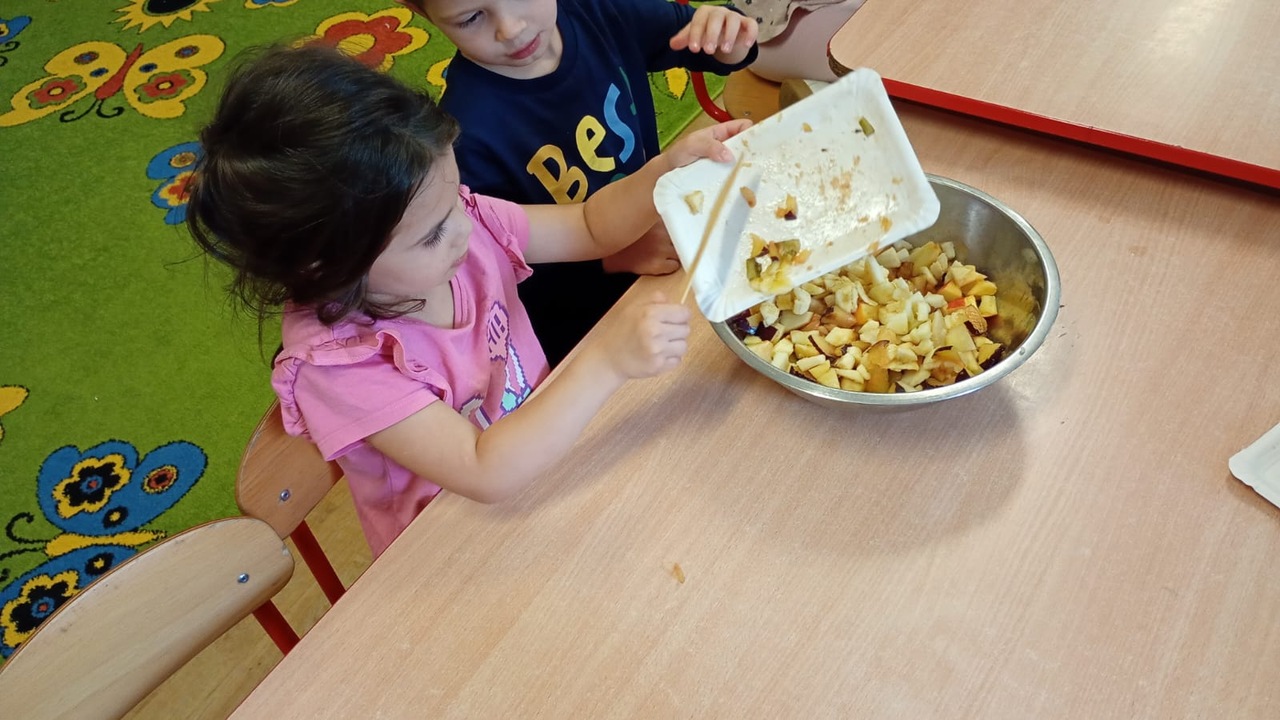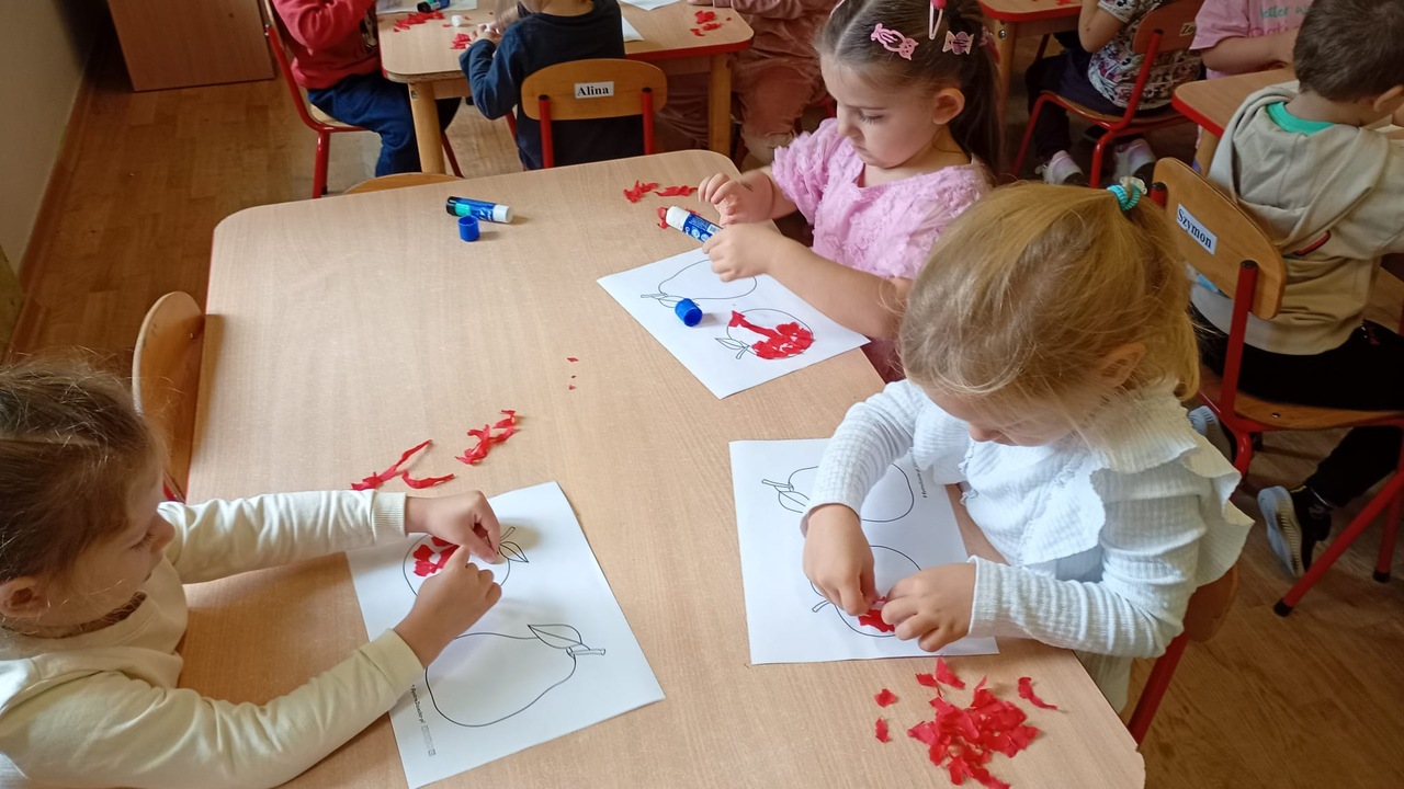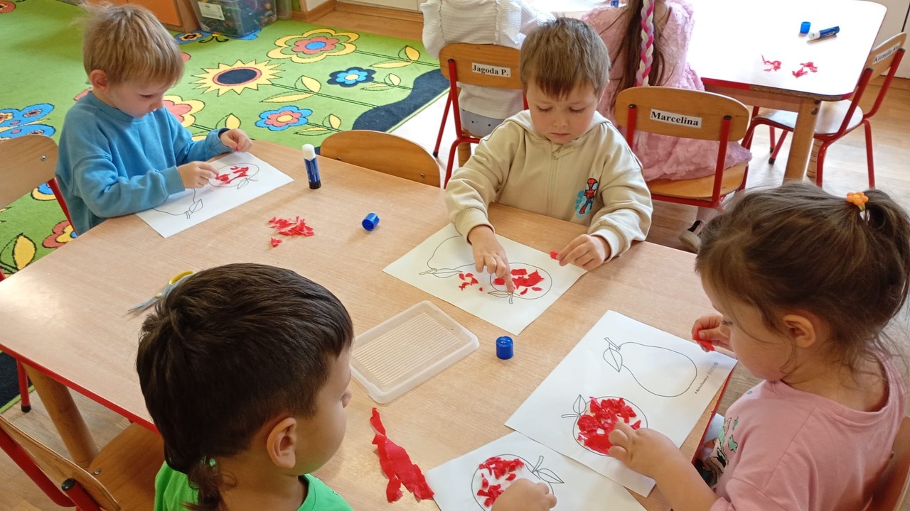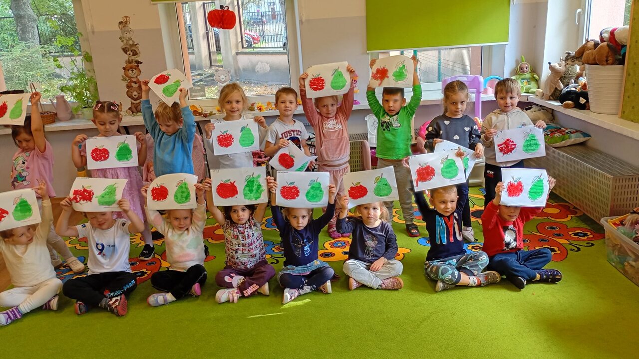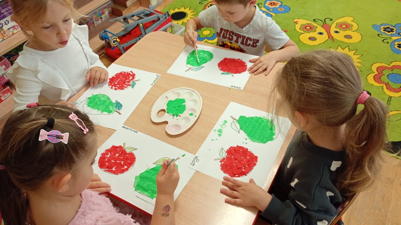 Smyki natomiast zapoznały się z budową jabłka i gruszki. Wykonały pracę plastyczną na ten temat- jabłko wykleiły kawałkami bibuły, a gruszkę pomalowały zieloną farbą. W kolejnym dniu wykonały pyszną i zdrową sałatkę owocową, którą ze smakiem zjadły. Dzięki zajęciom dzieci dowiedziały się gdzie rosną drzewa owocowe- w sadzie oraz jak wartościowe i ważne dla zdrowia są owoce.