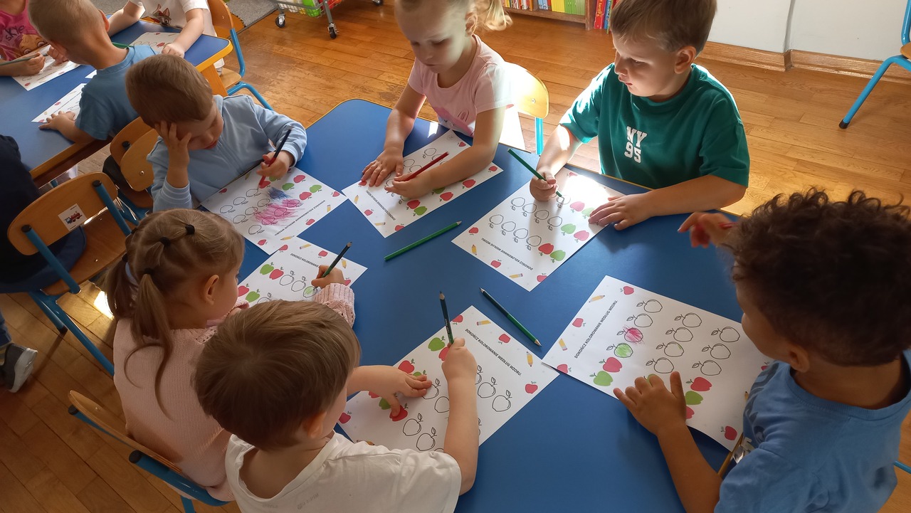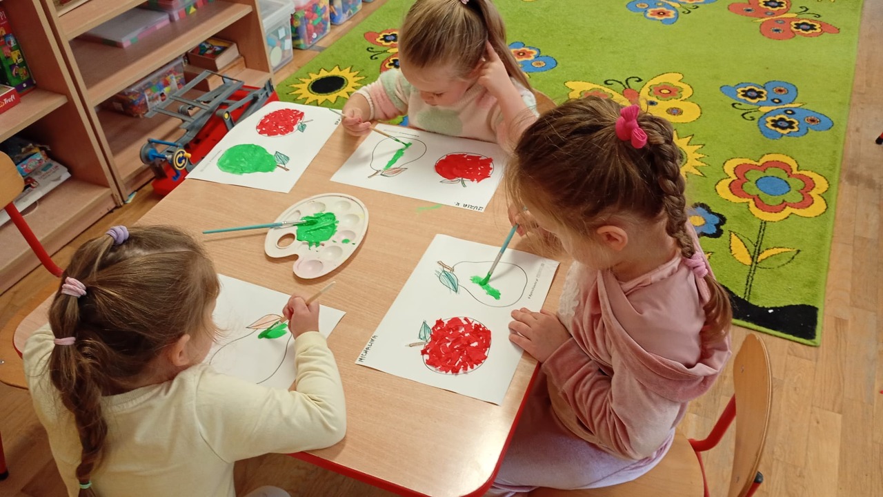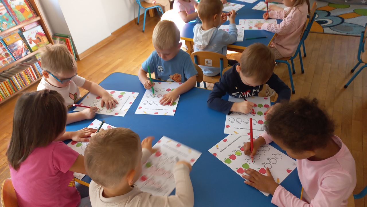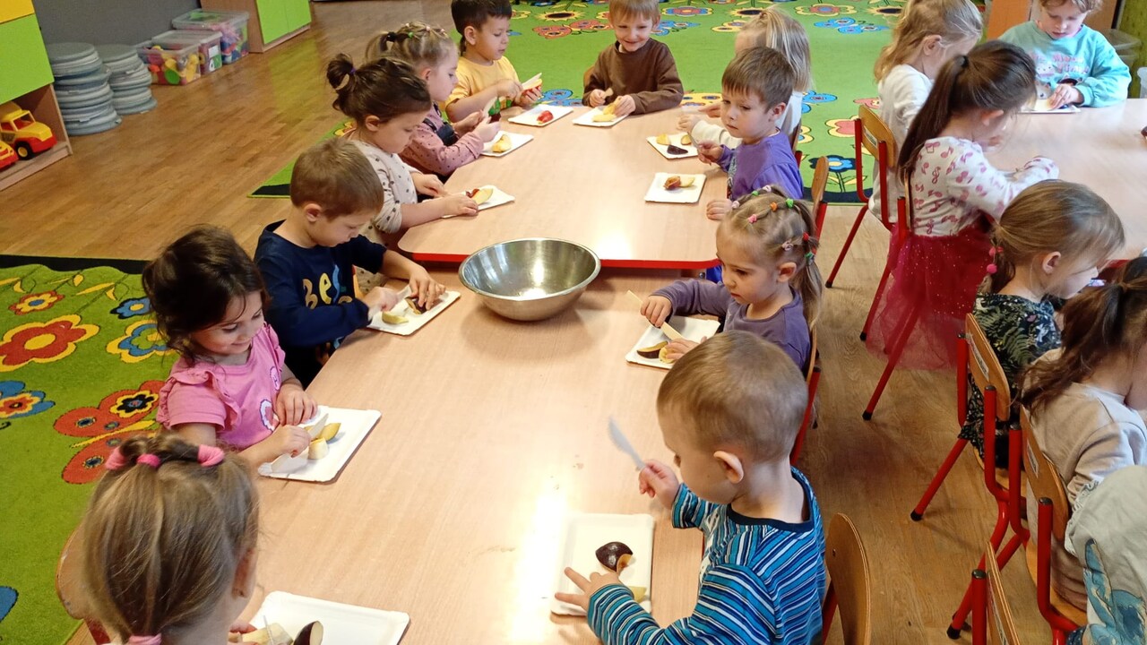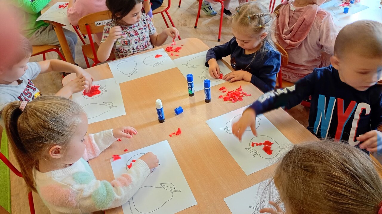 Smyki natomiast zapoznały się z budową jabłka i gruszki. Wykonały pracę plastyczną na ten temat- jabłko wykleiły kawałkami bibuły, a gruszkę pomalowały zieloną farbą. W kolejnym dniu wykonały pyszną i zdrową sałatkę owocową, którą ze smakiem zjadły. Dzięki zajęciom dzieci dowiedziały się gdzie rosną drzewa owocowe- w sadzie oraz jak wartościowe i ważne dla zdrowia są owoce.