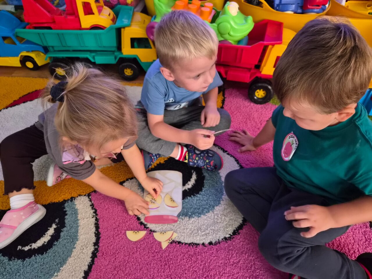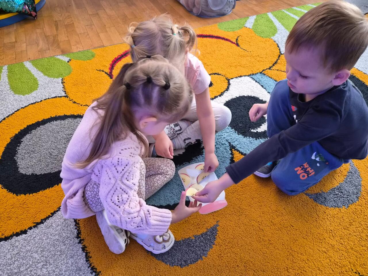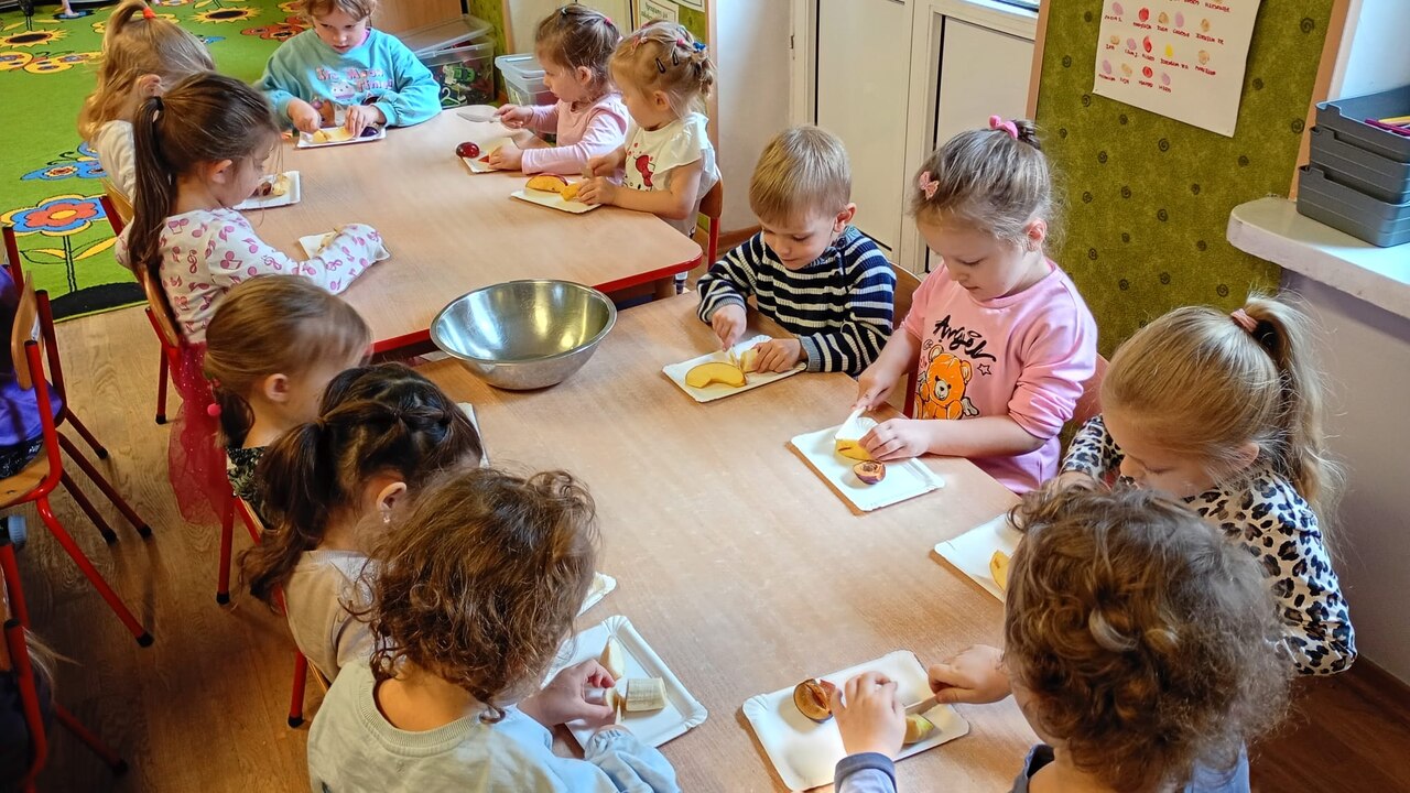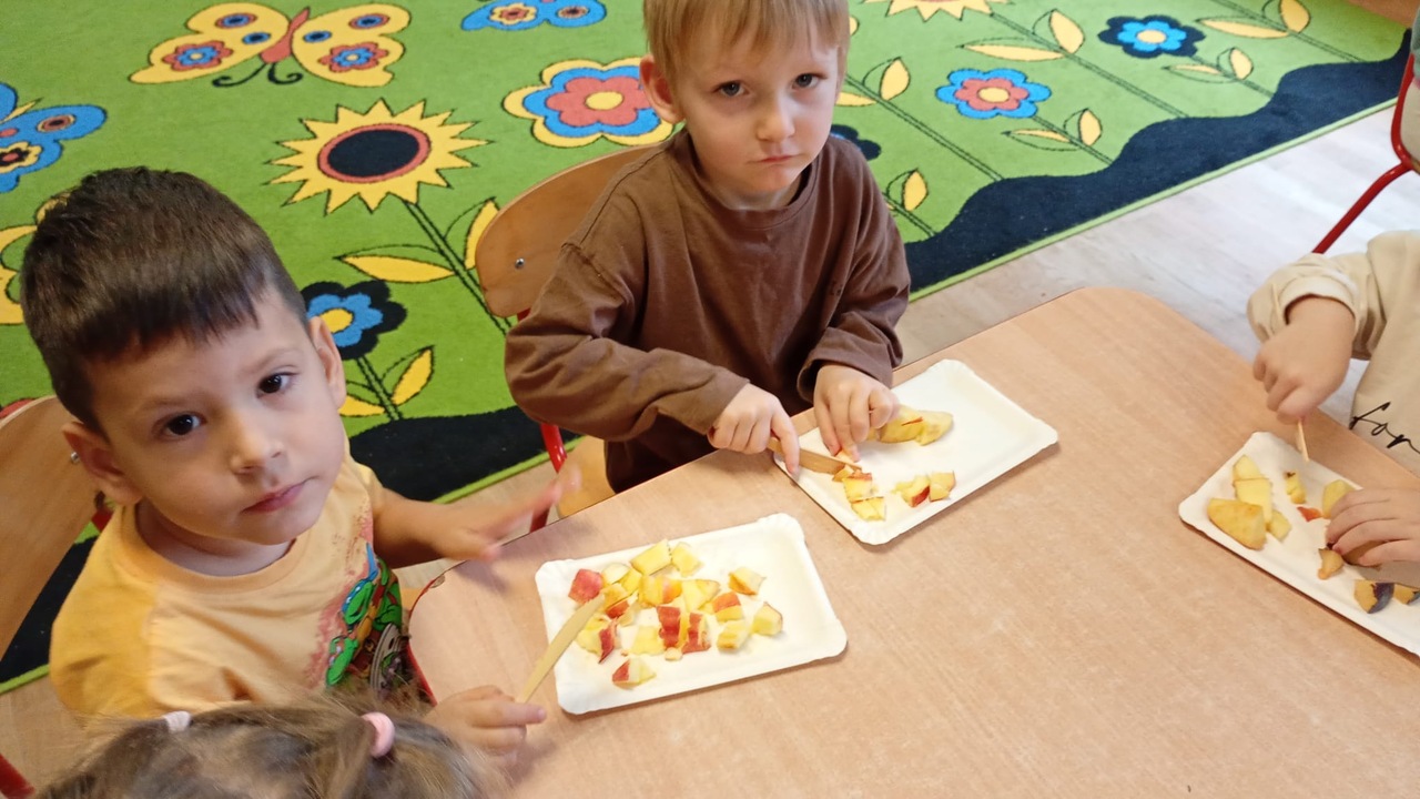 Smyki natomiast zapoznały się z budową jabłka i gruszki. Wykonały pracę plastyczną na ten temat- jabłko wykleiły kawałkami bibuły, a gruszkę pomalowały zieloną farbą. W kolejnym dniu wykonały pyszną i zdrową sałatkę owocową, którą ze smakiem zjadły. Dzięki zajęciom dzieci dowiedziały się gdzie rosną drzewa owocowe- w sadzie oraz jak wartościowe i ważne dla zdrowia są owoce.