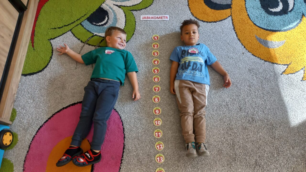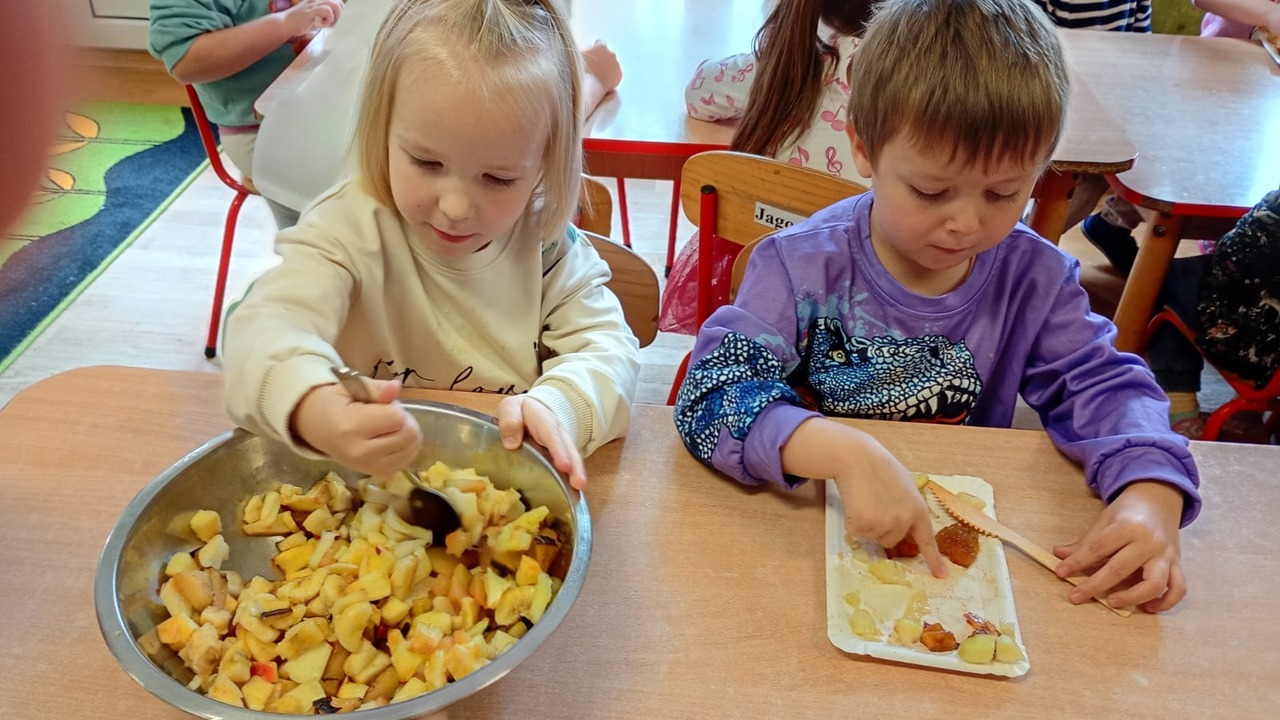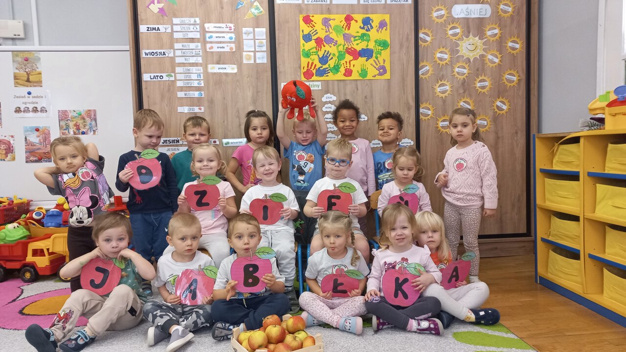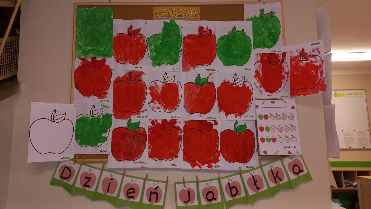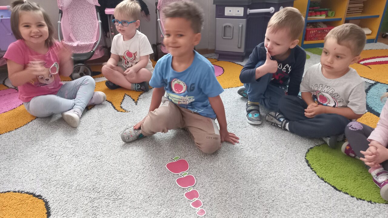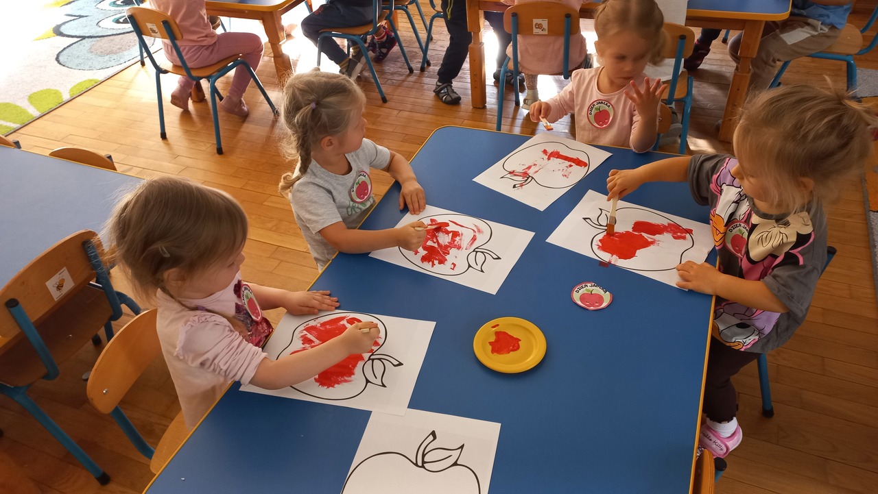 Nasze kochane maluszki chętnie i z zaciekawieniem biorą udział we wszystkich aktywnościach proponowanych w Przedszkolu. Tym razem wzięły udział w obchodach Dnia Jabłka, które odbyły się w minionym tygodniu. Tuptusie w małych grupach, wspólnymi siłami, ułożyły jabłuszkowe rytmy oraz przygotowały jabłuszkowy kompot. Po obejrzeniu filmu edukacyjnego związanego z jabłkami i ich przetwórstwem, zajęły się porządkowaniem tych owoców- od najmniejszego do największego oraz mierzeniem wzrostu za pomocą „jabłkometru”. Maluszkom bardzo podobały się zabawy ruchowe, poznały piosenkę „Małe, czerwone jabłuszko”, do której pięknie tańczyły! Po serii zabaw, zmęczone i spragnione, udały się na degustację jabłuszkowego soczku. Na koniec zajęć Tuptusie wykonały prace plastyczne- pokolorowały jabłuszkowe rytmy oraz dokładnie pomalowały farbami jabłuszkowy kontur. „Dzień jabłka” wzbudził wśród naszych przedszkolaków wiele zdrowych, pozytywnych emocji!!!