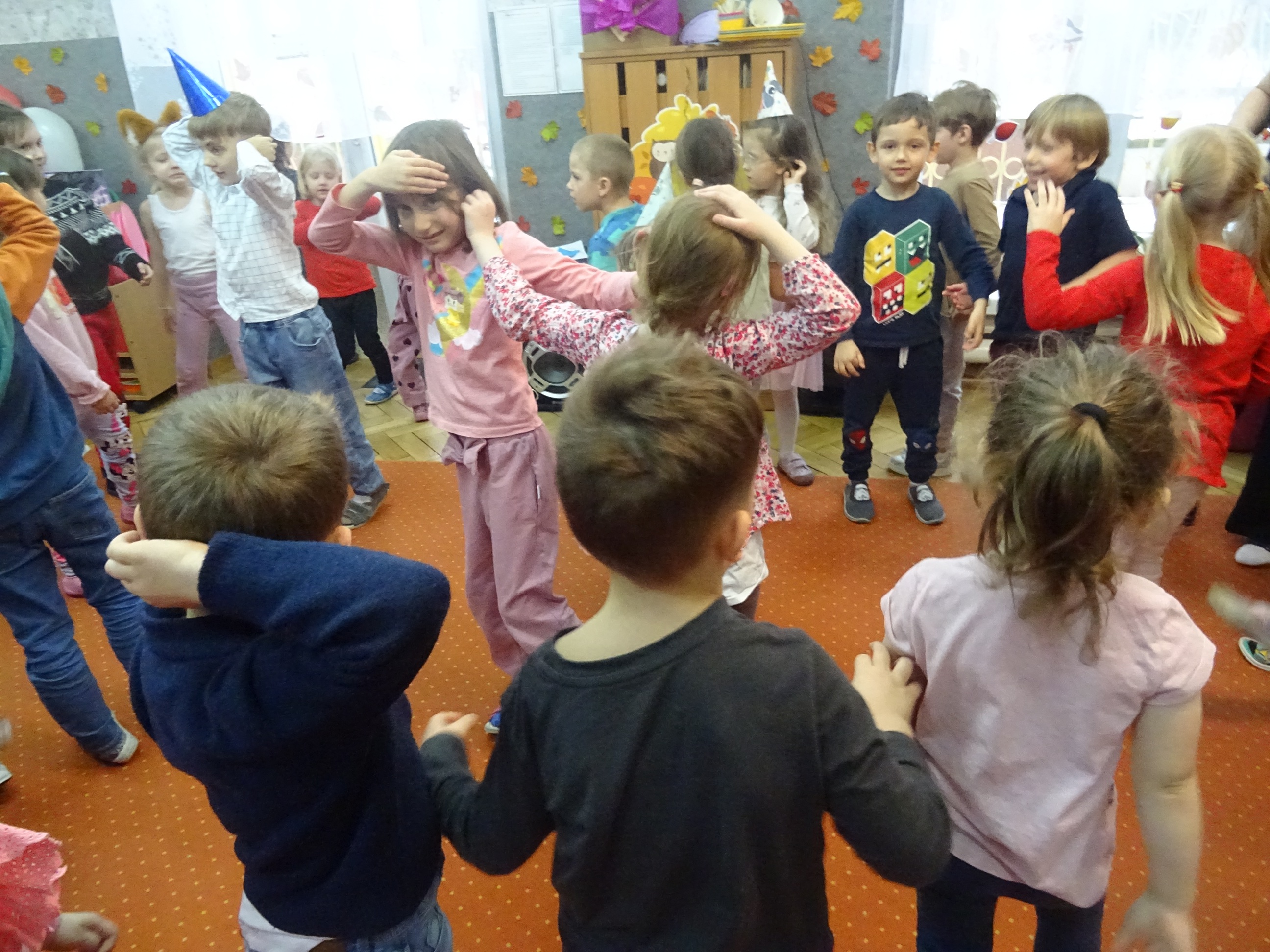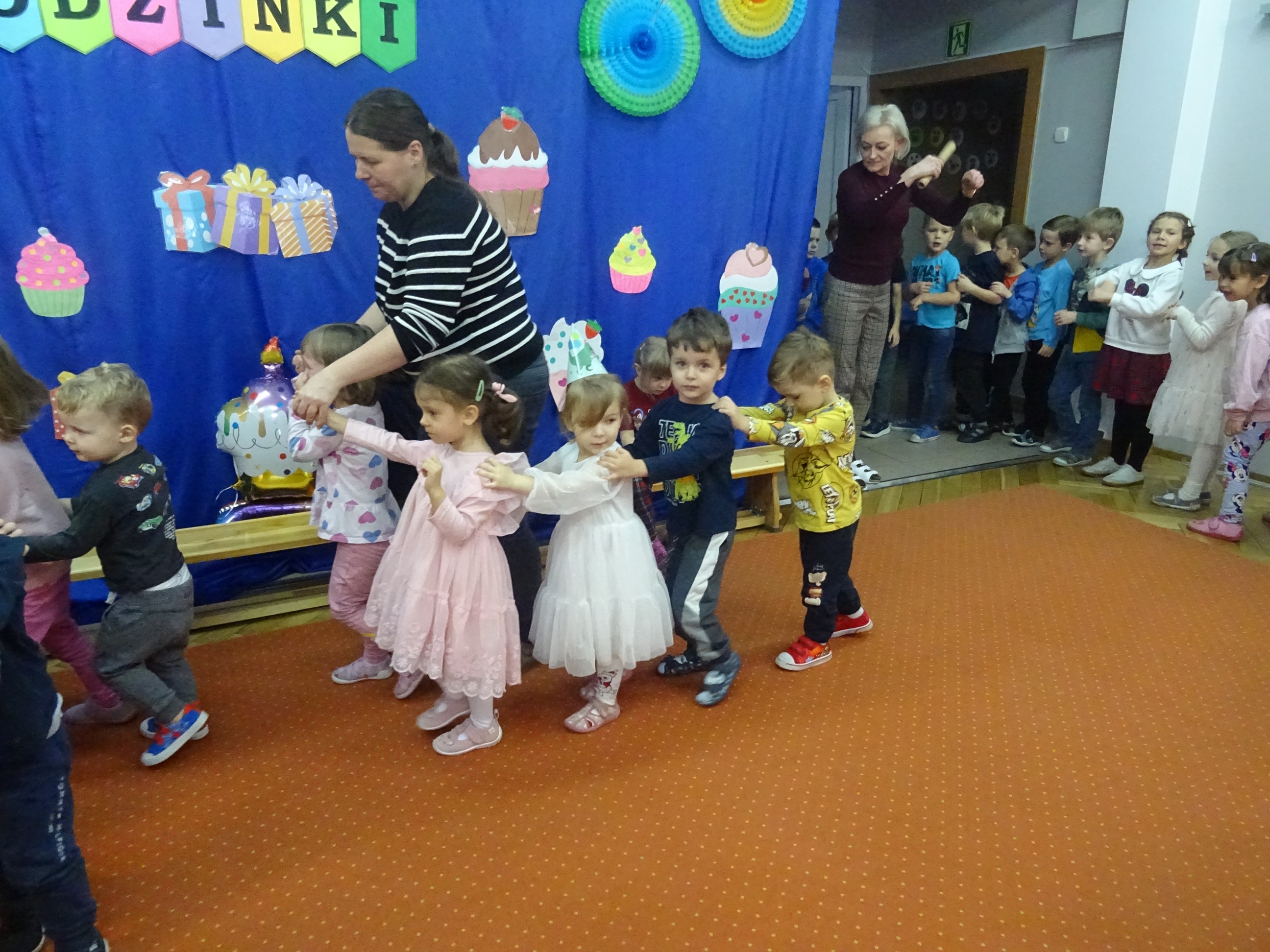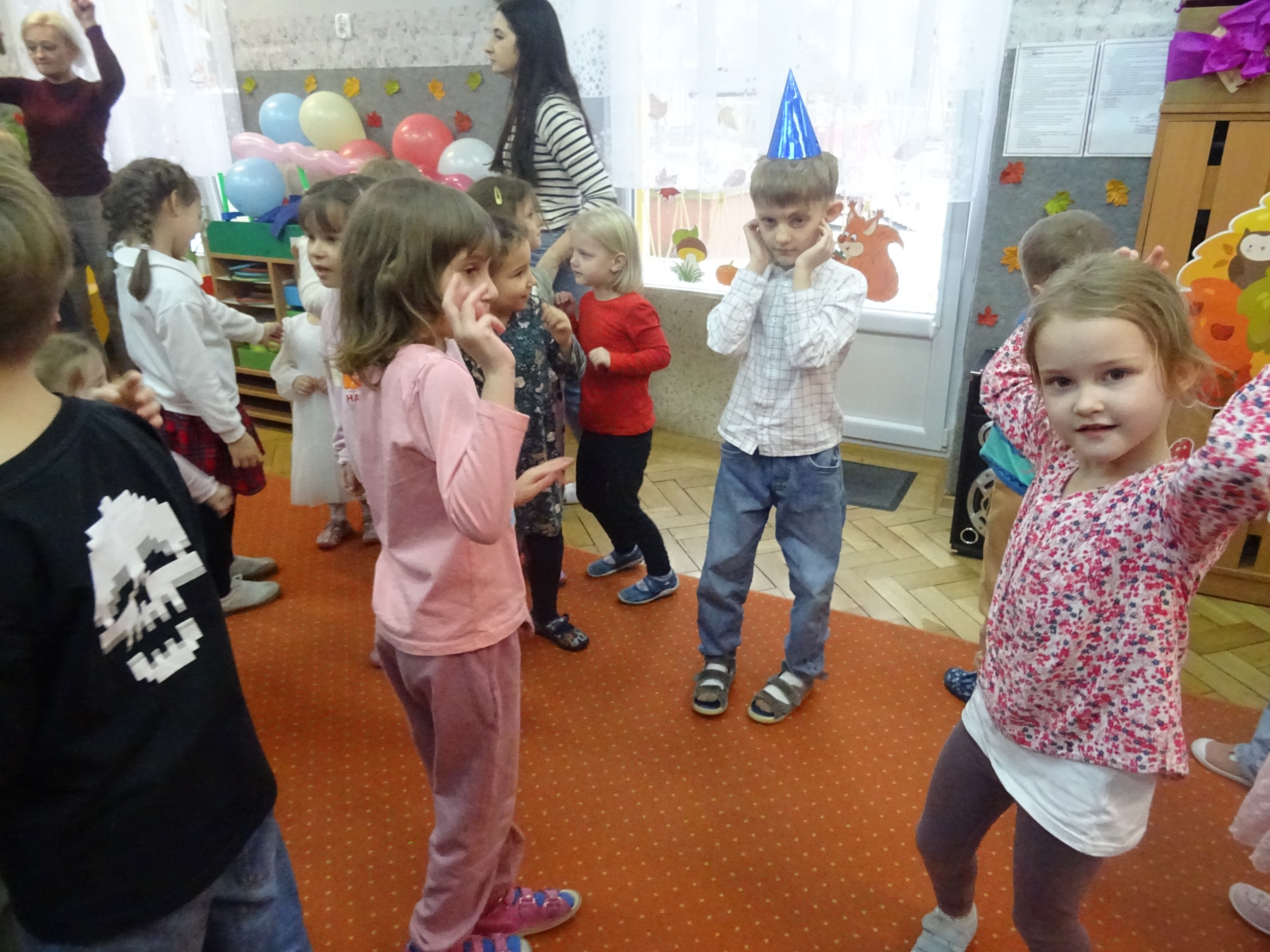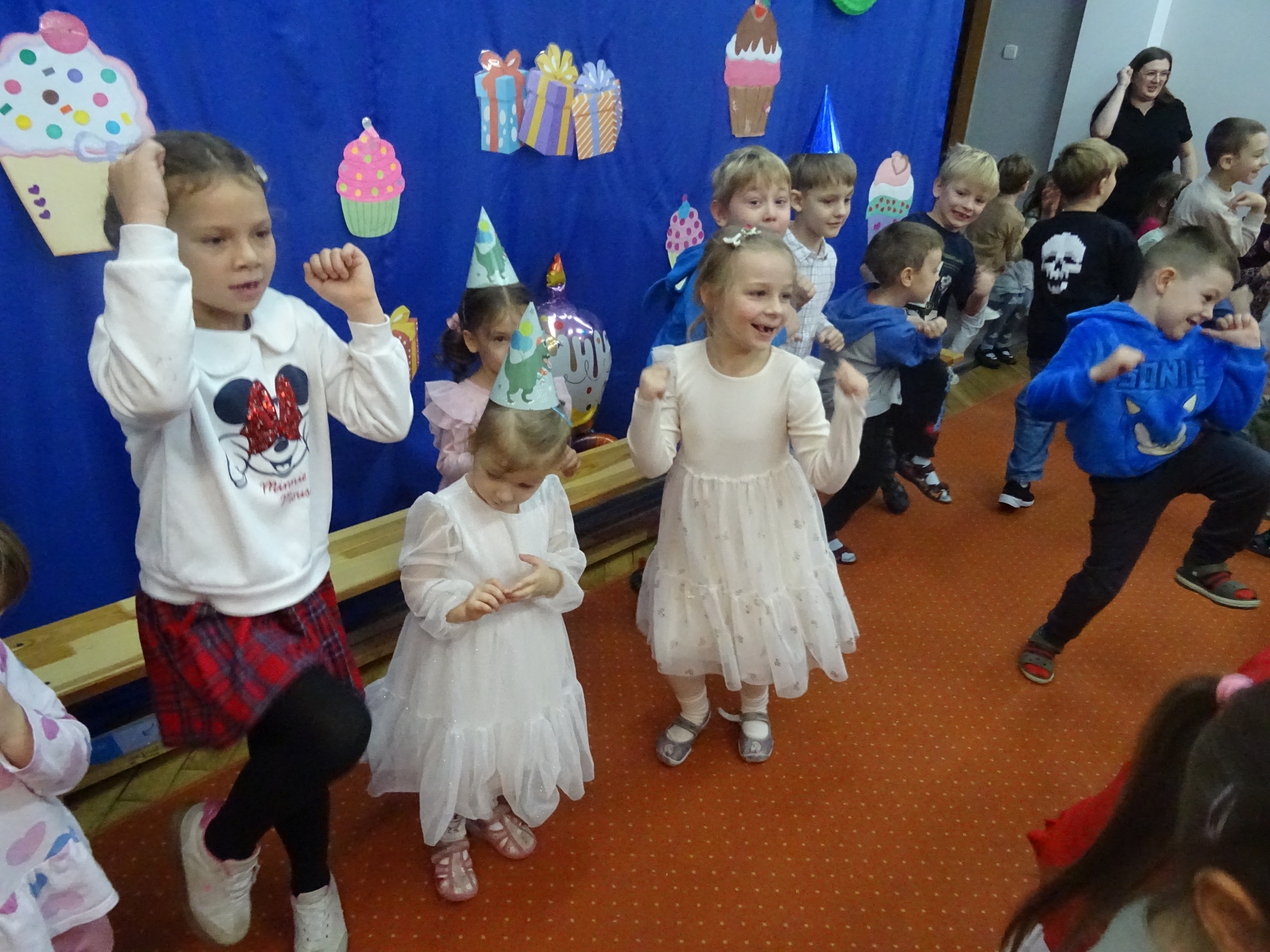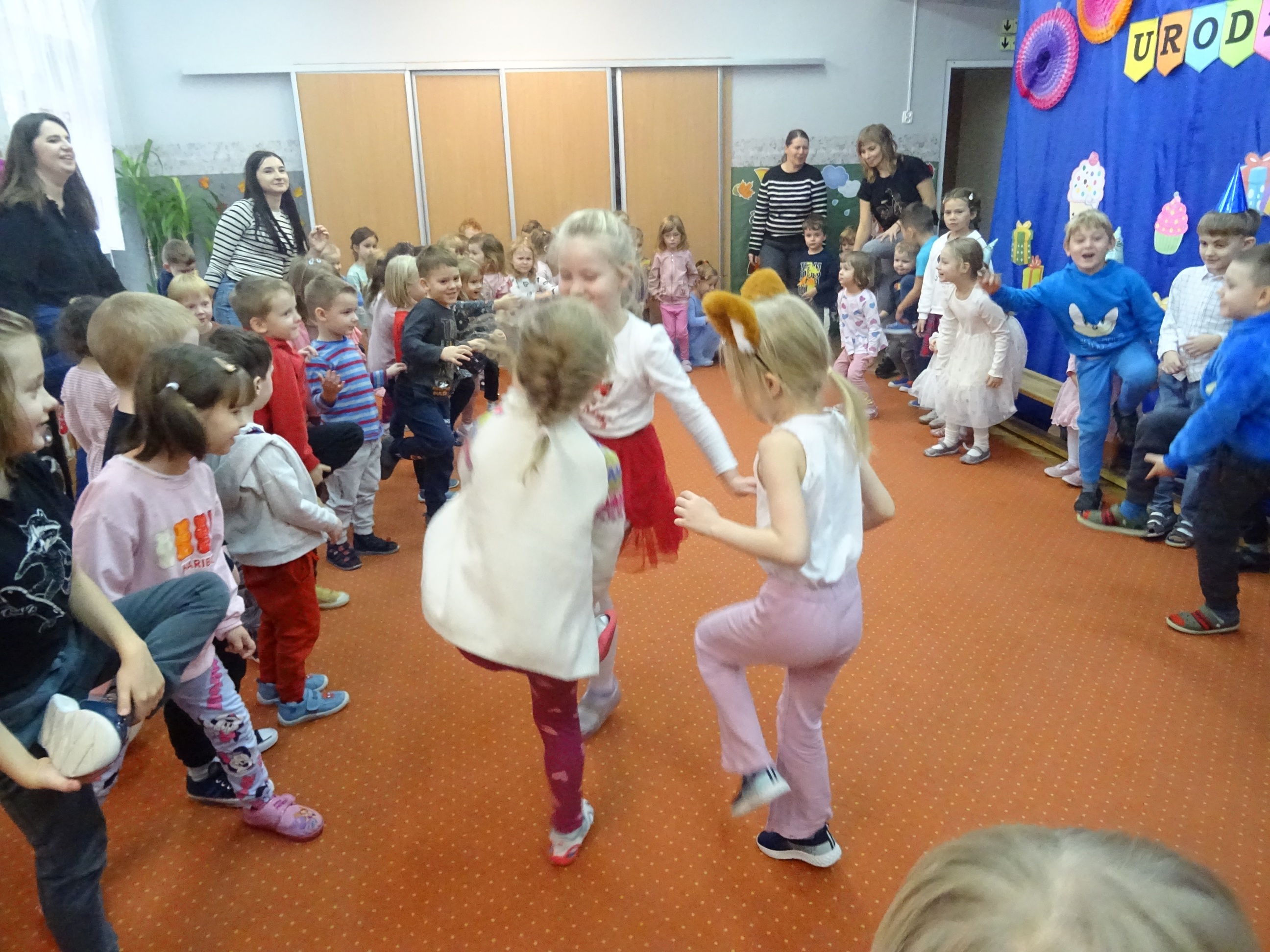 Wszystkie przedszkolaki zebrały się na sali gimnastycznej, aby głośno i uroczyście zaśpiewać „Sto lat”. Pani Wicedyrektor złożyła piękne życzenia przejętym Solenizantom, a następnie wszystkich zgromadzonych zaprosiła do wspólnej zabawy! Były śpiewy, tańce, konkursy, a nawet swobodne improwizacje przy dźwiękach wesołej i skocznej muzyki. Uroczystość Urodzinowa okazała się wyśmienitą okazją do wspólnego spotkania i jeszcze lepszego poznania!