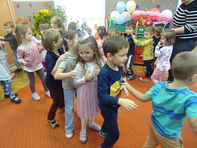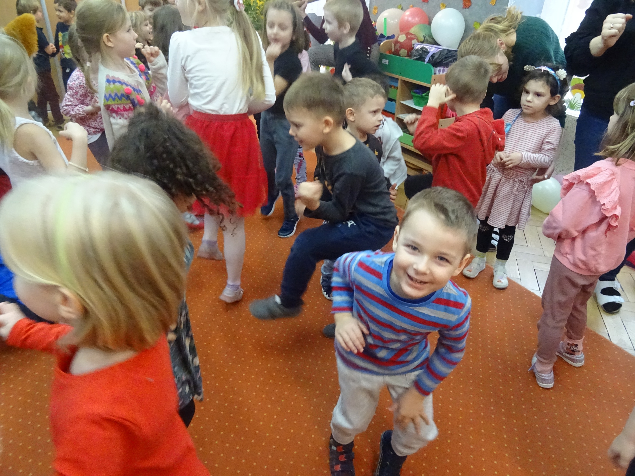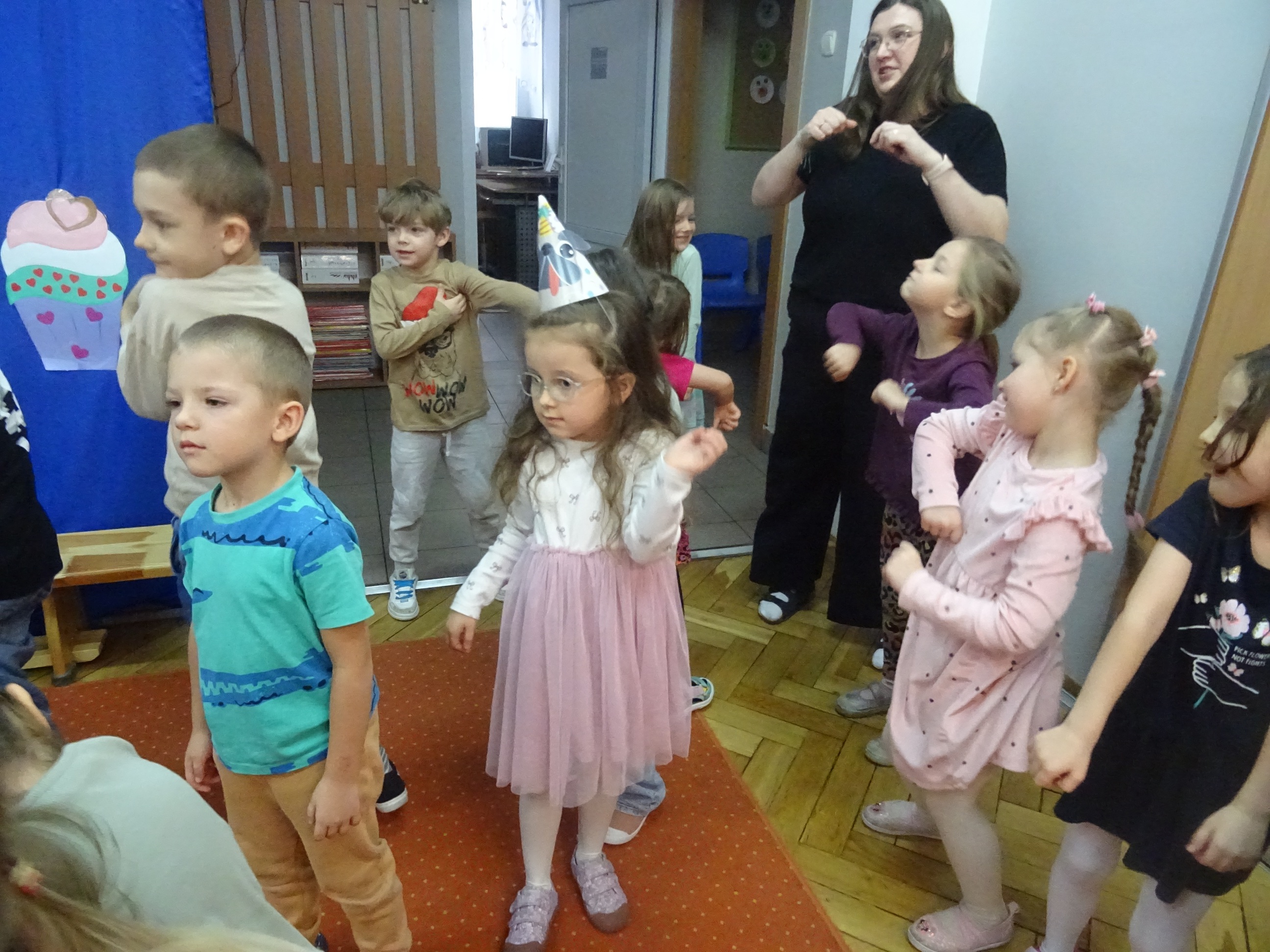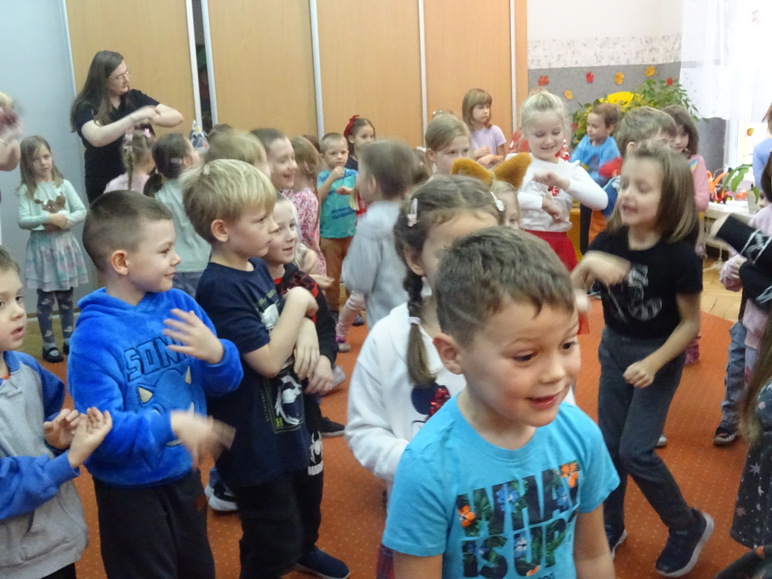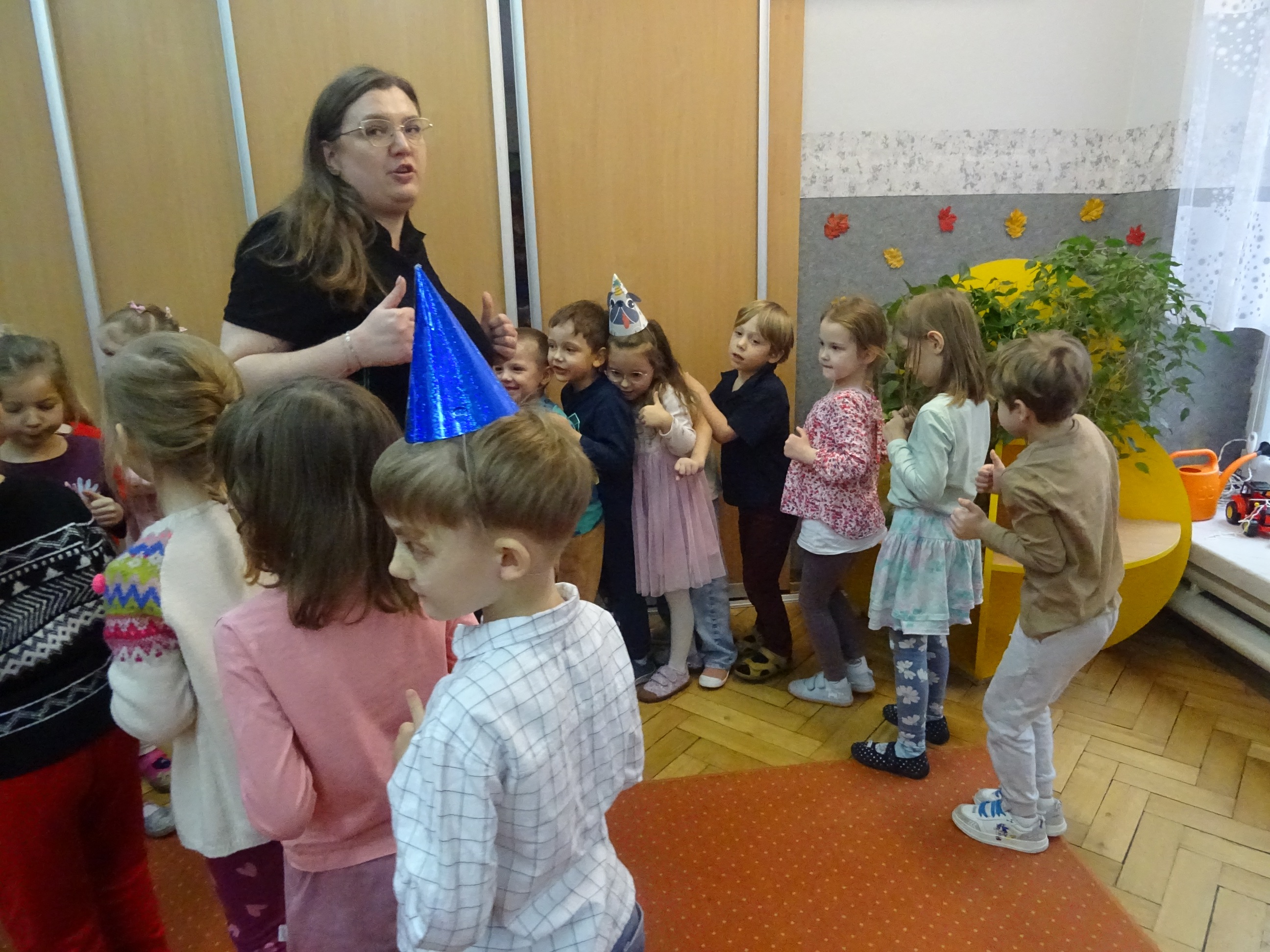 Wszystkie przedszkolaki zebrały się na sali gimnastycznej, aby głośno i uroczyście zaśpiewać „Sto lat”. Pani Wicedyrektor złożyła piękne życzenia przejętym Solenizantom, a następnie wszystkich zgromadzonych zaprosiła do wspólnej zabawy! Były śpiewy, tańce, konkursy, a nawet swobodne improwizacje przy dźwiękach wesołej i skocznej muzyki. Uroczystość Urodzinowa okazała się wyśmienitą okazją do wspólnego spotkania i jeszcze lepszego poznania!