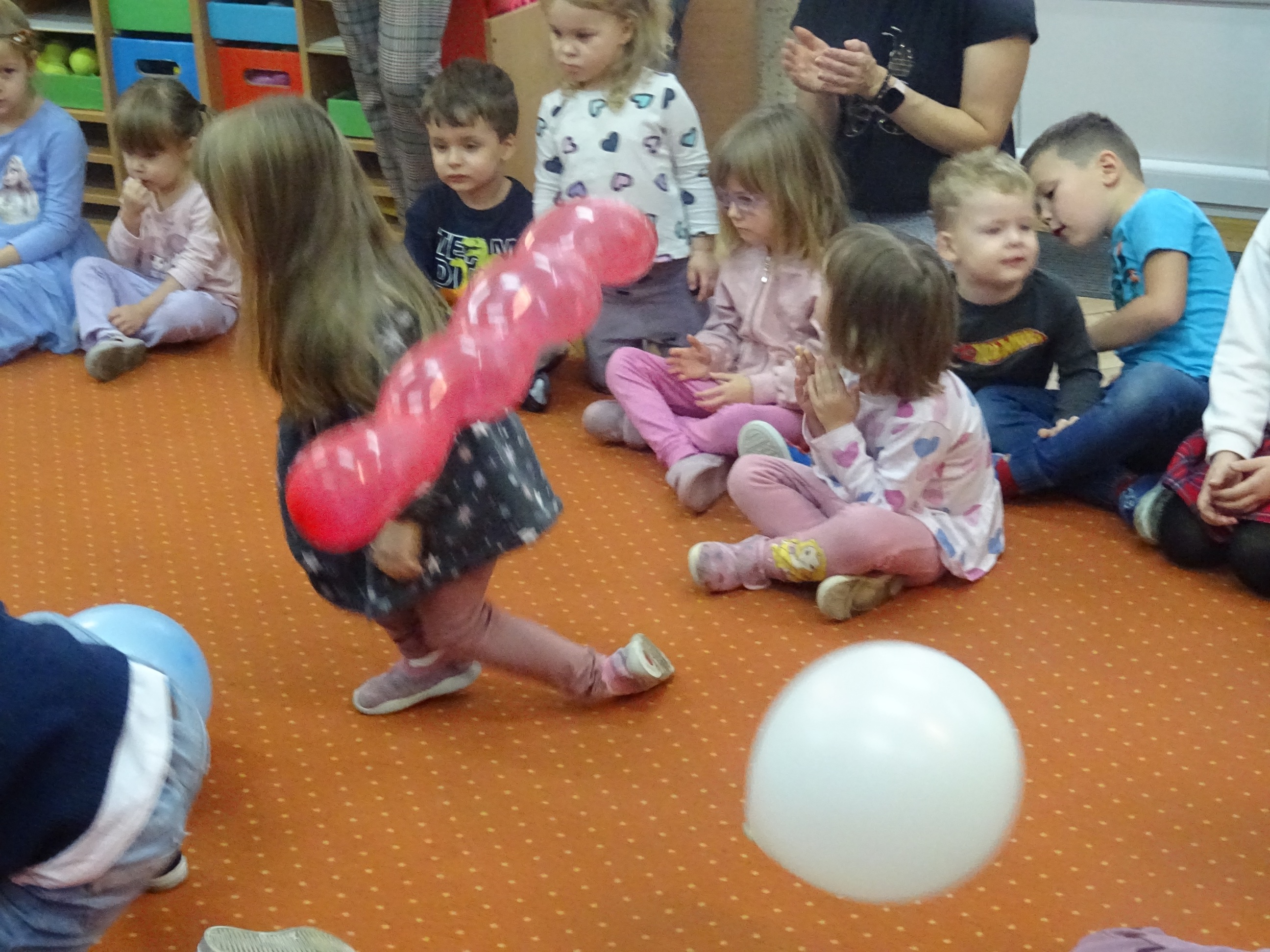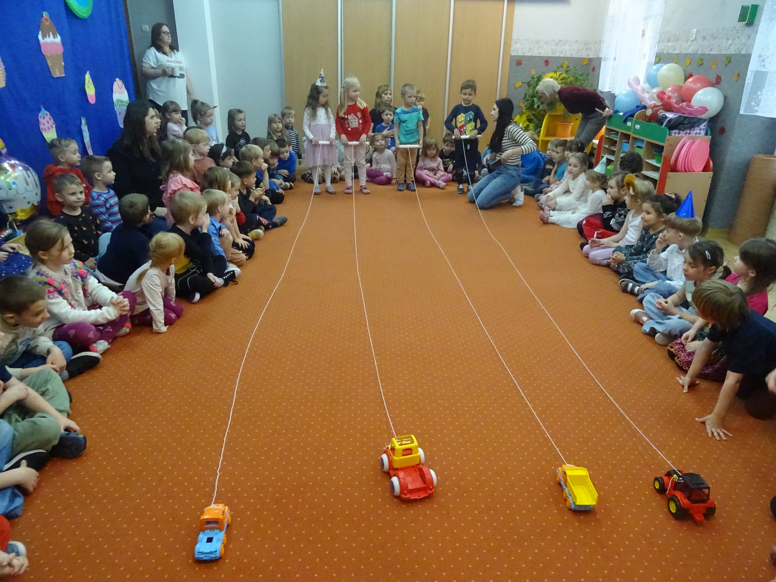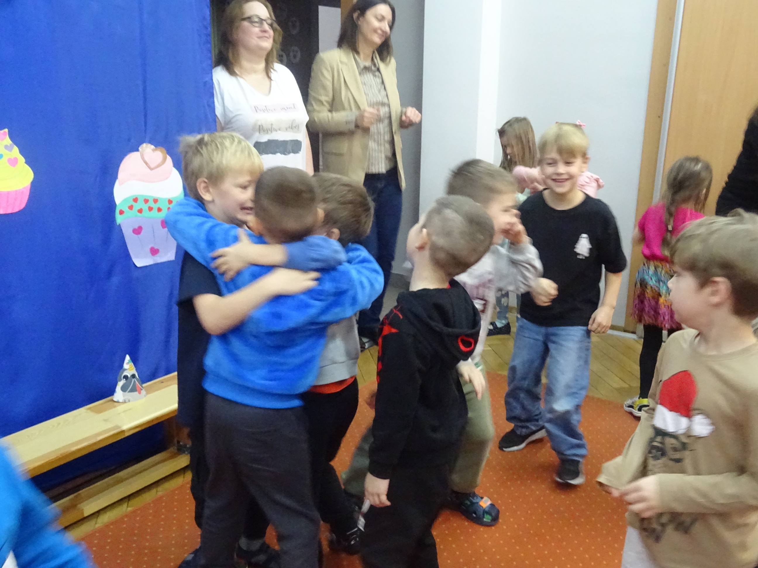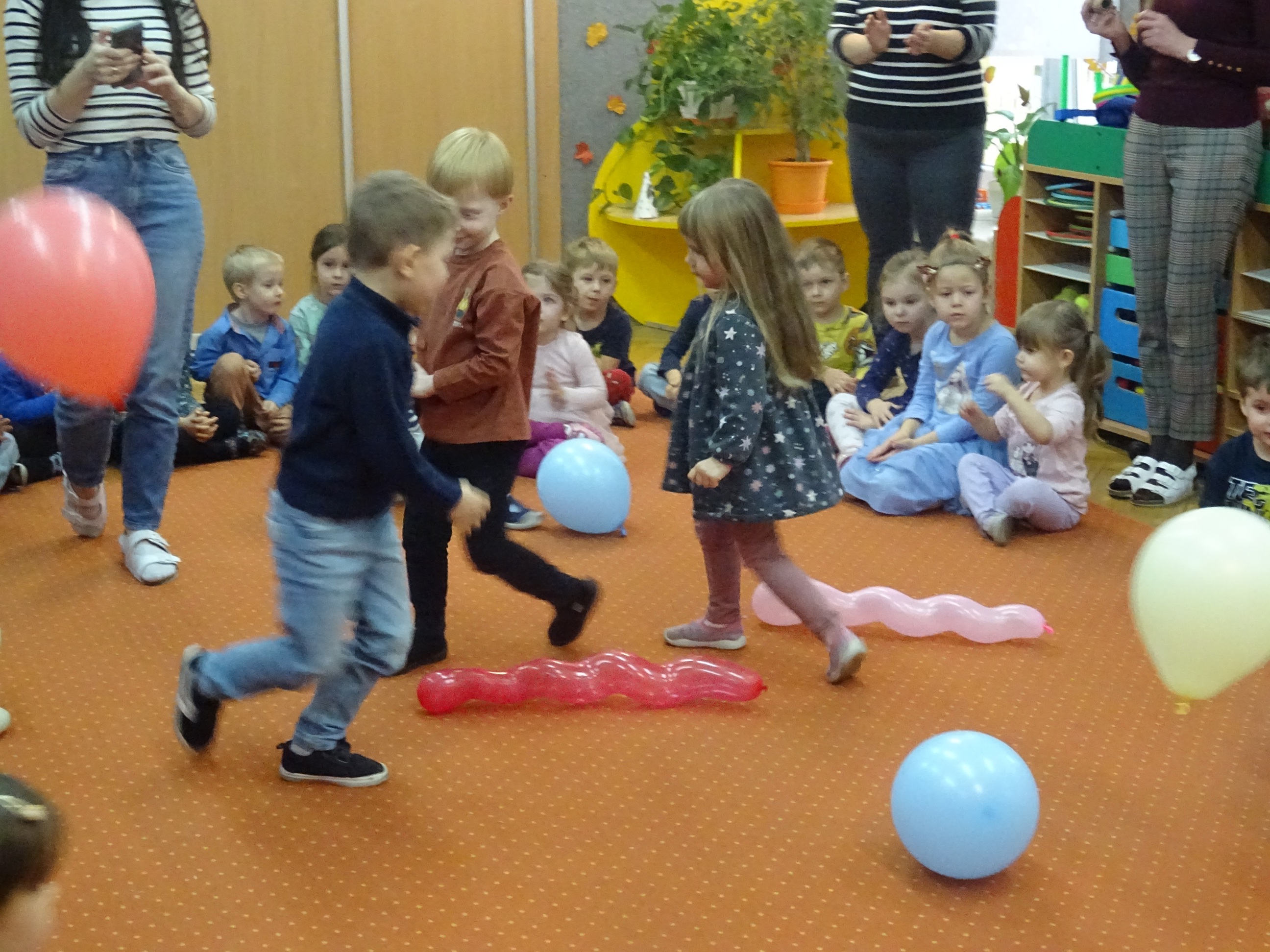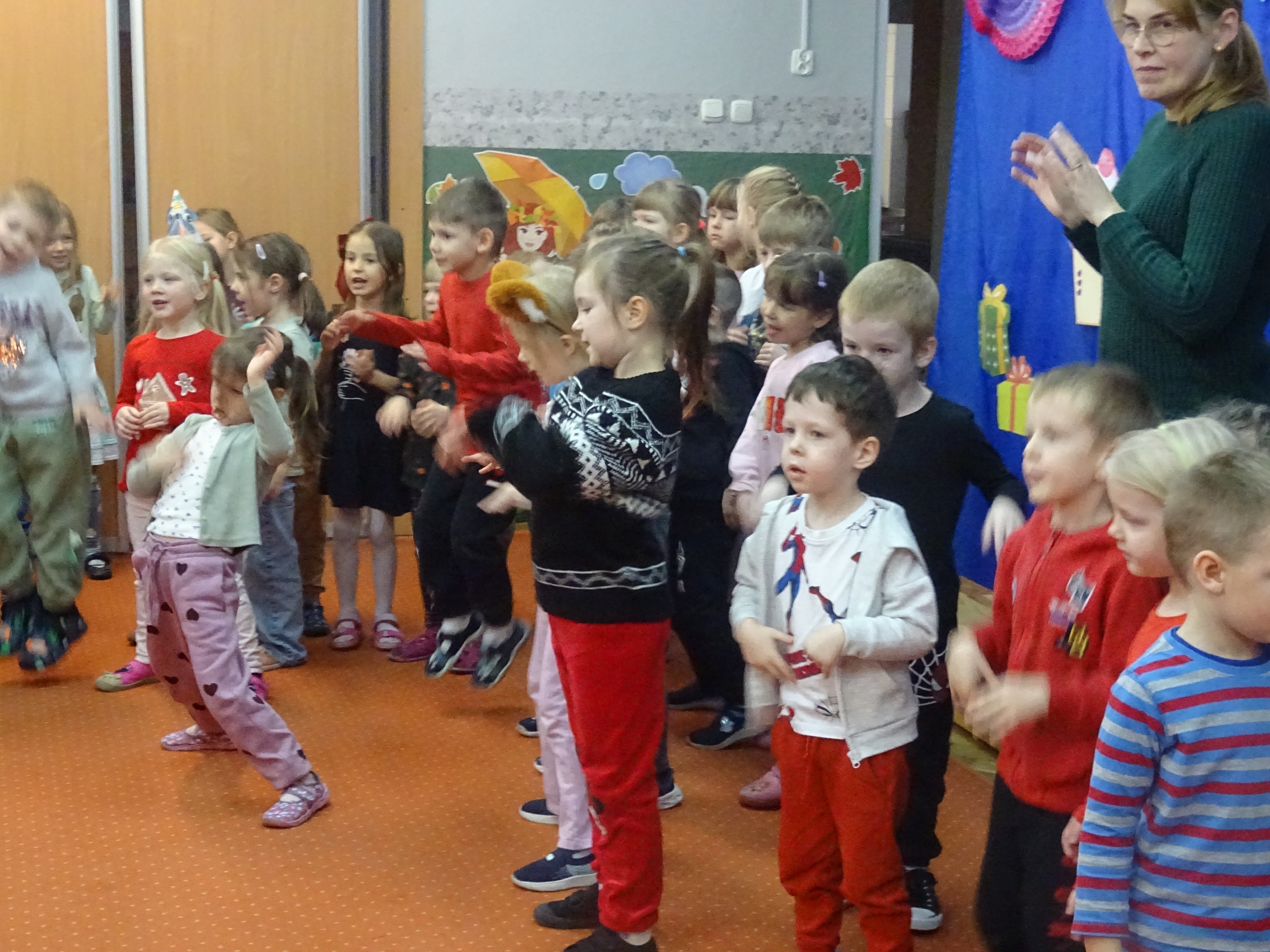 Wszystkie przedszkolaki zebrały się na sali gimnastycznej, aby głośno i uroczyście zaśpiewać „Sto lat”. Pani Wicedyrektor złożyła piękne życzenia przejętym Solenizantom, a następnie wszystkich zgromadzonych zaprosiła do wspólnej zabawy! Były śpiewy, tańce, konkursy, a nawet swobodne improwizacje przy dźwiękach wesołej i skocznej muzyki. Uroczystość Urodzinowa okazała się wyśmienitą okazją do wspólnego spotkania i jeszcze lepszego poznania!