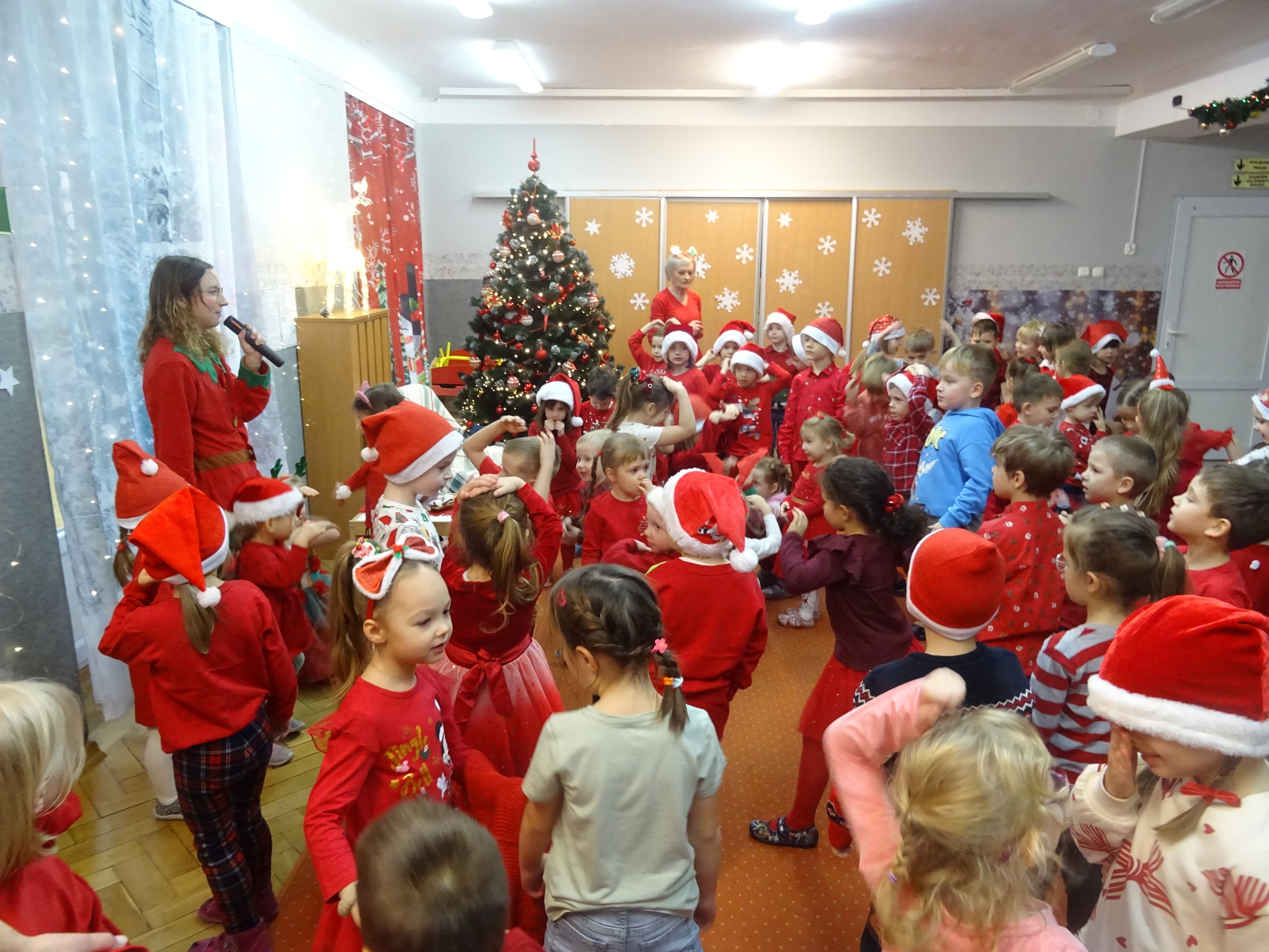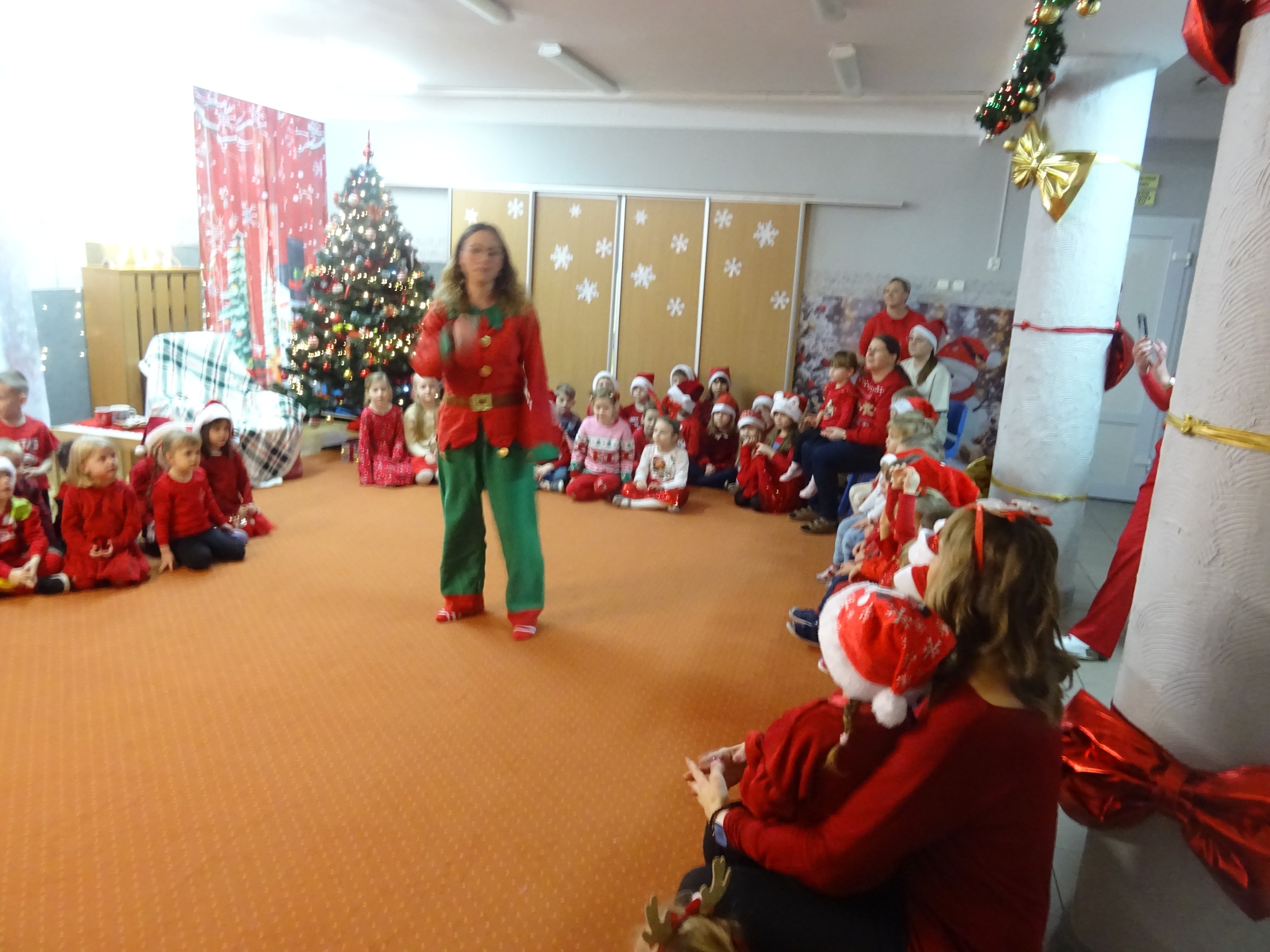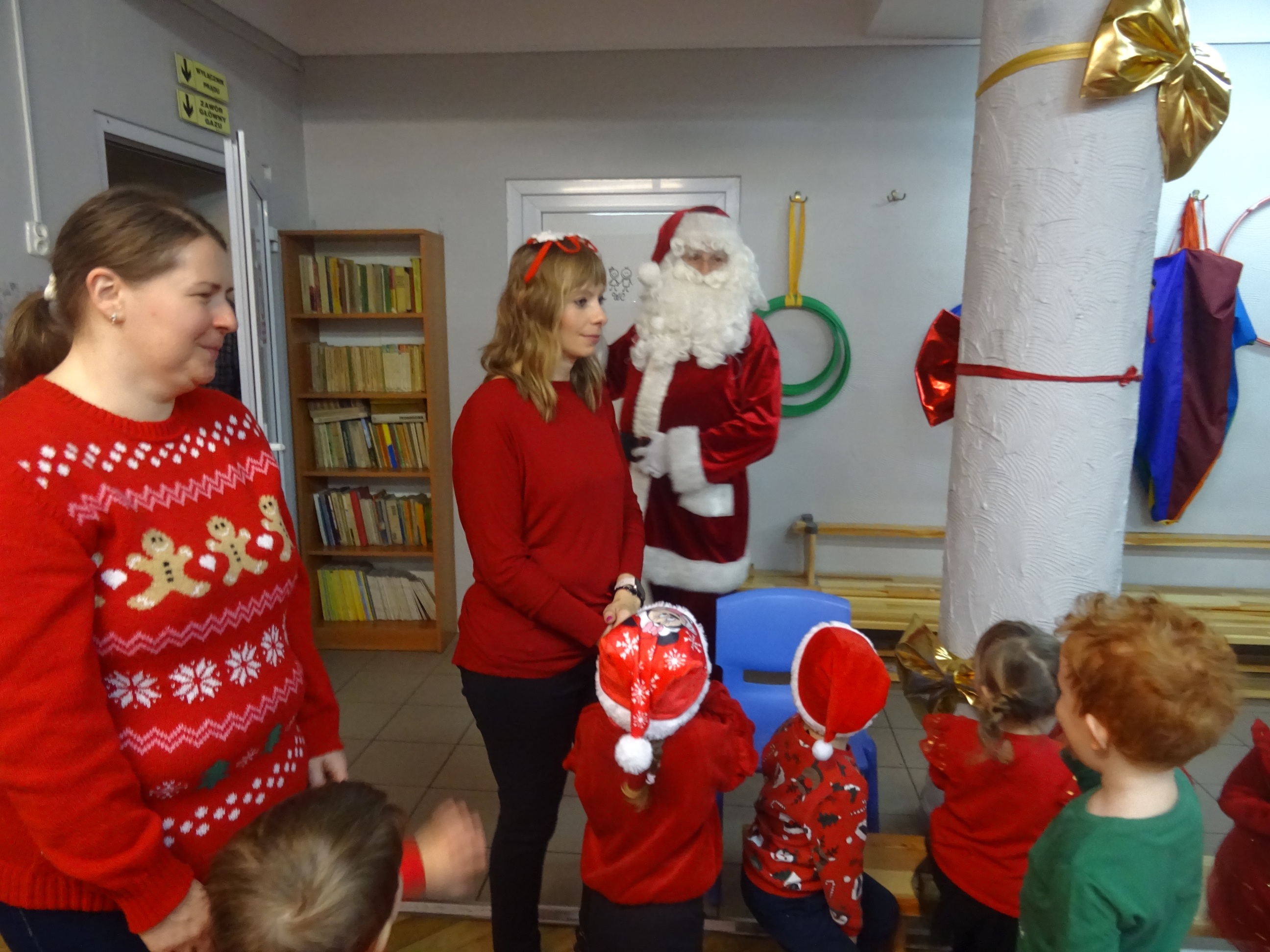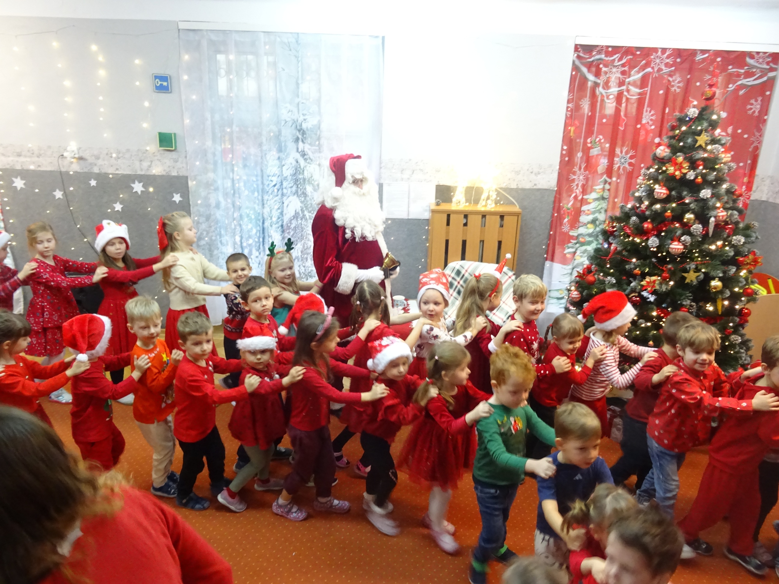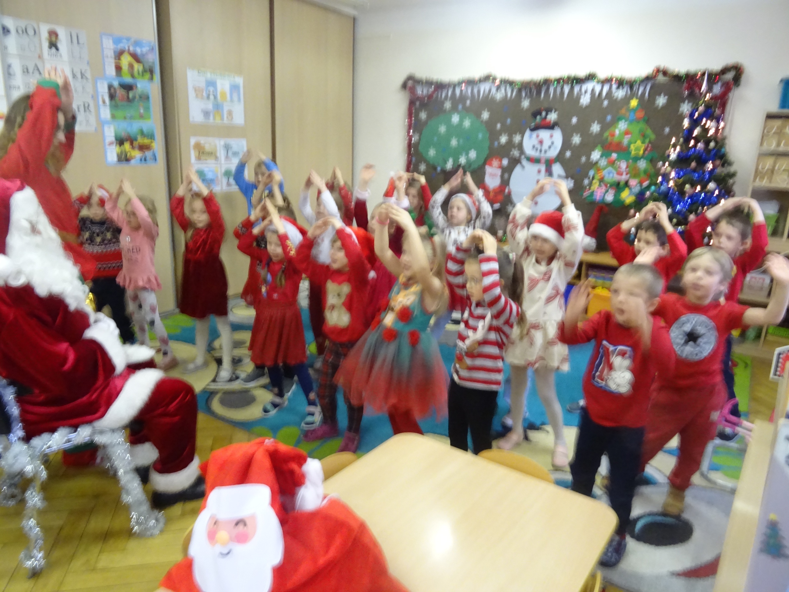 Mikołaj zasiadł w fotelu i opowiedział dzieciom opowieść ruchową dotyczącą tego, jak przygotowuje się do roznoszenia prezentów. Zadał przedszkolakom kilka zagadek i zaprosił do wspólnego tańca.
