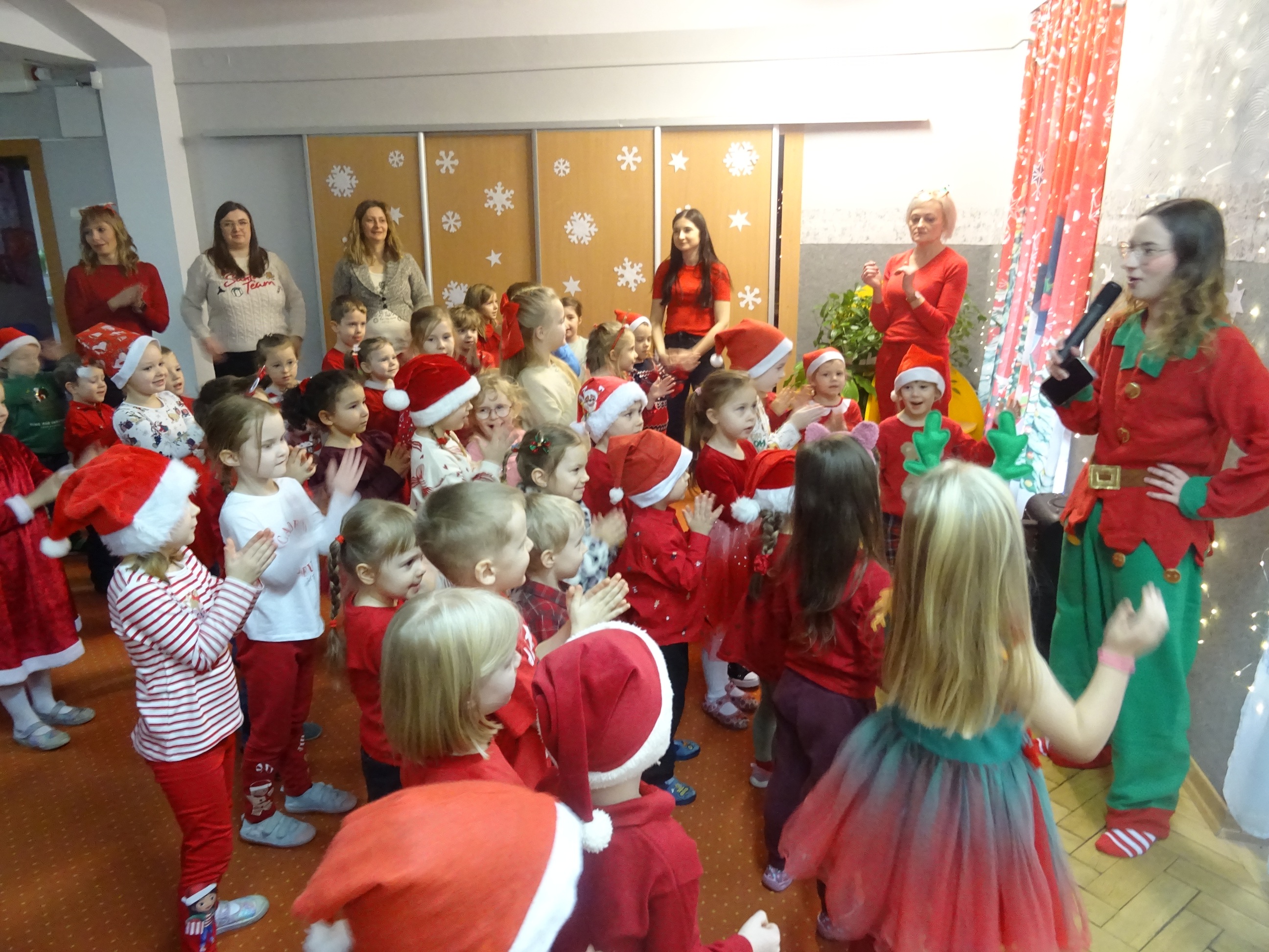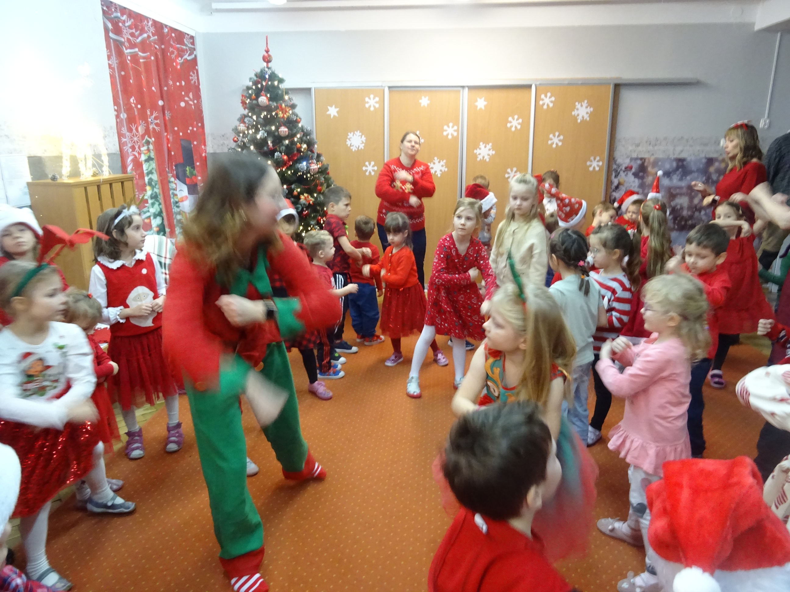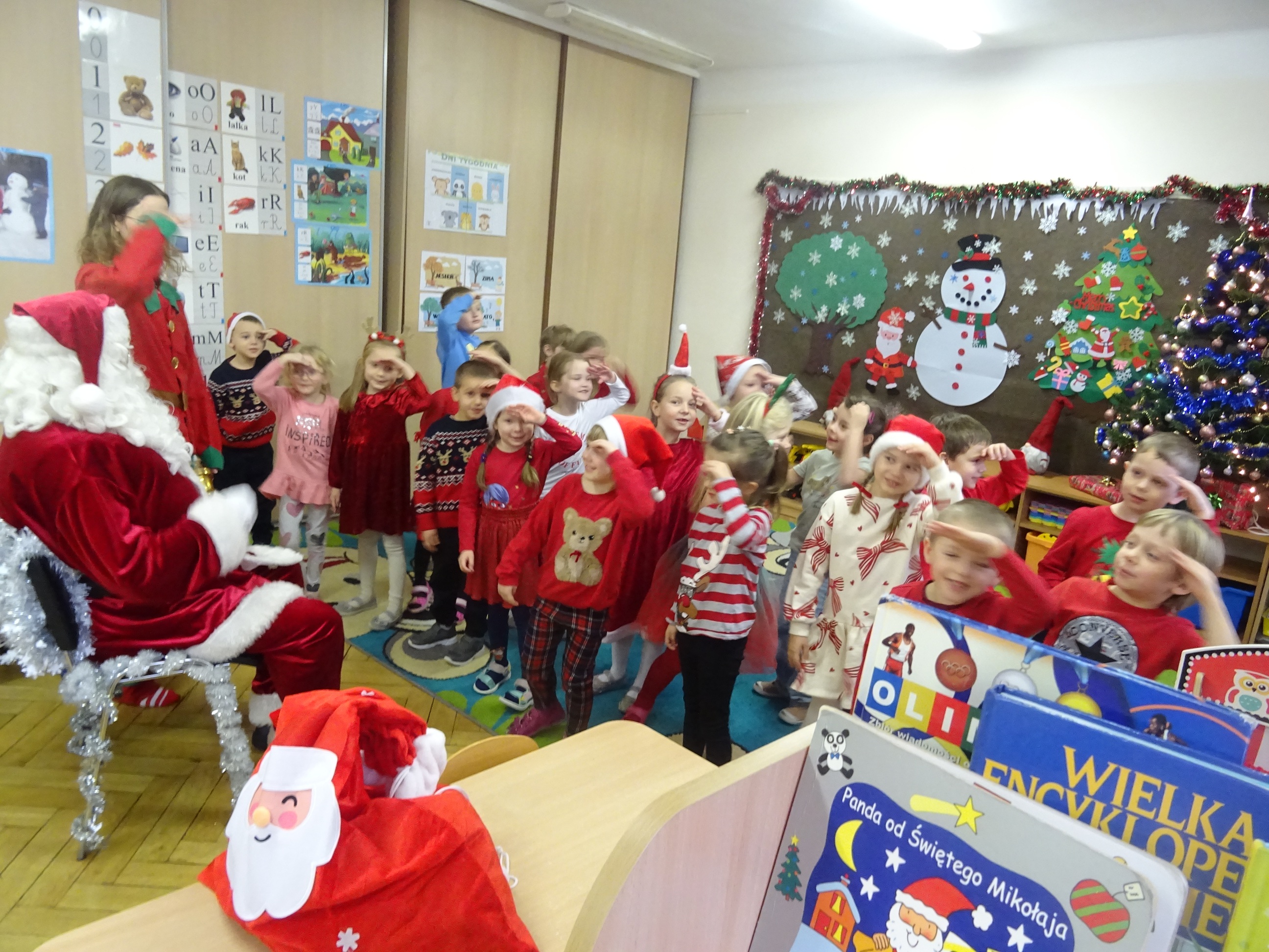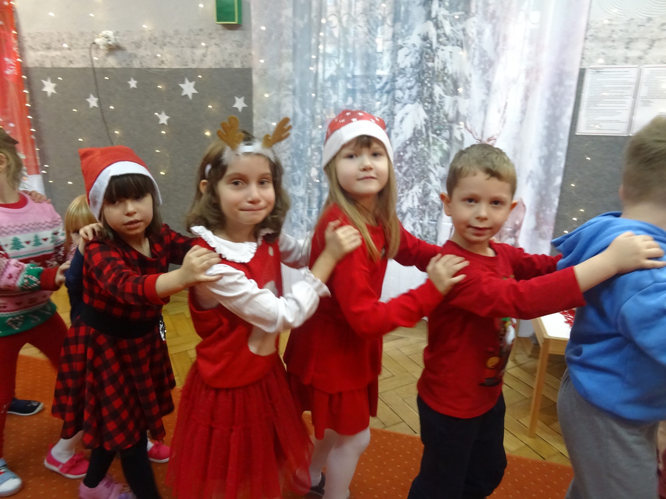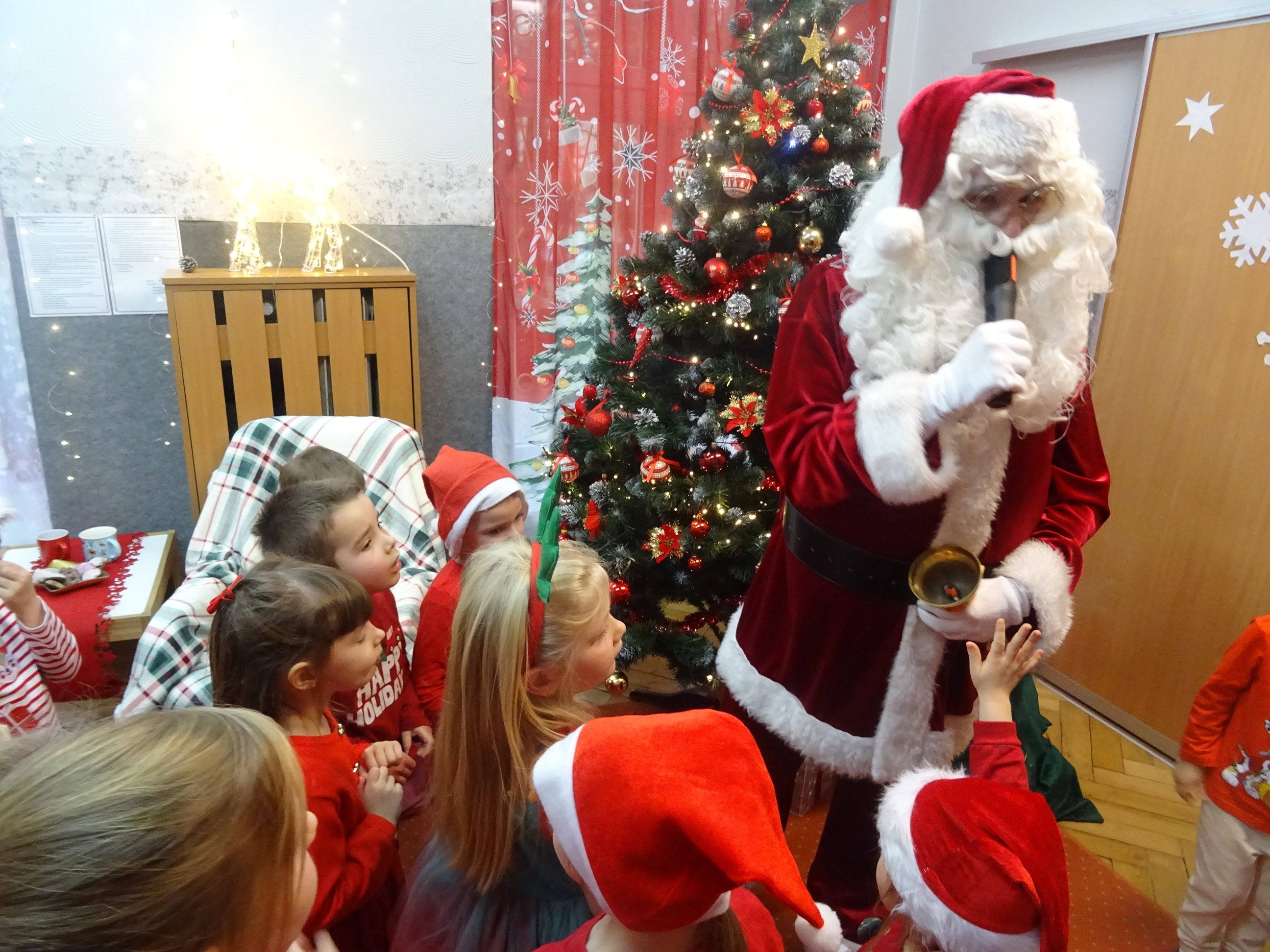 Mikołaj zasiadł w fotelu i opowiedział dzieciom opowieść ruchową dotyczącą tego, jak przygotowuje się do roznoszenia prezentów. Zadał przedszkolakom kilka zagadek i zaprosił do wspólnego tańca.