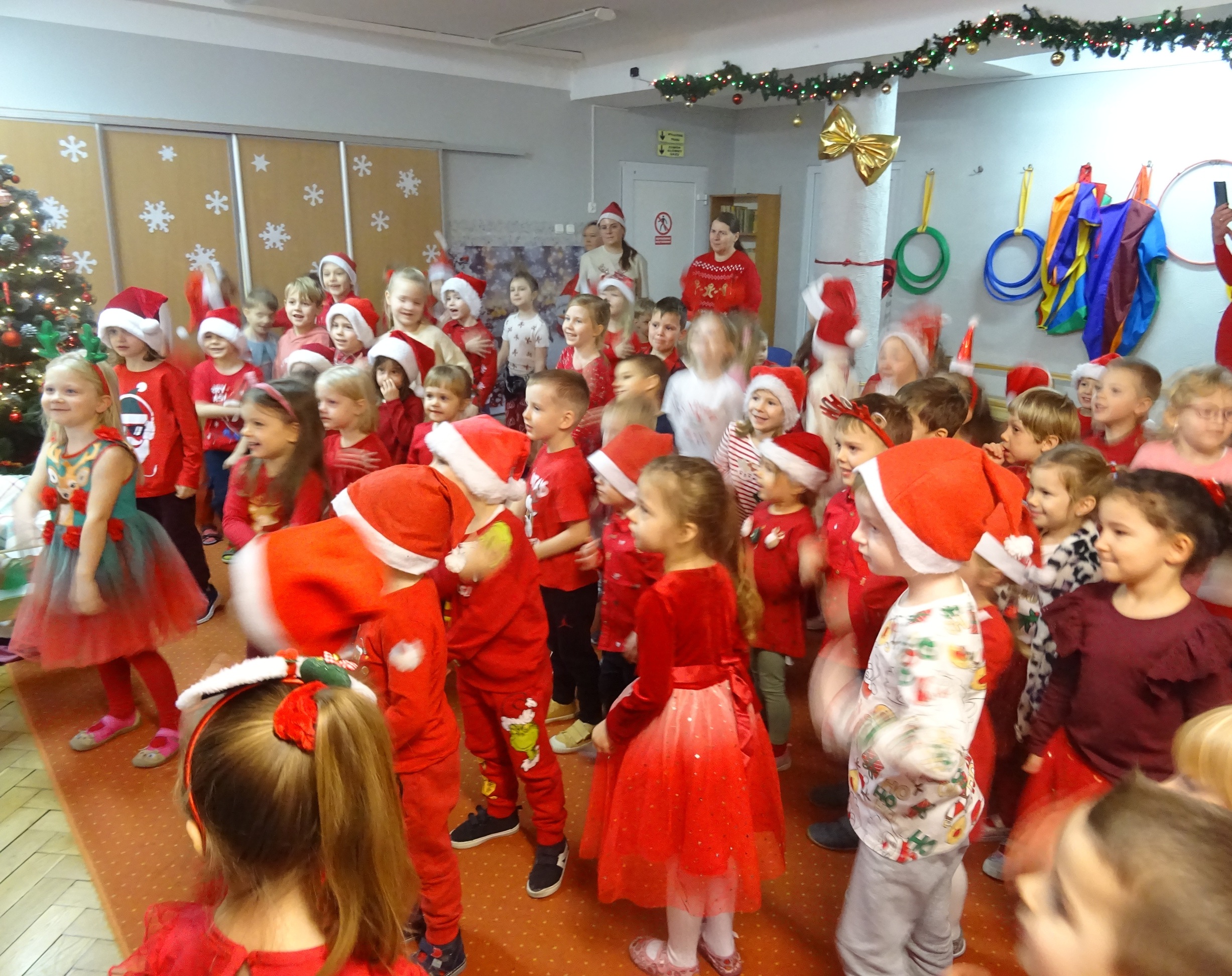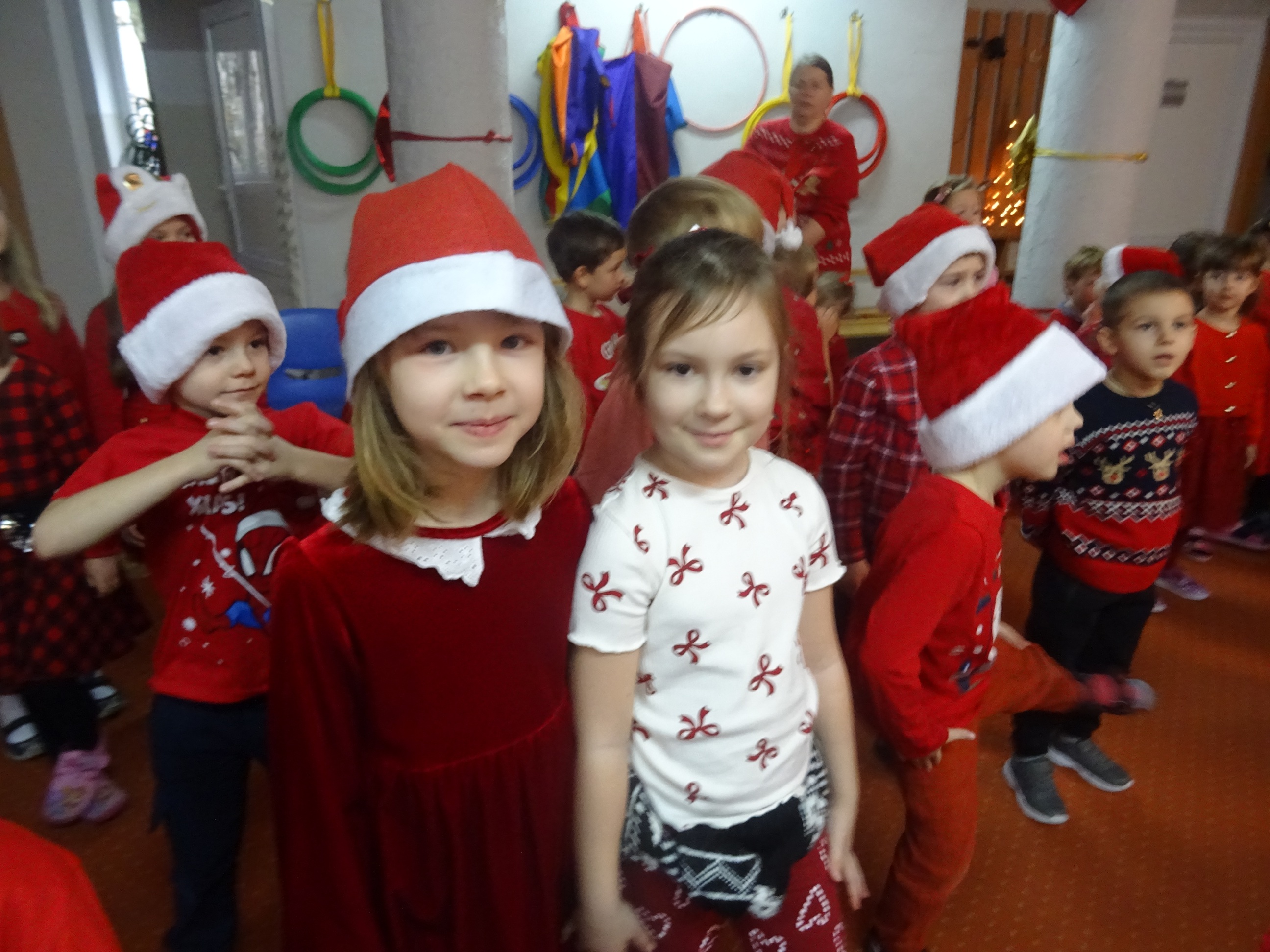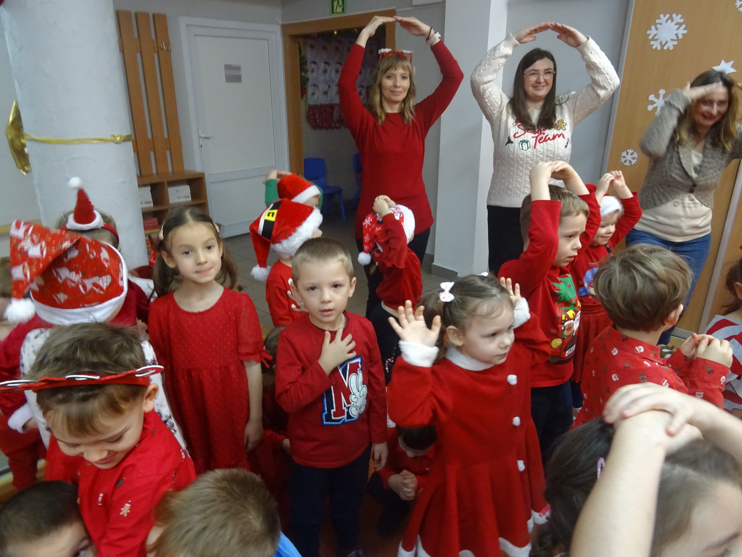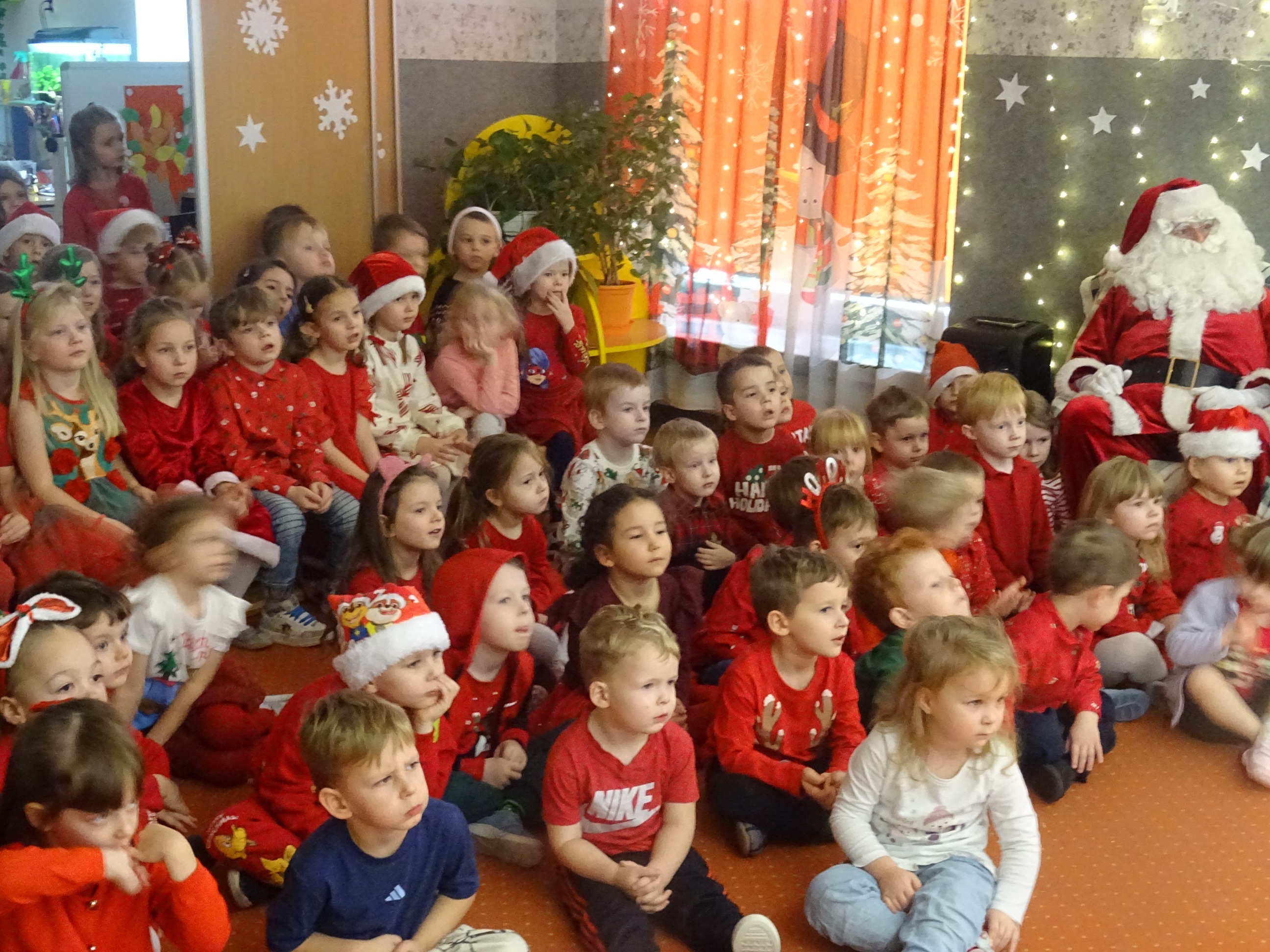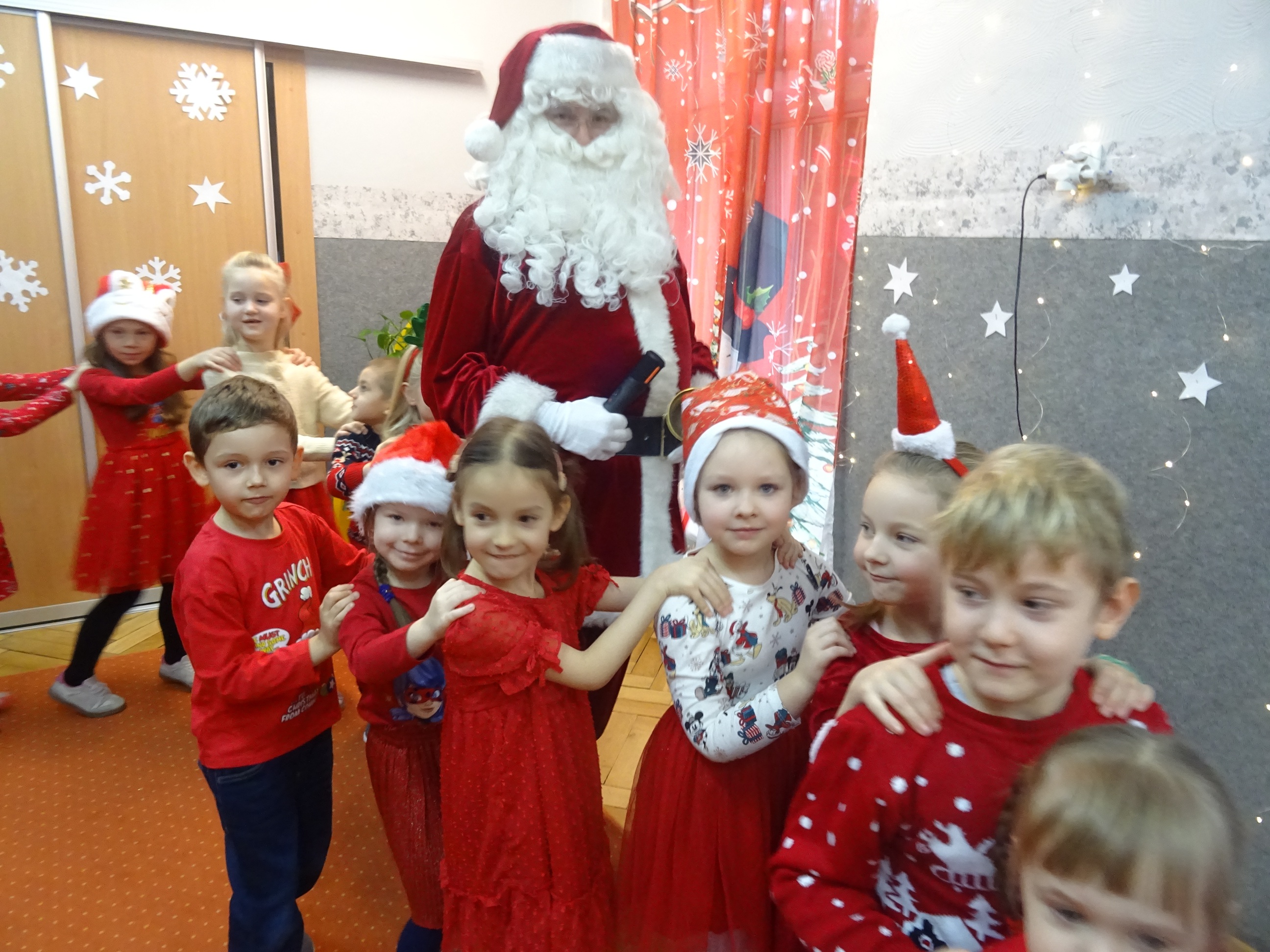 Mikołaj zasiadł w fotelu i opowiedział dzieciom opowieść ruchową dotyczącą tego, jak przygotowuje się do roznoszenia prezentów. Zadał przedszkolakom kilka zagadek i zaprosił do wspólnego tańca.