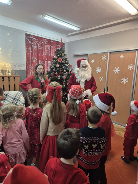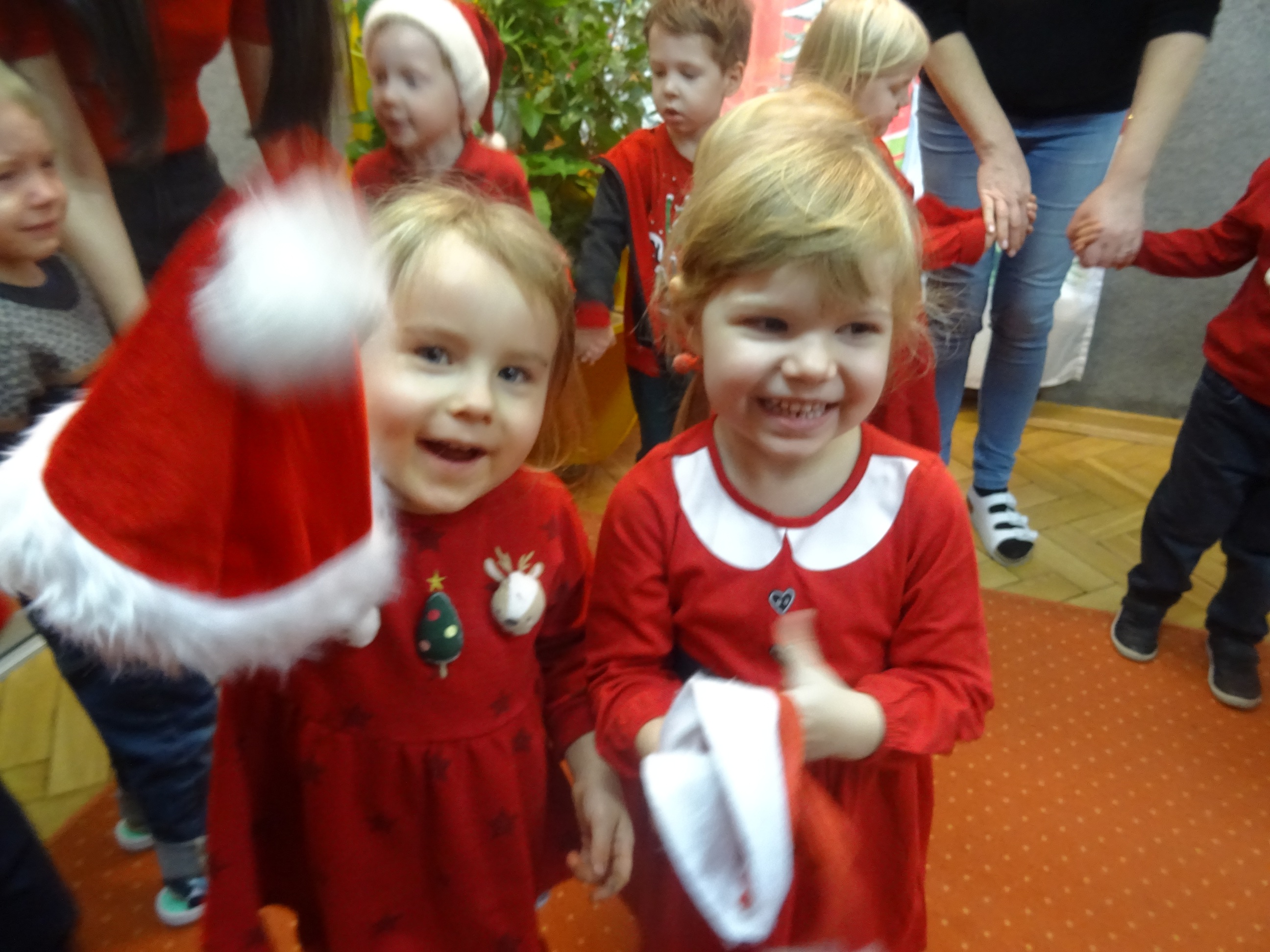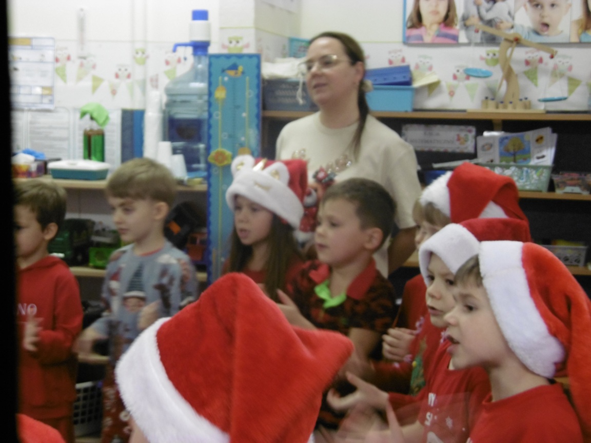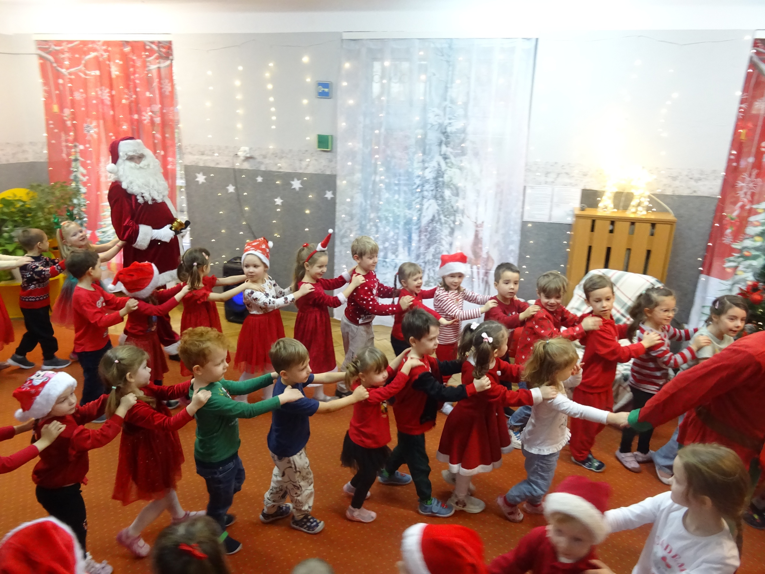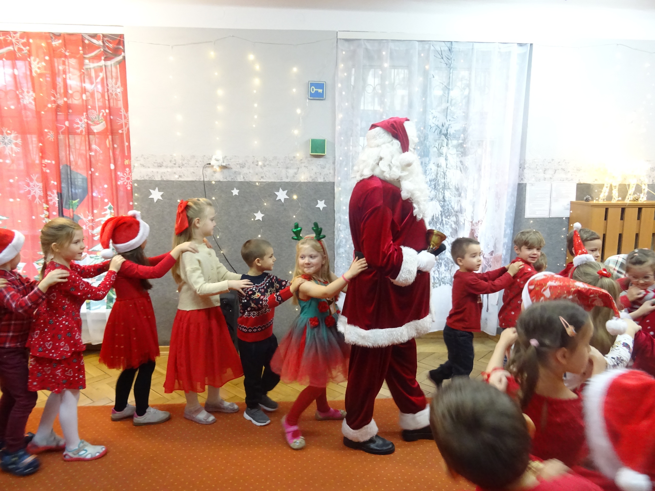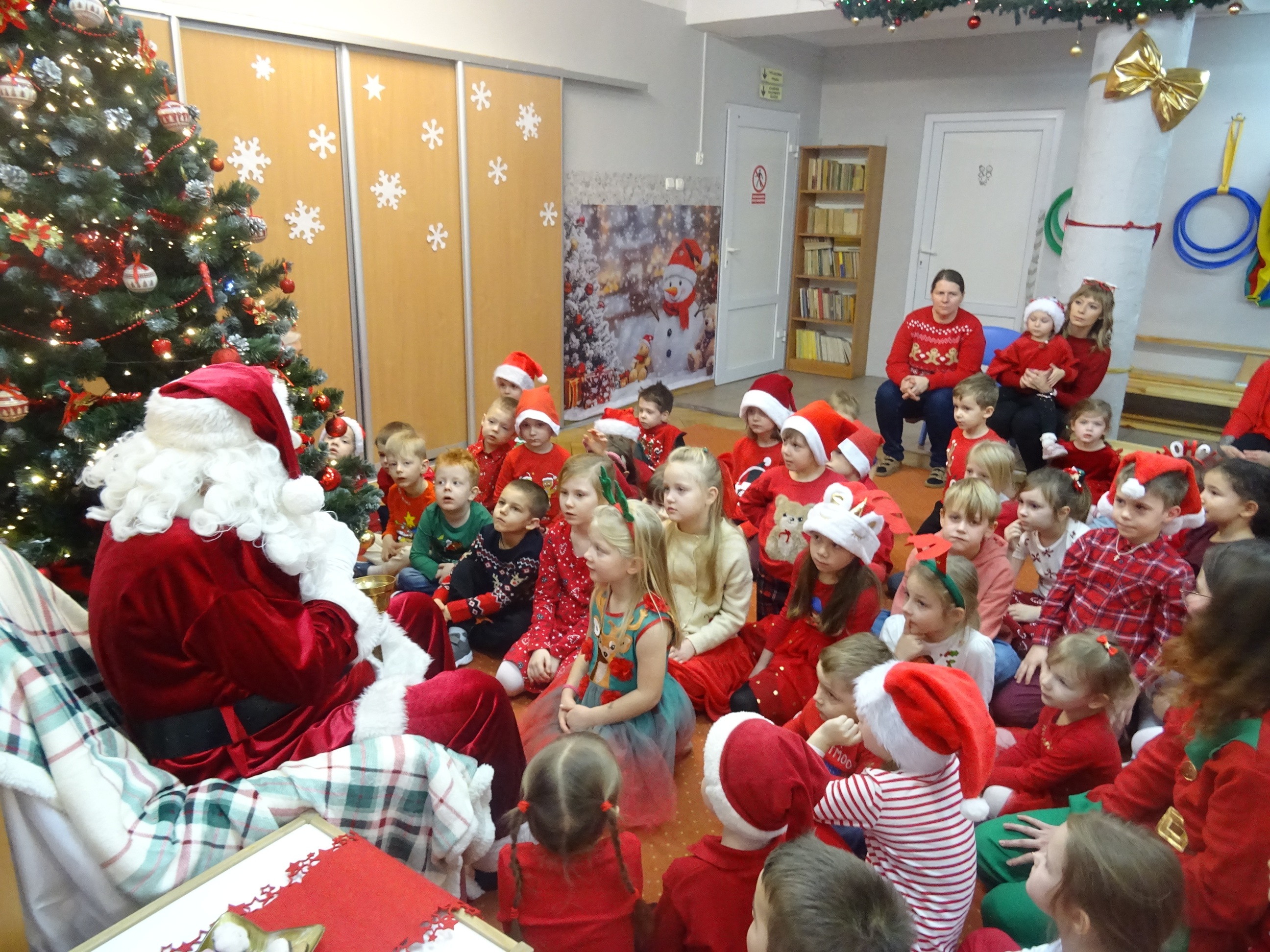 Mikołaj zasiadł w fotelu i opowiedział dzieciom opowieść ruchową dotyczącą tego, jak przygotowuje się do roznoszenia prezentów. Zadał przedszkolakom kilka zagadek i zaprosił do wspólnego tańca.