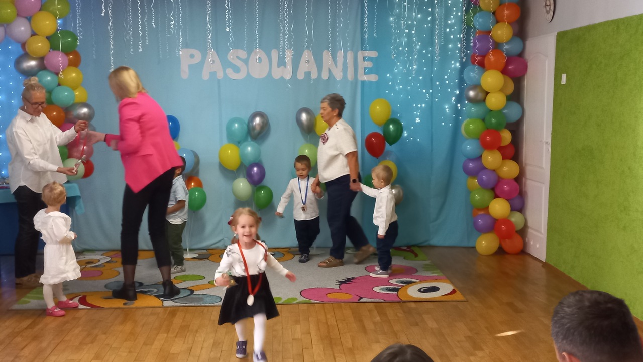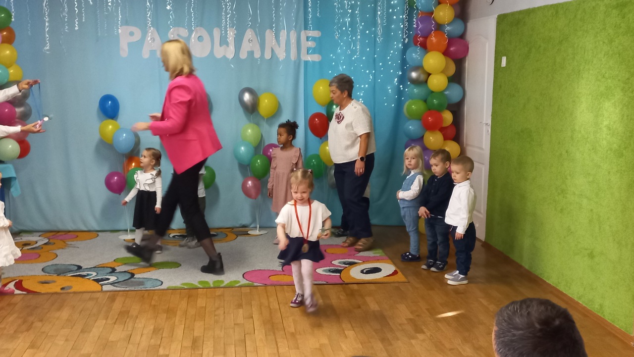 Tuptusie przygotowywały się do tej chwili od pierwszego dnia pobytu w placówce. Elegancko ubrane, uzbrojone w ogromne uśmiechy ustawiły się na tle kolorowej, balonowej dekoracji. Dzieci przedstawiły krótki, ale atrakcyjny dla oka, ucha i serca każdego rodzica repertuar. Maluszki były bardzo skupione, ładnie zaśpiewały, a jeszcze ładnej wyrecytowały przygotowany wierszyk! Czekało na nie także specjalne zadanie- musiały wykonać bardzo trudne ćwiczenia gimnastyczne- między innymi stanie na jednej nodze, wykonanie podskoków. Równiutko ustawione Tuptusie głośno i wyraźnie powtórzyły słowa przysięgi, a Pani Dyrektor pasowała każde dziecko na pełnoprawnego przedszkolaka! Każdy maluszek został dotknięty czarodziejskim ołówkiem oraz otrzymał wspaniały medal i drobny upominek- sponsorowany przez Radę Rodziców. Na koniec ceremonii swoje ślubowanie musieli także złożyć rodzice- było przy tym dużo śmiechu i dobrej zabawy! Pani Dyrektor wyraziła ogromne uznanie dla Tuptusiów i ich codziennego uśmiechu, ale także zwróciła się w kilku słowach do zebranych rodziców dziękując im za zaufanie i zaangażowanie w życie Przedszkola.