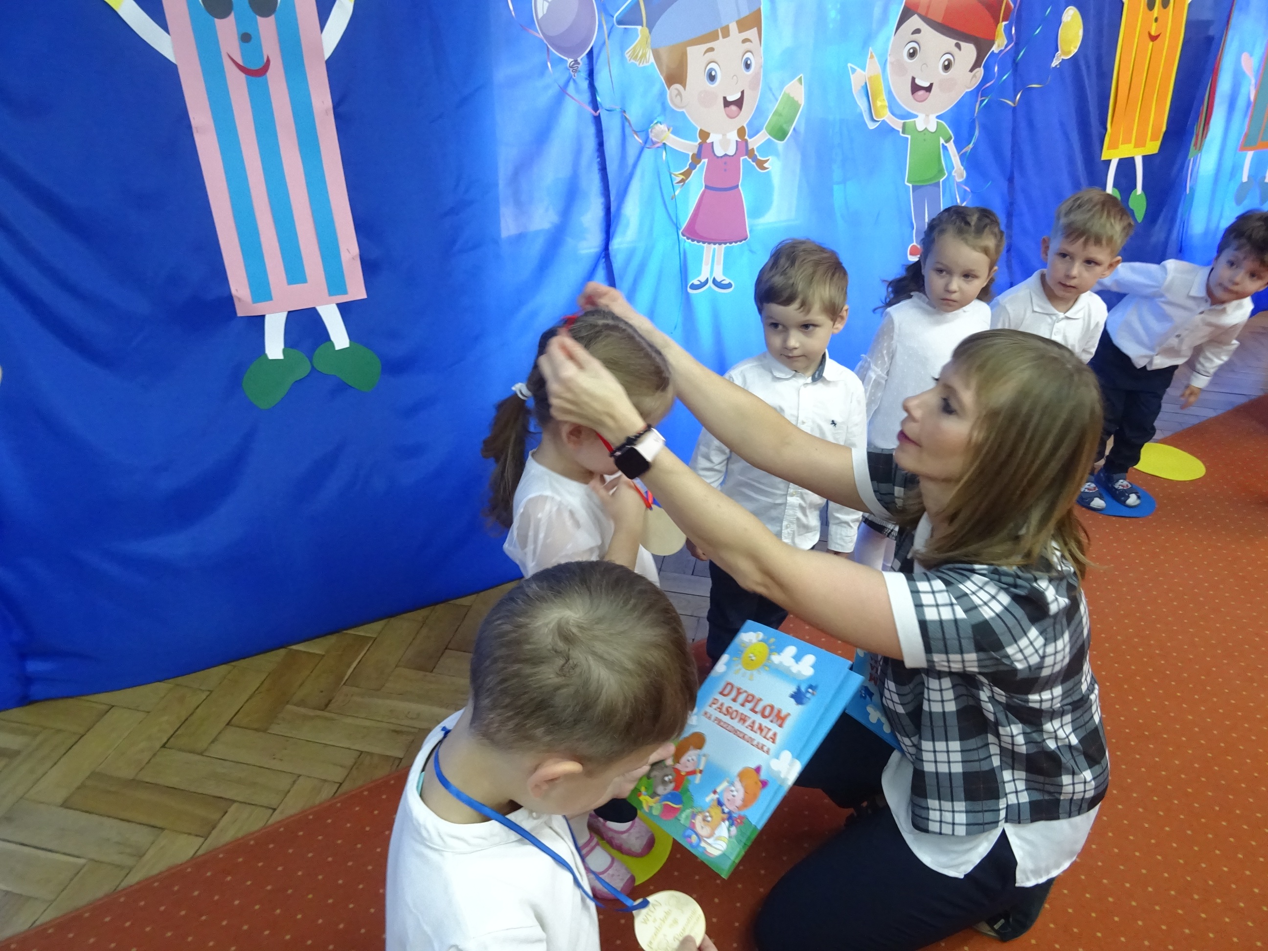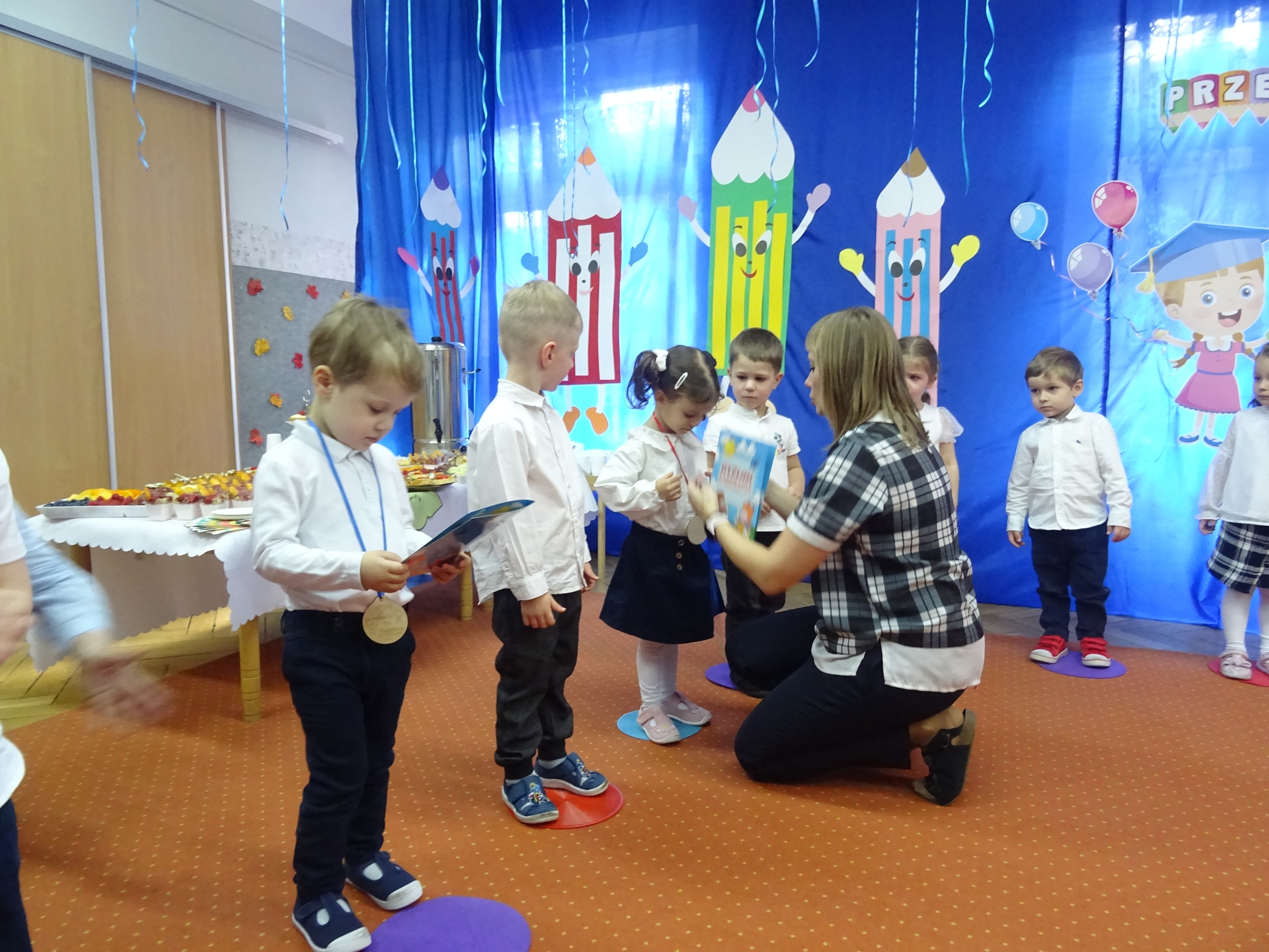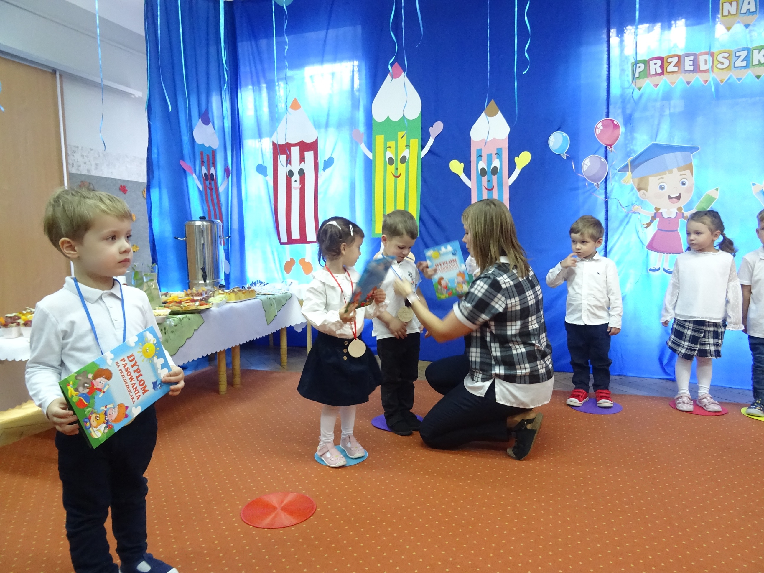 Rodzice Tuptusiów również złożyli przysięgę, że będą wspierać swoje dzieci w ich drodze przez ten etap edukacyjny. Gdy już łzy wzruszenia zostały otarte, Pani Dyrektor uroczyście pasowała każdego z Tuptusiów na Przedszkolaka. Dzieci otrzymały pamiątkowe medale i dyplomy, a następnie wszyscy zebrani zostali zaproszeni na wspaniały poczęstunek przygotowany przez wujka Tomka i ciocię Ewelinkę. Było pięknie i kolorowo!