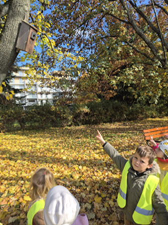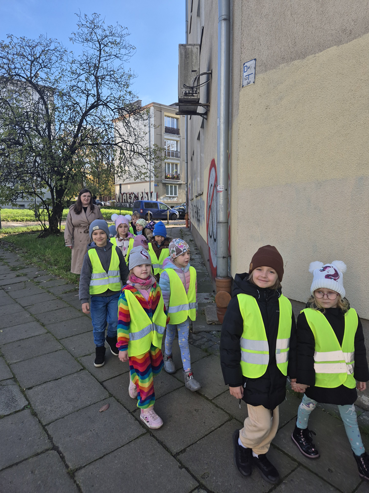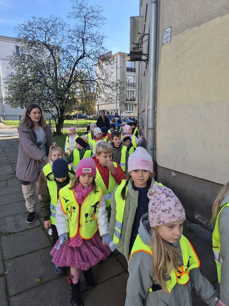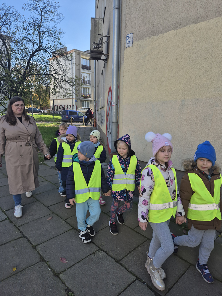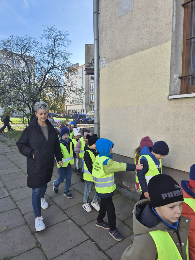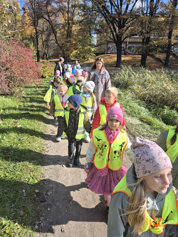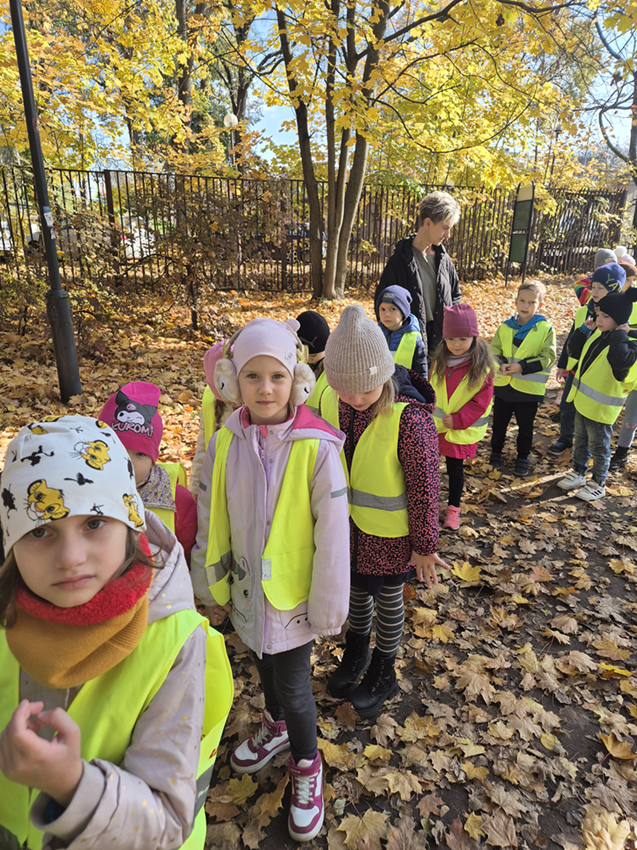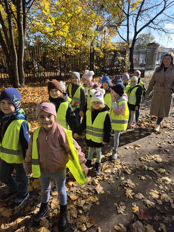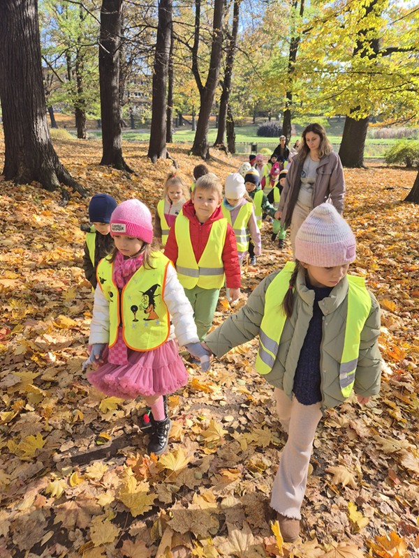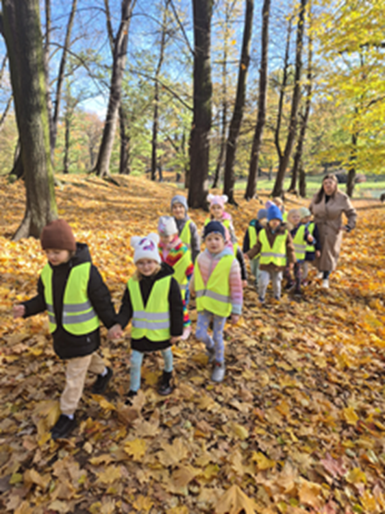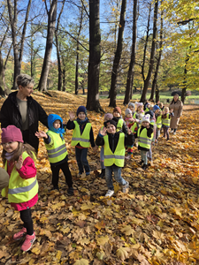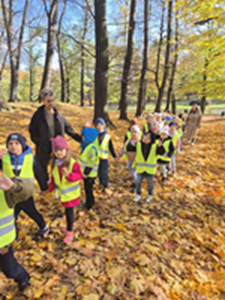 W październiku, korzystając z pięknej jesiennej pogody, po powtórzeniu zasad bezpiecznego poruszania się w parach, Żaczki i Juniorzy wybrali się na spacer do Parku Helenów. Przedszkolaki były bardzo skupione, zaciekawione, z zainteresowaniem oglądały zmiany zachodzące jesienią w przyrodzie. Po drodze uczyły się rozpoznawać wybrane drzewa takie jak: buk, klon, dąb, jawor, jesion. Rozglądały się w poszukiwaniu wiewiórki, ptaków oraz budek lęgowych. Przeszliśmy wokół stawów, przyglądając się pływającym kaczkom. Na koniec doszliśmy także do groty, która zrobiła na dzieciach duże wrażenie. Największą frajdę sprawiało im chodzenie po liściach i szuranie stopami, ponieważ szeleściły i jak to dzieci określiły: „pachniały jesienią”.