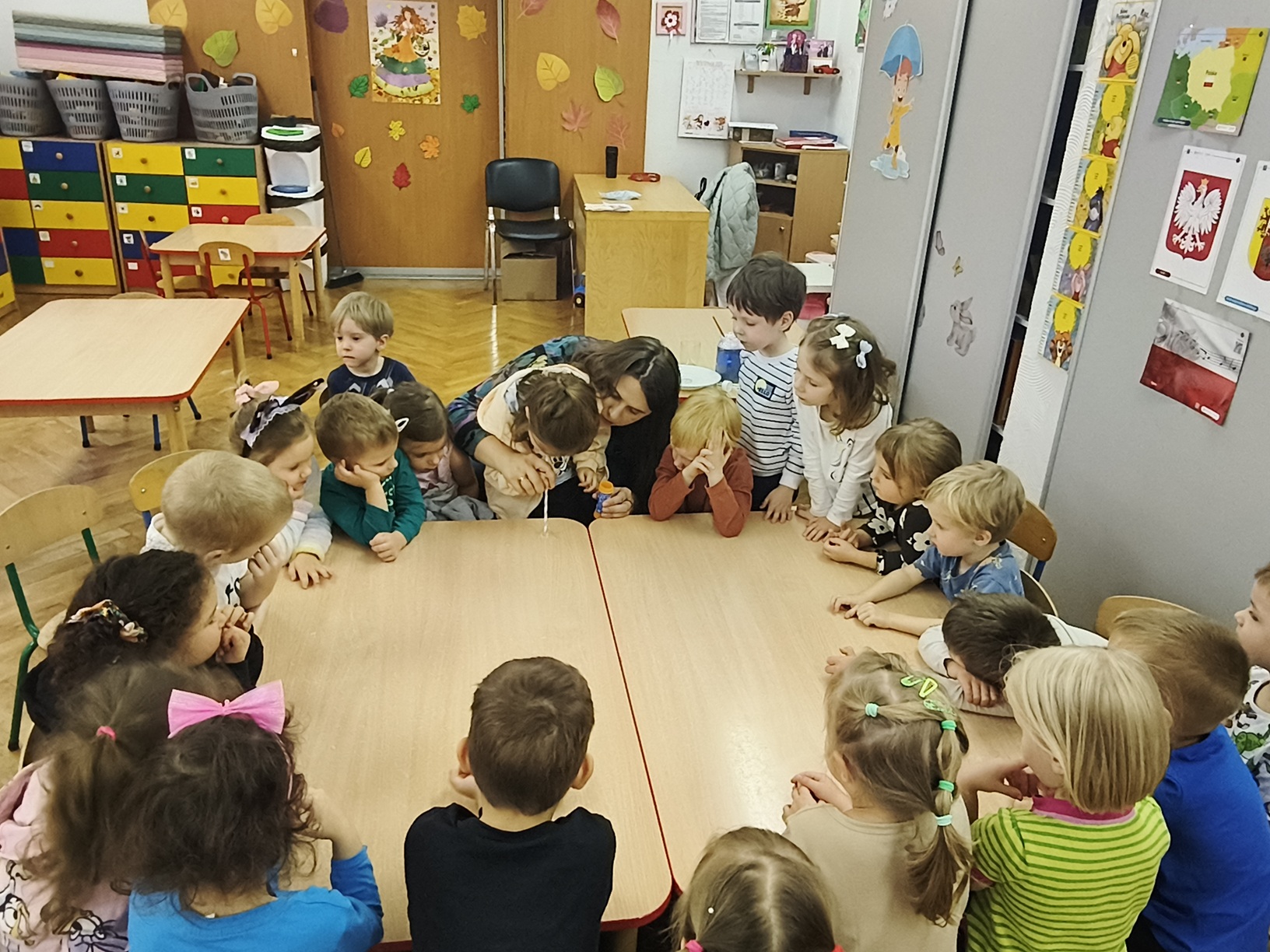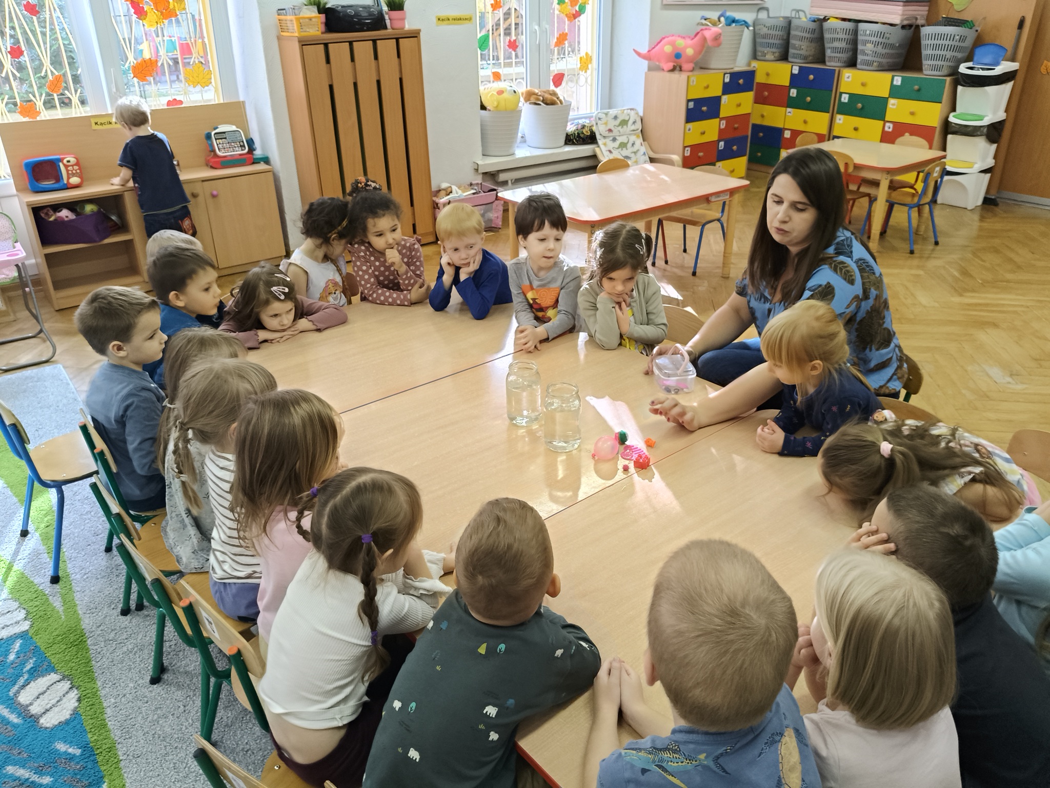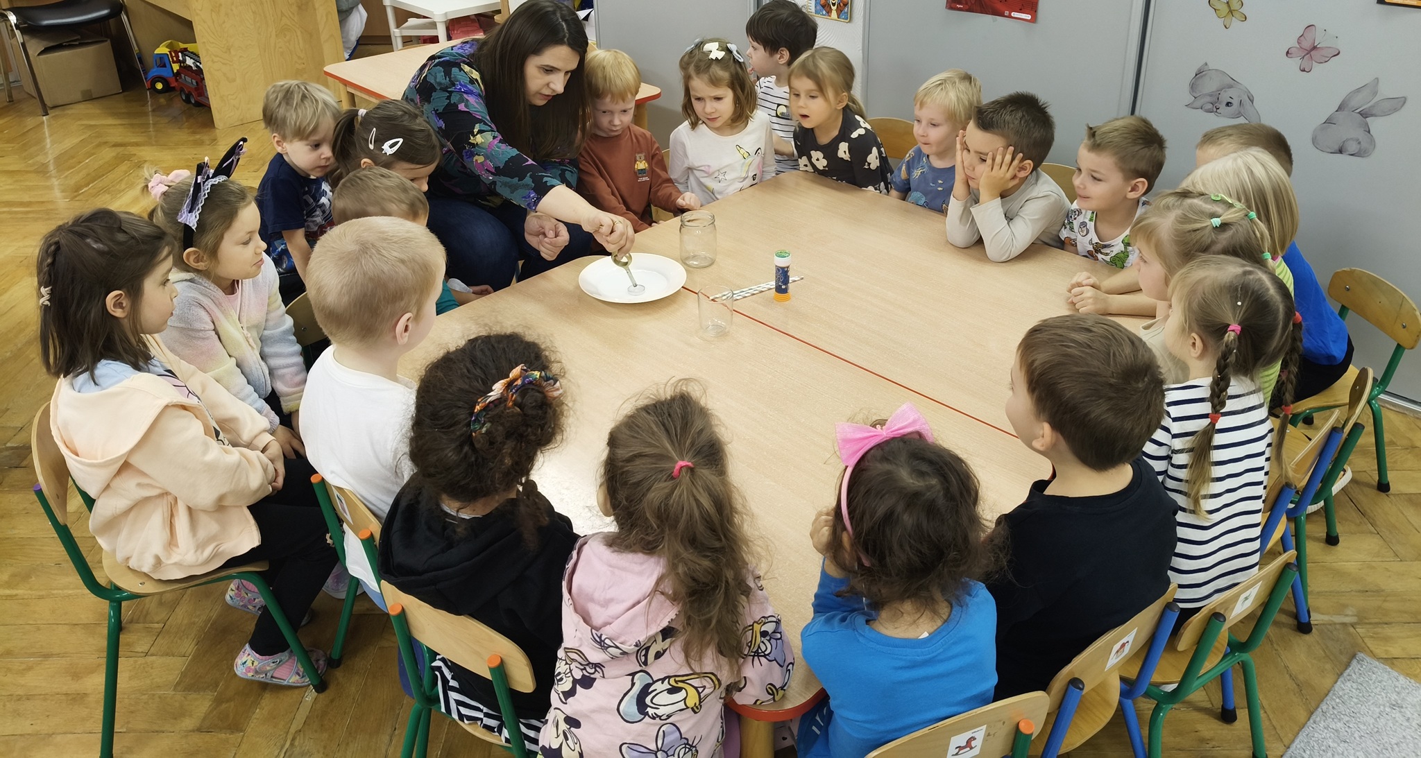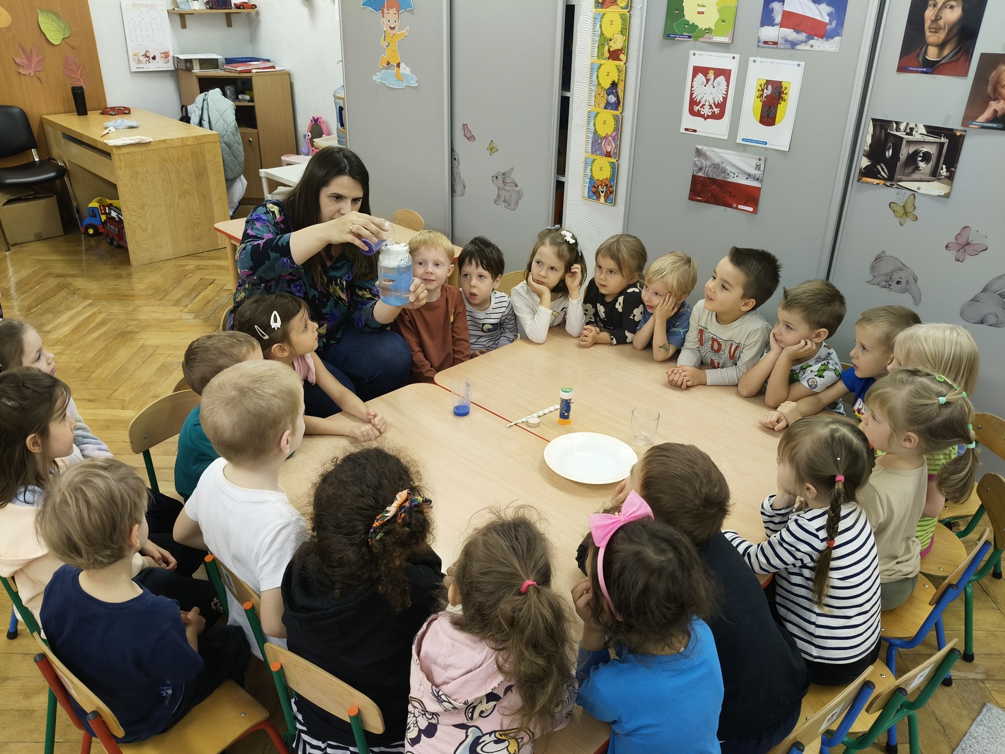 W ostatnim czasie dzieci z grupy Smyki wcieliły się w małych naukowców. Dzieci razem z nauczycielem wykonywały różne eksperymenty i doświadczenia. Zabawy badawcze dostarczyły dzieciom dużo nowych przeżyć i wrażeń. Dzieci szukały odpowiedzi na pytania, dlaczego tak się dzieje?