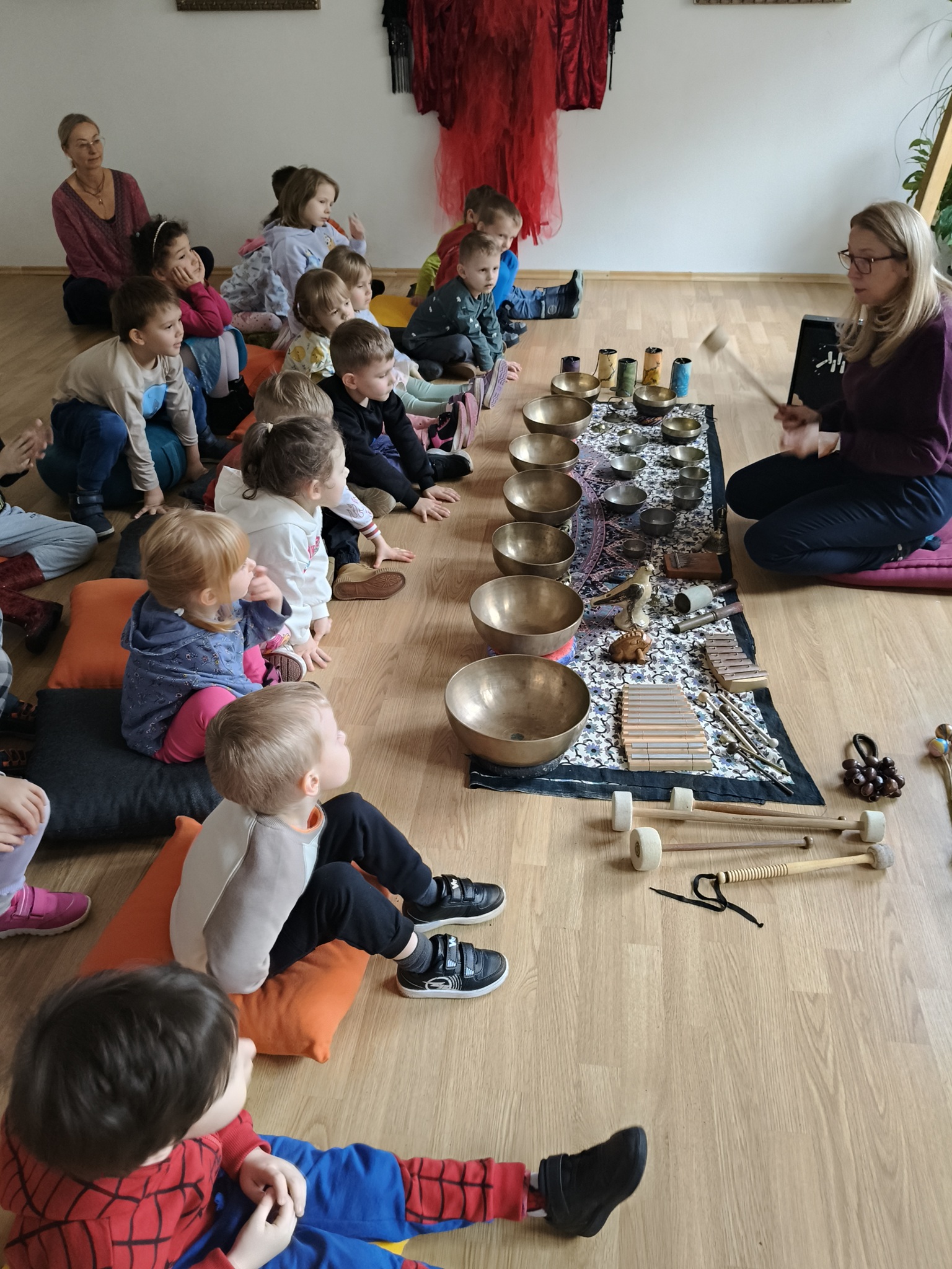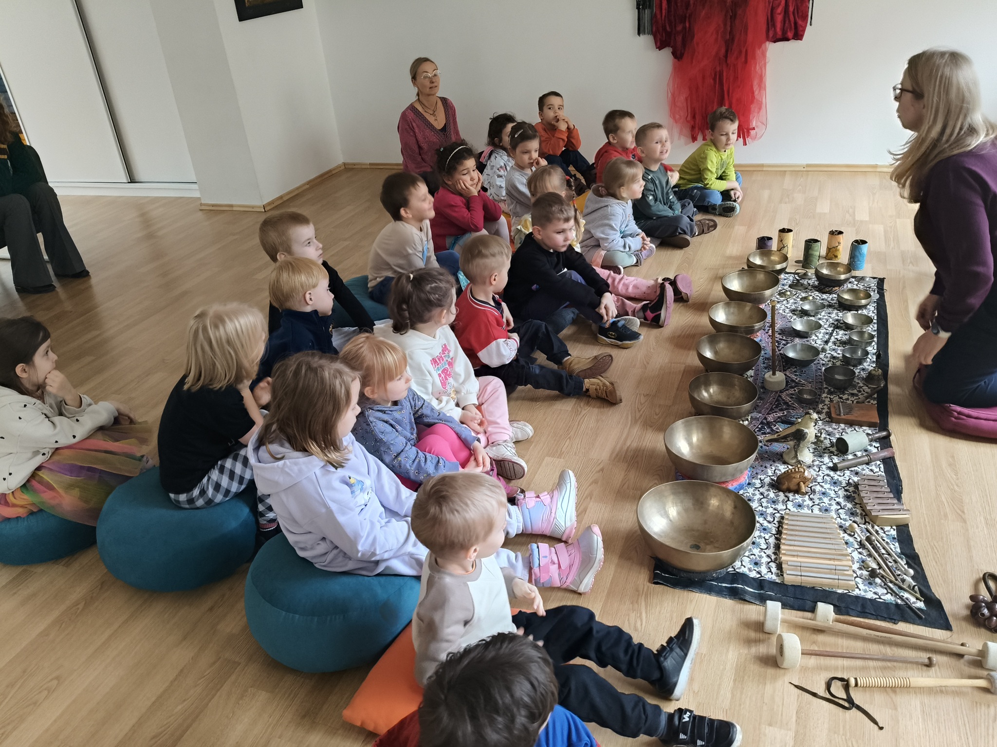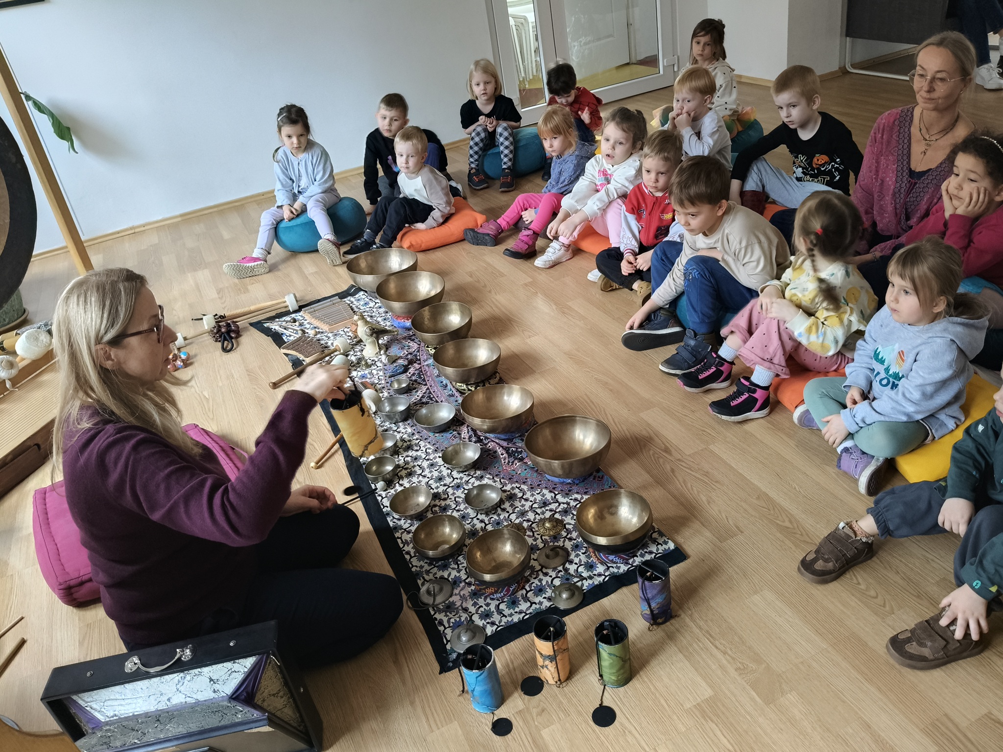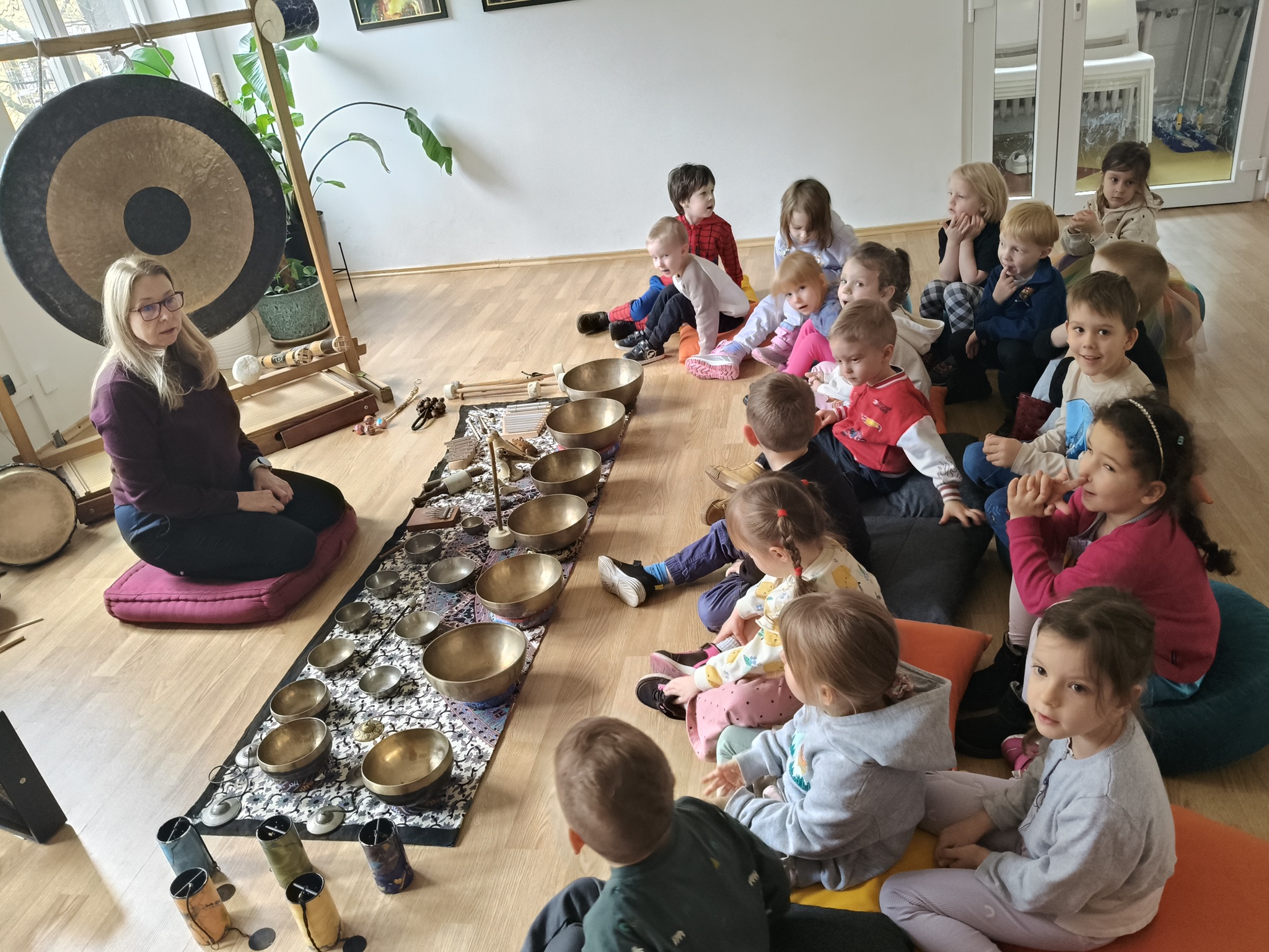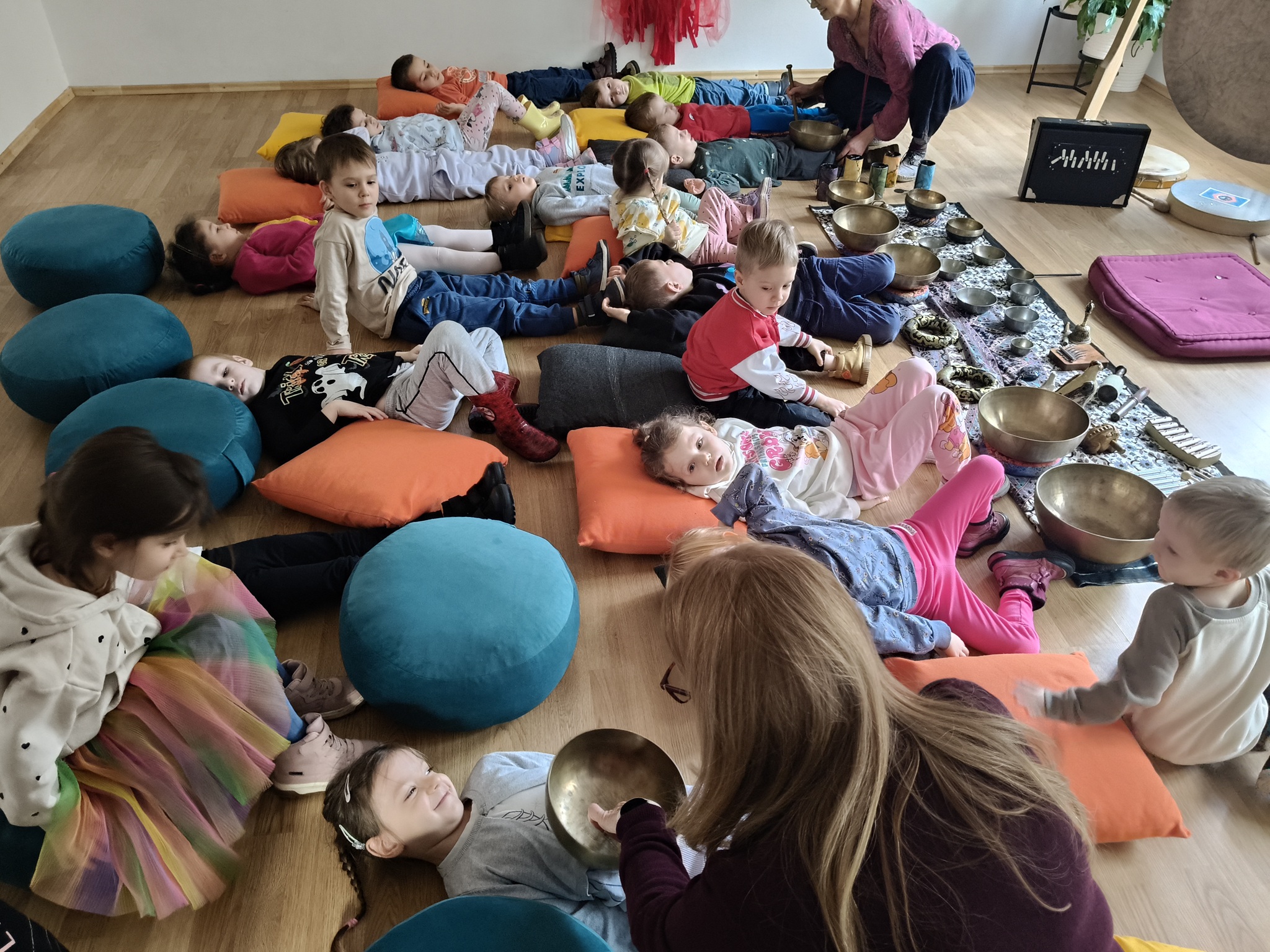 W środę 12 listopada, grupa Smyków uczestniczyła w warsztatach muzycznych „Śpiewające misy – niezwykłe spotkanie z dźwiękiem”. Było to muzyczne wydarzenie oparte na zasadach muzykoterapii, podczas którego wykorzystywano: bębenki, tamburyna, misy dźwiękowe, gongi, dzwonki, kamertony oraz niezwykłe instrumenty jak np. laska deszczowa, puszka burzowa, itp. Zajęcia te zapewniły dzieciom wielozmysłową aktywność, angażując zarówno małą i dużą motorykę, zmysł słuchu, wzroku oraz dotyku. Przez całe zajęcia, dzieci były zainteresowane proponowanymi aktywnościami i zadowolone wróciły do przedszkola.
