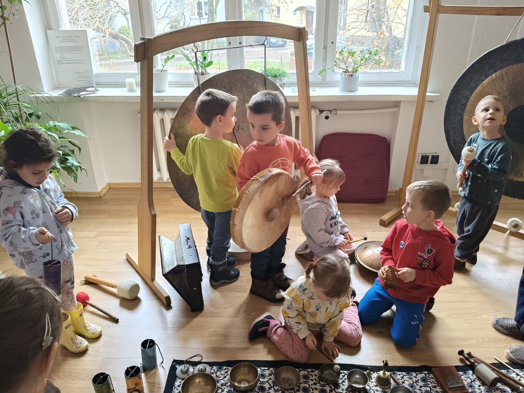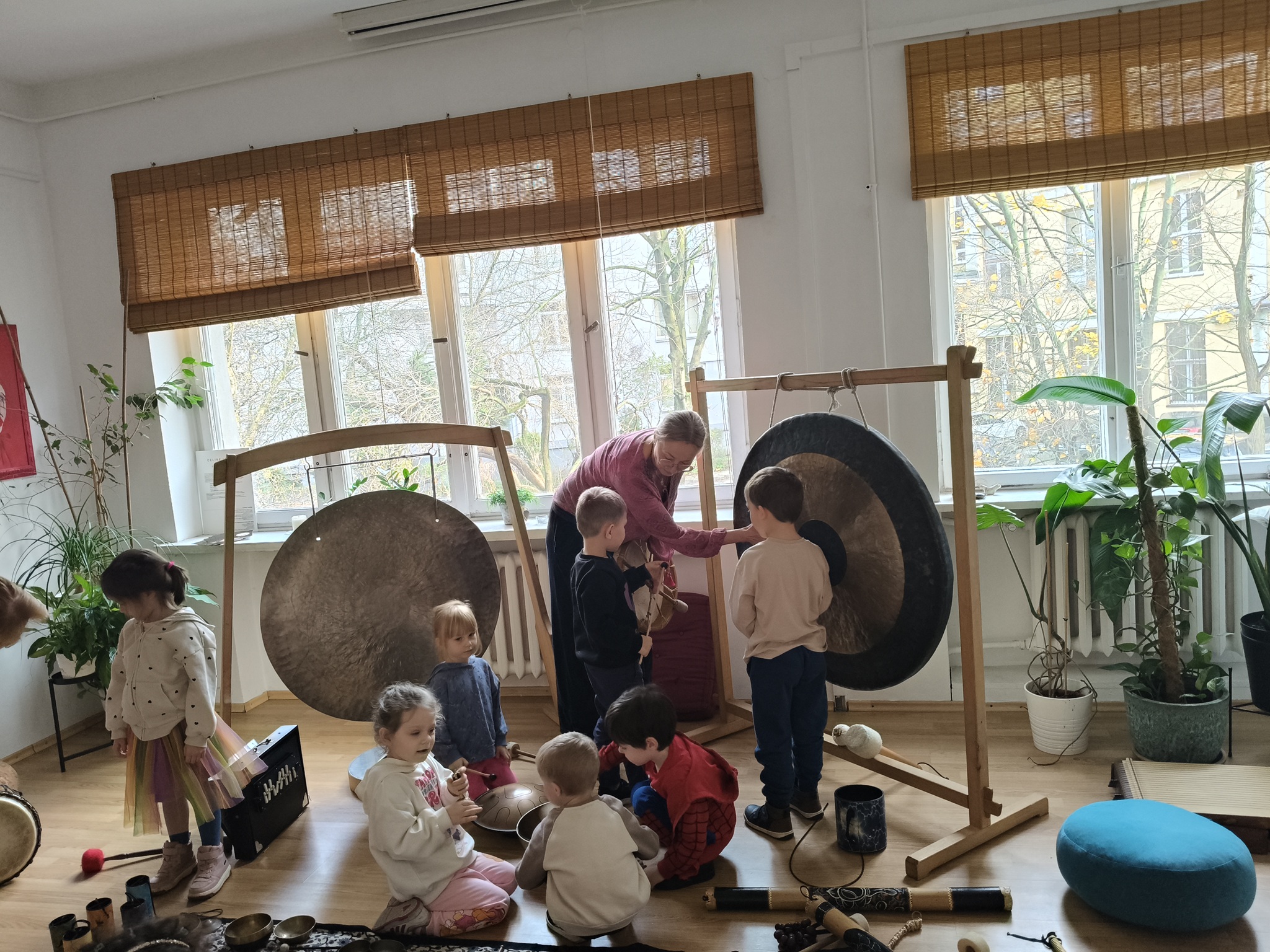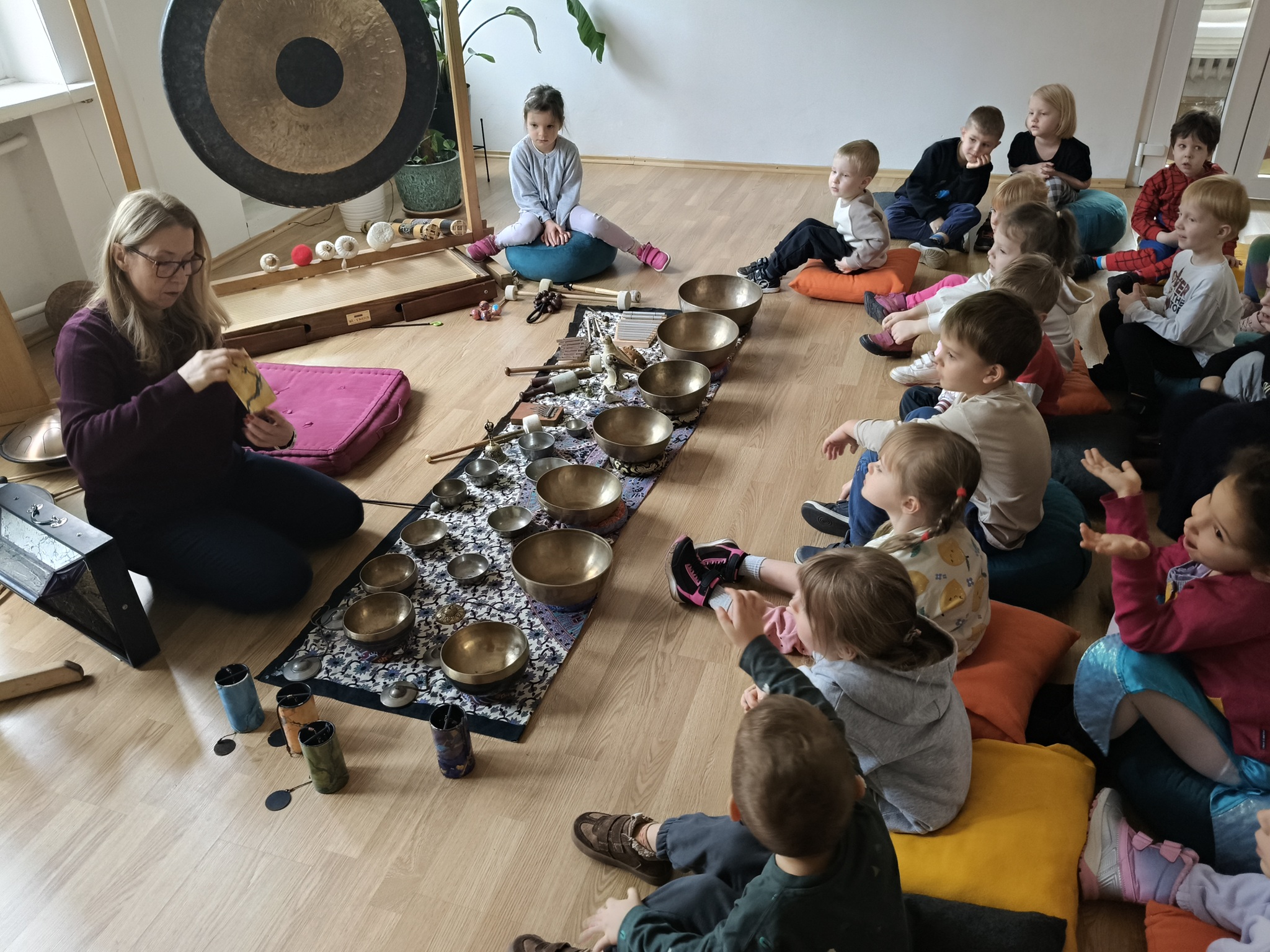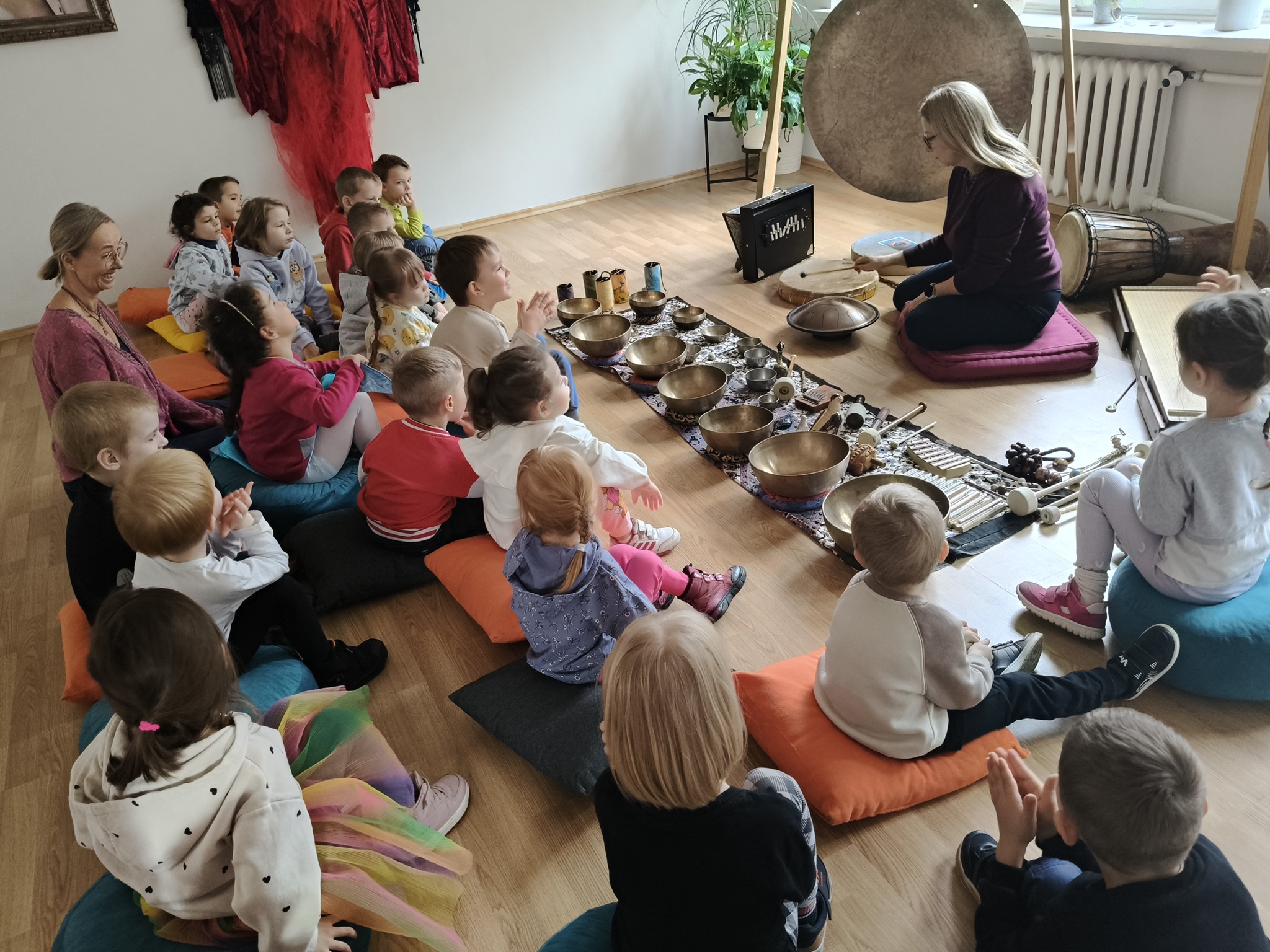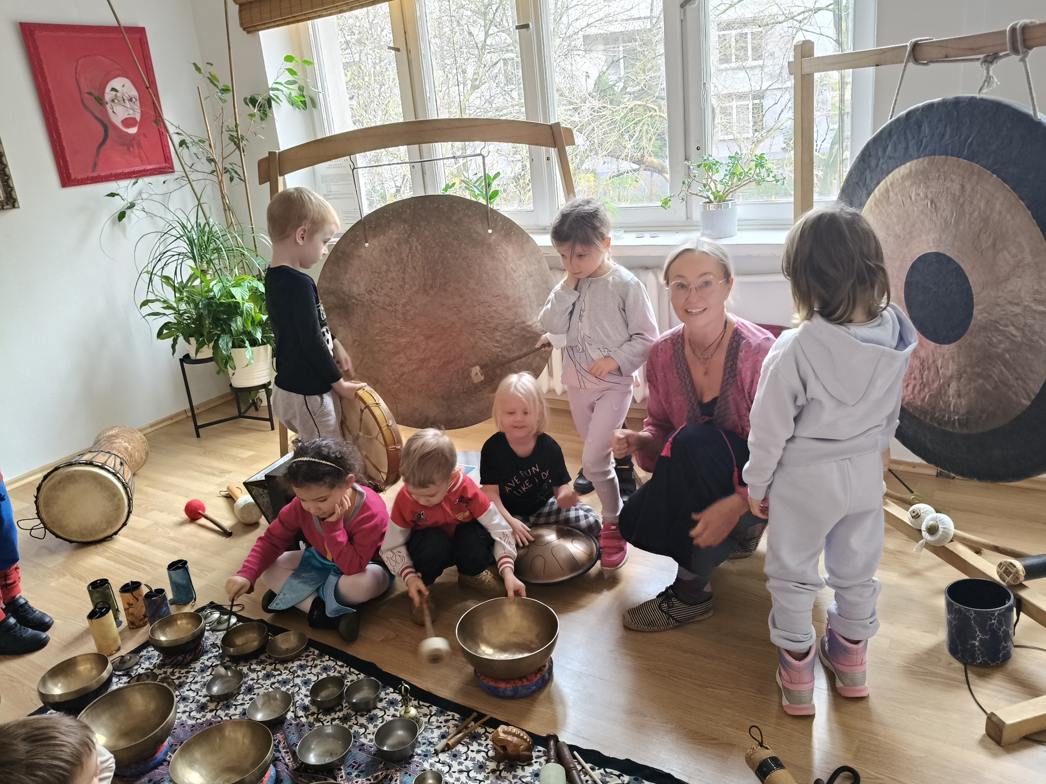W środę 12 listopada, grupa Smyków uczestniczyła w warsztatach muzycznych „Śpiewające misy – niezwykłe spotkanie z dźwiękiem”. Było to muzyczne wydarzenie oparte na zasadach muzykoterapii, podczas którego wykorzystywano: bębenki, tamburyna, misy dźwiękowe, gongi, dzwonki, kamertony oraz niezwykłe instrumenty jak np. laska deszczowa, puszka burzowa, itp. Zajęcia te zapewniły dzieciom wielozmysłową aktywność, angażując zarówno małą i dużą motorykę, zmysł słuchu, wzroku oraz dotyku. Przez całe zajęcia, dzieci były zainteresowane proponowanymi aktywnościami i zadowolone wróciły do przedszkola.