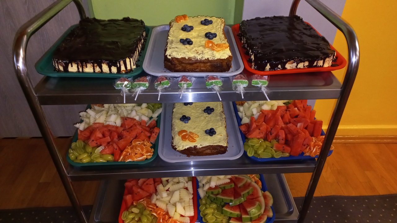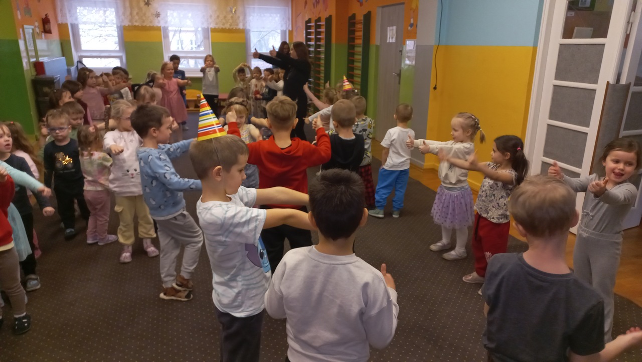 Zebraliśmy się na sali gimnastycznej, aby wspólnie bawić się i świętować. Pani Dyrektor złożyła piękne życzenia wszystkim Solenizantom- tym młodziutkim i tym troszkę starszym, a następnie wszyscy obecni zaśpiewali głośne, radosne „Sto lat”!!! W trakcie imprezy dzieci wzięły udział w konkursach, quizach, a przede wszystkim w zabawach, pląsach i tańcach!!! Nie mogło oczywiście zabraknąć sesji fotograficznej na tle urodzinowej dekoracji oraz pysznego, owocowego drugiego śniadania!