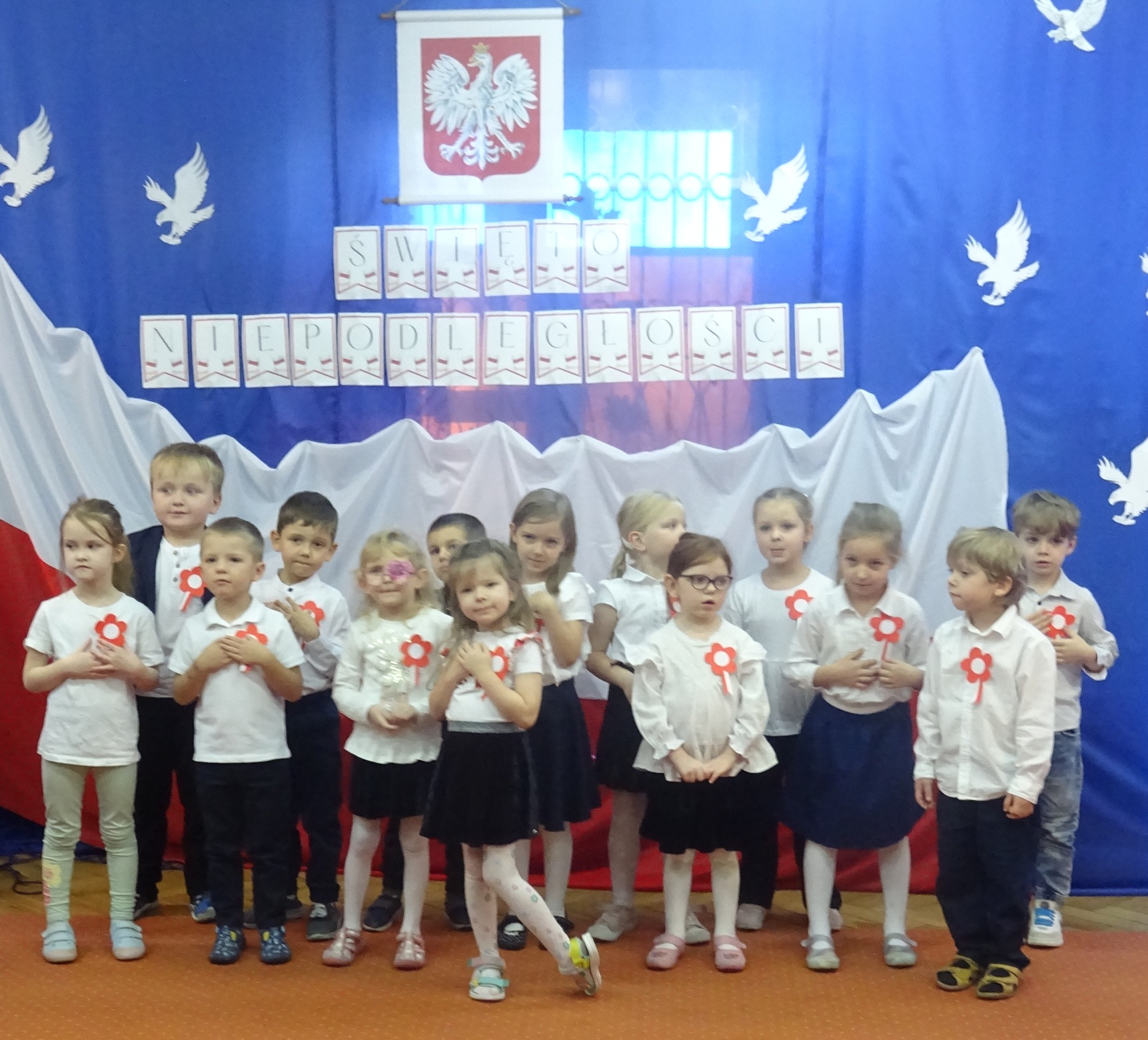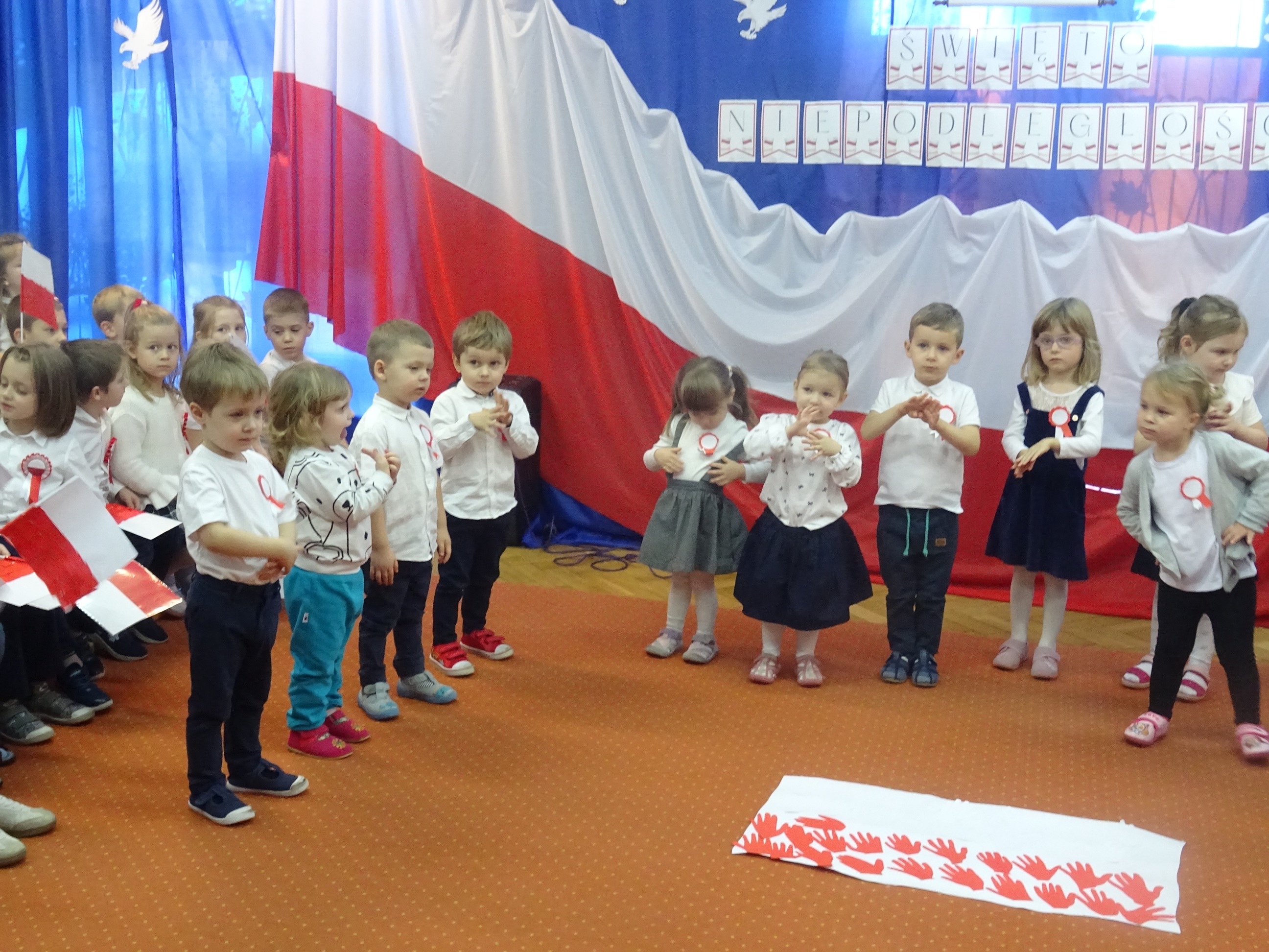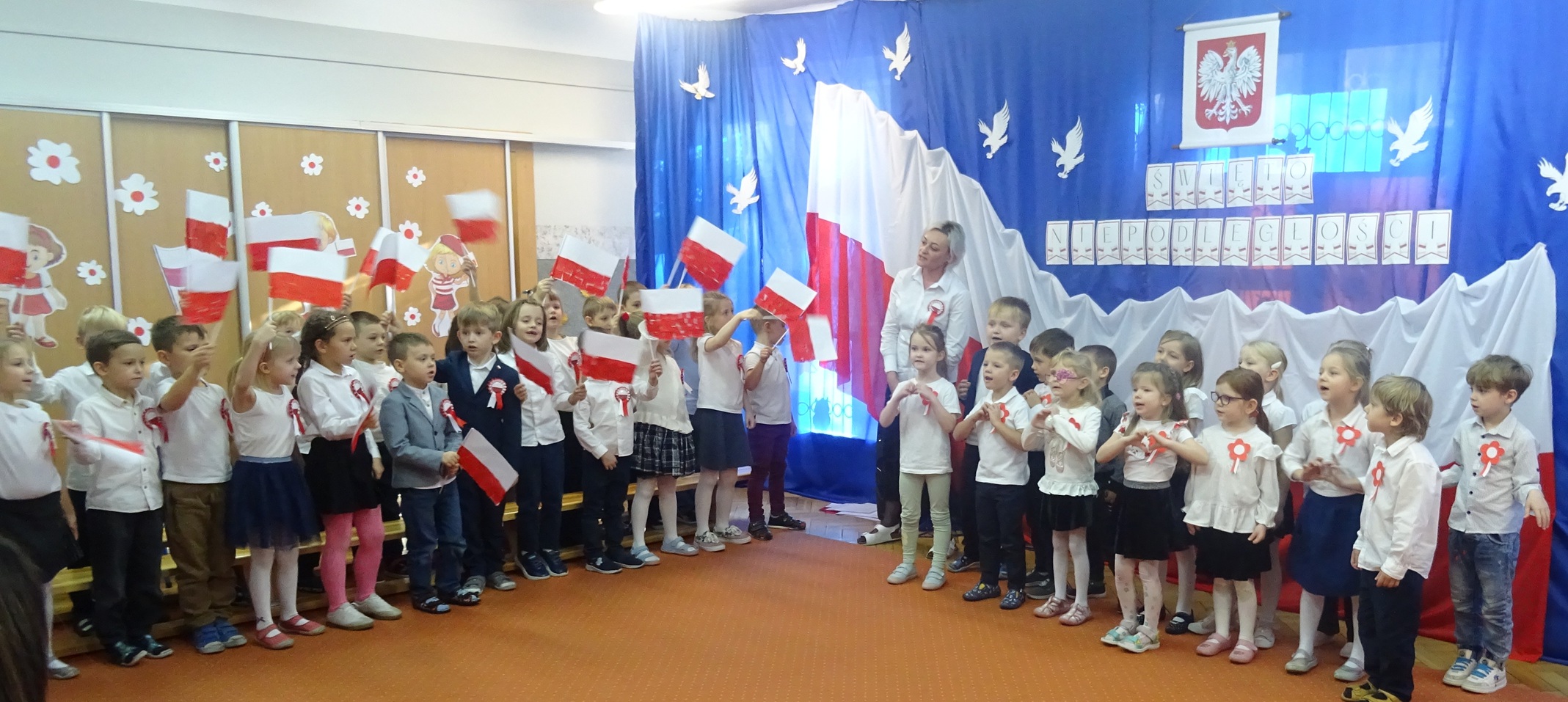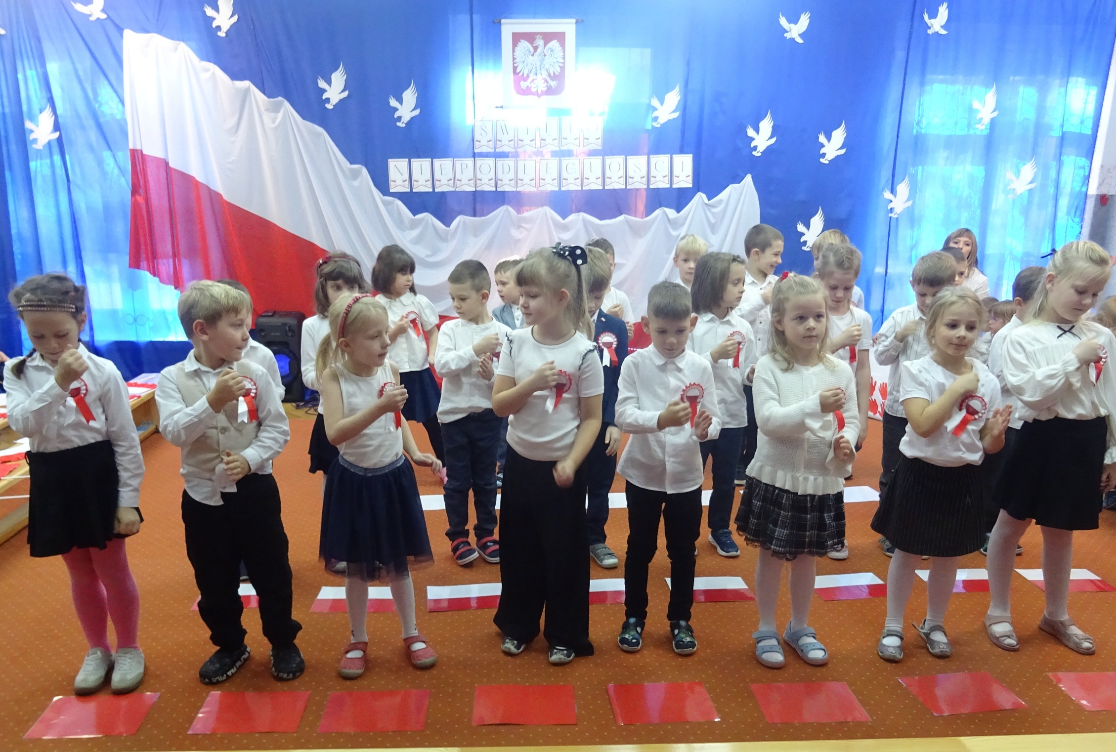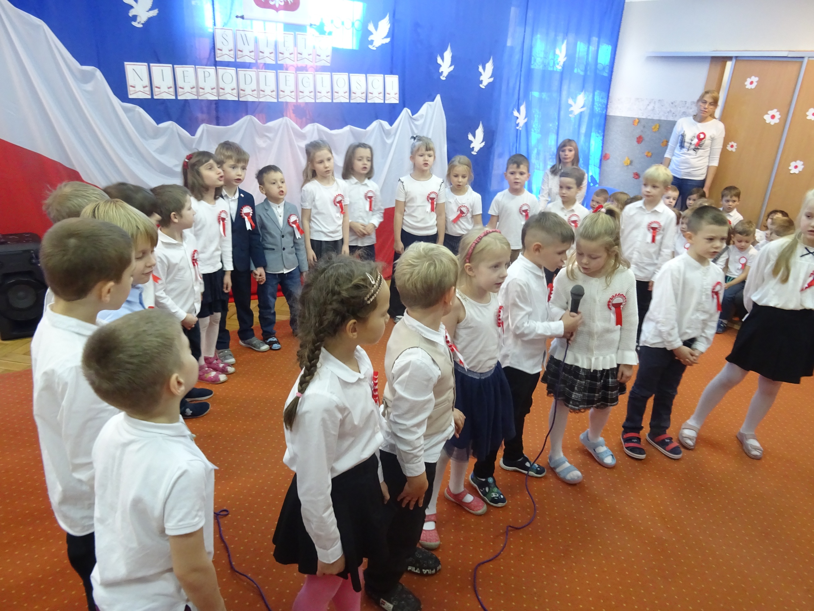 O godz. 11.00 pracownicy przedszkola oraz dzieci odśpiewały Hymn Polski pt. „Mazurek Dąbrowskiego” pamiętając o odpowiedniej postawie. Przedszkolaki wspólnie wyrecytowali wiersz pt. „Katechizm polskiego dziecka" Władysława Bełzy. Następnie dzieci z młodszych grup wysłuchały piosenki patriotycznej w wykonaniu Juniorów pt. „Biały orzeł” oraz obejrzały układ taneczny do utworu "Od morza, aż do Tatr". W dalszej części apelu grupa Tuptusiów zaprezentowała piosenkę pt. „Polak mały”, Smyki „Polak mały, piosenka na 11 listopada”. Występ zakończyła grupa Żaczków piękną piosenką patriotyczną pt. „Piosenka na święto niepodległości”.