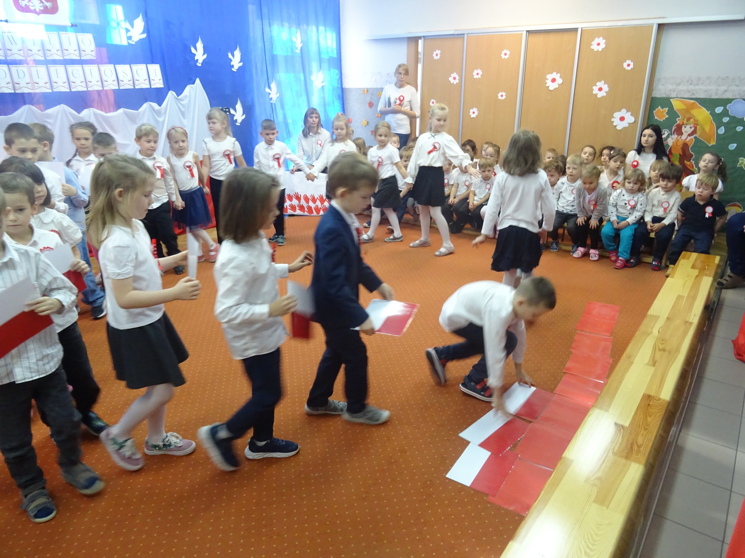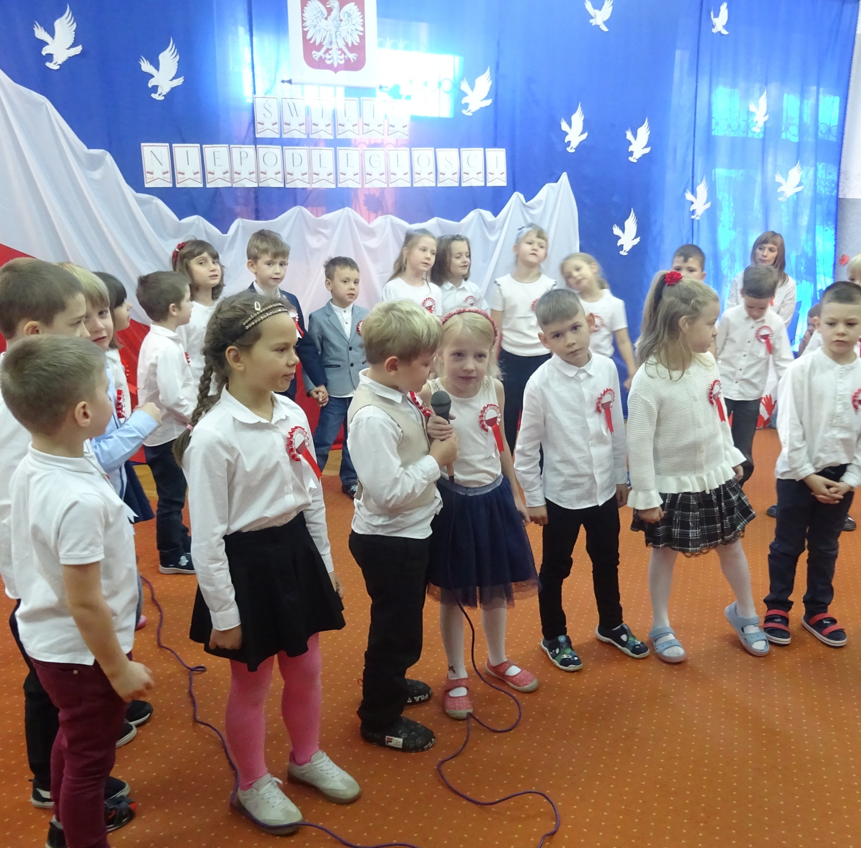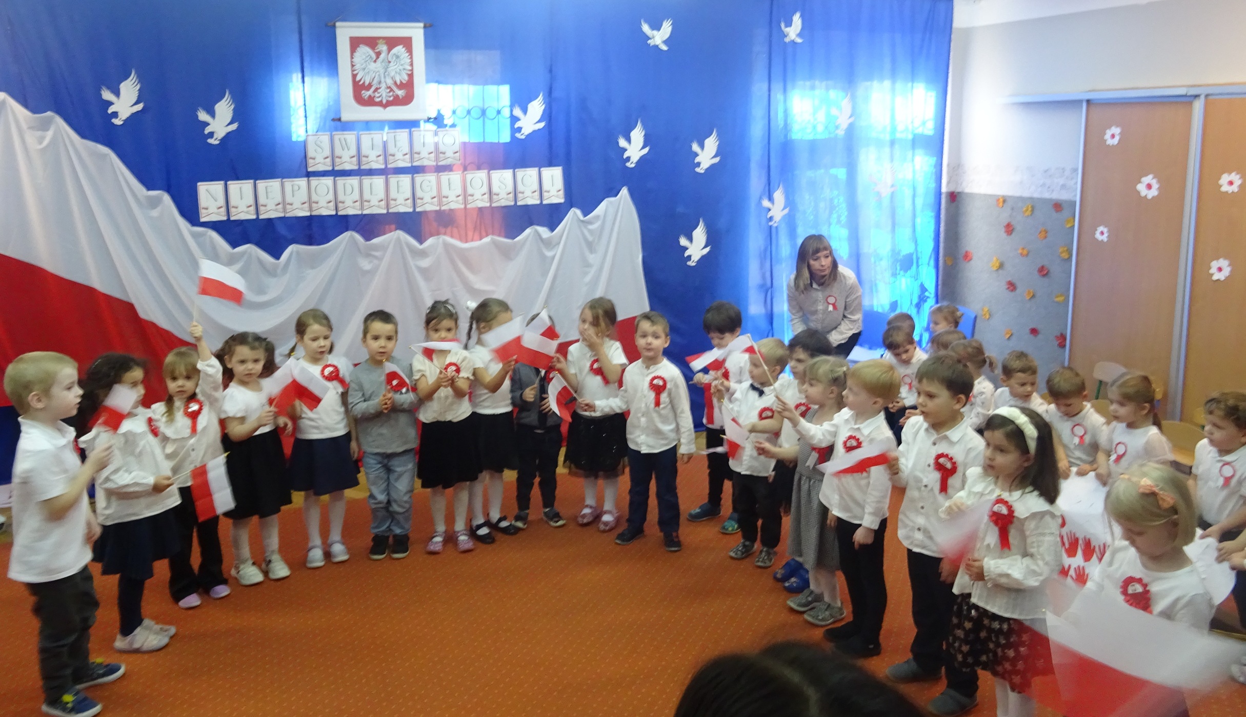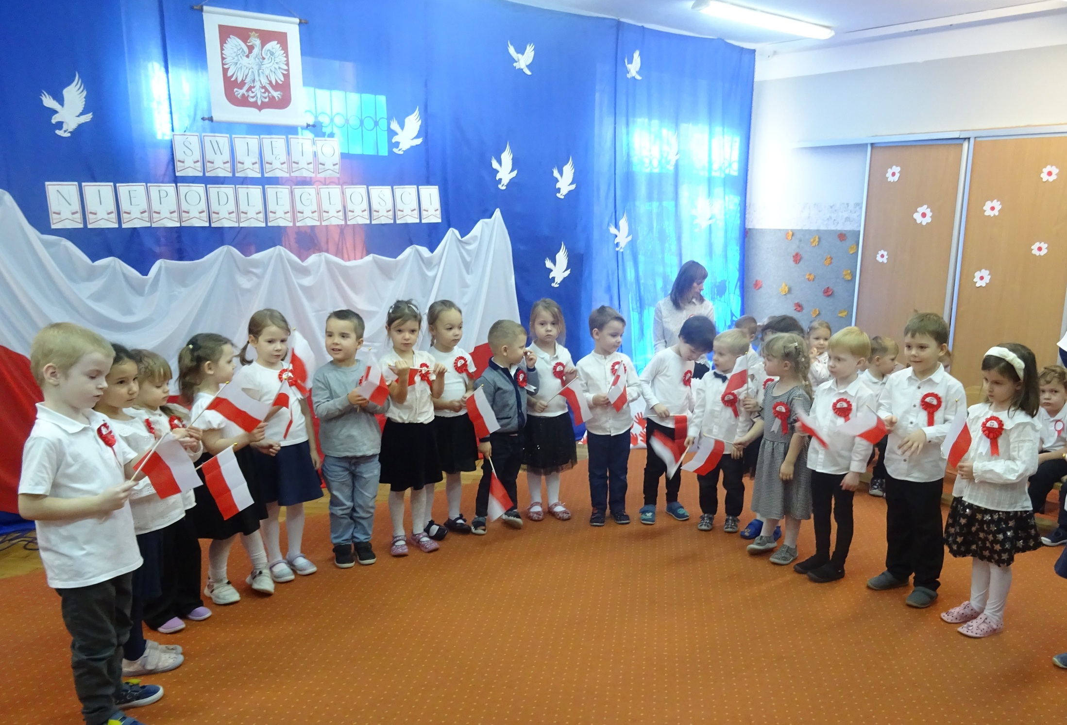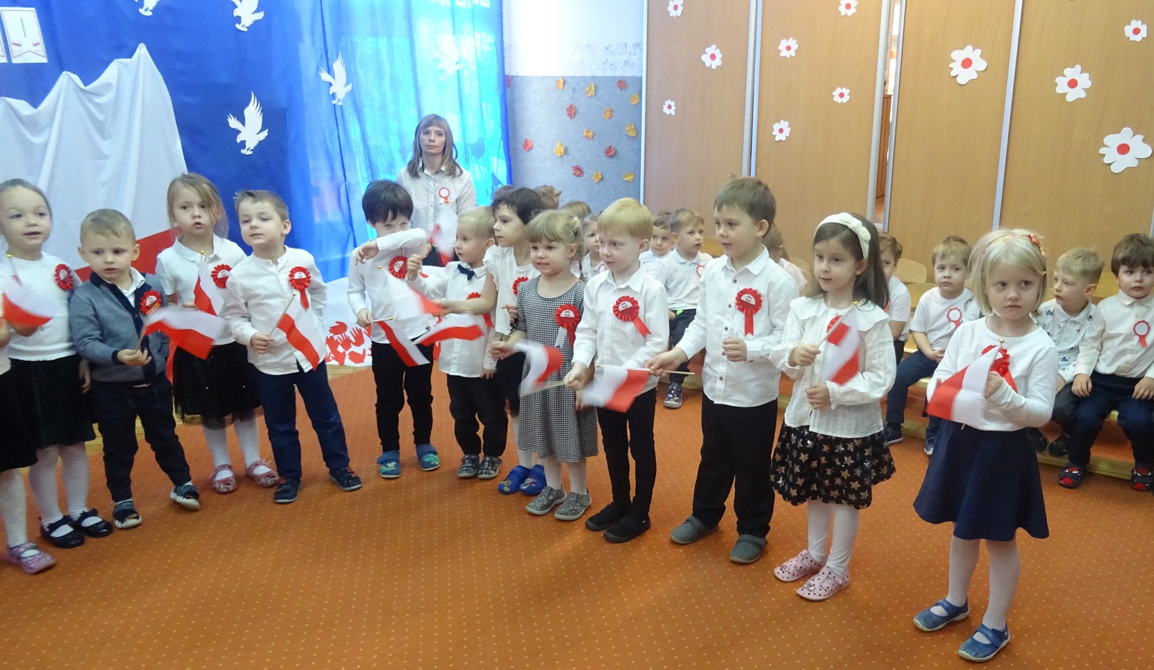 O godz. 11.00 pracownicy przedszkola oraz dzieci odśpiewały Hymn Polski pt. „Mazurek Dąbrowskiego” pamiętając o odpowiedniej postawie. Przedszkolaki wspólnie wyrecytowali wiersz pt. „Katechizm polskiego dziecka" Władysława Bełzy. Następnie dzieci z młodszych grup wysłuchały piosenki patriotycznej w wykonaniu Juniorów pt. „Biały orzeł” oraz obejrzały układ taneczny do utworu "Od morza, aż do Tatr". W dalszej części apelu grupa Tuptusiów zaprezentowała piosenkę pt. „Polak mały”, Smyki „Polak mały, piosenka na 11 listopada”. Występ zakończyła grupa Żaczków piękną piosenką patriotyczną pt. „Piosenka na święto niepodległości”.
