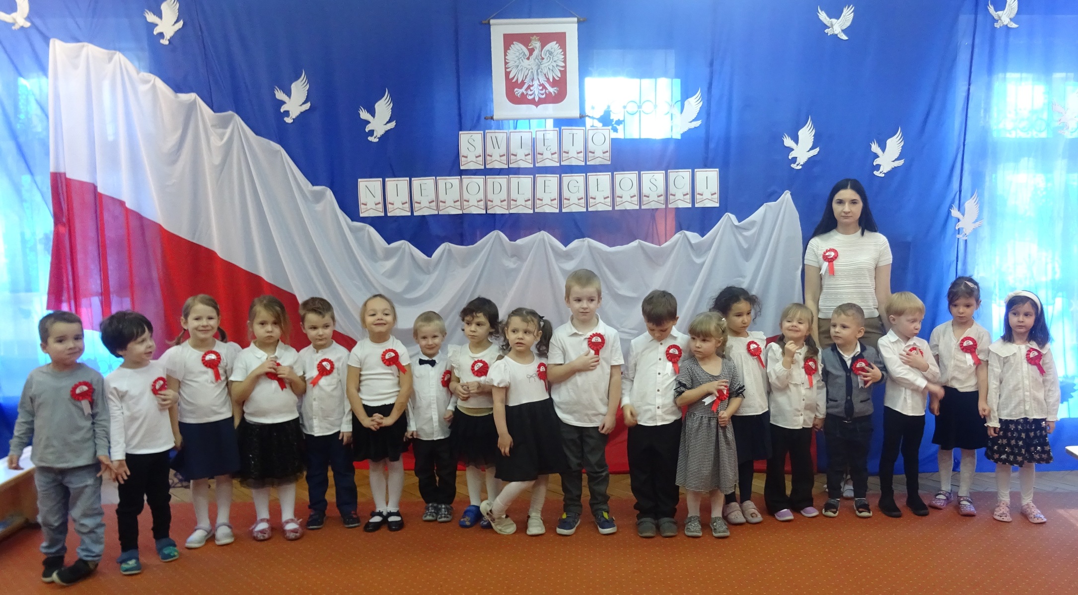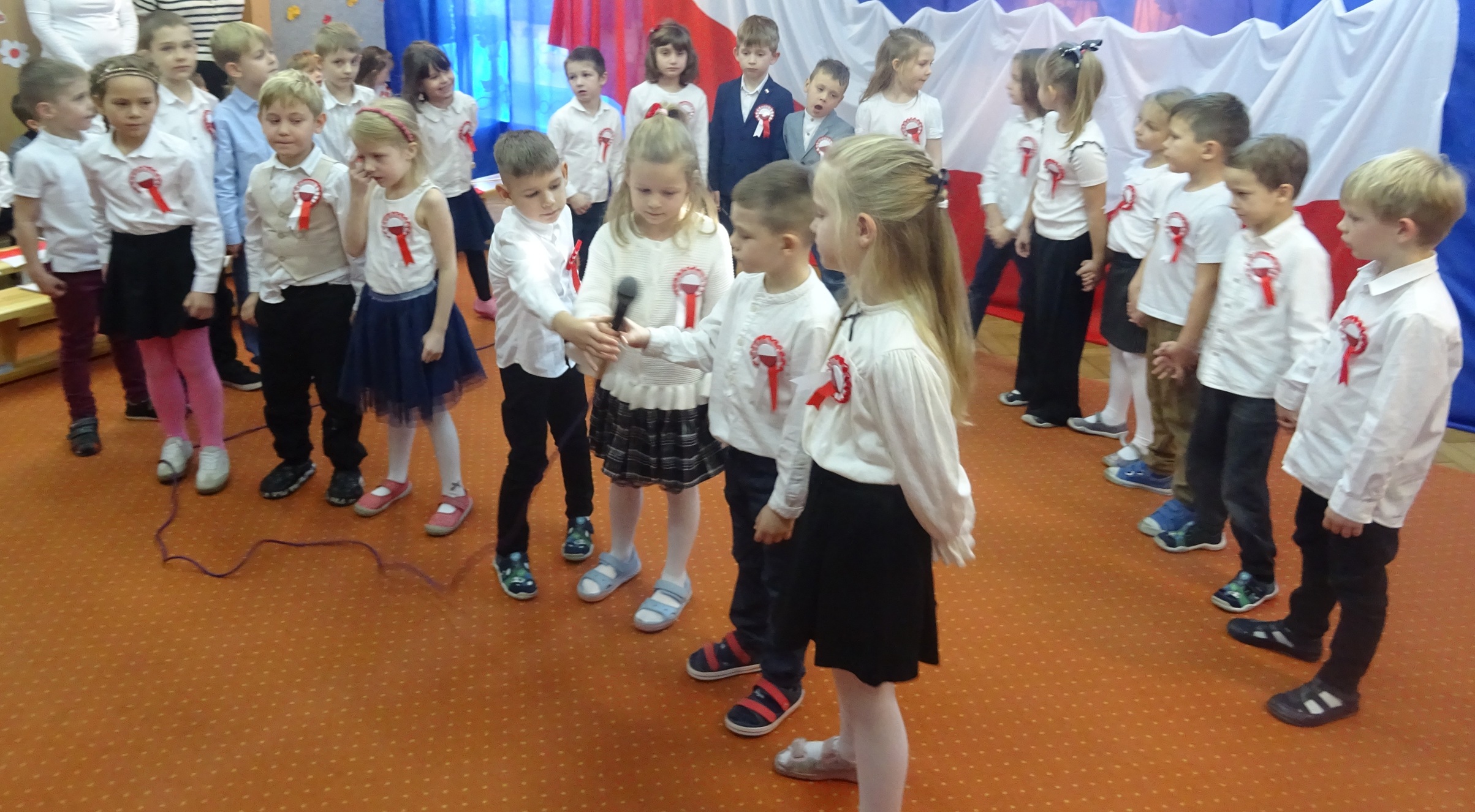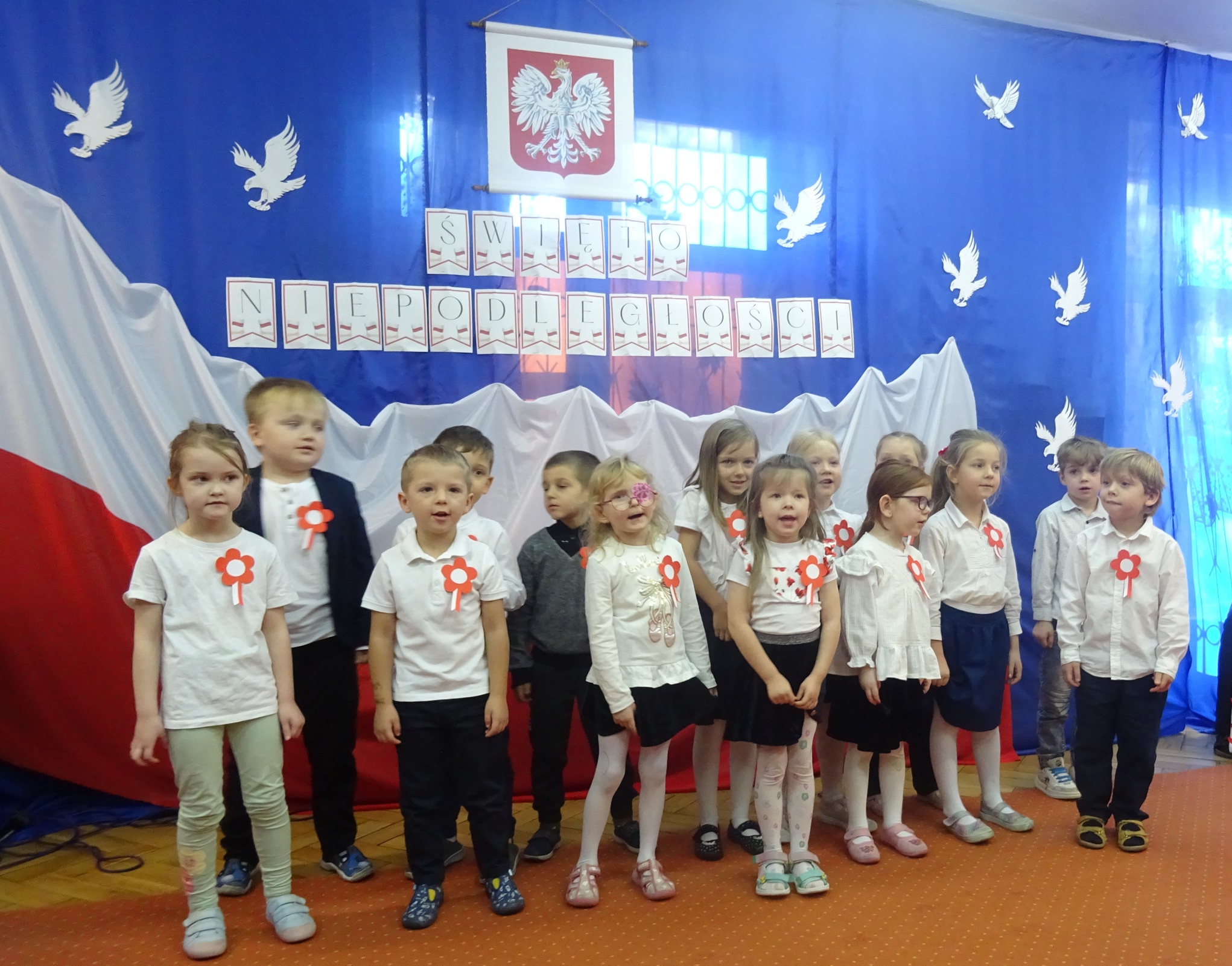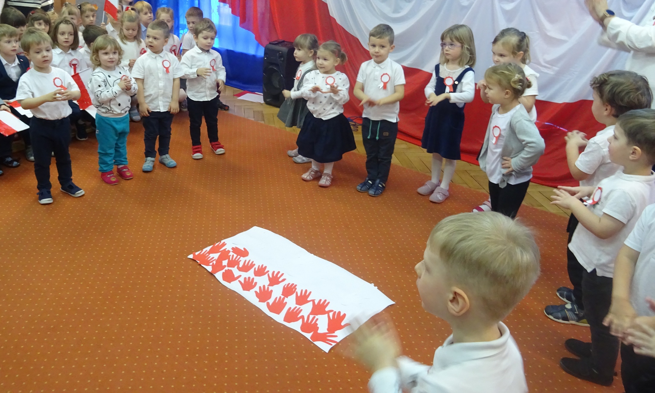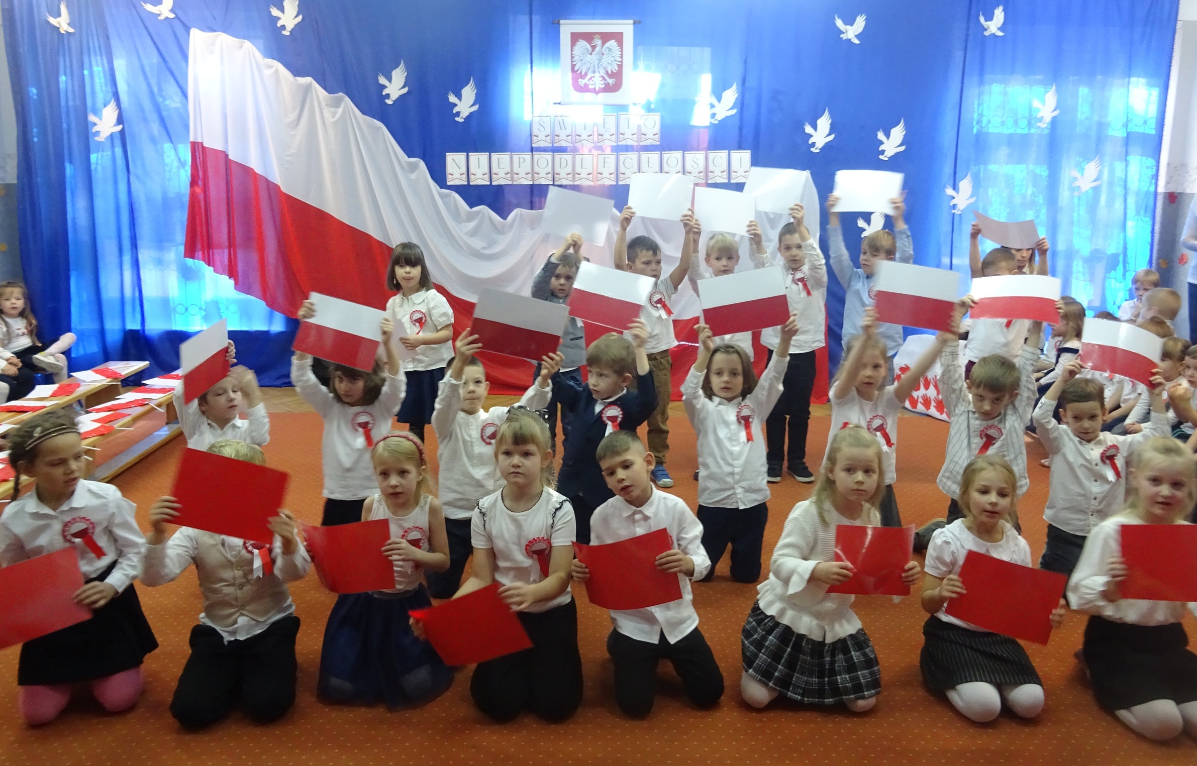 O godz. 11.00 pracownicy przedszkola oraz dzieci odśpiewały Hymn Polski pt. „Mazurek Dąbrowskiego” pamiętając o odpowiedniej postawie. Przedszkolaki wspólnie wyrecytowali wiersz pt. „Katechizm polskiego dziecka" Władysława Bełzy. Następnie dzieci z młodszych grup wysłuchały piosenki patriotycznej w wykonaniu Juniorów pt. „Biały orzeł” oraz obejrzały układ taneczny do utworu "Od morza, aż do Tatr". W dalszej części apelu grupa Tuptusiów zaprezentowała piosenkę pt. „Polak mały”, Smyki „Polak mały, piosenka na 11 listopada”. Występ zakończyła grupa Żaczków piękną piosenką patriotyczną pt. „Piosenka na święto niepodległości”.