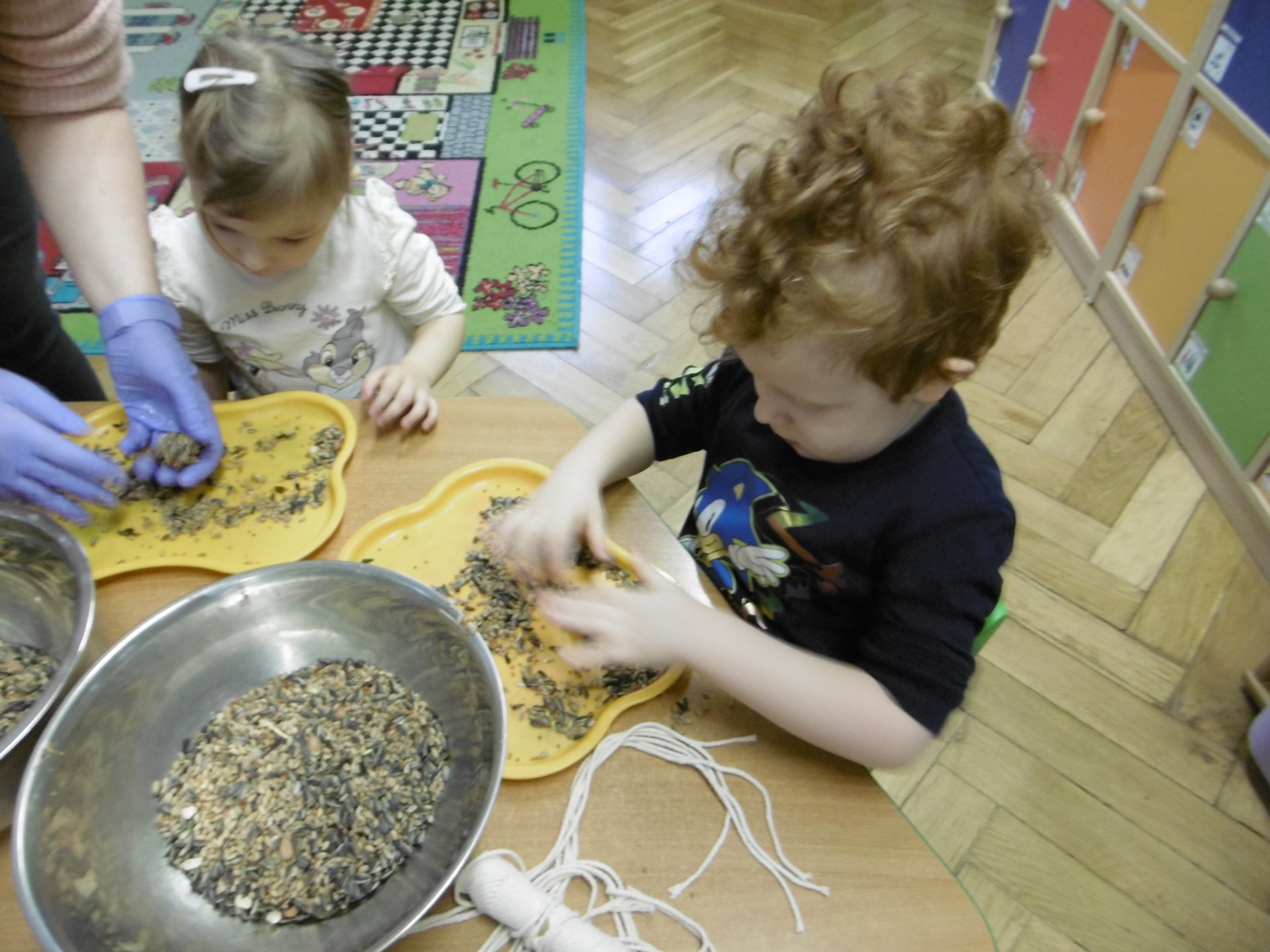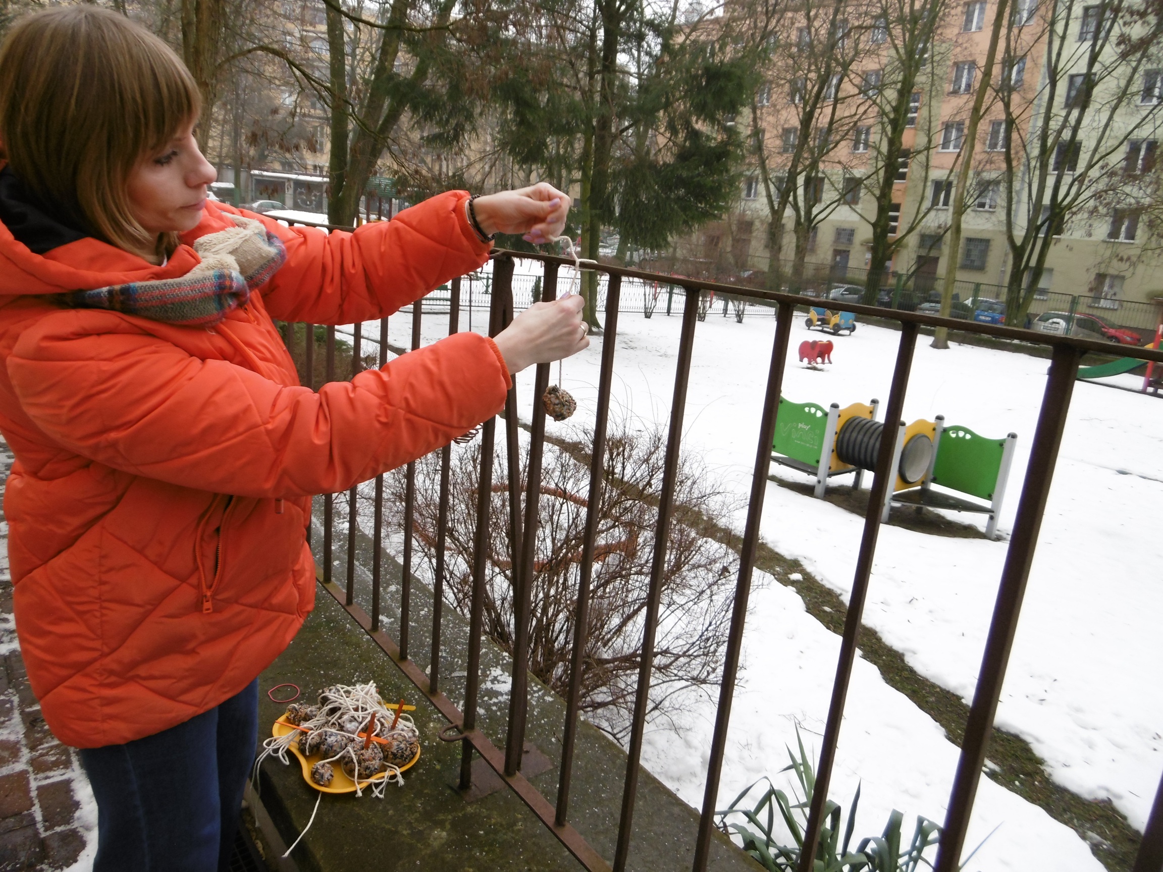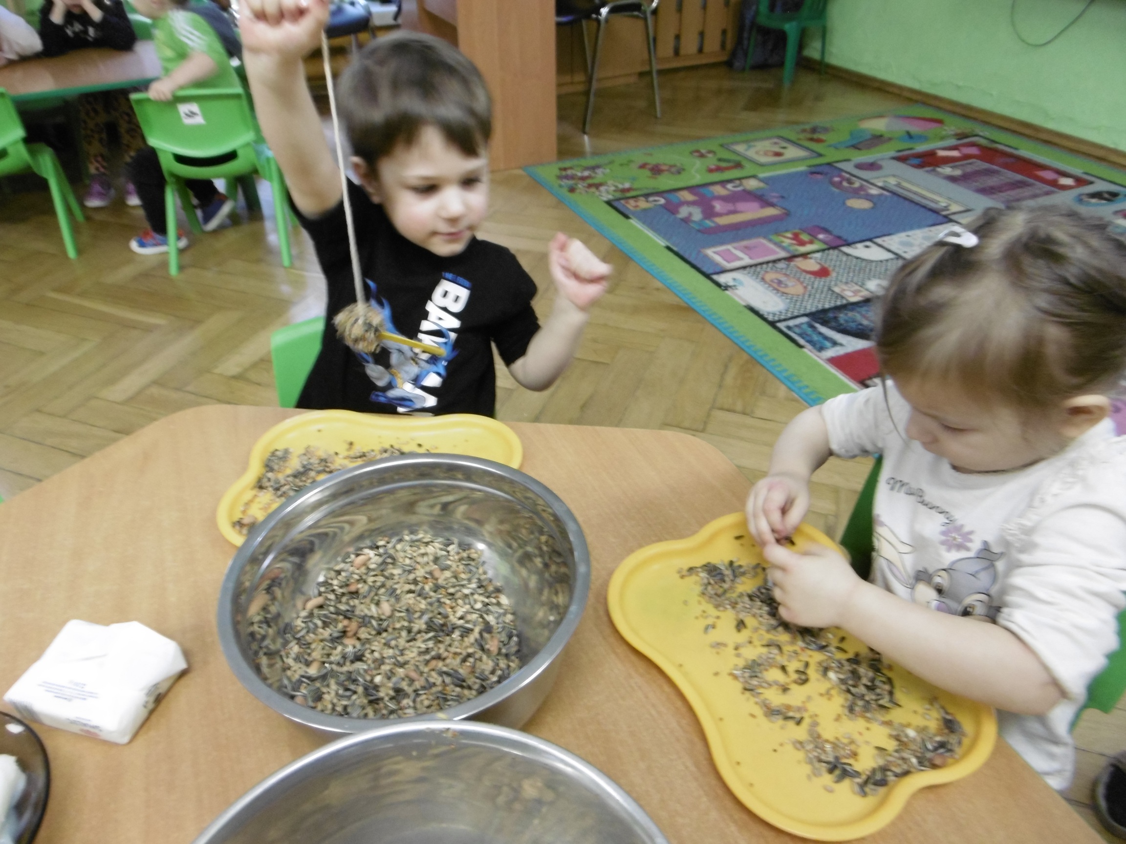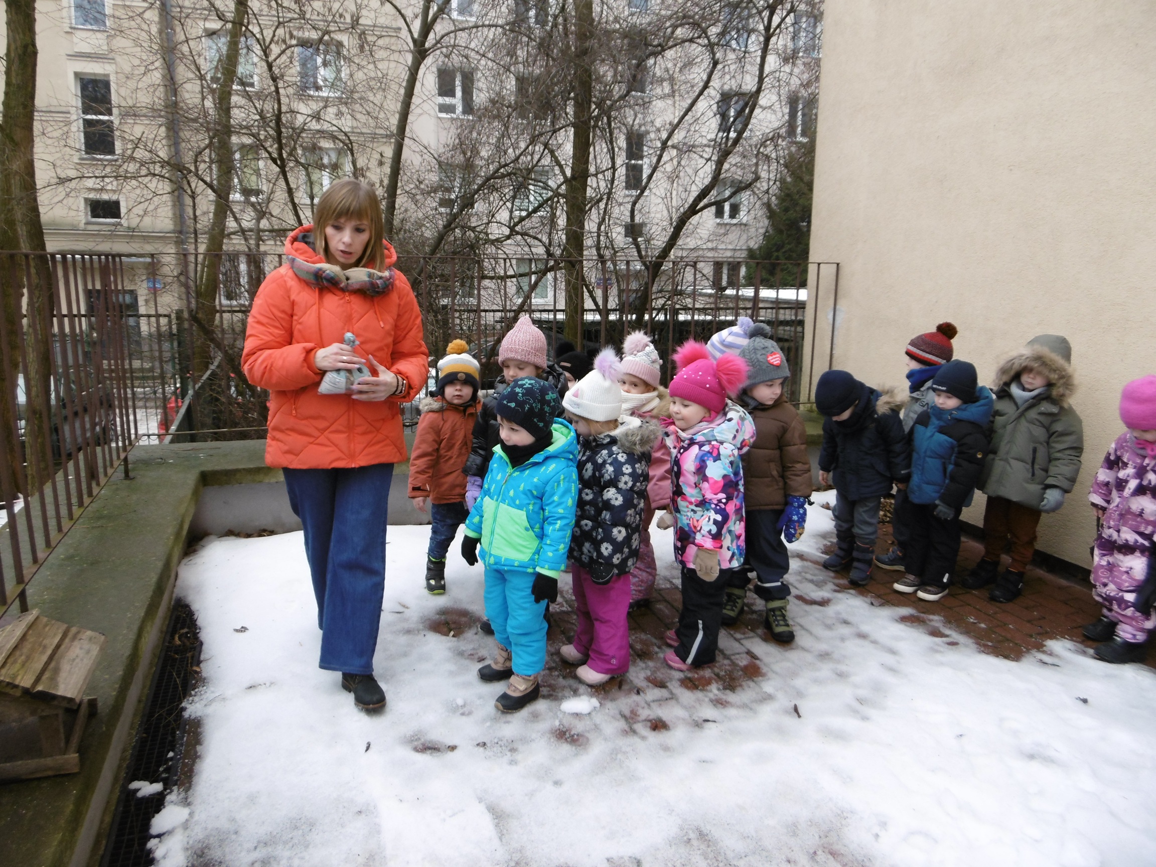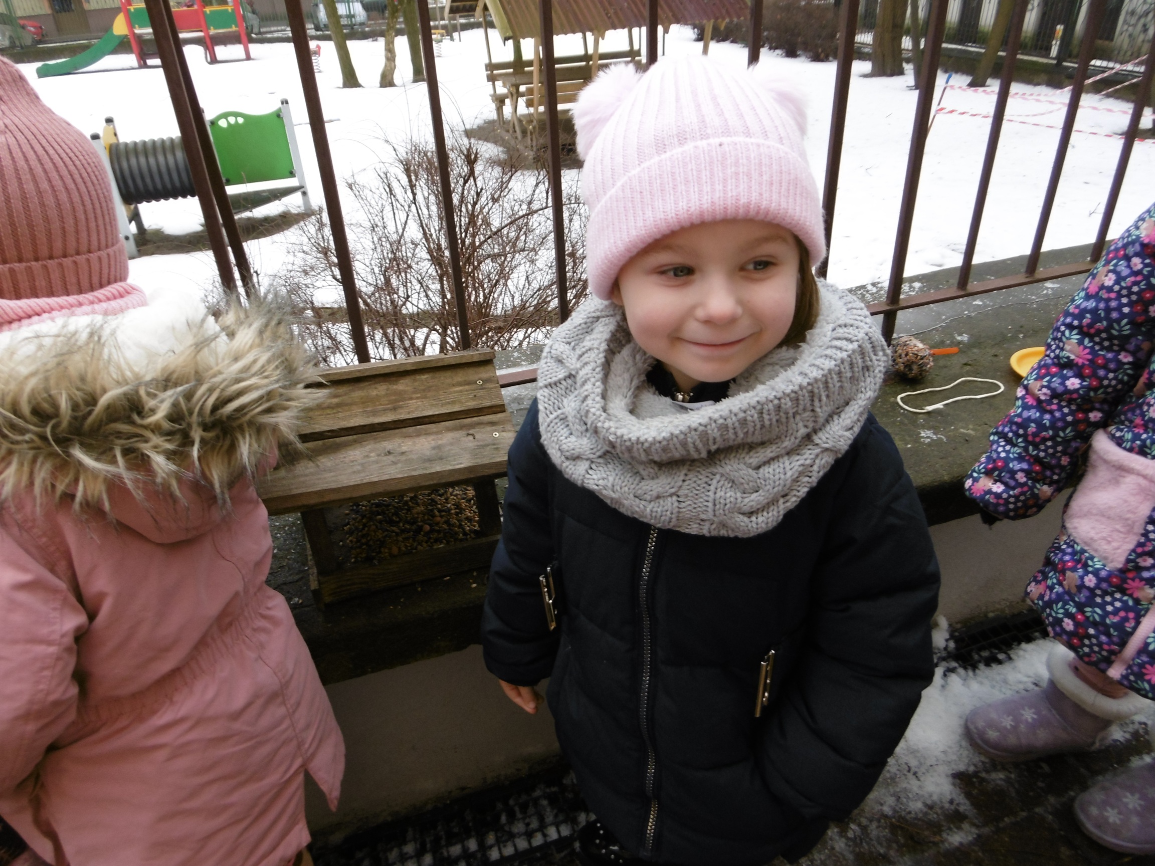 W ostatnich dniach Tuptusie rozmawiały o potrzebie dokarmiania ptaków. Dzieci zwróciły uwagę na ilość śniegu za oknem oraz trudność zwierząt w znalezieniu pożywienia w takich warunkach. W związku z tym postanowiliśmy zadbać o odwiedzające naszą okolicę ptaki. Dzieci własnoręcznie przygotowały kule z pokarmem dla ptaszków, a następnie wybrały się na przedszkolny taras, aby je zawiesić. Nasze Tuptusie wysypały także ziarenka w karmniku, który znajduje się za naszymi oknami. W trakcie spaceru przedszkolaki szukały również śladów pozostawionych przez ptaki na śniegu. Mamy nadzieję, że już niedługo pojawią się pierwsi goście na naszej ptasiej stołówce.