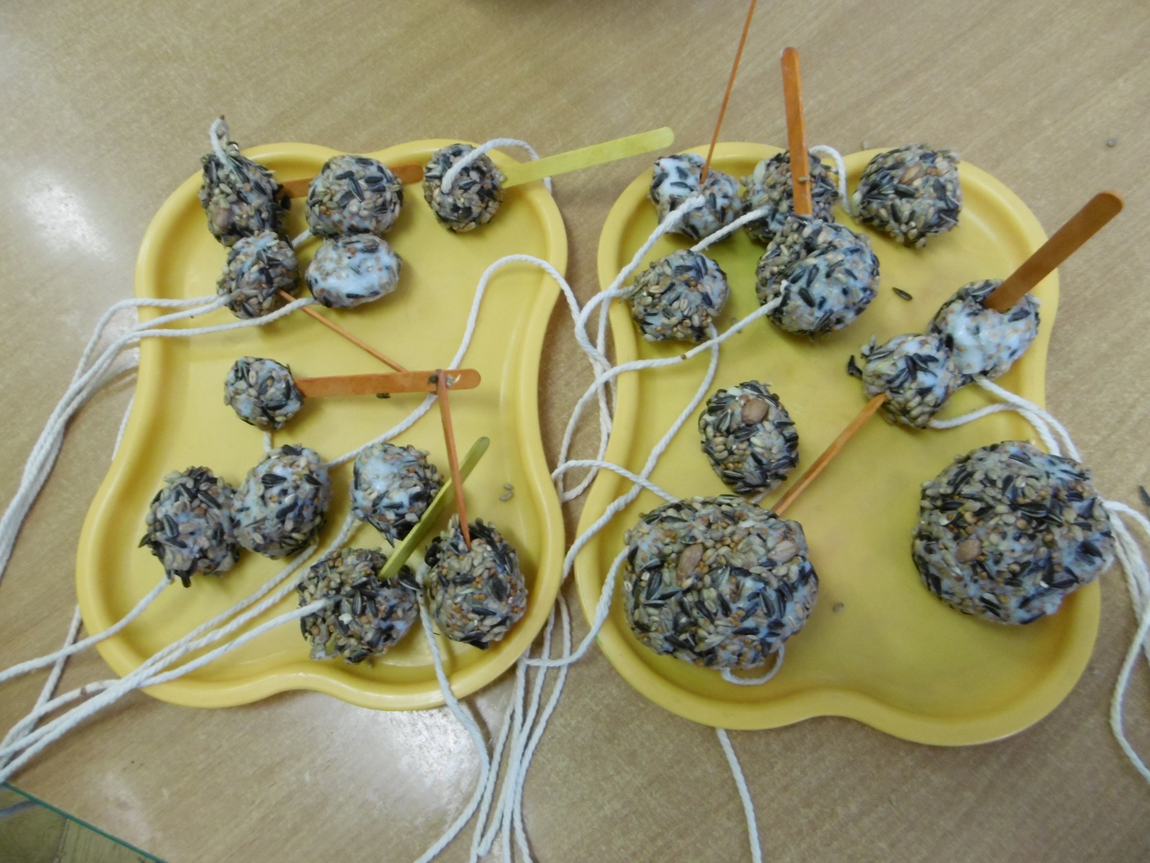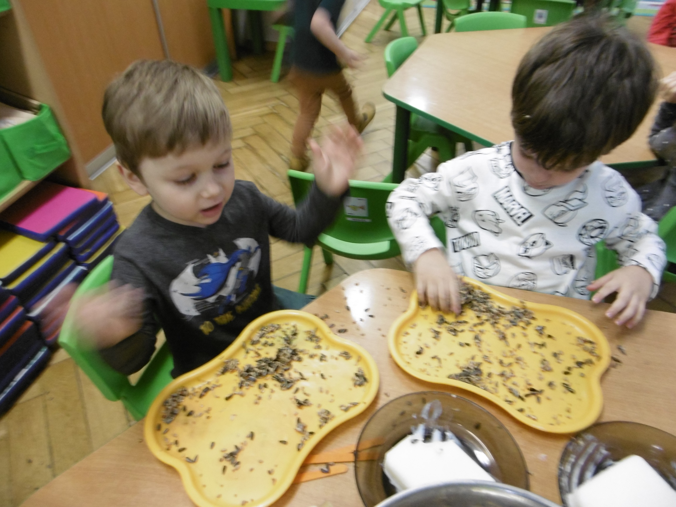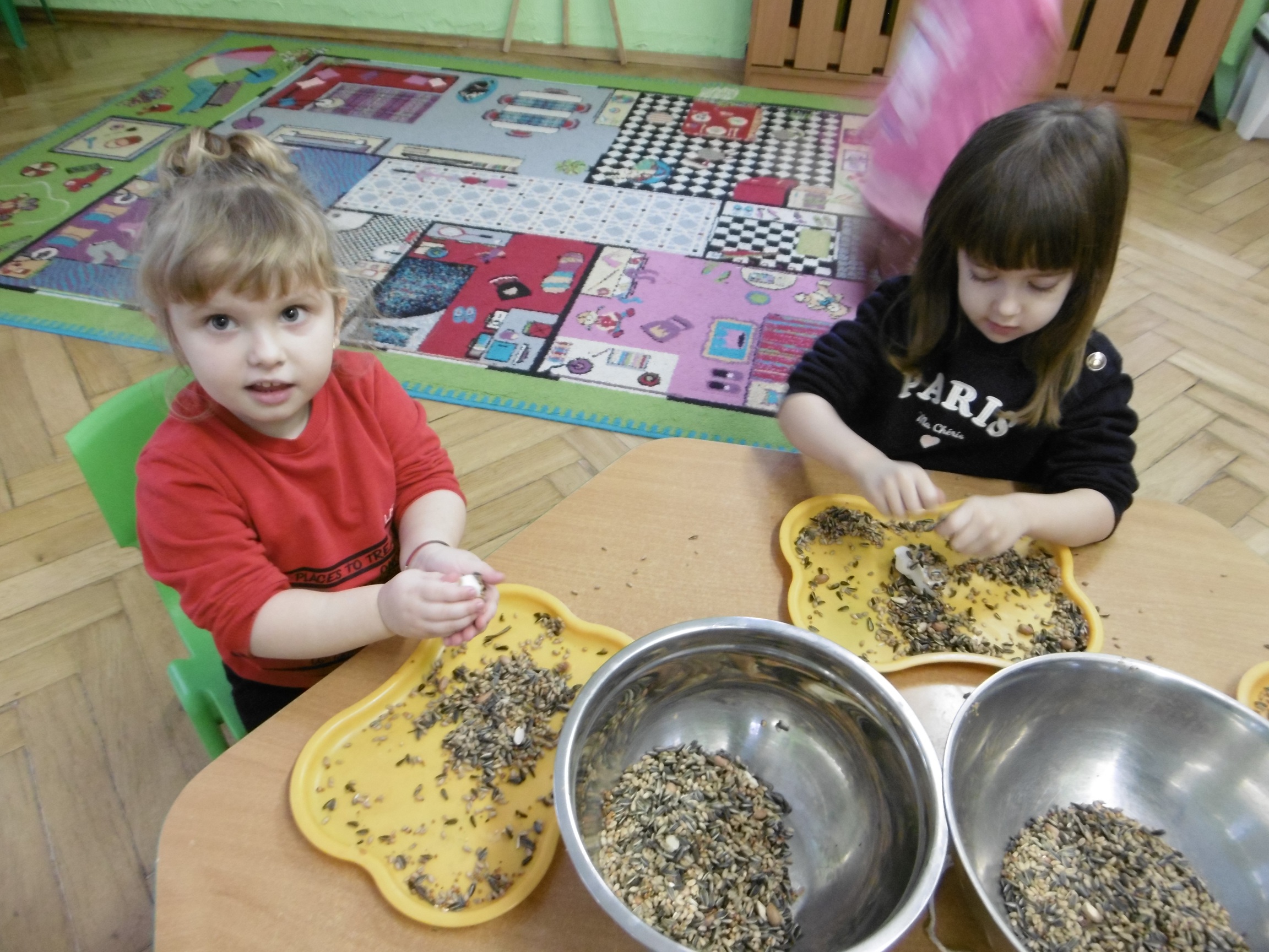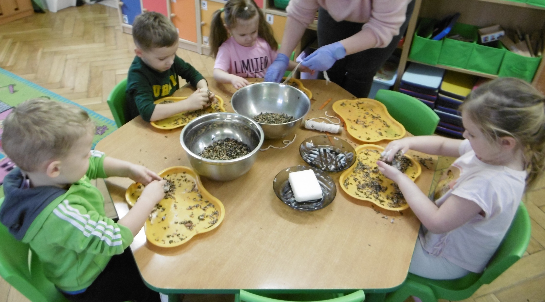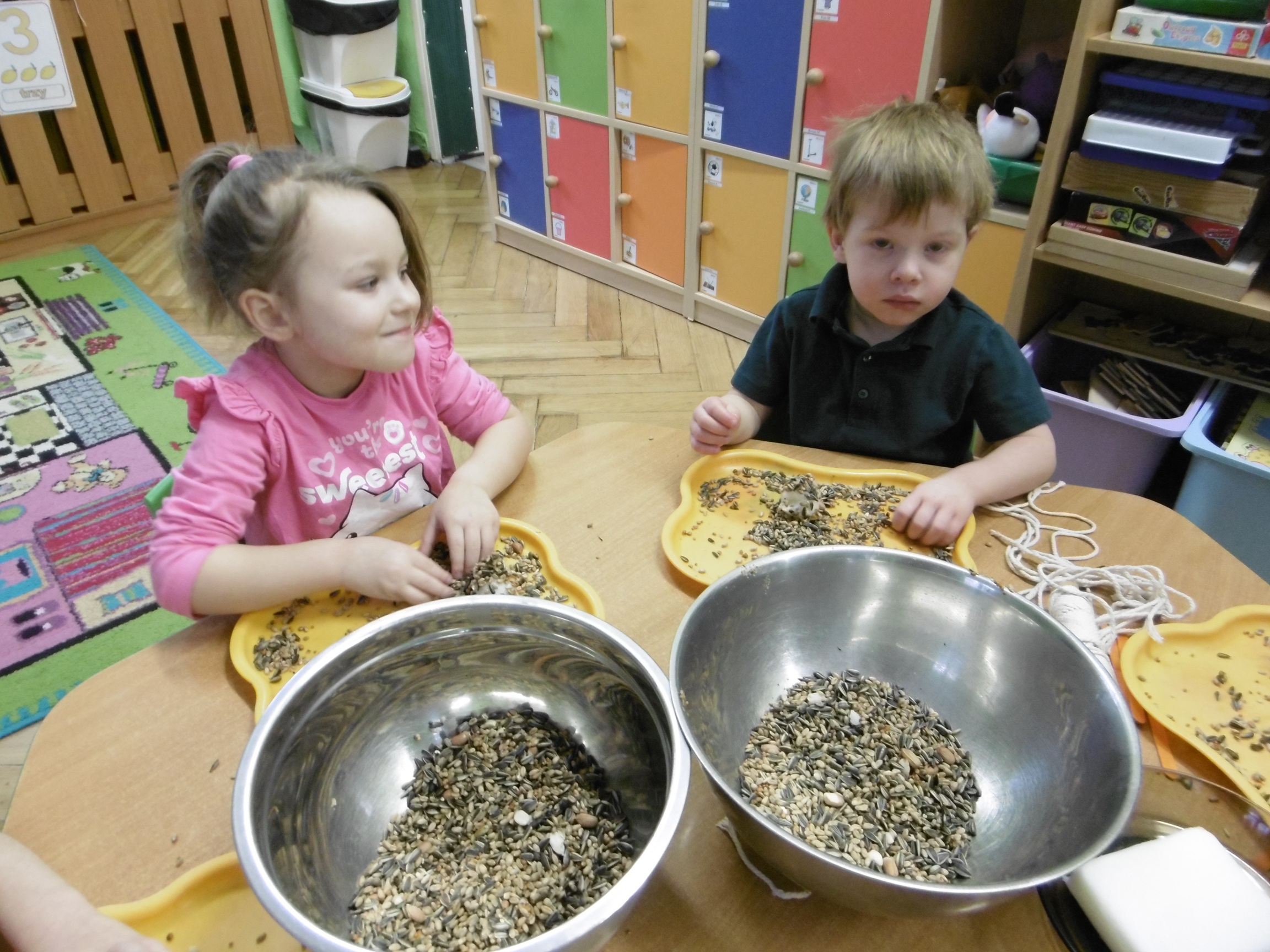 W ostatnich dniach Tuptusie rozmawiały o potrzebie dokarmiania ptaków. Dzieci zwróciły uwagę na ilość śniegu za oknem oraz trudność zwierząt w znalezieniu pożywienia w takich warunkach. W związku z tym postanowiliśmy zadbać o odwiedzające naszą okolicę ptaki. Dzieci własnoręcznie przygotowały kule z pokarmem dla ptaszków, a następnie wybrały się na przedszkolny taras, aby je zawiesić. Nasze Tuptusie wysypały także ziarenka w karmniku, który znajduje się za naszymi oknami. W trakcie spaceru przedszkolaki szukały również śladów pozostawionych przez ptaki na śniegu. Mamy nadzieję, że już niedługo pojawią się pierwsi goście na naszej ptasiej stołówce.