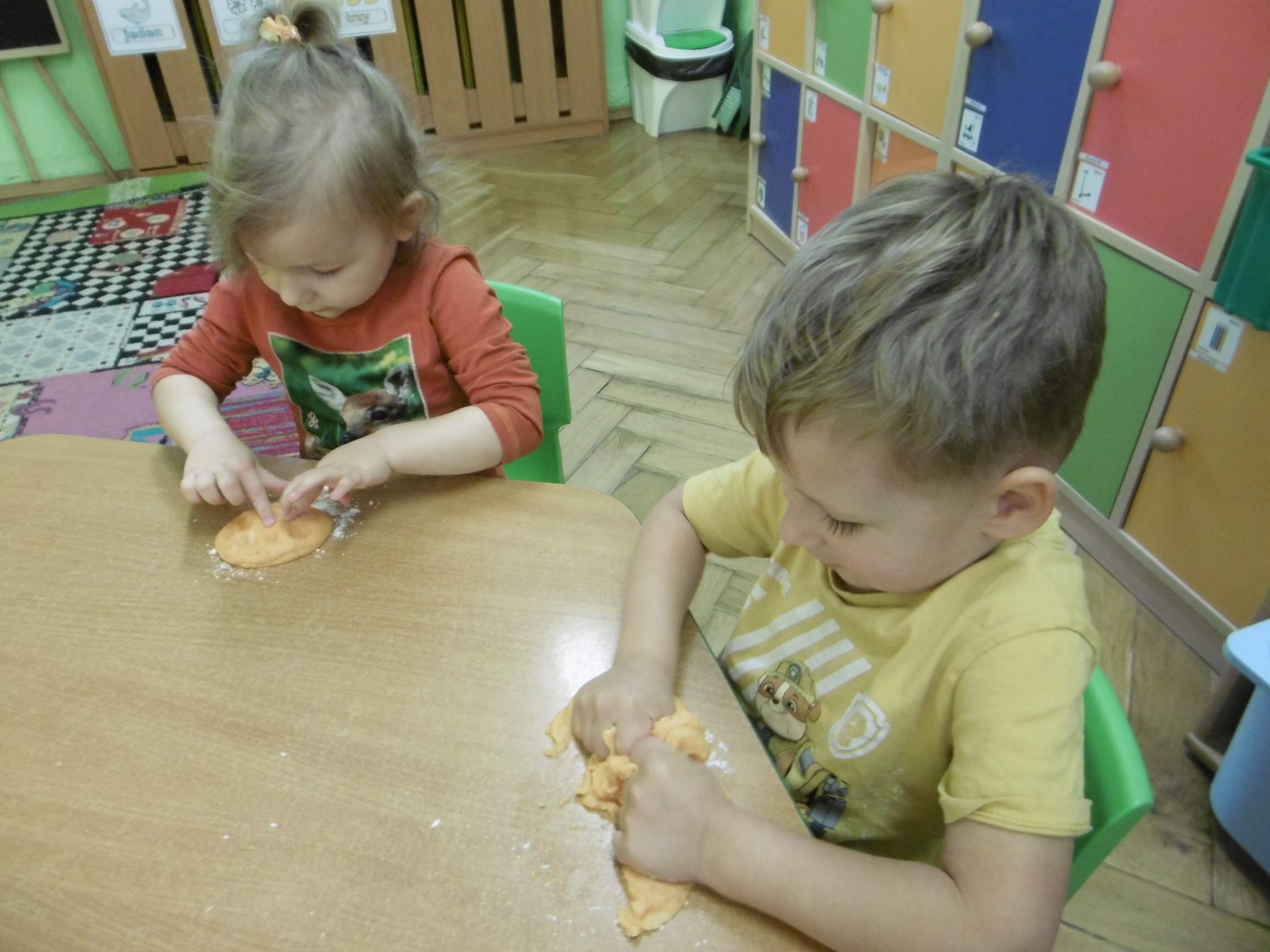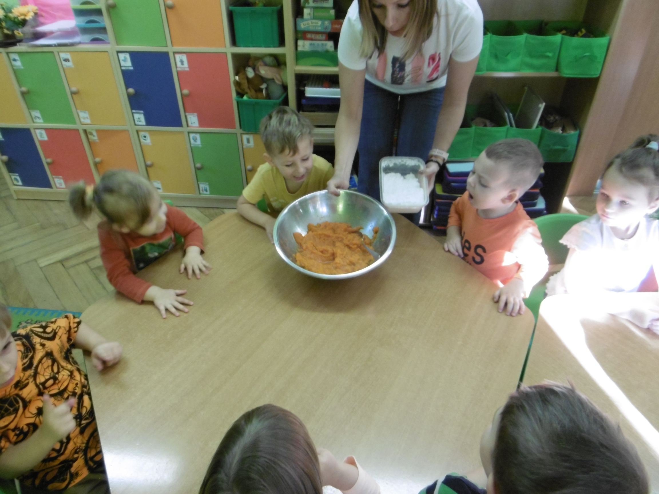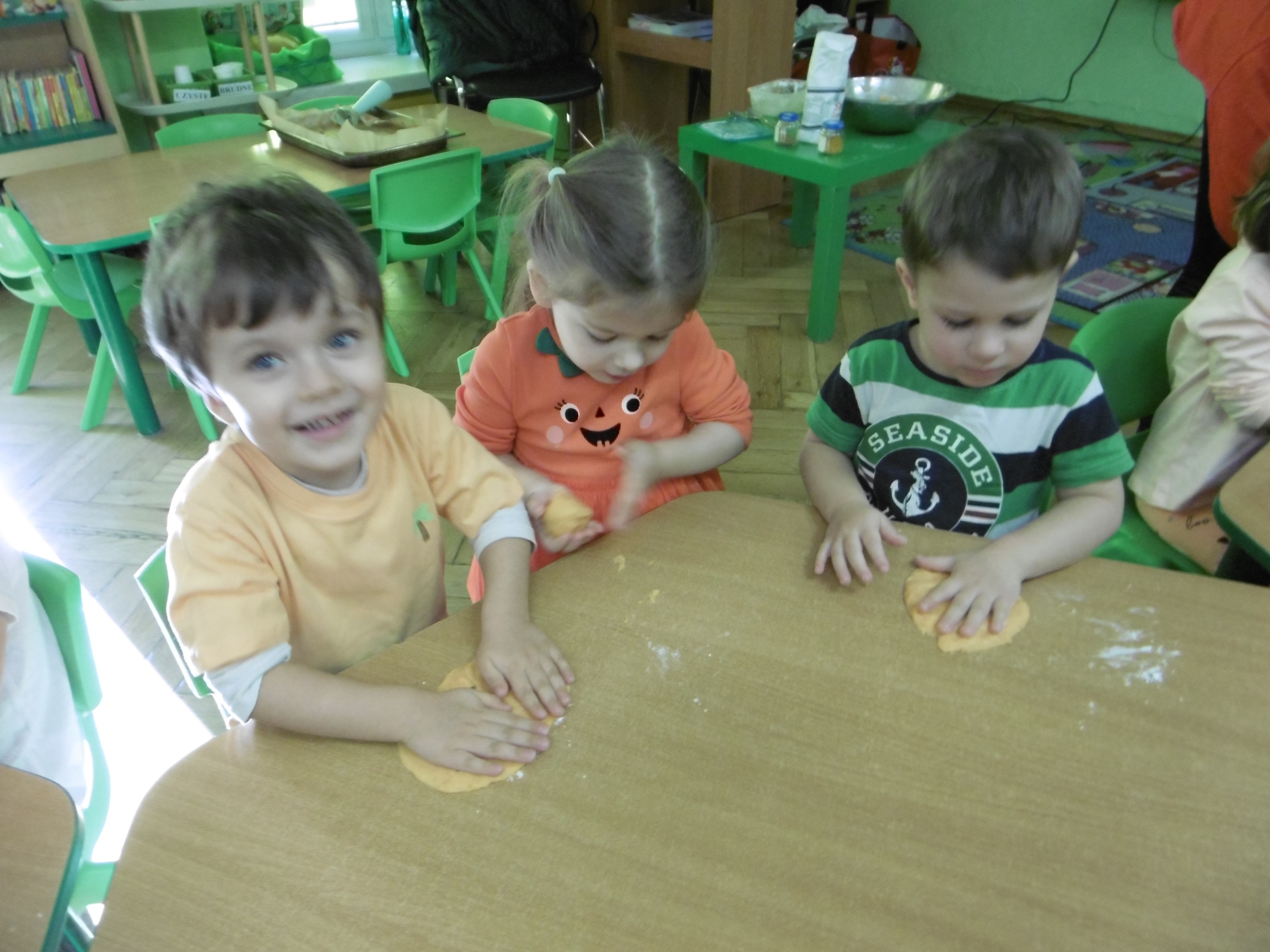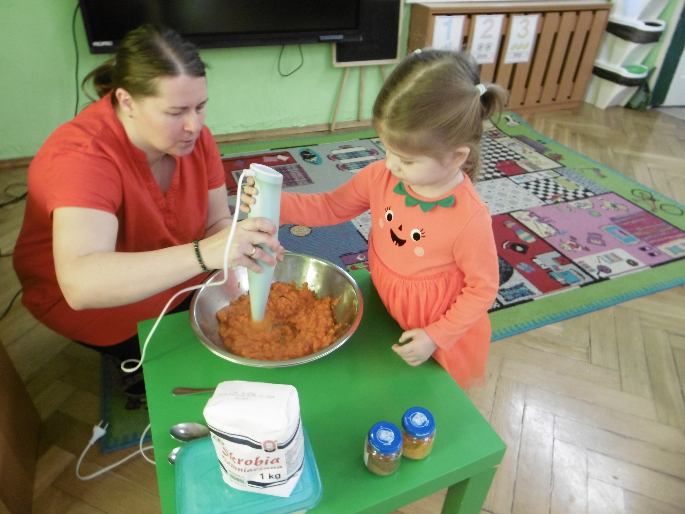 Podczas Dnia Dyni, Tuptusie zapoznały się z różnymi rodzajami dyń, wskazując, które z nich są małe, a które duże. Z pomocą nauczycielki, dzieci nazywały ich kolory oraz kształty. Ponadto ćwiczyły pamięć podczas wykonywania zadań na tablicy multimedialnej. Dowiedziały się także, jakie ciekawe dania można przygotować z dyni – np. zupa krem z dyni, dyniowy sok czy ciasto dyniowe, które potem wspólnie przeliczały. Następnie tańczyły do piosenki ilustrując ruchami jej treść. A na koniec przygotowały własną masę plastyczną - dyniolinę, z której powstawało na naszych stolikach wiele niezwykłych form, tj. kuleczki, wałeczki i placuszki.