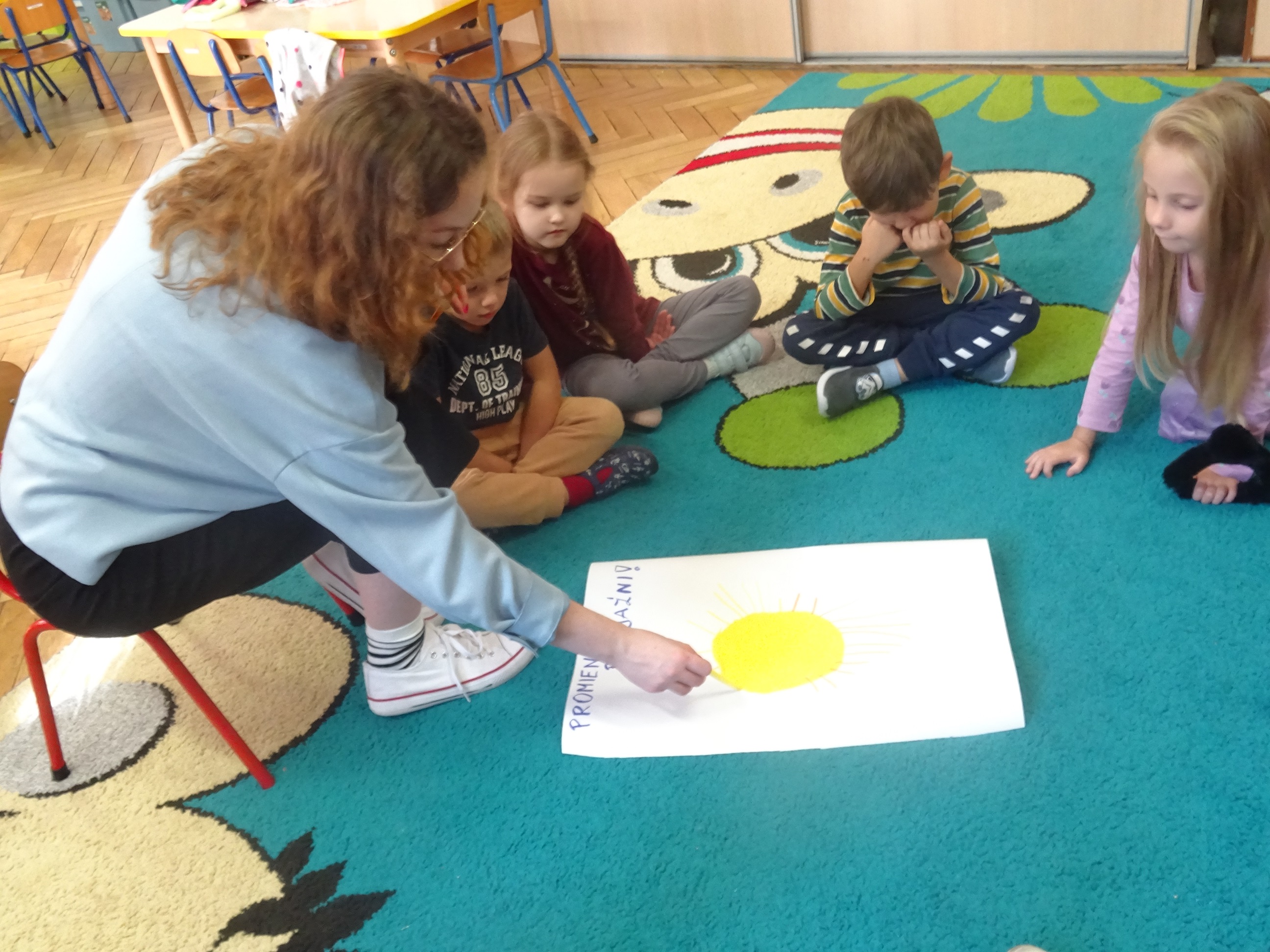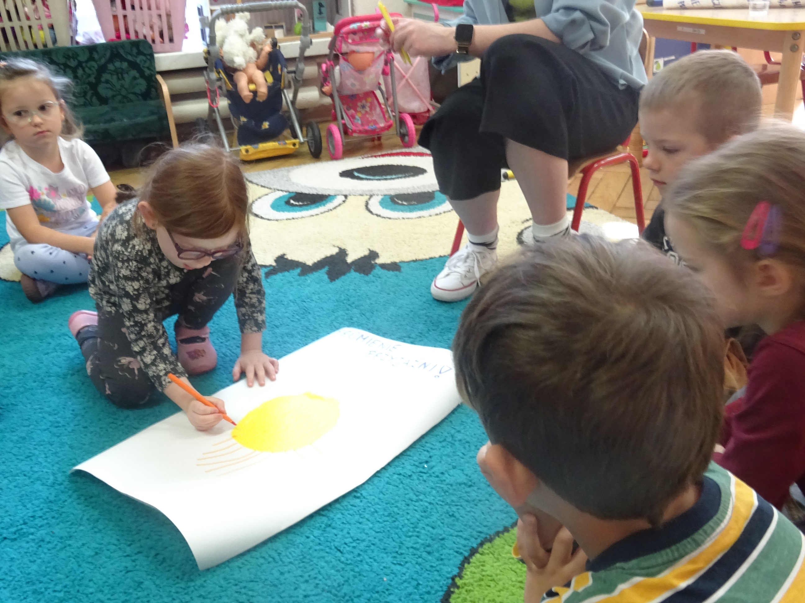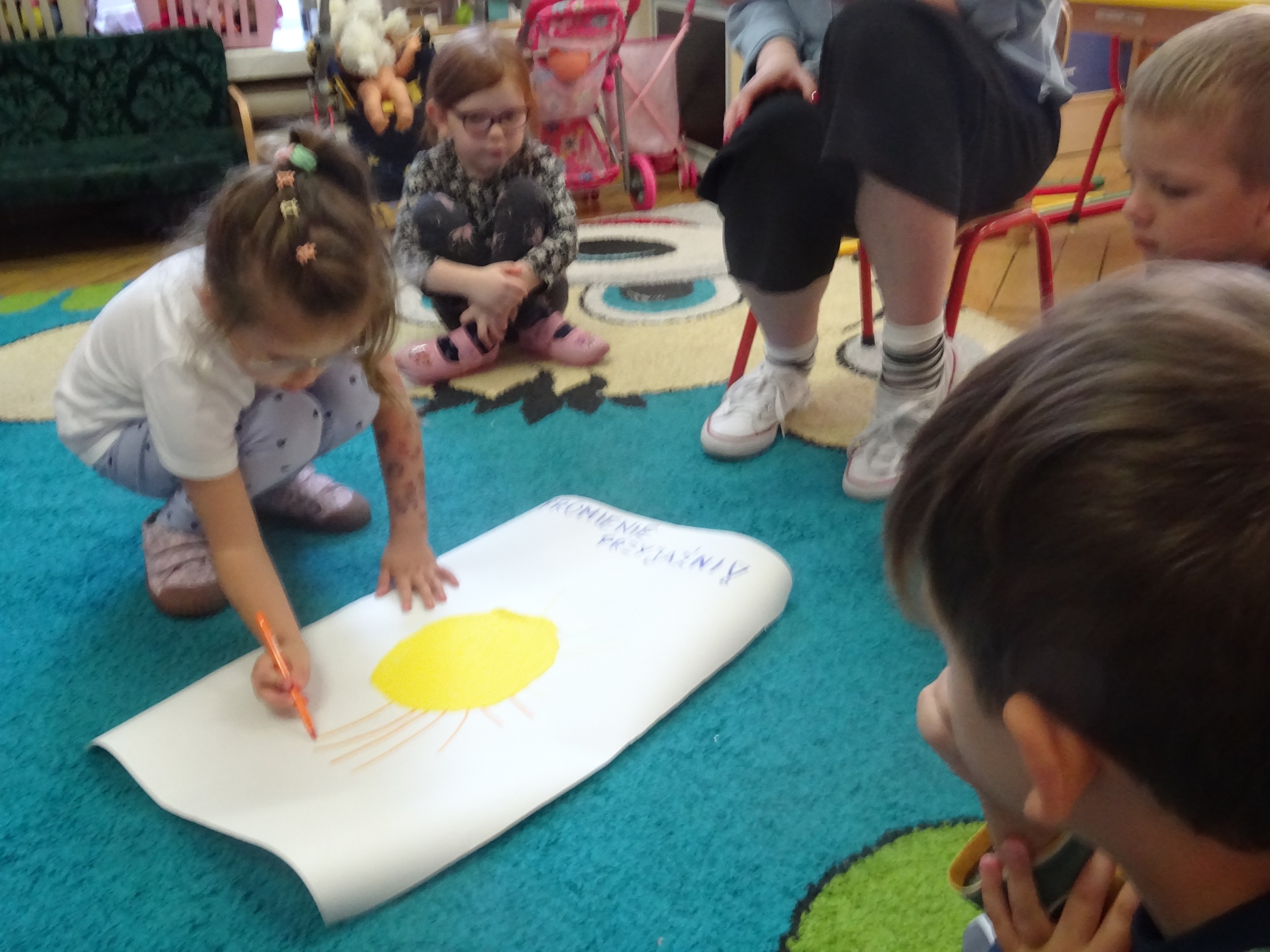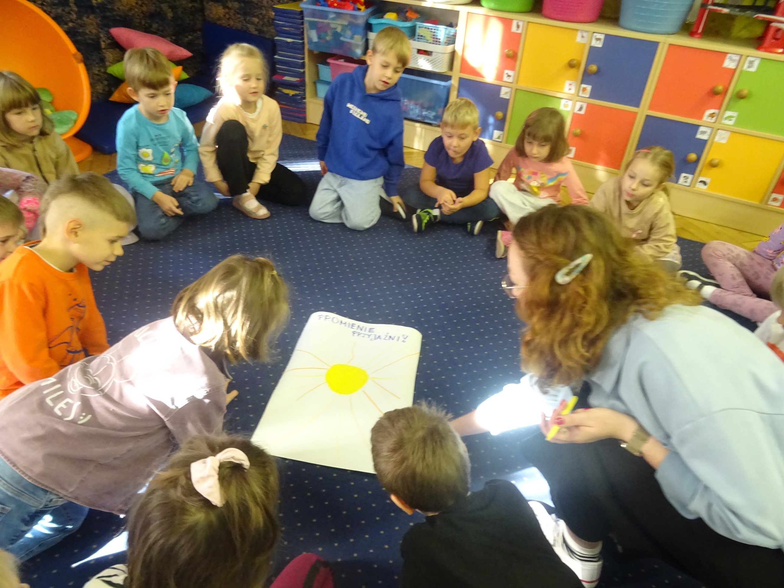Był też czas na kreatywność i zabawę – podczas pokazu mody każdy uczestnik mógł zaprezentować się przed grupą, a widownia nagradzała go brawami i komplementami. Na zakończenie dzieci rysowały wspólne „Promienie przyjaźni” – każdy dorysował jeden promyk, symbolizujący dobre słowo lub gest, które budują przyjacielskie relacje.