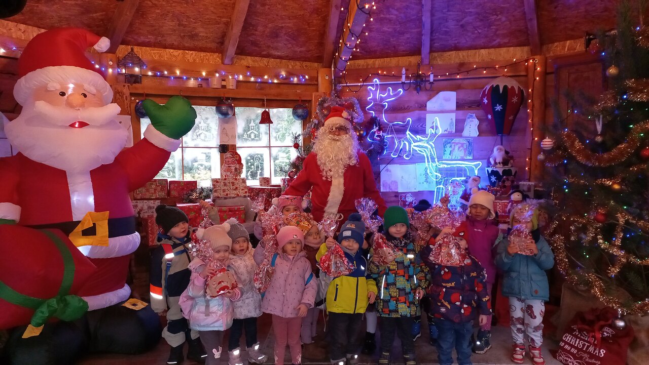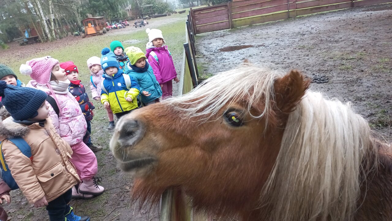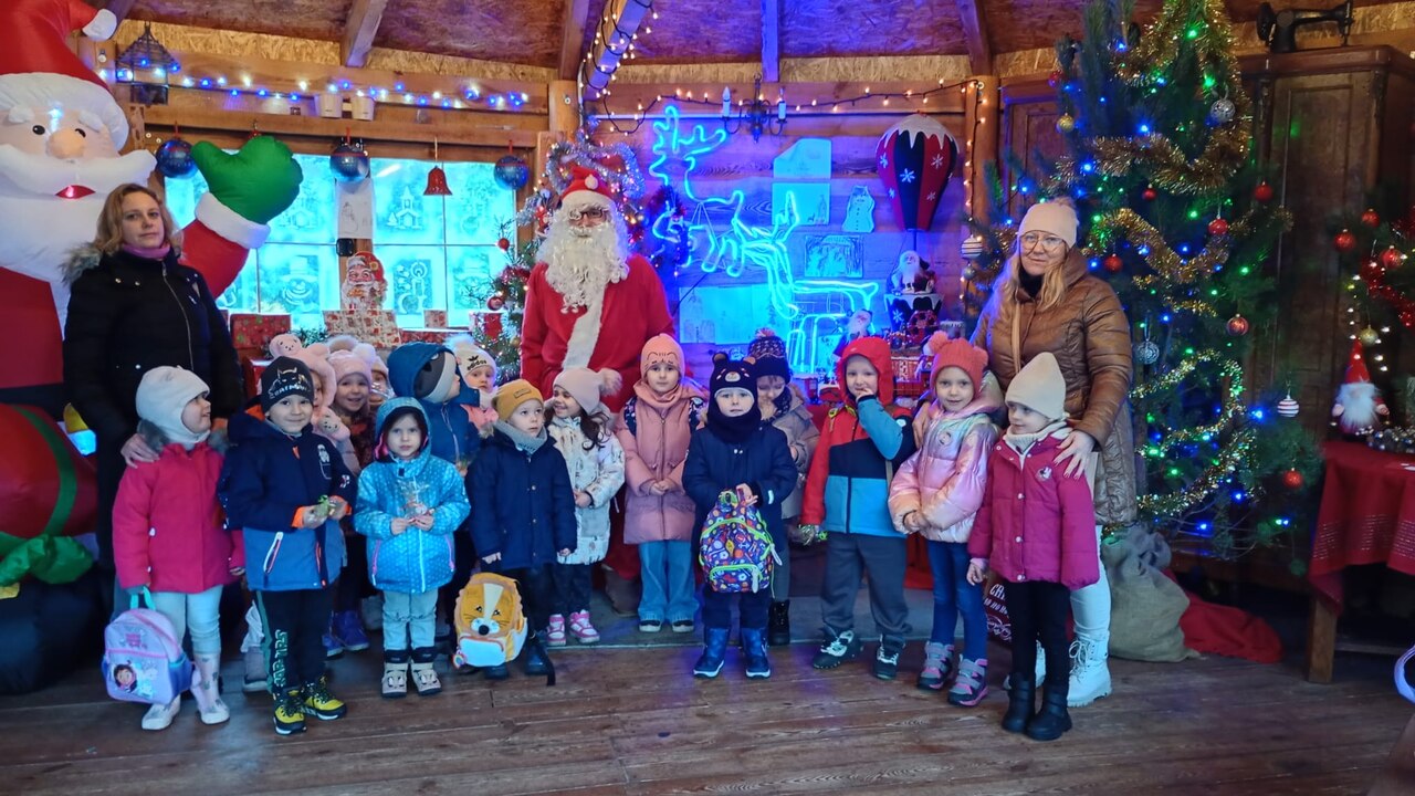 Dzieci miały niezwykłą okazję spędzić czas w Krainie Świętego Mikołaja! Od razu po dotarciu na miejsce zajęły się przygotowaniem ciasta na pyszne pierniczki! Dużo frajdy sprawiło dzieciom ozdabianie wykonanych pierniczków według własnego pomysłu. Następnie przedszkolaki zabrały się za dekorowanie świątecznych bombek- w ruch poszedł brokat, cekiny i piórka! Po skończonej pracy, udaliśmy się z wizytą do mini ZOO- łakome kuce, szalone kózki, uśmiechnięte alpaki, kolorowe kurki- wszystkie te zwierzątka cierpliwie prezentowały się naszym przedszkolakom! Na sam koniec, dzieci pełne werwy i humoru, odwiedziły prawdziwego Świętego Mikołaja!!! Czekał na nie w swojej mikołajowej chatce. Każde dziecko miało możliwość porozmawiania z Mikołajem, a za obietnicę wzorowego zachowania otrzymało mały prezent- niespodziankę! Kończąc naszą wizytę namówiliśmy Mikołaja do wspólnego, świątecznego zdjęcia!!!