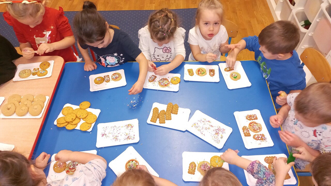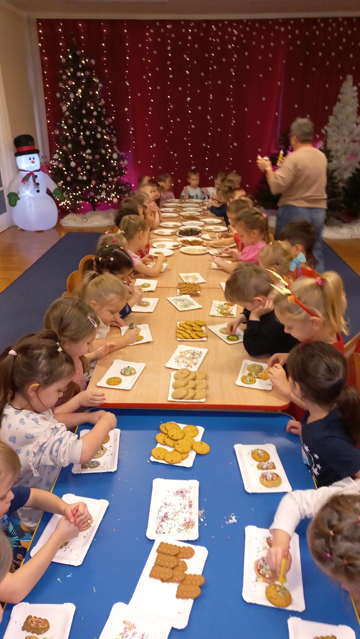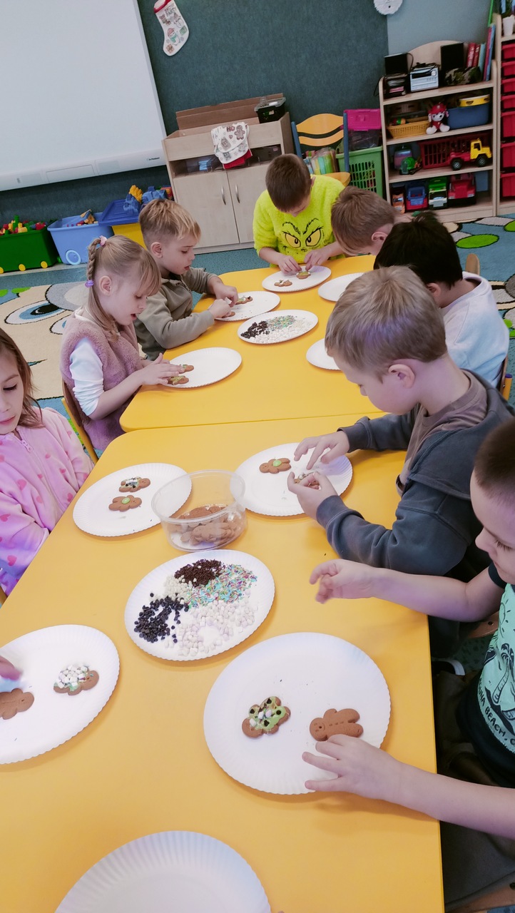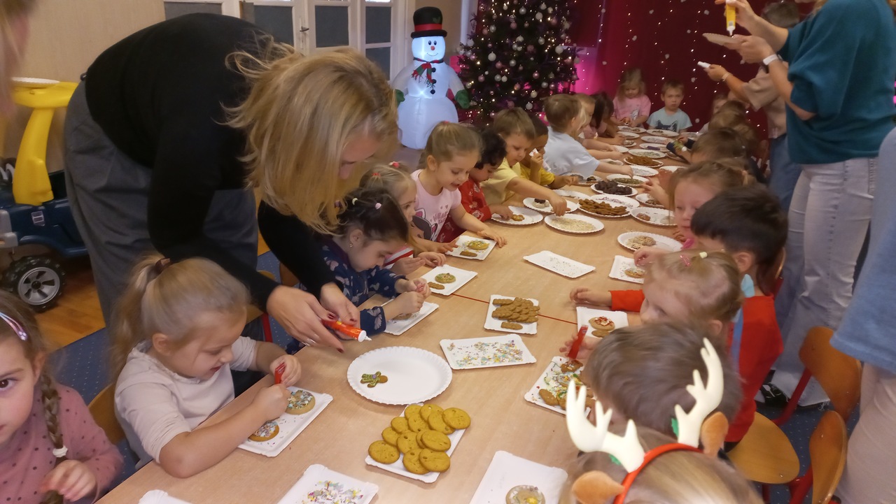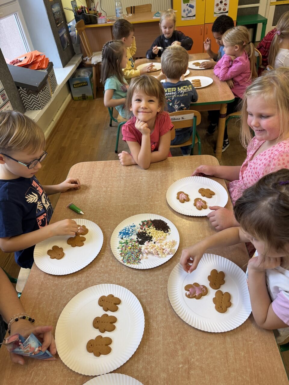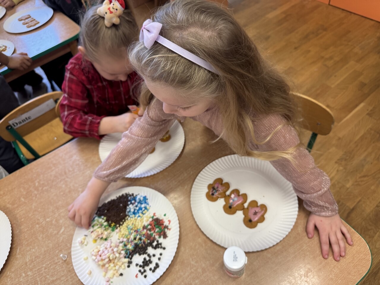 04.12.2025r. chcąc umilić naszym przedszkolakom czas oczekiwania na Święta, zorganizowaliśmy słodkie, pierniczkowe warsztaty! Grupa Tuptusiów połączyła swoje siły z grupą Smyków, a grupa Żaczków z grupą Juniorów. Wszystkie dzieci wykonały piękne, kolorowe prace, aż trudno było powstrzymać się przed schrupaniem ich na miejscu! Polukrowane pierniczki zyskały błyszczące posypki, delikatne gwiazdki i cukrowe ozdoby! Dzieci z wielkim zaangażowaniem i skupieniem dekorowały ciasteczka, a taka forma pracy dała im dużo radości i satysfakcji! Mamy ogromną nadzieję, że pierniczki dotarły do domów całe- nie podgryzione- i sprawiły uśmiech na twarzach rodziców!