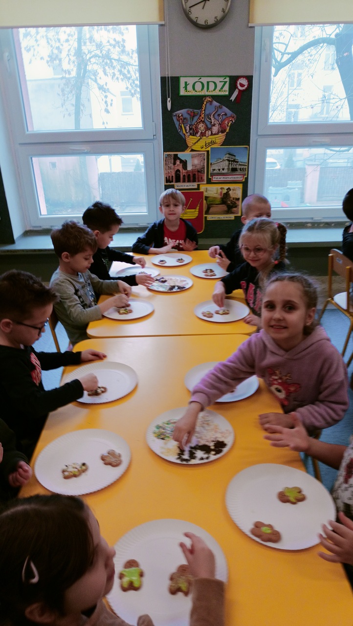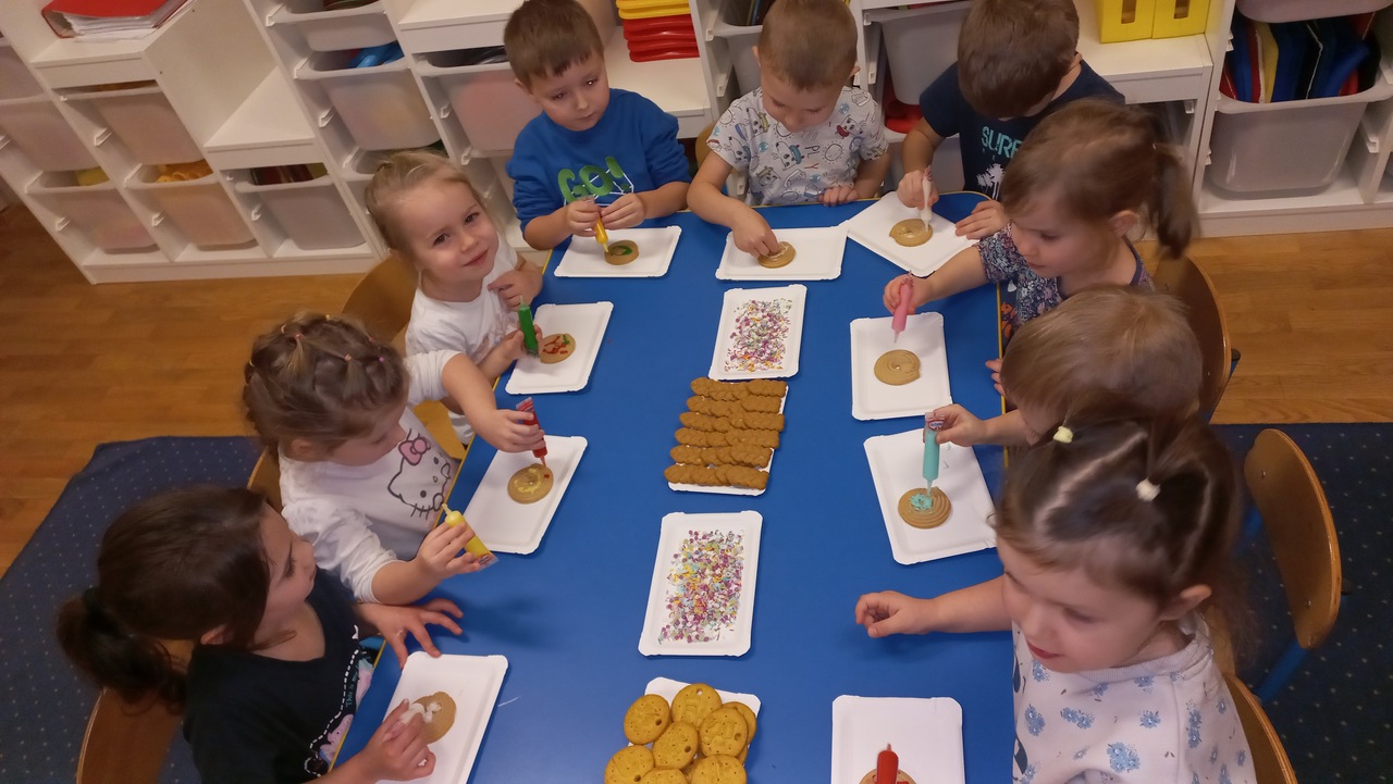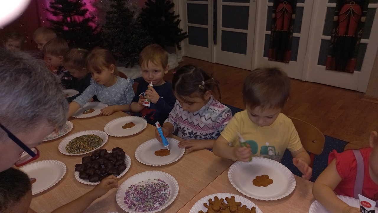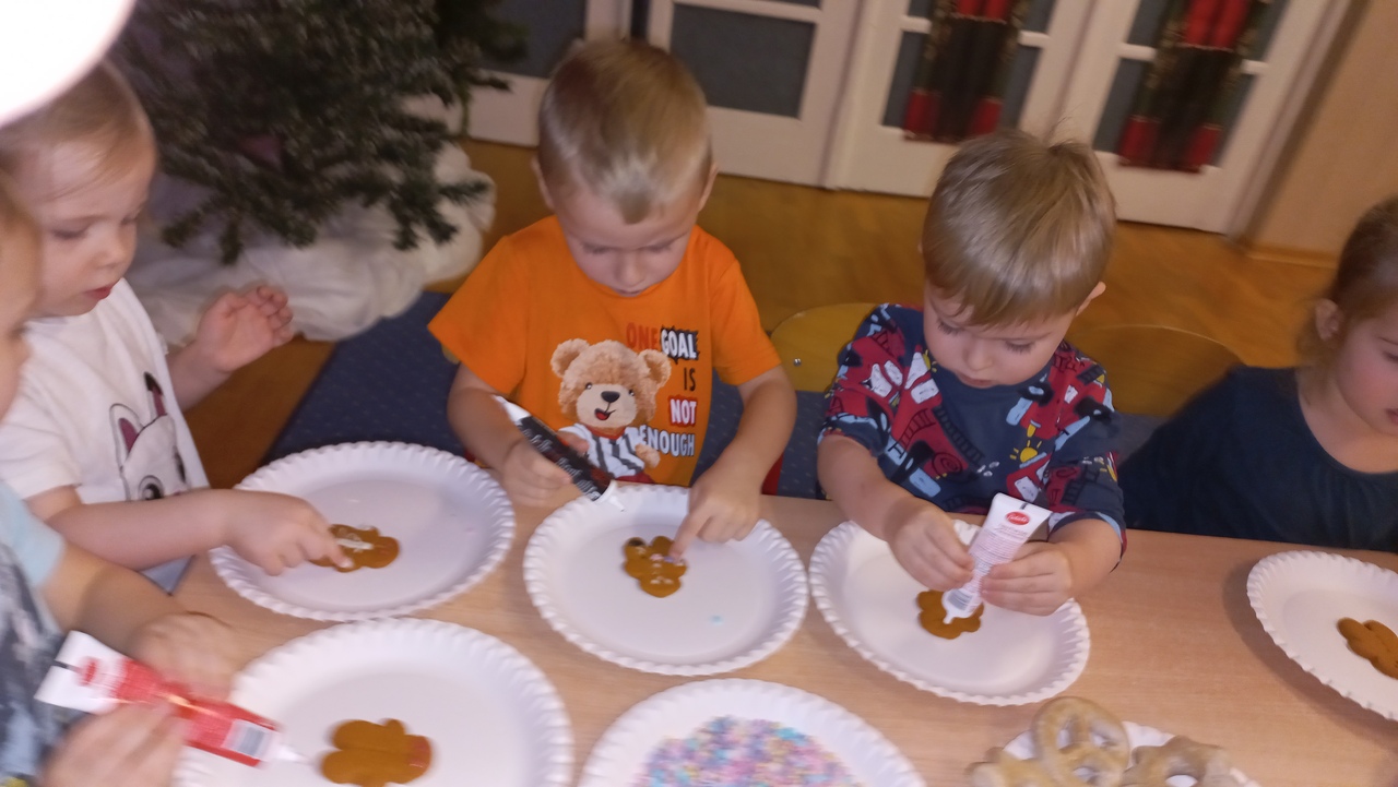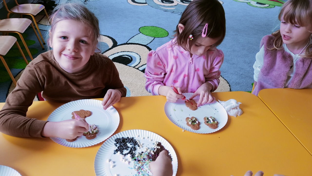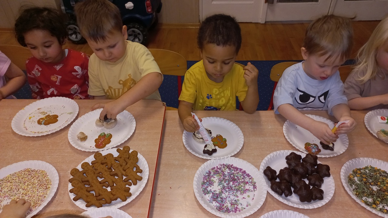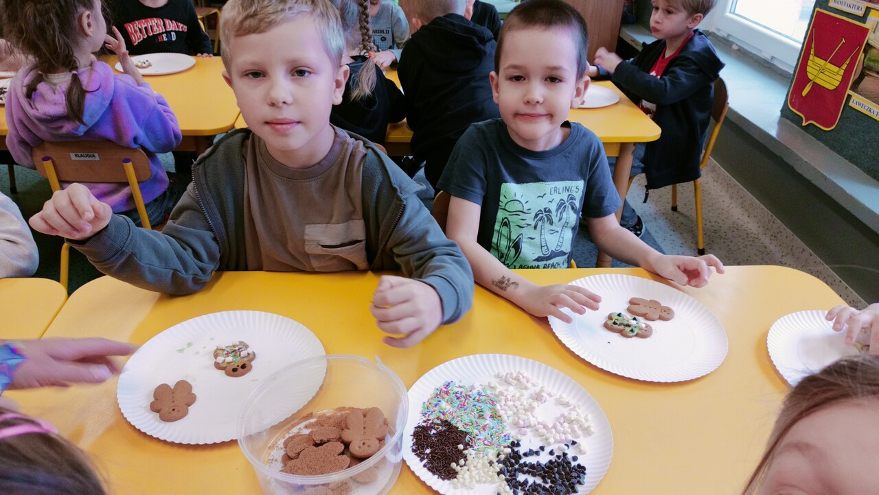04.12.2025r. chcąc umilić naszym przedszkolakom czas oczekiwania na Święta, zorganizowaliśmy słodkie, pierniczkowe warsztaty! Grupa Tuptusiów połączyła swoje siły z grupą Smyków, a grupa Żaczków z grupą Juniorów. Wszystkie dzieci wykonały piękne, kolorowe prace, aż trudno było powstrzymać się przed schrupaniem ich na miejscu! Polukrowane pierniczki zyskały błyszczące posypki, delikatne gwiazdki i cukrowe ozdoby! Dzieci z wielkim zaangażowaniem i skupieniem dekorowały ciasteczka, a taka forma pracy dała im dużo radości i satysfakcji! Mamy ogromną nadzieję, że pierniczki dotarły do domów całe- nie podgryzione- i sprawiły uśmiech na twarzach rodziców!
