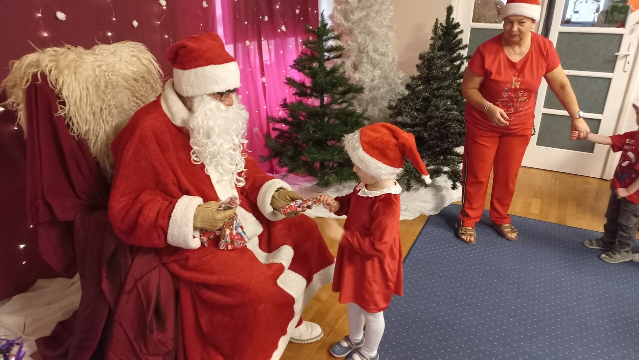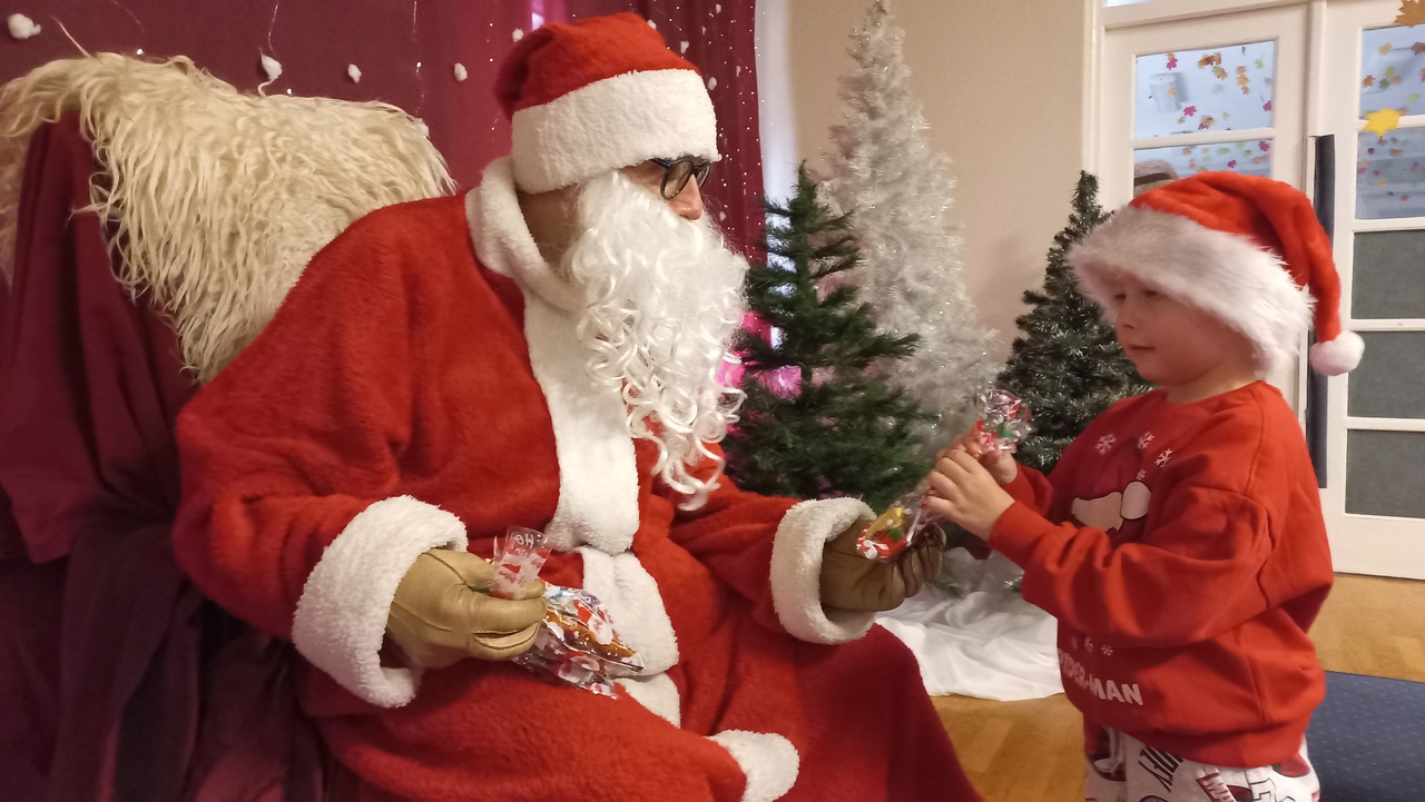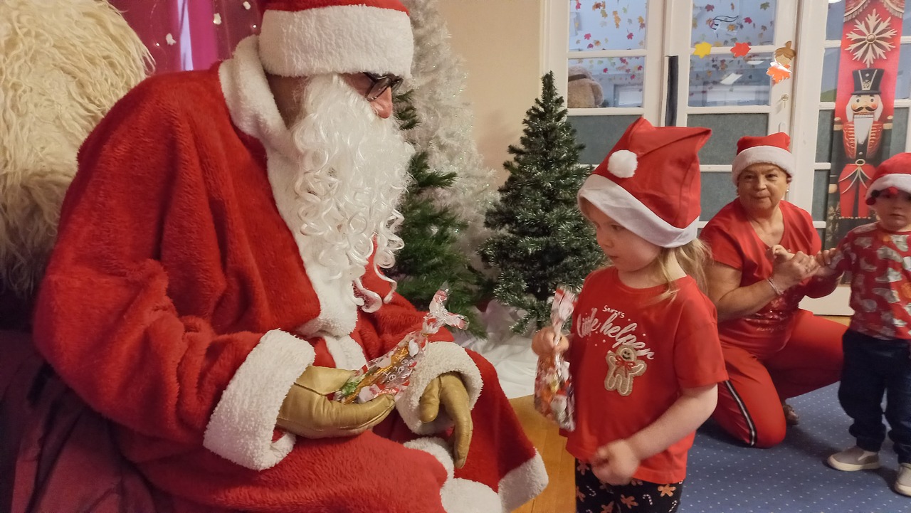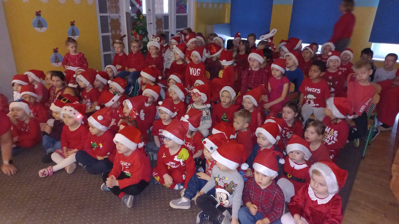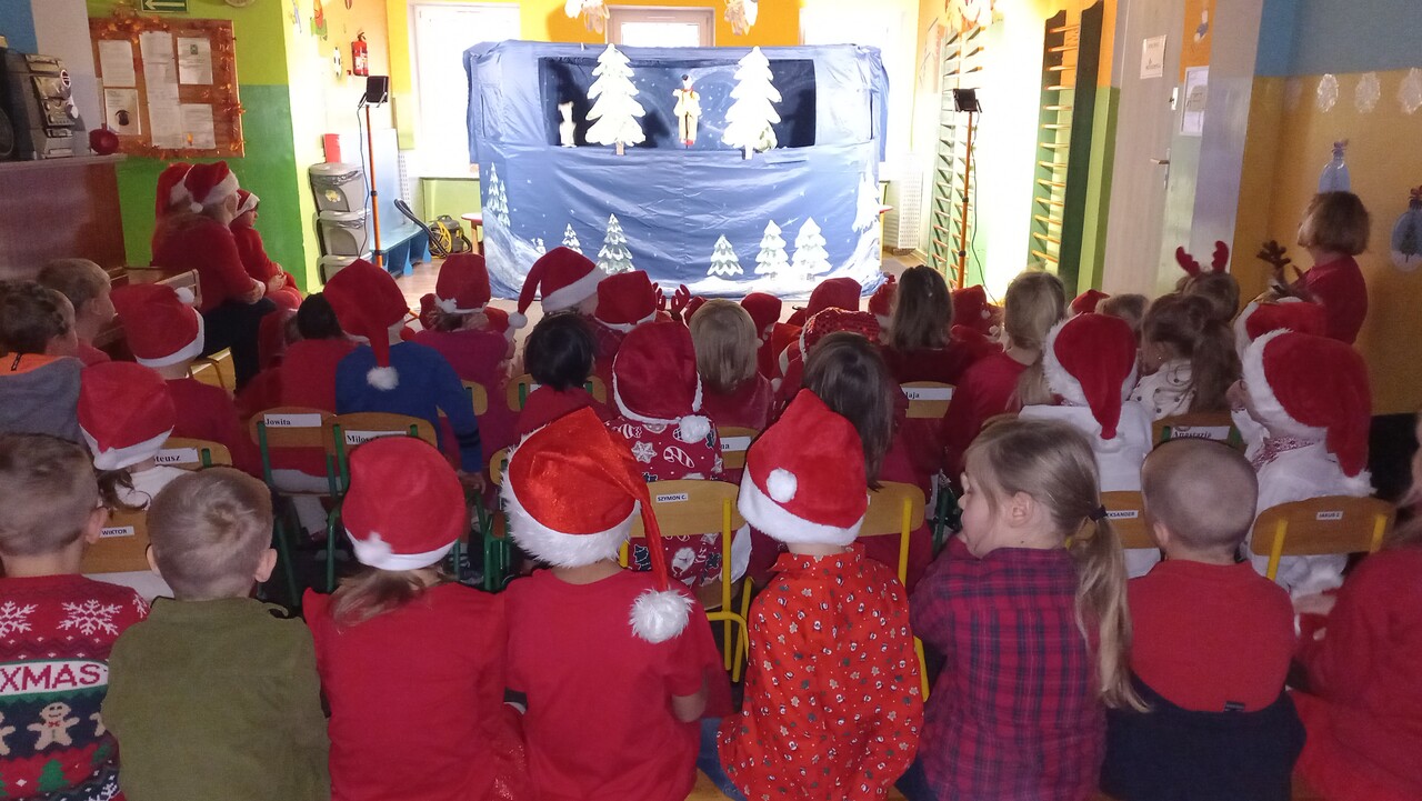 05.12.2025r. odwiedził nasze Przedszkole Teatrzyk WidziMiSię z pięknym, świątecznym przedstawieniem pt. „Zimowa opowieść”. Bajka niosła ze sobą przesłanie dobra, miłości i wigilijnych, rodzinnych wartości. Po spektaklu czekała na dzieci wielka niespodzianka- do Przedszkola przybył prawdziwy Św. Mikołaj!!! Dzięki głośnym nawoływaniom naszych przedszkolaków udało Mu się znaleźć drogę do naszego Przedszkola! Mikołaj wysłuchał specjalnie dla Niego przygotowanych piosenek, a nawet zgodził się wziąć udział w sesji fotograficznej! Każde dziecko obdarował prezentem- słodką niespodzianką, która umili czas oczekiwania na Święta. Serdecznie dziękujemy Radzie Rodziców za zakup mikołajkowych niespodzianek dla dzieci. Szczególnie Państwu Olczyk za wyjątkową organizację przedsięwzięcia. Wszystkie prezenciki zakupiła, zapakowała Rada Rodziców. Jesteśmy bardzo wzruszeni i wdzięczni Rodzicom za zaangażowanie w pomoc- wszystkie dzieci były tego dnia ubrane na czerwono, dzięki czemu wyglądały obłędnie podczas „Spotkania Mikołajkowego”.