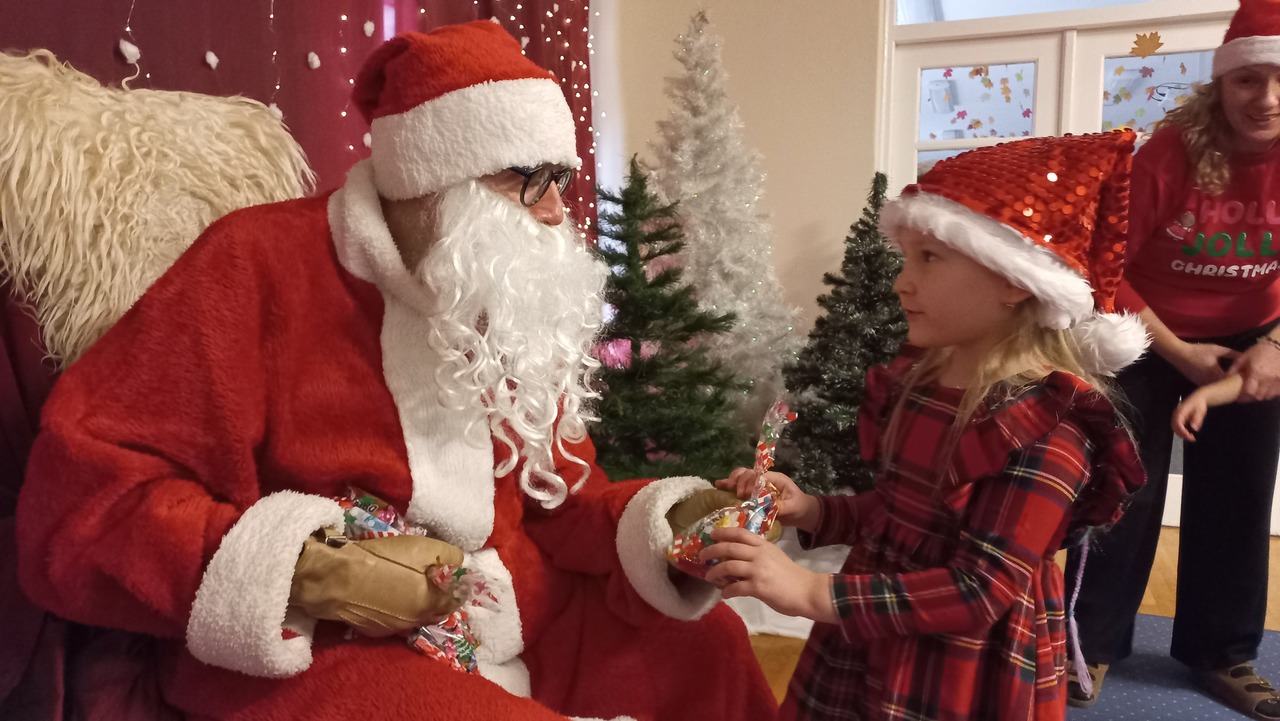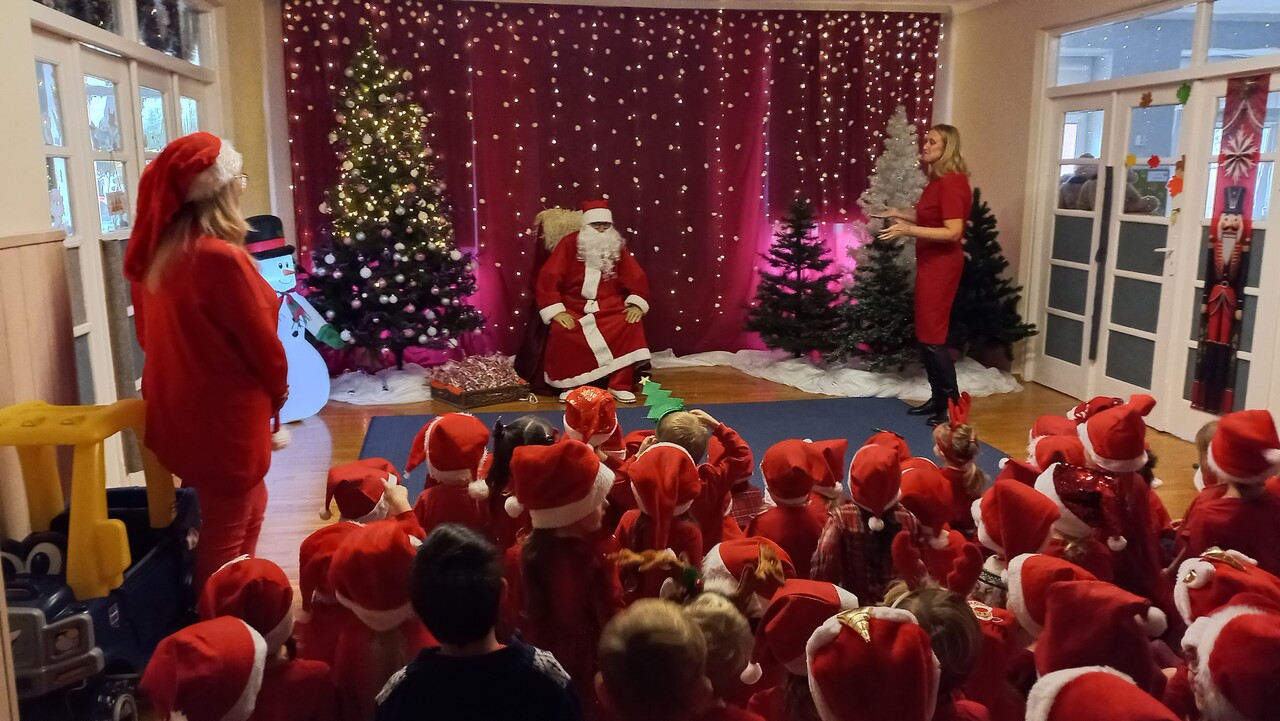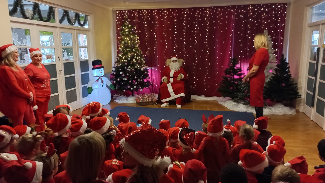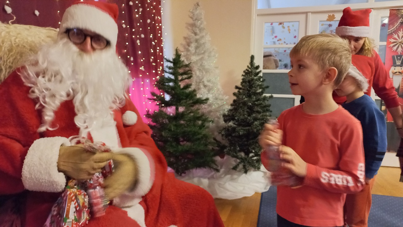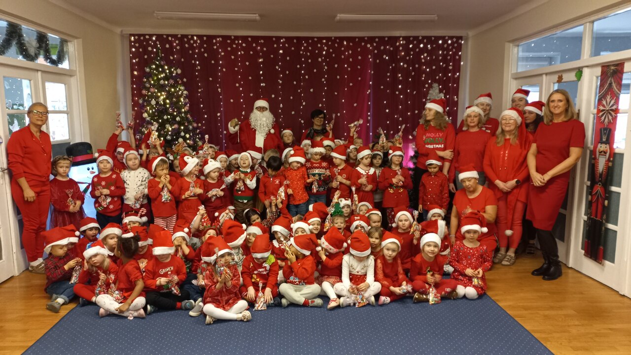 05.12.2025r. odwiedził nasze Przedszkole Teatrzyk WidziMiSię z pięknym, świątecznym przedstawieniem pt. „Zimowa opowieść”. Bajka niosła ze sobą przesłanie dobra, miłości i wigilijnych, rodzinnych wartości. Po spektaklu czekała na dzieci wielka niespodzianka- do Przedszkola przybył prawdziwy Św. Mikołaj!!! Dzięki głośnym nawoływaniom naszych przedszkolaków udało Mu się znaleźć drogę do naszego Przedszkola! Mikołaj wysłuchał specjalnie dla Niego przygotowanych piosenek, a nawet zgodził się wziąć udział w sesji fotograficznej! Każde dziecko obdarował prezentem- słodką niespodzianką, która umili czas oczekiwania na Święta. Serdecznie dziękujemy Radzie Rodziców za zakup mikołajkowych niespodzianek dla dzieci. Szczególnie Państwu Olczyk za wyjątkową organizację przedsięwzięcia. Wszystkie prezenciki zakupiła, zapakowała Rada Rodziców. Jesteśmy bardzo wzruszeni i wdzięczni Rodzicom za zaangażowanie w pomoc- wszystkie dzieci były tego dnia ubrane na czerwono, dzięki czemu wyglądały obłędnie podczas „Spotkania Mikołajkowego”.